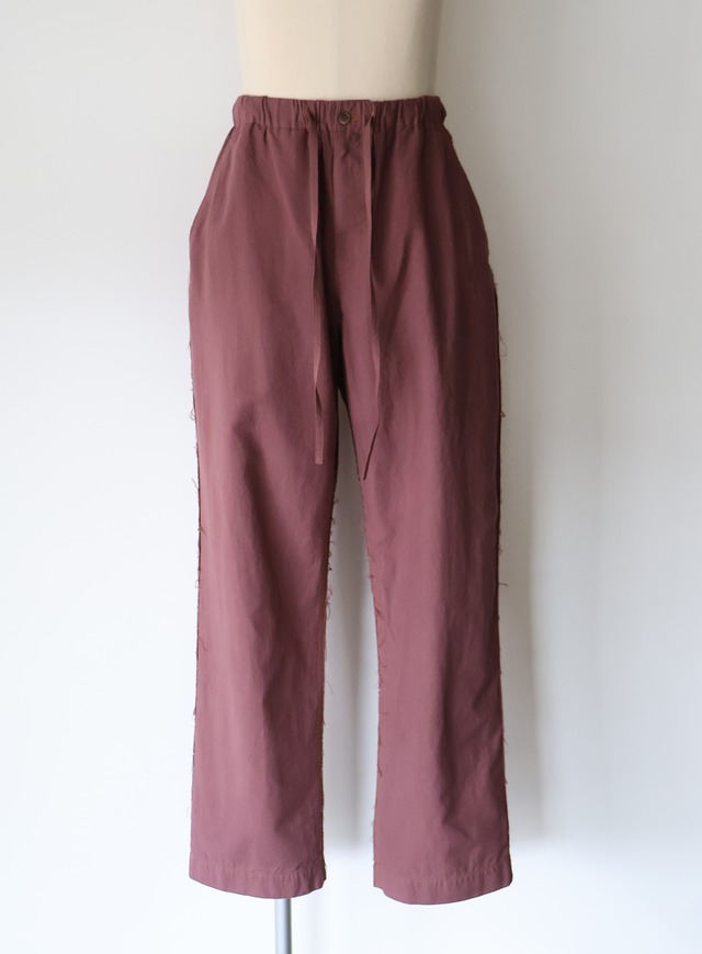 軽やかな素材感と遊び心のあるステッチワークに惹かれるイージーパンツになります。 素材には、“ The Fabric of Freedom (自由の布)”とも呼ばれるインド産のカディコットンを使用することで蒸れを軽減し、暑い時期を快適に過ごすことが出来ます。 カディ(Khadi)とは、インドの職人によって生み出される手紡ぎ・手織りの伝統的な天然素材布であり、不均一の糸からできる独特なネップやナチュラルな織りムラを特殊に持ちます。生地に多くの空気を含めて織り込まれているため、非常に軽く、肌触り・肌なじみが良いため、猛暑で知られるインドでは現在でも愛され、親しまれています。 この素材を用いたウエストゴム&ドローコードをあしらったEasy Pants. 同素材のJKTやシャツとの組み合わせも抜群の他、単体としても非常に使いやすい1本。 ゆったりとしたシルエッでと素材の持つポテンシャルで、着用した時の快適さはなんとも言えない1本です。 サイドシームレスとインサイドシームに配された切りっぱなしや3本針ステッチのディティールによるユニークさと草木染めによる独特な色合い、生地による無国籍感がCaleの持つ高い縫製技術によるアーバンな雰囲気と掛け合わさることで唯一無二の存在感に包まれたアイテムです。 素材 : Cotton 100% SIZE 3 : ウエスト74cm~86cm ワタリ34cm 股上31.5cm 股下76cm 裾幅22cm Color : Purple