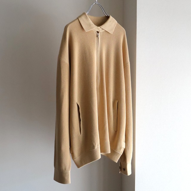 コットンとシルクを使用したニットのハリントンジャケットになります。 1930年代にゴルフ⽤ジャケットとして開発され現代まで実⽤性も兼ね備えたジャケットとして⼈気を博すハリントンジャケットをニットで仕⽴てました。 14Gの畦編みで編み⽴て、ハイゲージならではの落ち感があり布帛では表現のできない上品な印象です。 衿と袖⼝はダブルジャカードで編み⽴て実⽤的な仕上がり。 スライダーの滑りがとても滑らかなエクセラファスナーを使⽤しております。 素材 : Cotton 90% Silk 10% SIZE L : 肩幅48.5cm 身幅65cm 袖丈60cm 着丈66cm Color : Beige 着用モデル : 165cm 48kg