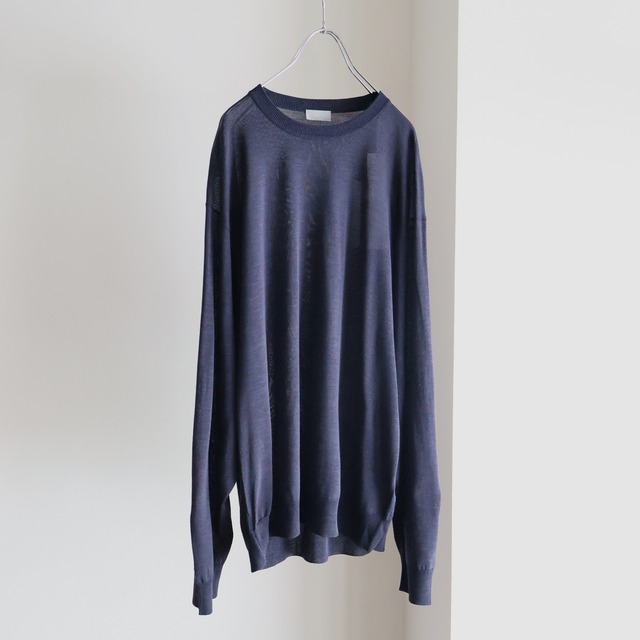 表はシルク糸を使用して裏は強撚のウールシルク糸を使用したハイゲージのプレーティング編み(添え糸編み)をしたクルーネックニットになります。 裏側のウールの弾力が相まってシルクが高混率でありながらハリのある製品に仕上がっています。このプレーティング編みは靴下でよく用られる手法で、ドレスウェアであるシルクソックスをニットウェアにしたかのような製品に仕上がっています。 シンプルなデザインで袖や身幅は端に向かうにつれ内減らしでカーブを描かせることで、丸みがあり分量感のあるサイジングで柔らかいシルエットを表現しています。 素材 : Silk 88% Wool 12% SIZE 3 : 肩幅50cm 身幅55cm 袖丈60.5cm 着丈68cm Color : Navy
