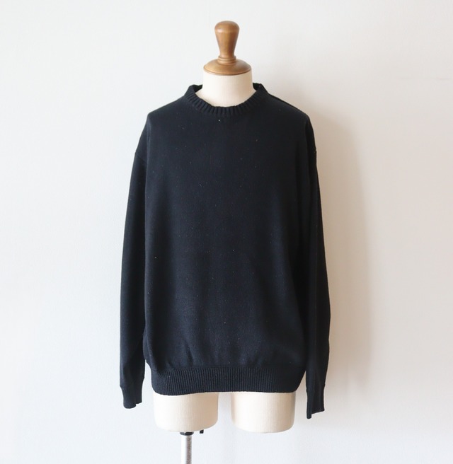 太番手のネップ感のあるローシルクを表に肌に触れる側には少しハリ感のある綿糸をプレーティング編みした丸首プルオーバーニット。7G天竺の編み地で少し厚手のニットで今回は春の立ち上がりニットでの提案ですが、夏以外年中着て頂けるニットだと思います。 素材:Silk 54%, Cotton 46% SIZE 46 : 着丈 63cm 身幅 60cm 肩幅 51cm 袖丈 57cm SIZE 48 : 着丈 65cm 身幅 62cm 肩幅 53cm 袖丈 58cm Color : BLACK