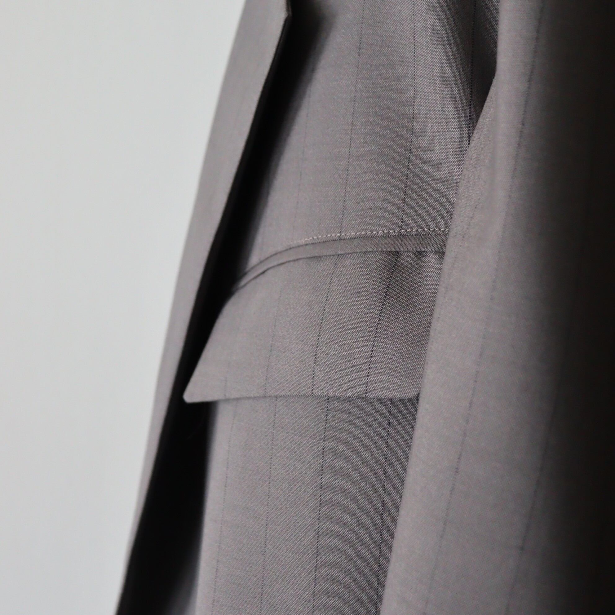 SUPER 100 ウールを使⽤したピンストライプサマーウールです。通気性や軽さがあり、なめらかな質感の上品な素材です。ドライタッチで、ウール特有の吸湿性、放湿性もあるので、真夏