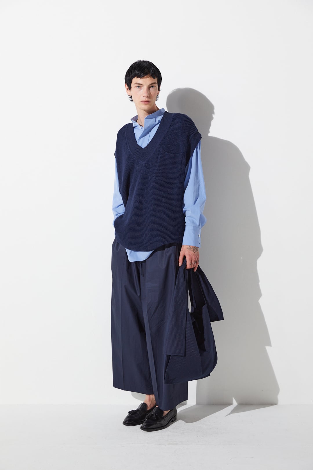ウールの細番手と和紙の糸を一緒に撚糸した、オリジナルの糸で畔のニットシリーズ。糸自体がとても軽く、畔になっても軽い着心地です。和紙の涼しいドライ感と、ウールの上品さを兼ね備えています。ウールはウォッシャブルの物を使用しているので、ご家庭での手洗いも可能となっております。形はVベスト。身幅大きく肩も落とし、レイヤードでバランスが作りやすいようにしています。裾は畔の編み出し。両脇にスリットあり,胸ポケット付きです。