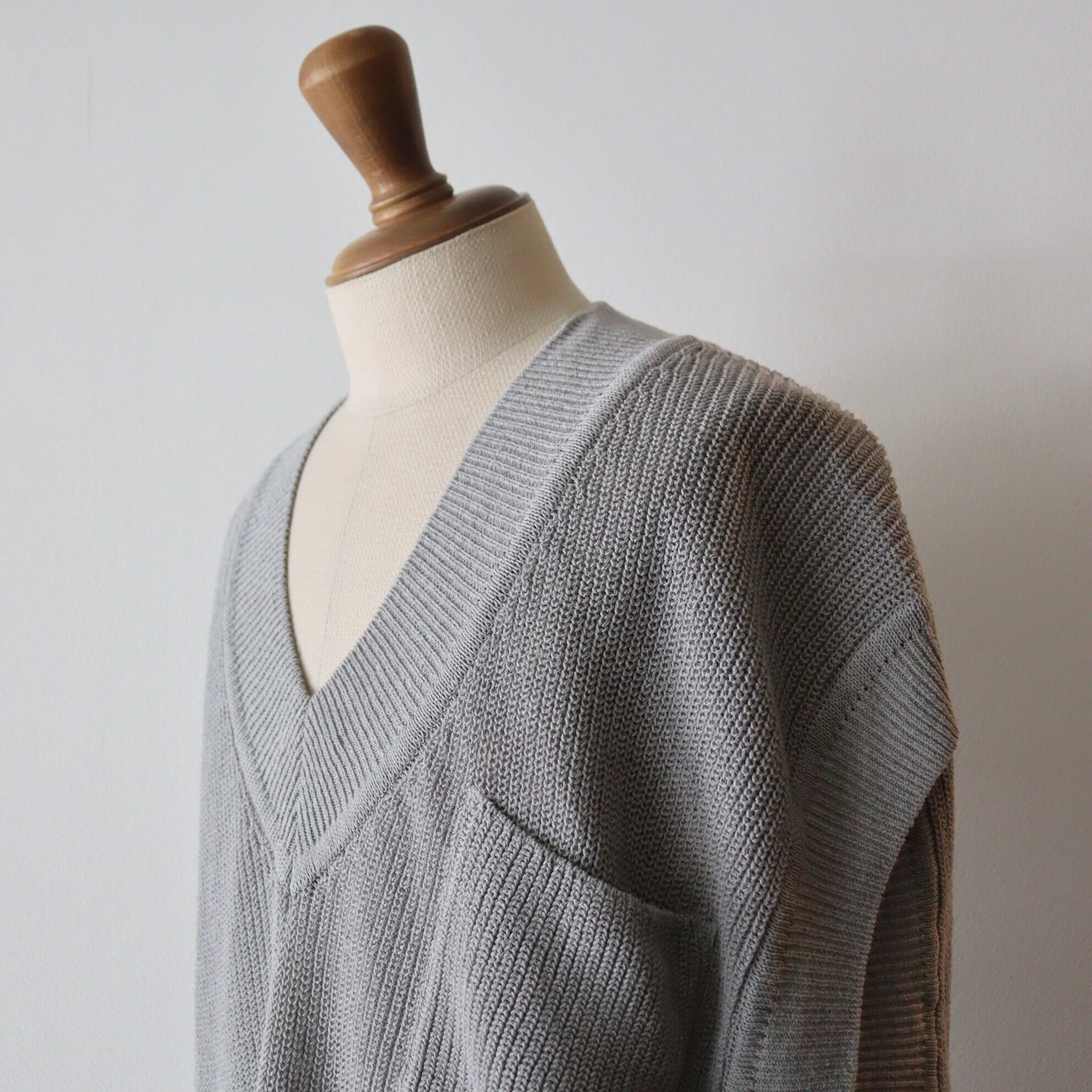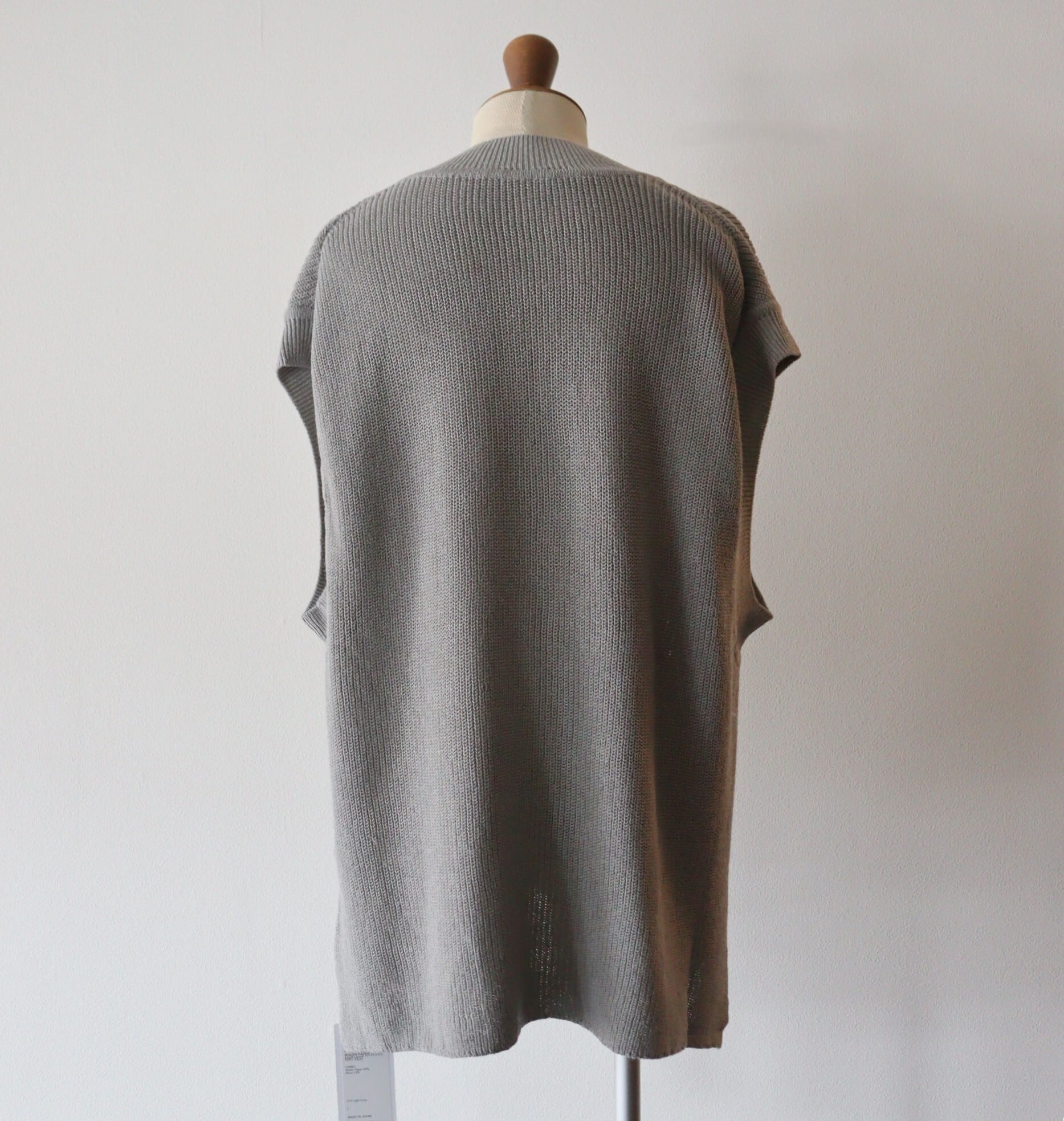ウールの細番手と和紙の糸を一緒に撚糸した、オリジナルの糸で畔のニットシリーズ。糸自体がとても軽く、畔になっても軽い着心地です。和紙の涼しいドライ感と、ウールの上品さを兼ね備えています。ウールはウォッシャブルの物を使用しているので、ご家庭での手洗いも可能となっております。形はVベスト。身幅大きく肩も落とし、レイヤードでバランスが作りやすいようにしています。裾は畔の編み出し。両脇にスリットあり,胸ポケット付きです。