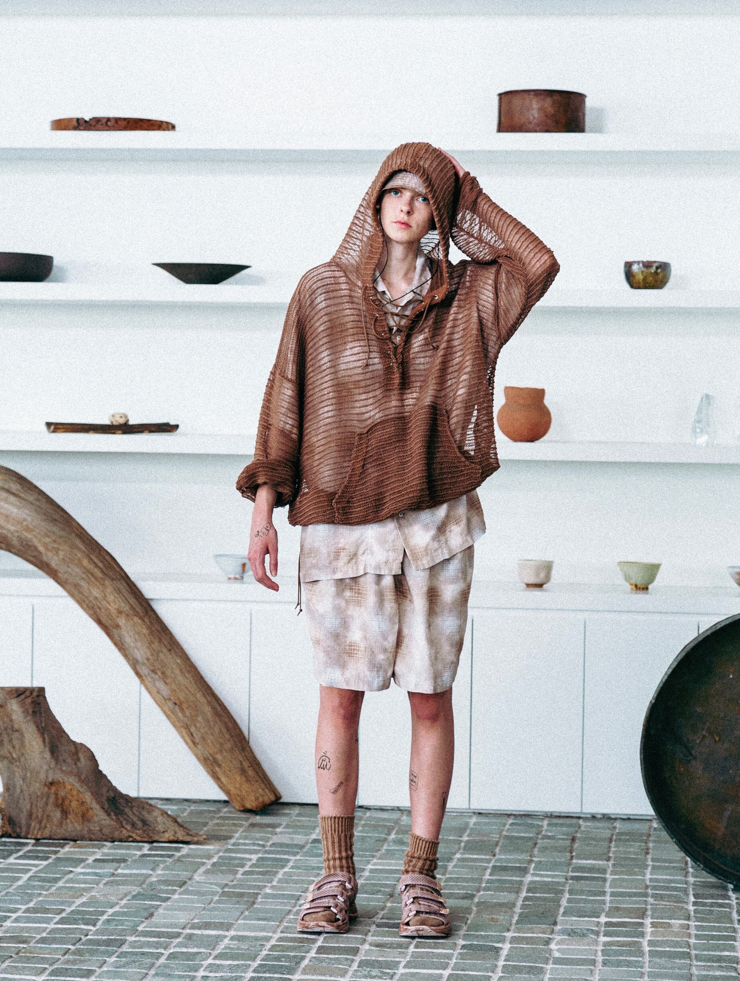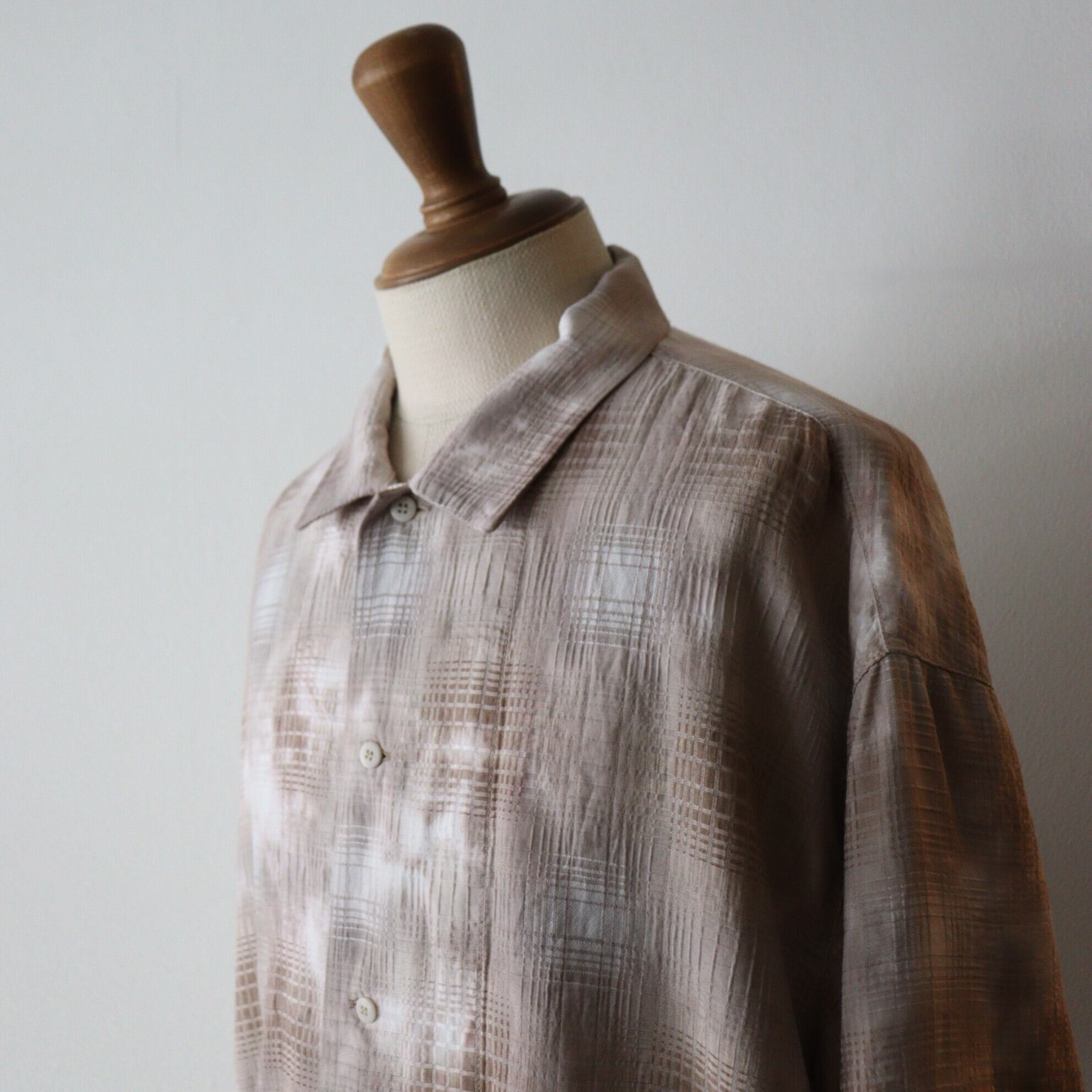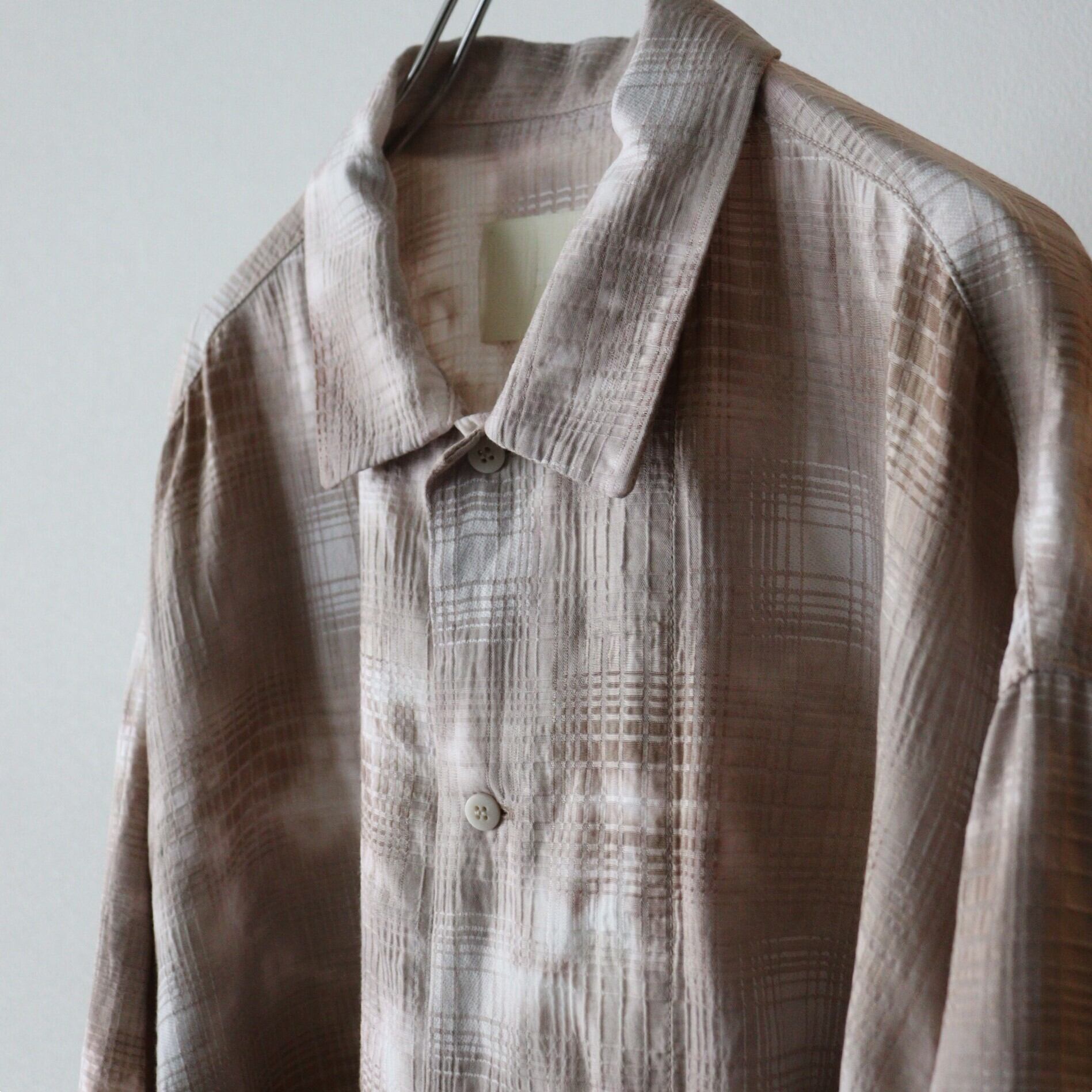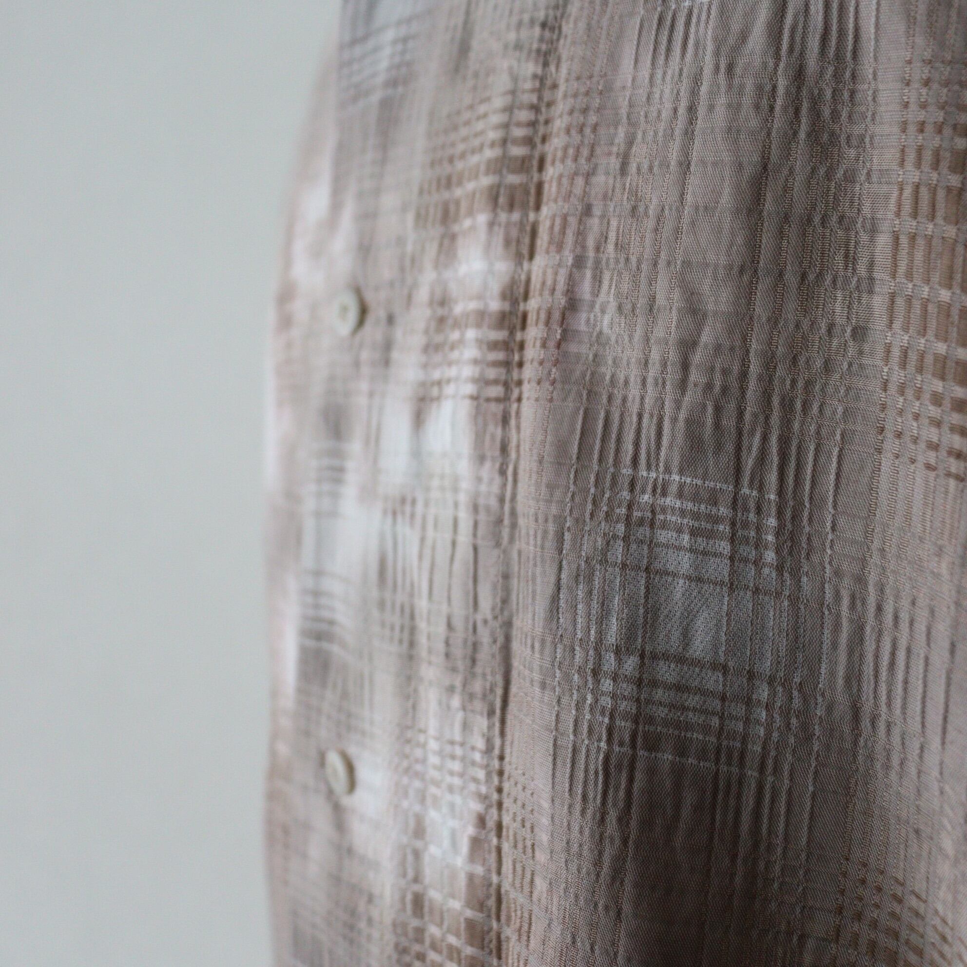 素材にはアセテート・綿・レーヨンで織り上げたオリジナルファブリックのオンブレチェック⽣地を採⽤。アセテート部分と綿レーヨン部分の染まる染料の違いを活かして、染めた際にオンブレチェックの柄が浮き出る設計になっています。今シーズンは、「注染」という染めの⼿法を採⽤し、1点1点職⼈さんが製品を丸めて紐で留め付け、上から染料を垂らしながら下から染料を吸い上げることにより染料を浸透させています。アセテート部分は染まらない染料を使⽤しているため、オンブレチェックでありながらムラ染を掛け合わせた、オリジナル感のある染めと柄に仕上がっています。