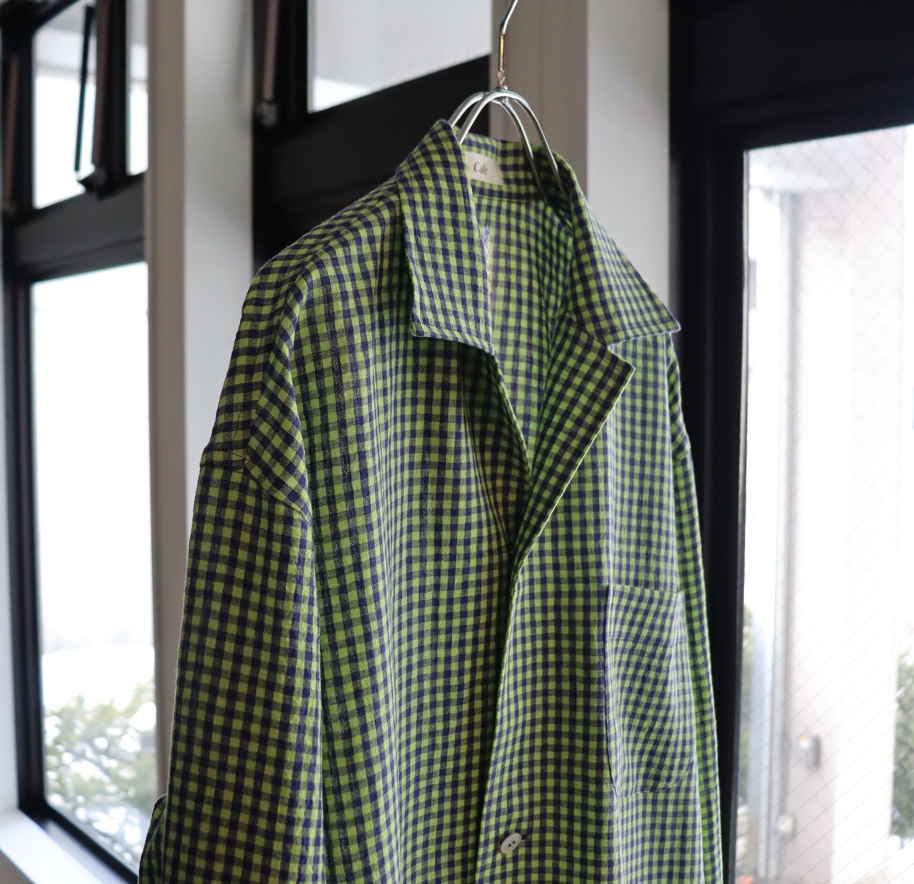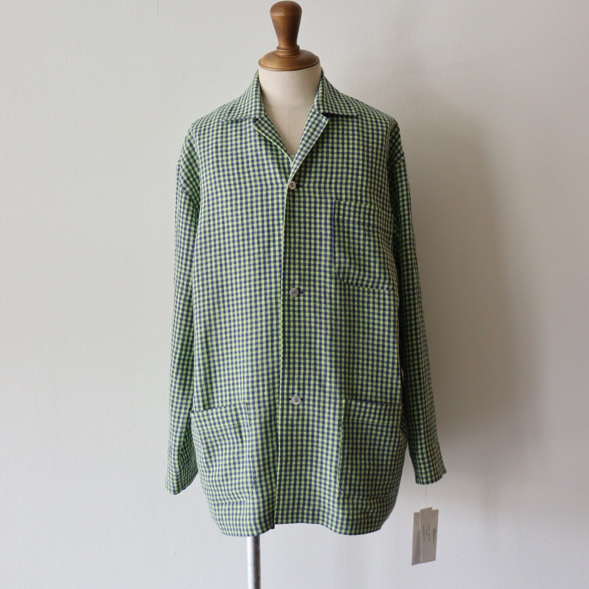ウオーターツイストリネン素材を使用し、非常に清涼感のあるタッチに仕上げたギンガムチェックシャツ。