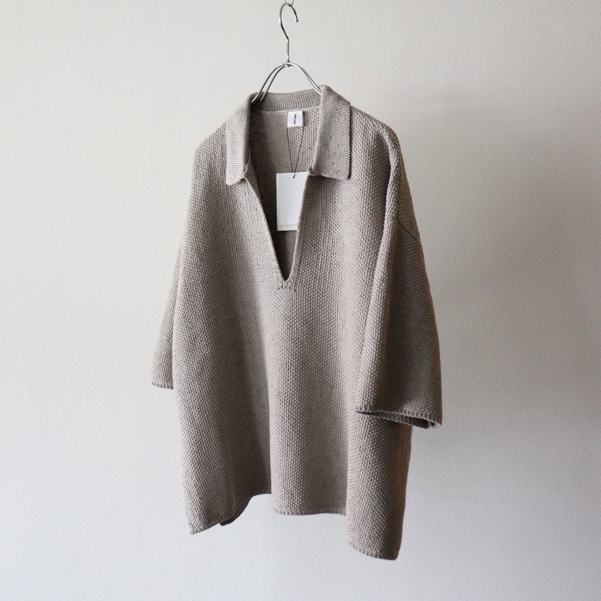 コード調の綿100%糸と、日本のスラブヤーンを引き揃えてインレイ編みで編み立てた布帛のような編み地のプルオーバーです。