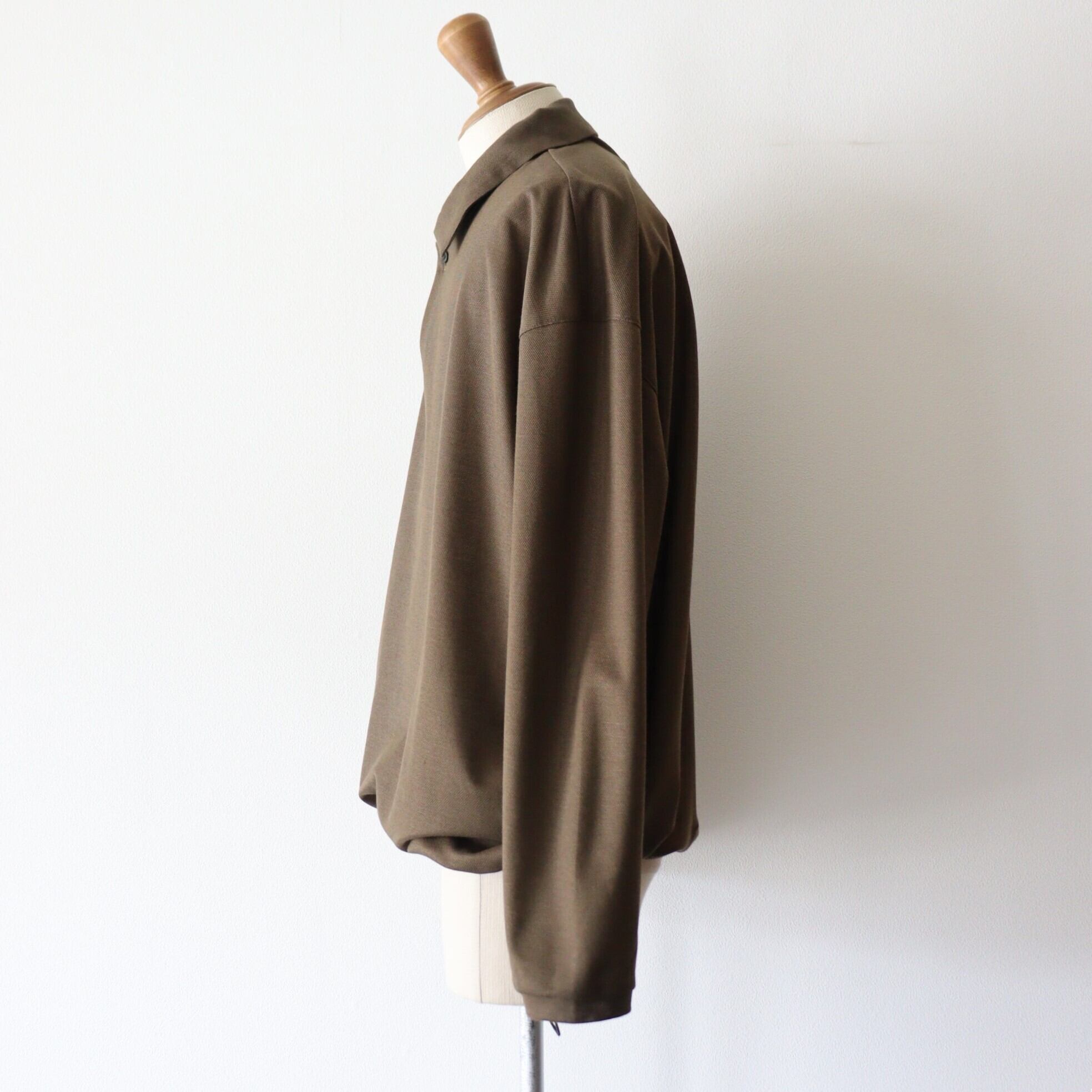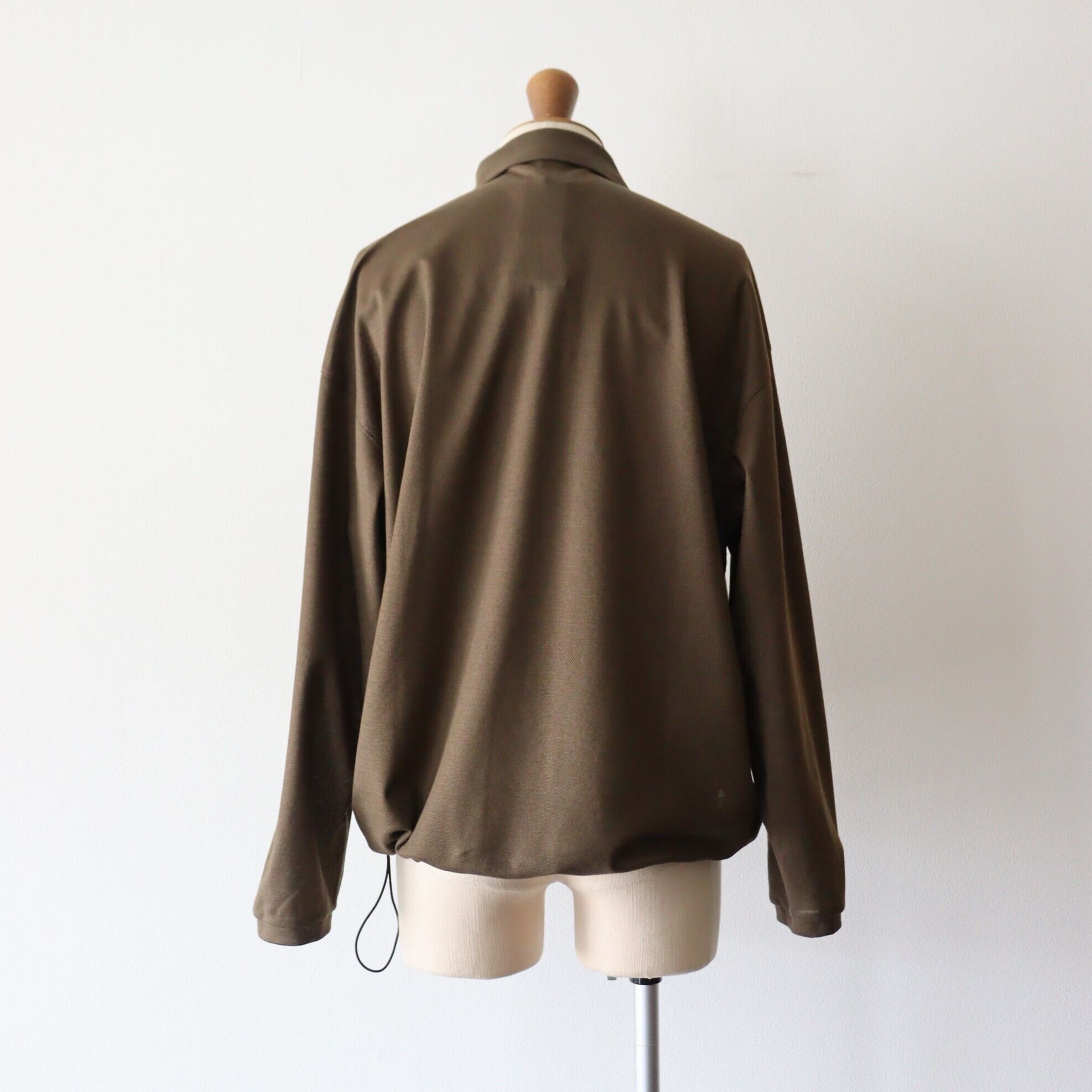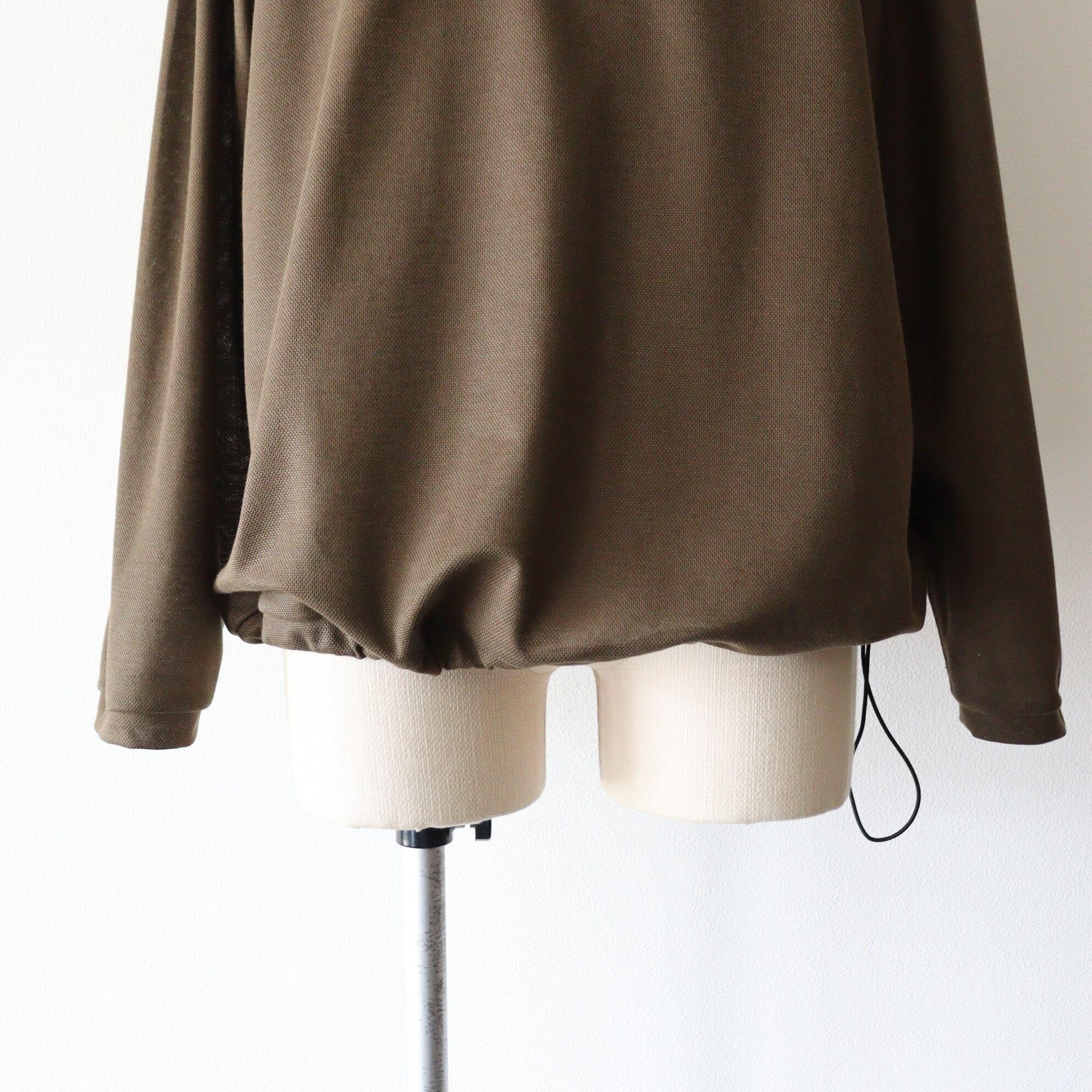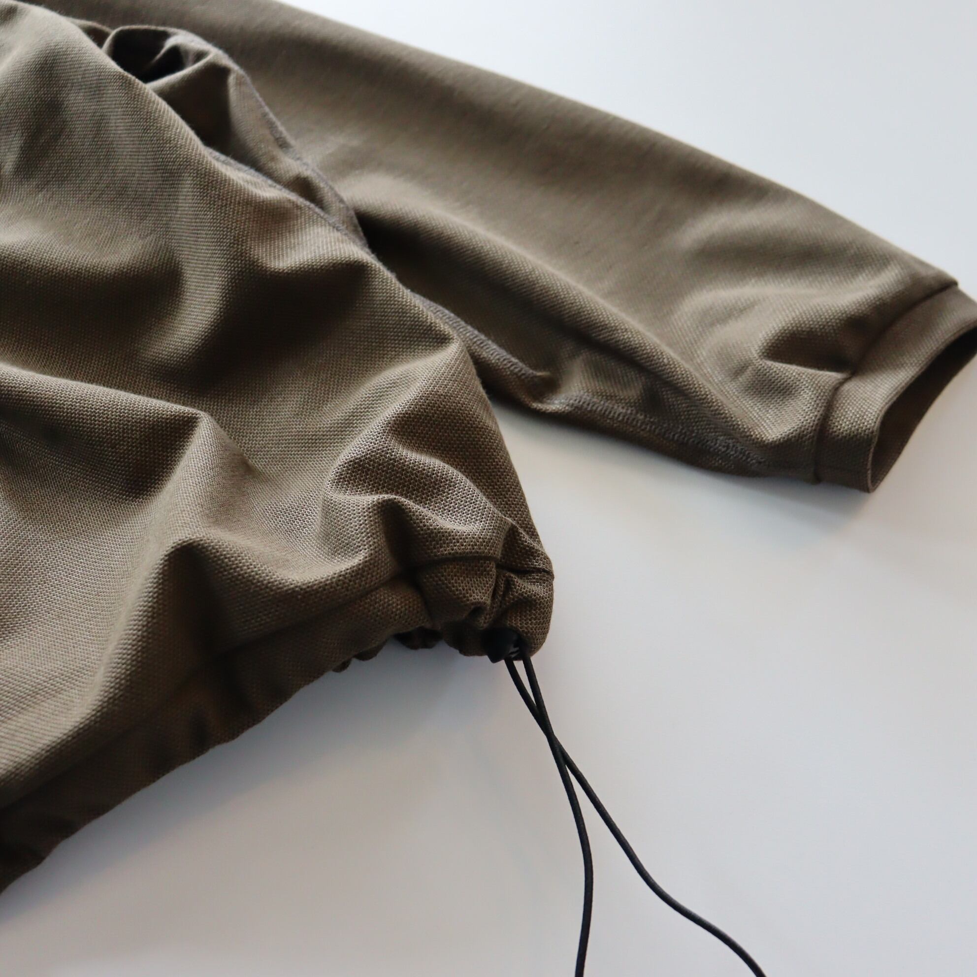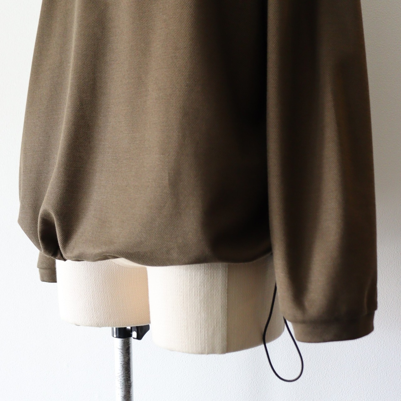 長袖のポロと聞くとあまりファッショナブルなイメージを持たれるのかもしれませんが、生地のハリ感とボリュームのあるシルエットを裾スピンドルで絞っての着用が非常に雰囲気のあるスタイリングに仕上げてくれます。