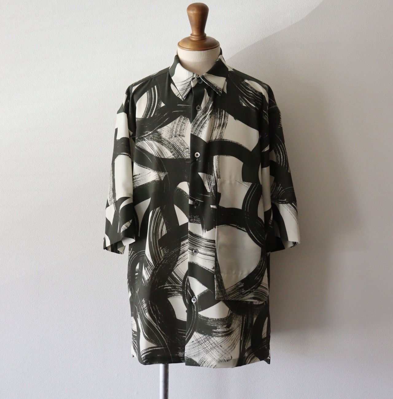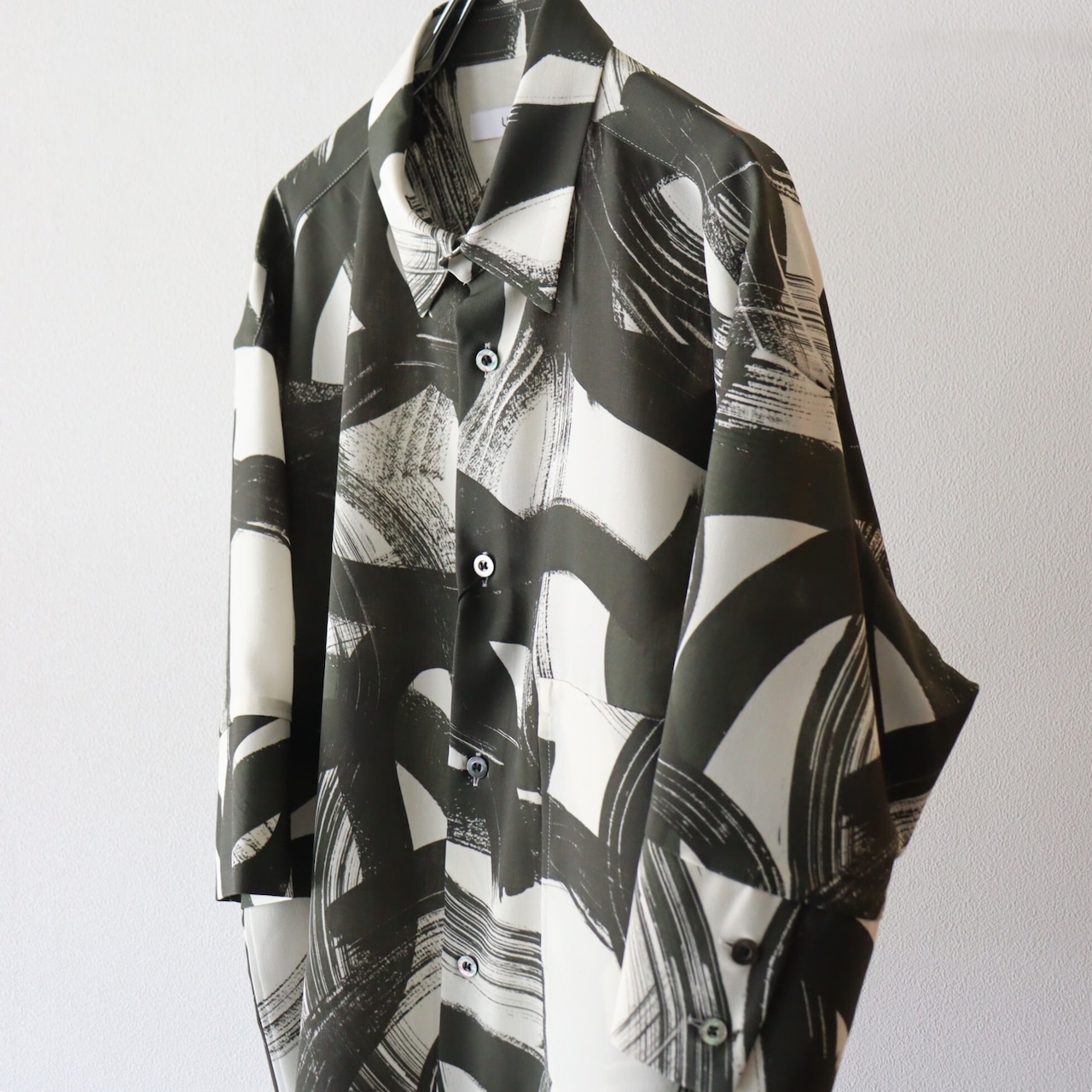 シックアンドシンの⽷特有のムラ感によるナチュラルな表情のある⽣地をベースにすることで、グラフィックに⽴体感を与えています。ドライタッチな肌触りとナチュラルなストレッチも特徴の⽣地です。スリットの⼊った⼤ぶりなカフスが特徴的な五分丈のリラックスシルエ