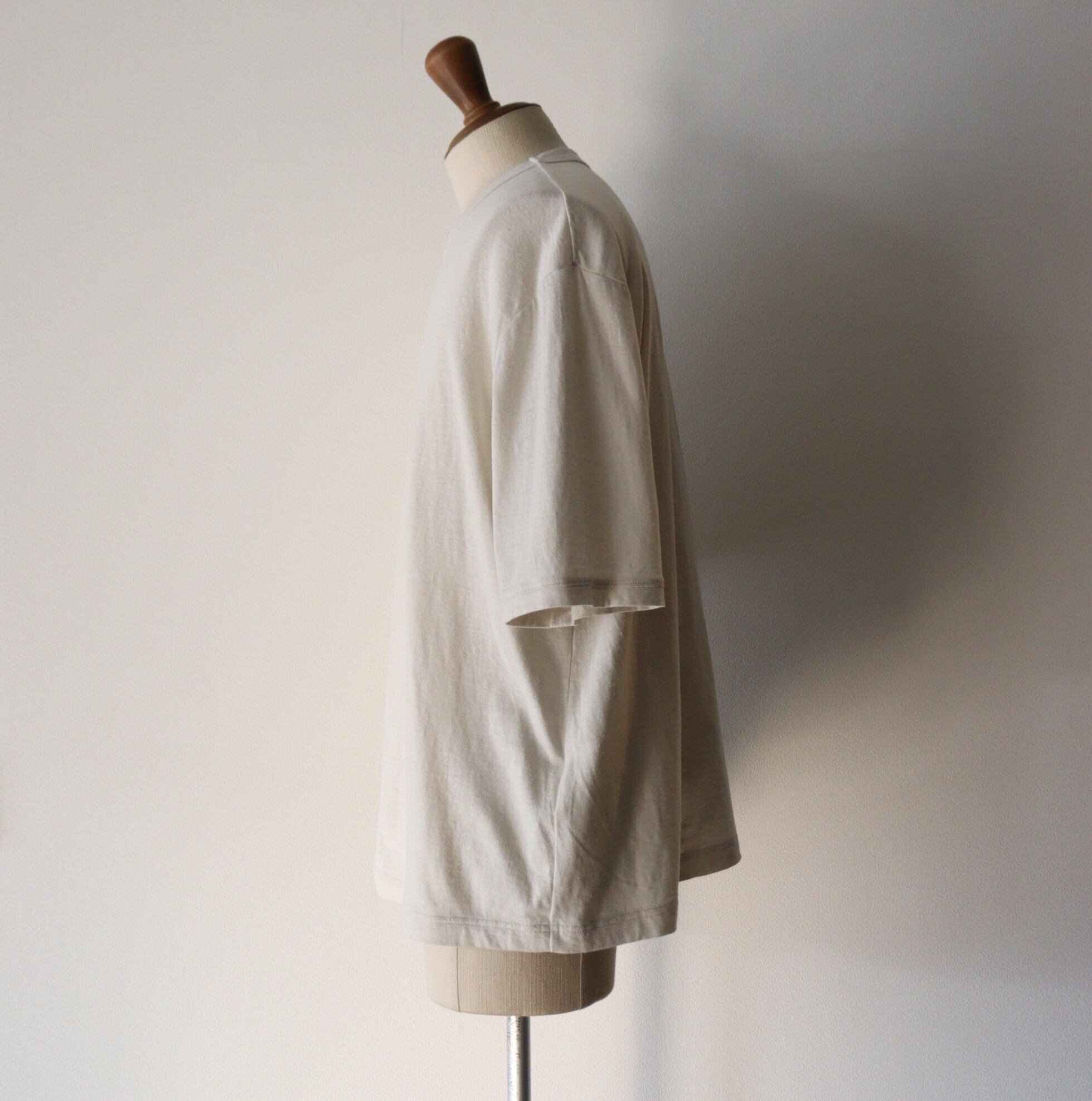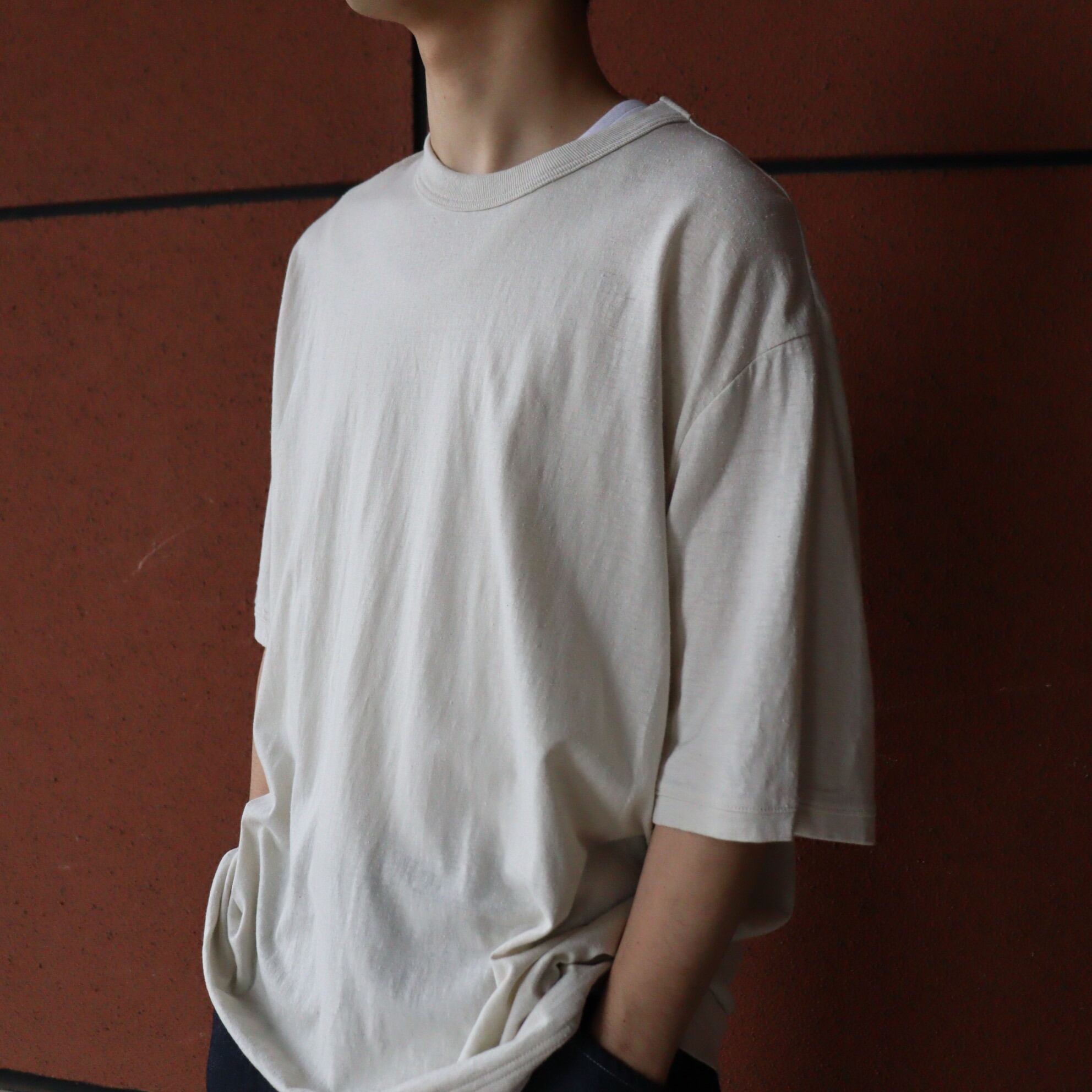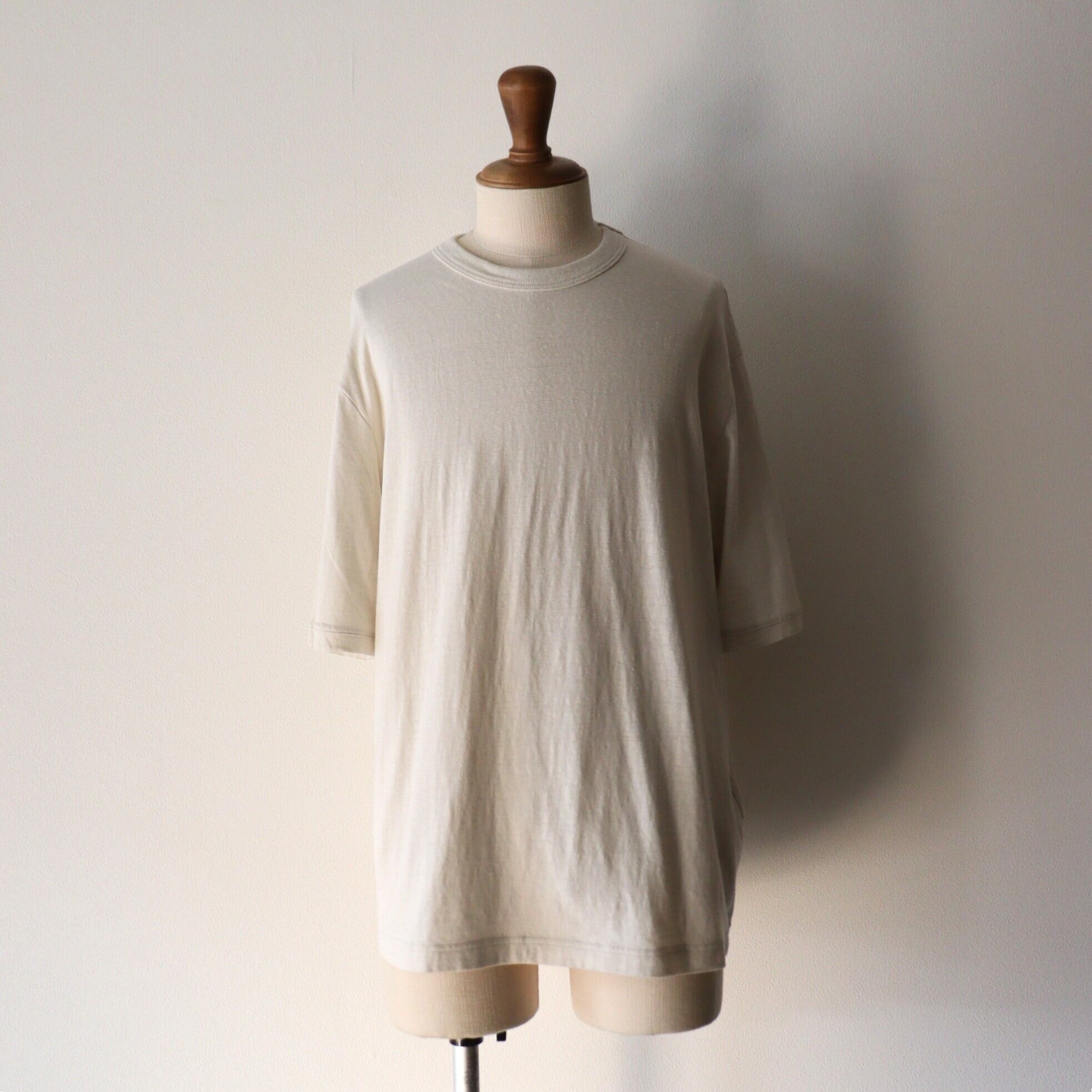 コットンネップとシルクネップをミックスした天竺素材を使用したハーフスリーブTシャツ。シルク混でとろみがある柔らかな素材のため着用感がとても気持ちのいいTシャツです。ゆるりとしたサイズ感を選んで落ち感を楽しんで欲しいアイテムです。