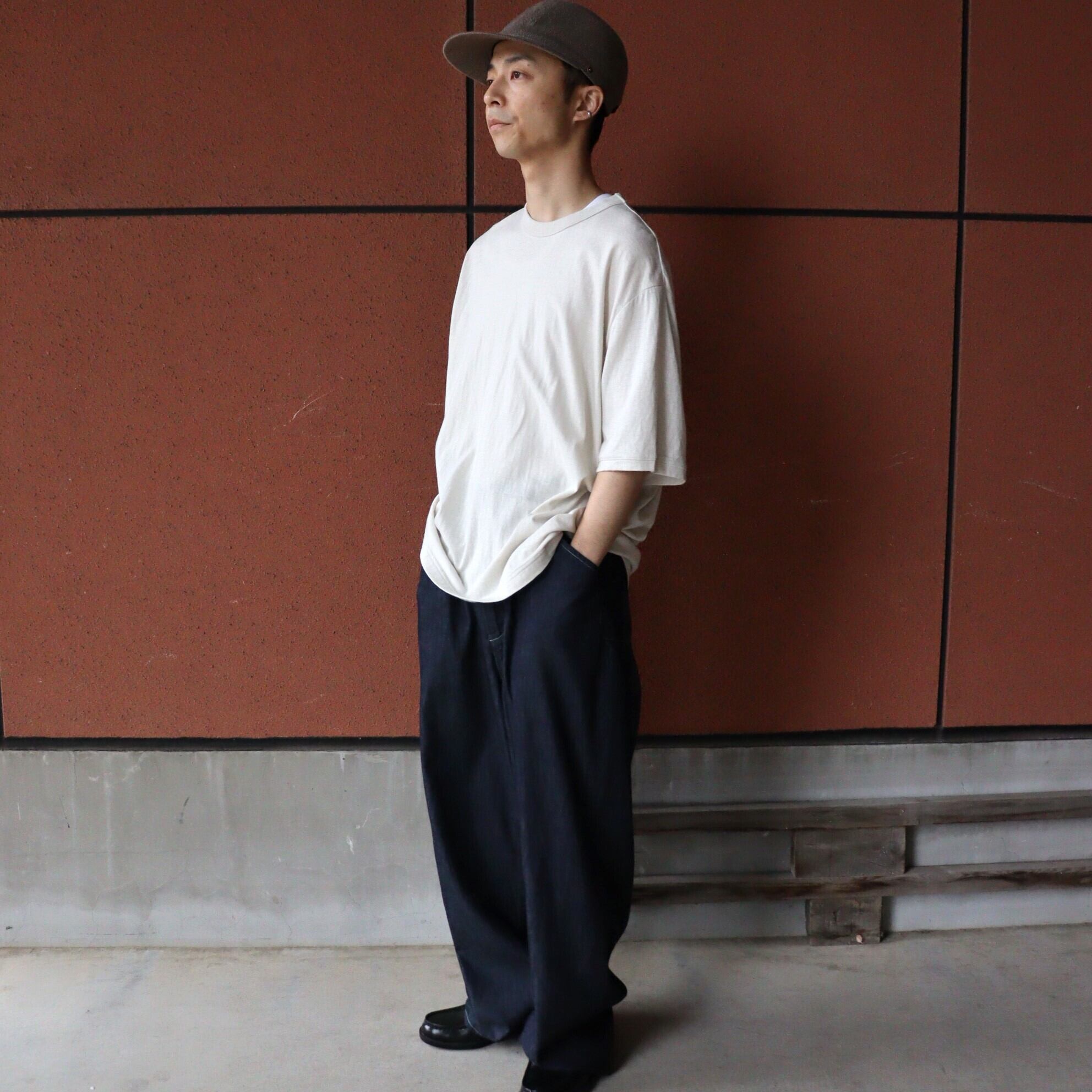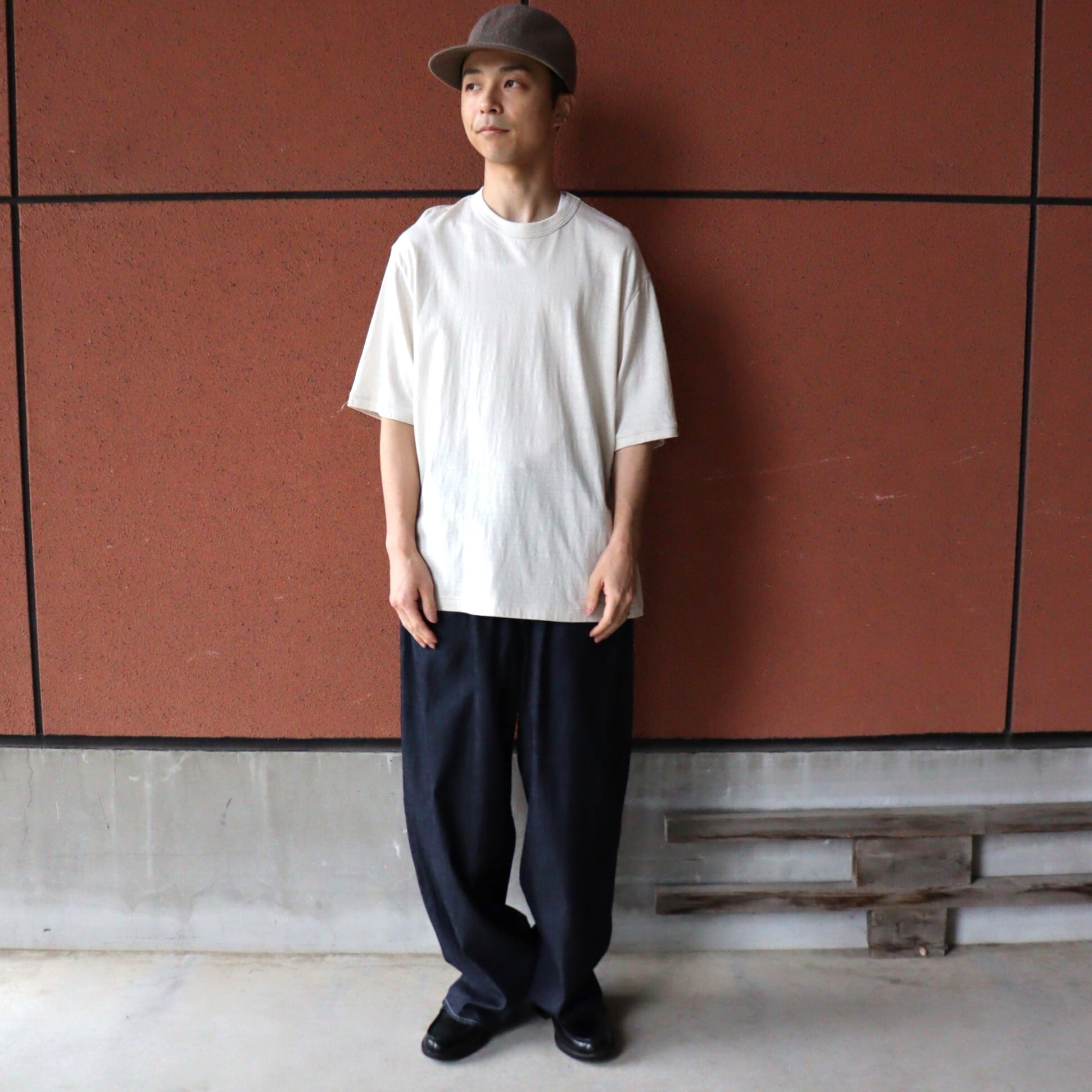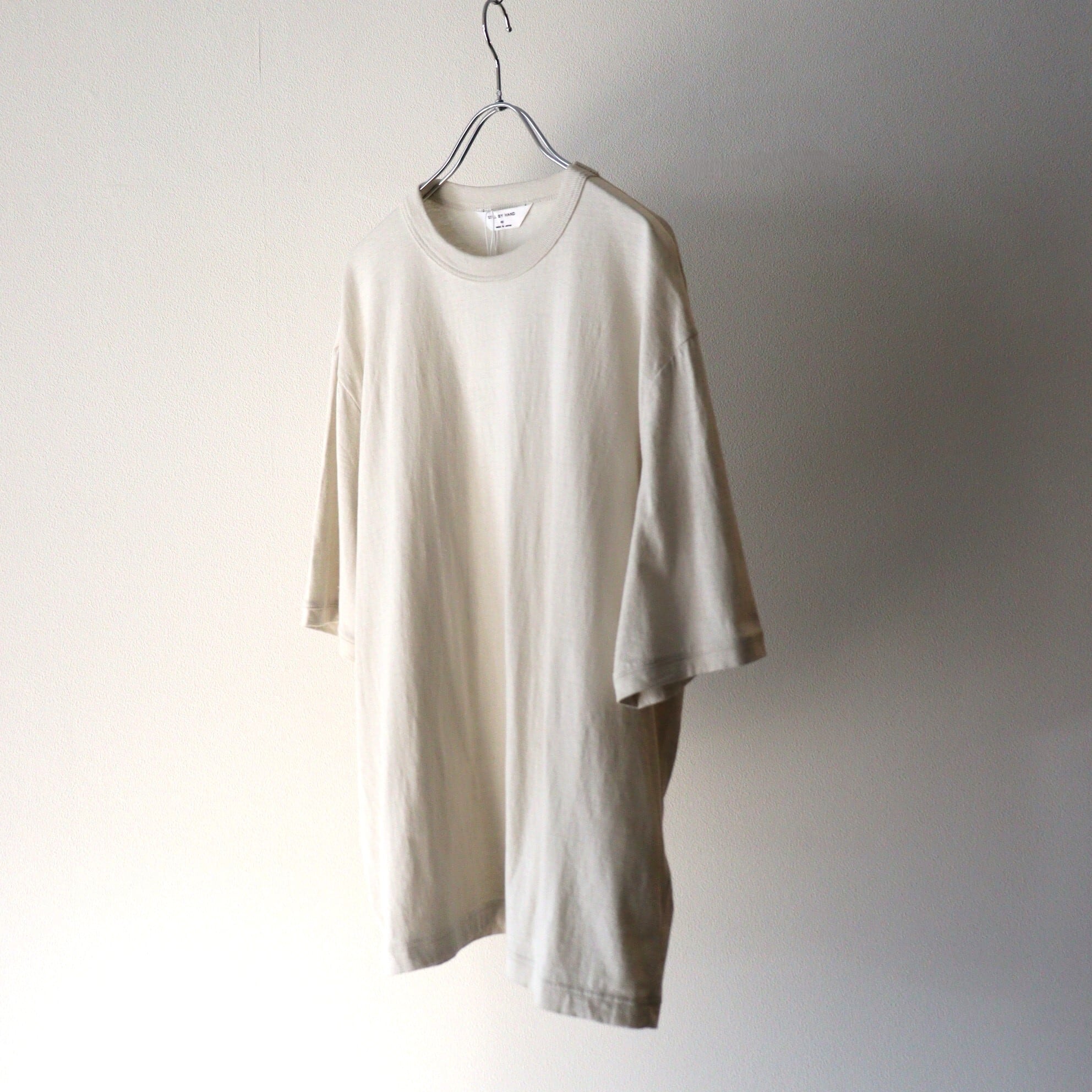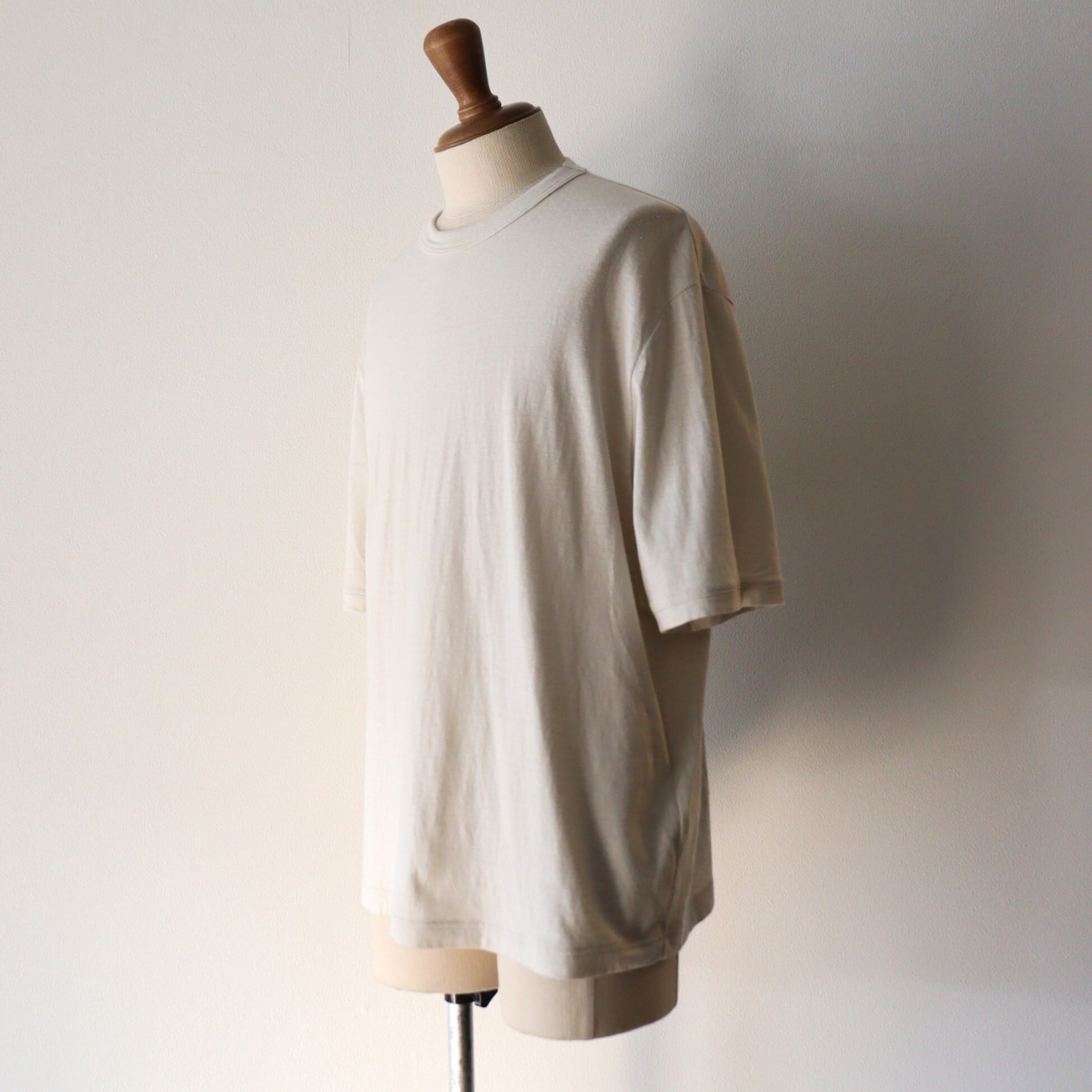 コットンネップとシルクネップをミックスした天竺素材を使用したハーフスリーブTシャツ。シルク混でとろみがある柔らかな素材のため着用感がとても気持ちのいいTシャツです。ゆるりとしたサイズ感を選んで落ち感を楽しんで欲しいアイテムです。
