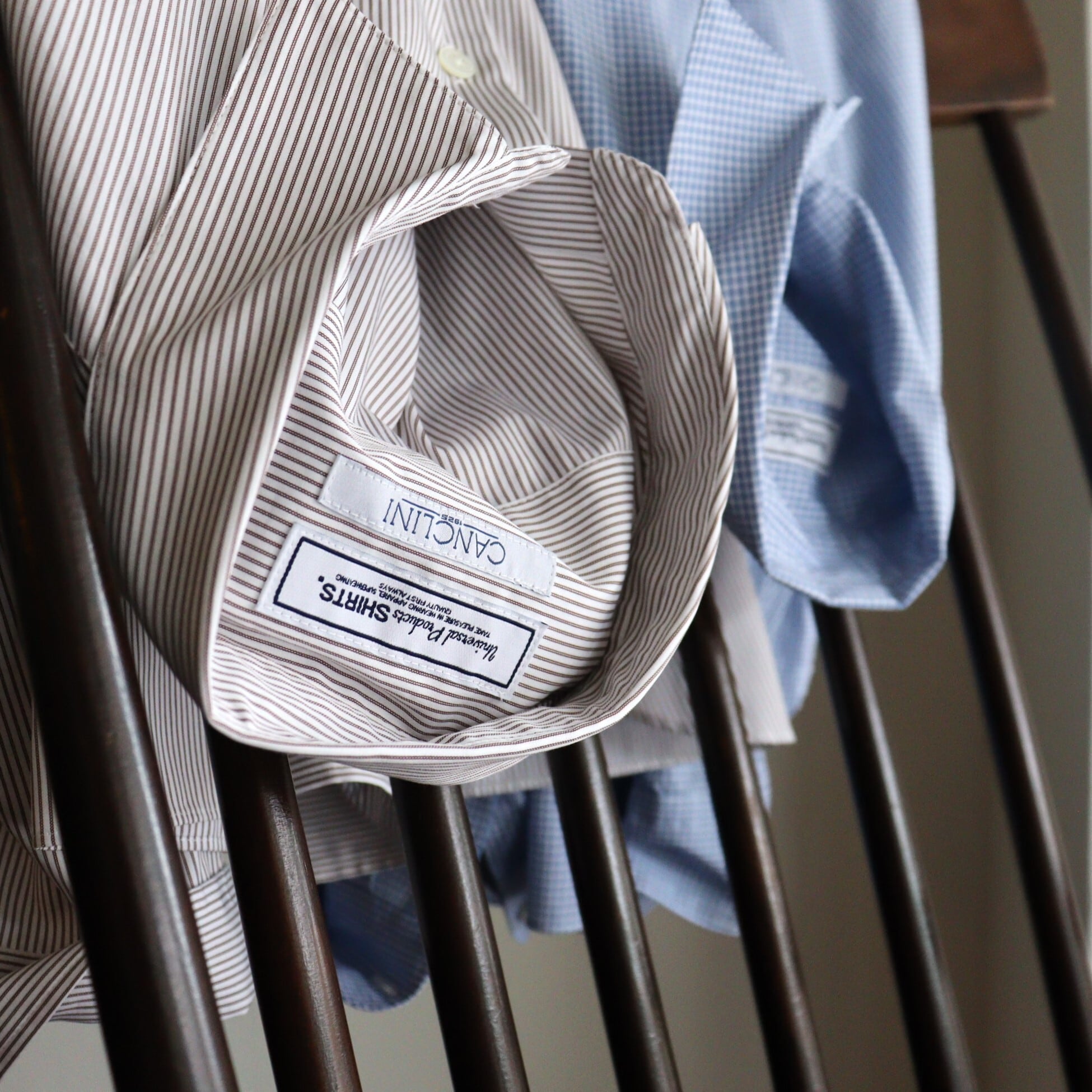ヴィンテージのドレスシャツをイメージし、着丈も長め、程よくつめた首回り。ドレスシャツの工場で縫うことで運針数も細かく通常の倍ほど、襟もフラシ芯で本格的に仕立ててもらいました。