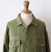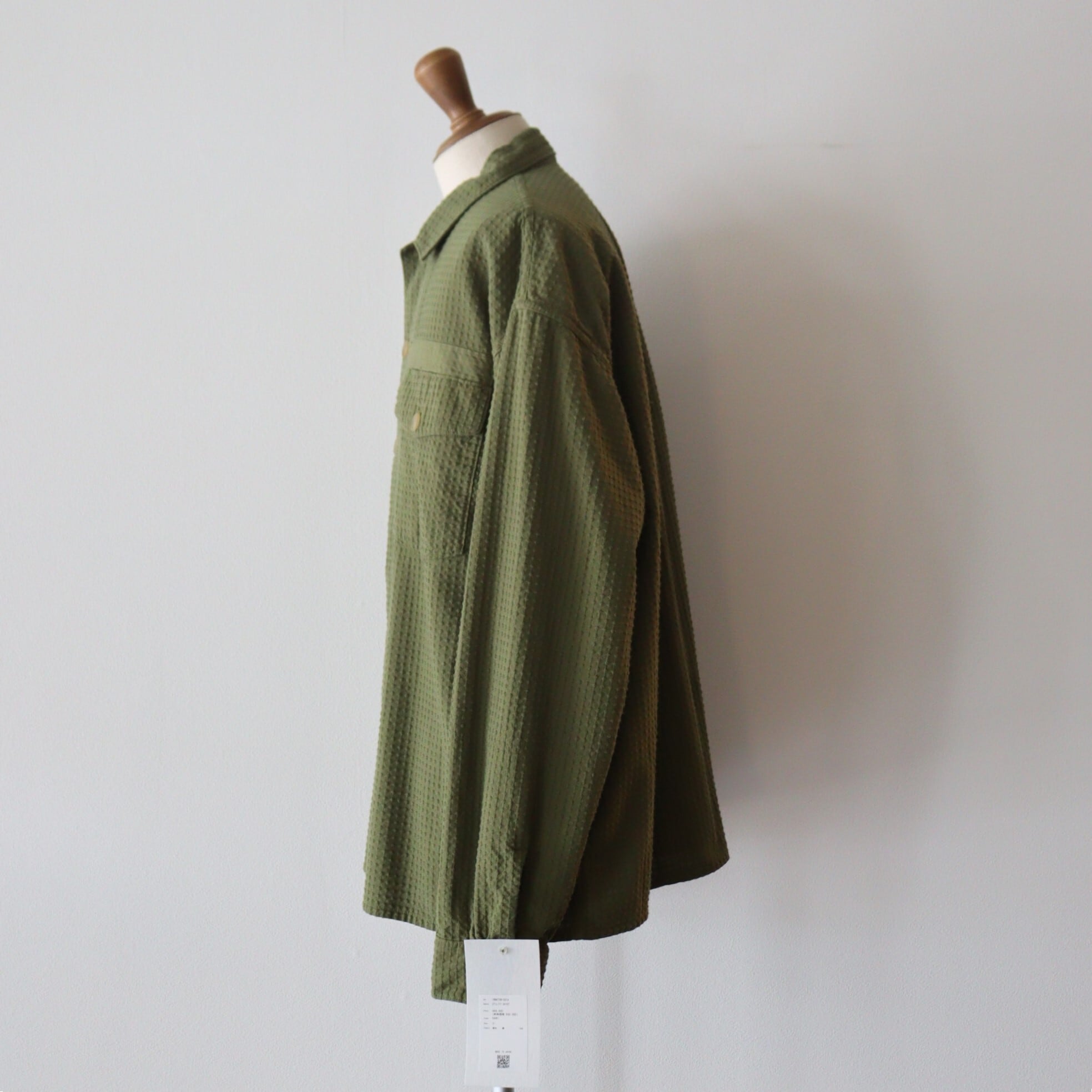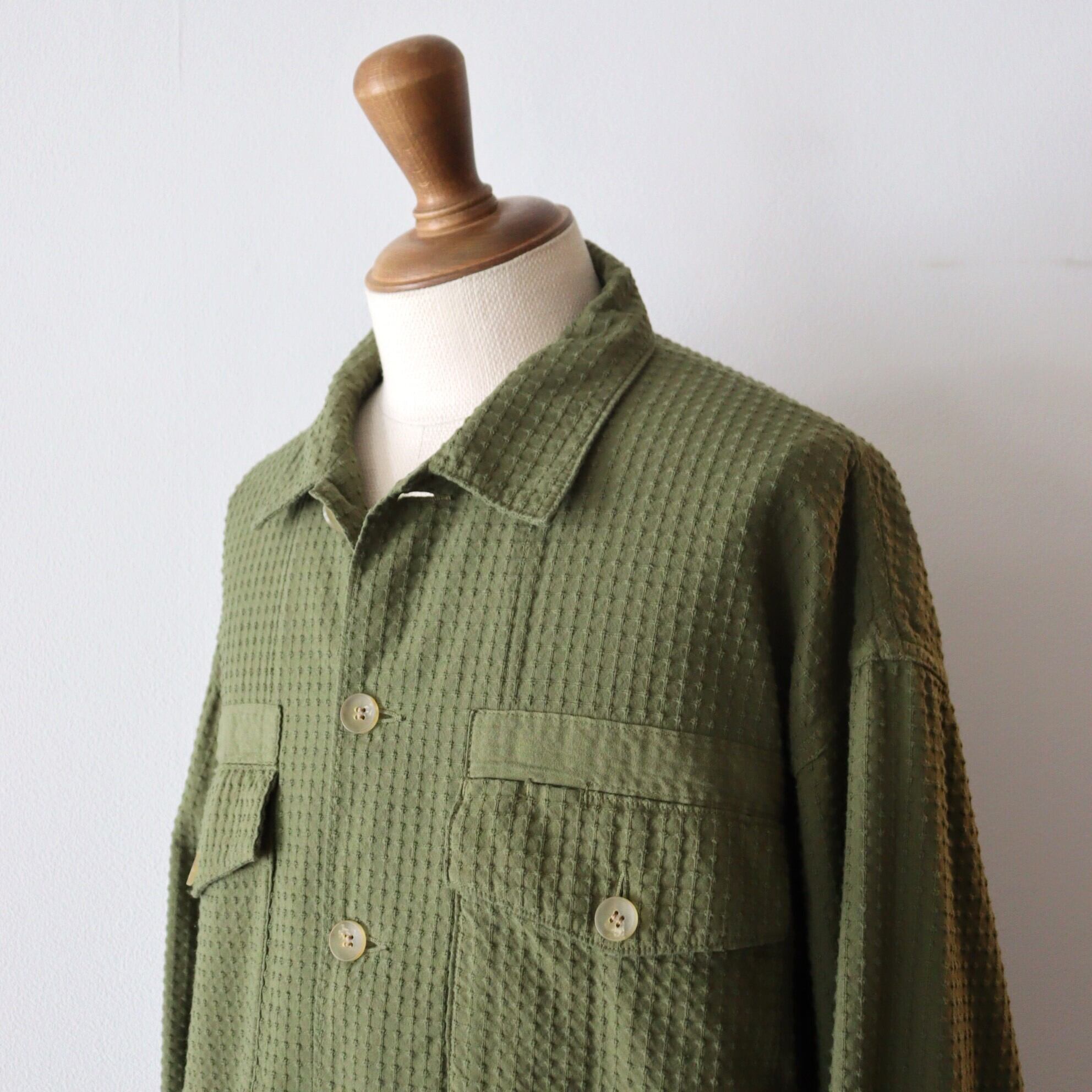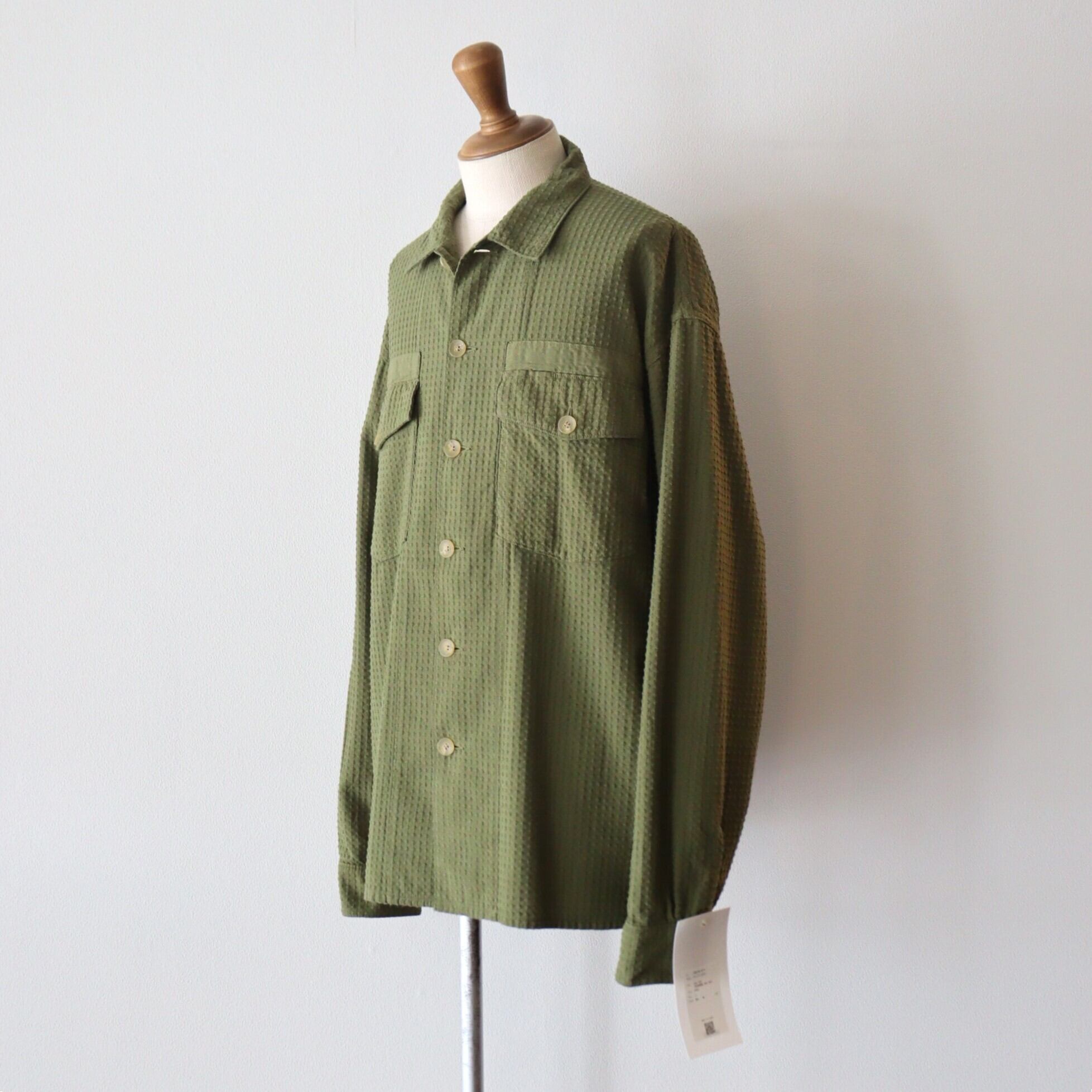 シル エットのボリューム感を調整しています。 素材には、⼗⽂字刺し⼦⾵のドビー素材を使⽤。柔らかな⾵合いと相反するミリタリーシャツの無⾻な印象が、良い化学反応で調和されたアイテムに仕上がっています。夏の終盤から秋⼝にかけて活躍する⼀着です。染⾊には、Khakiはウコン、Sumikuroは備⻑炭から染料を抽出してボタニカルハイブリッド染加⼯を施しています.