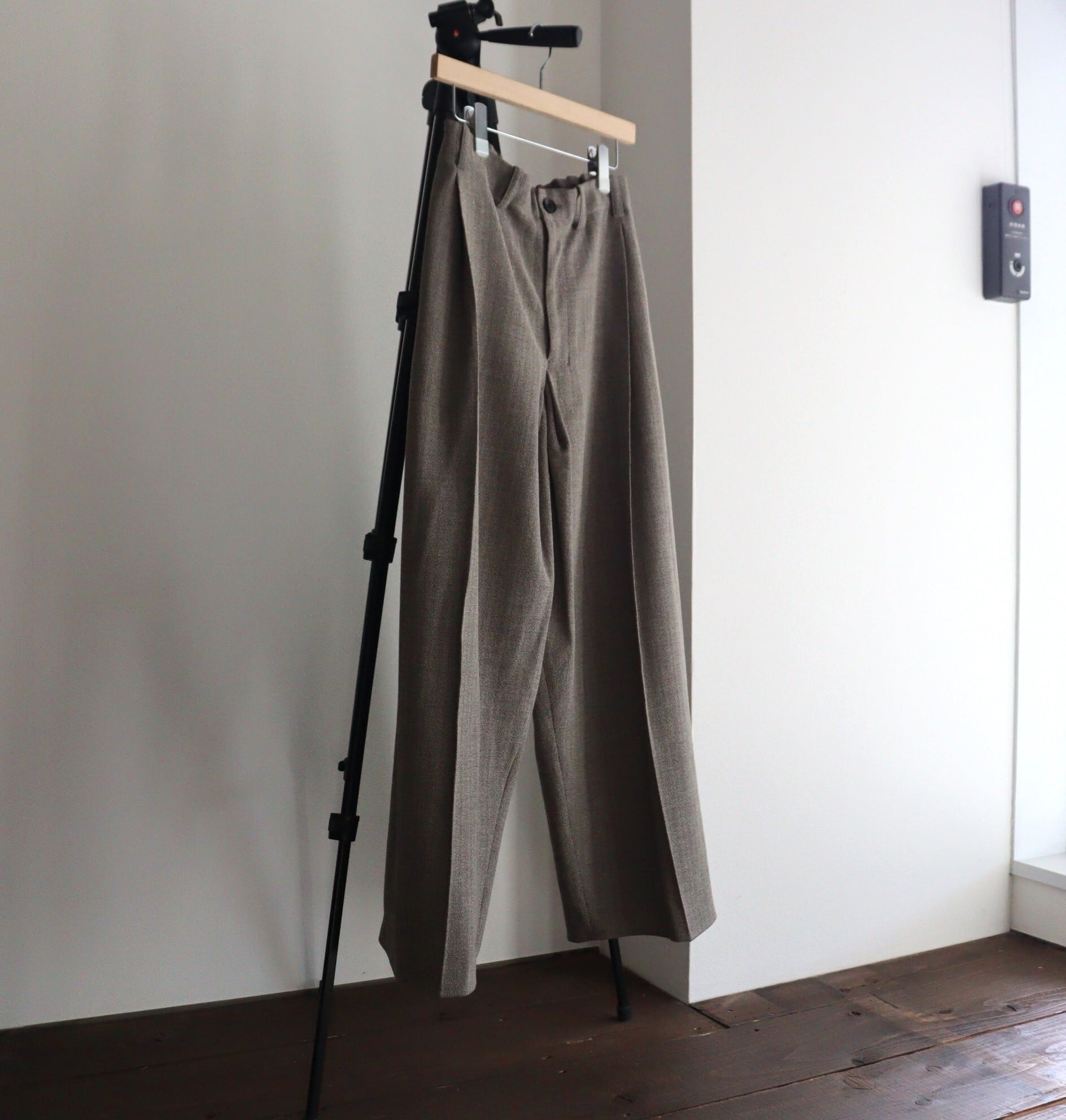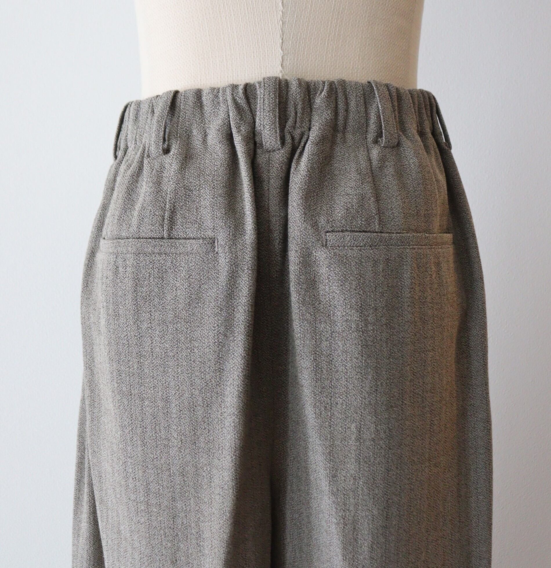 脇線に縫い目が無いのが特徴で、一枚の布をより立体的に見せるために、股下にわたりを大量に確保ができるボックスプリーツを採用しております。