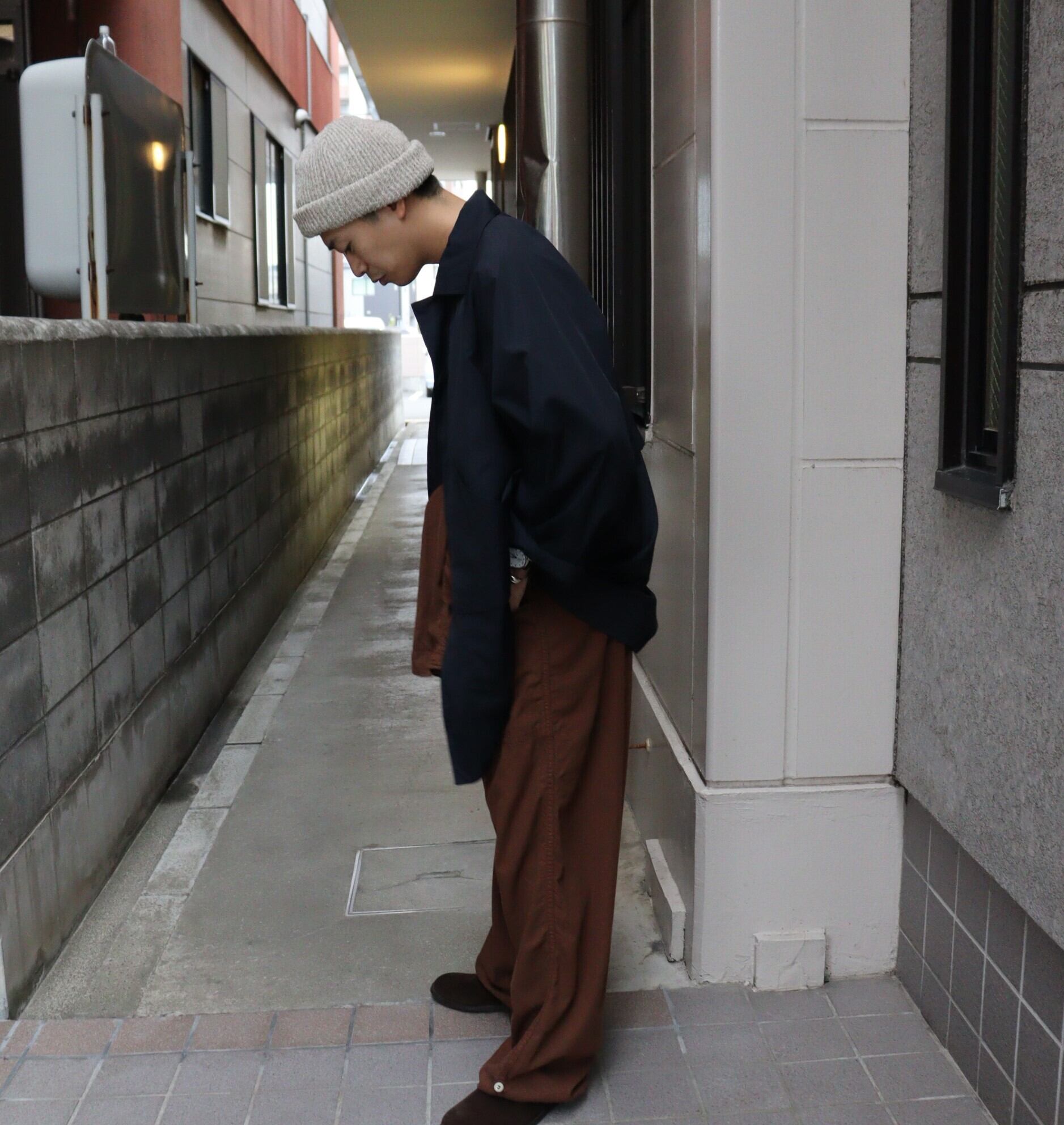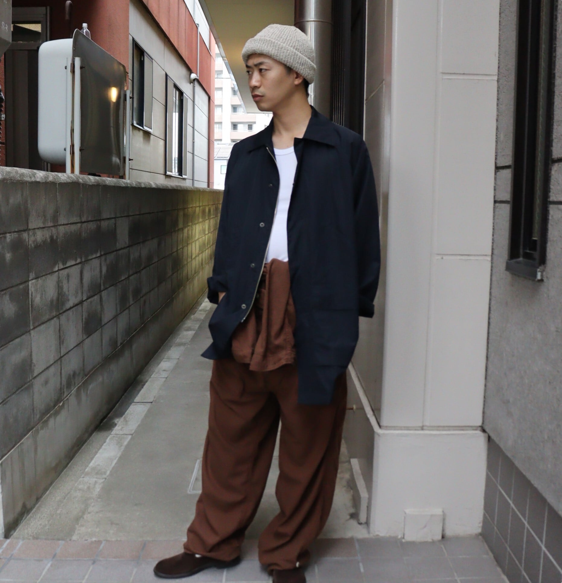 オリジナルデザインでは細めだった上半⾝のシルエットを改良し、デイリーに使⽤しやすい様に袖の分量と袖釜を深く調整。ウエストベルト仕様を廃⽌し、内側に紐を通すことで、ベル