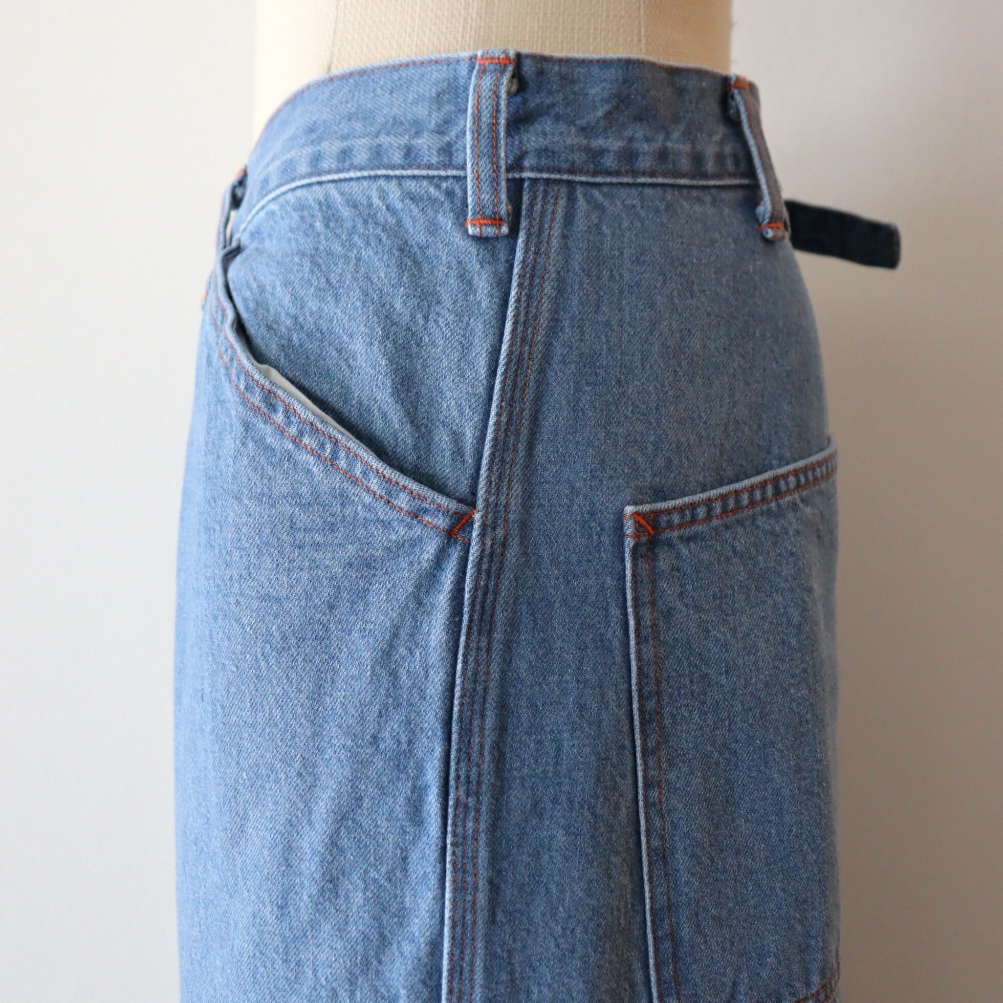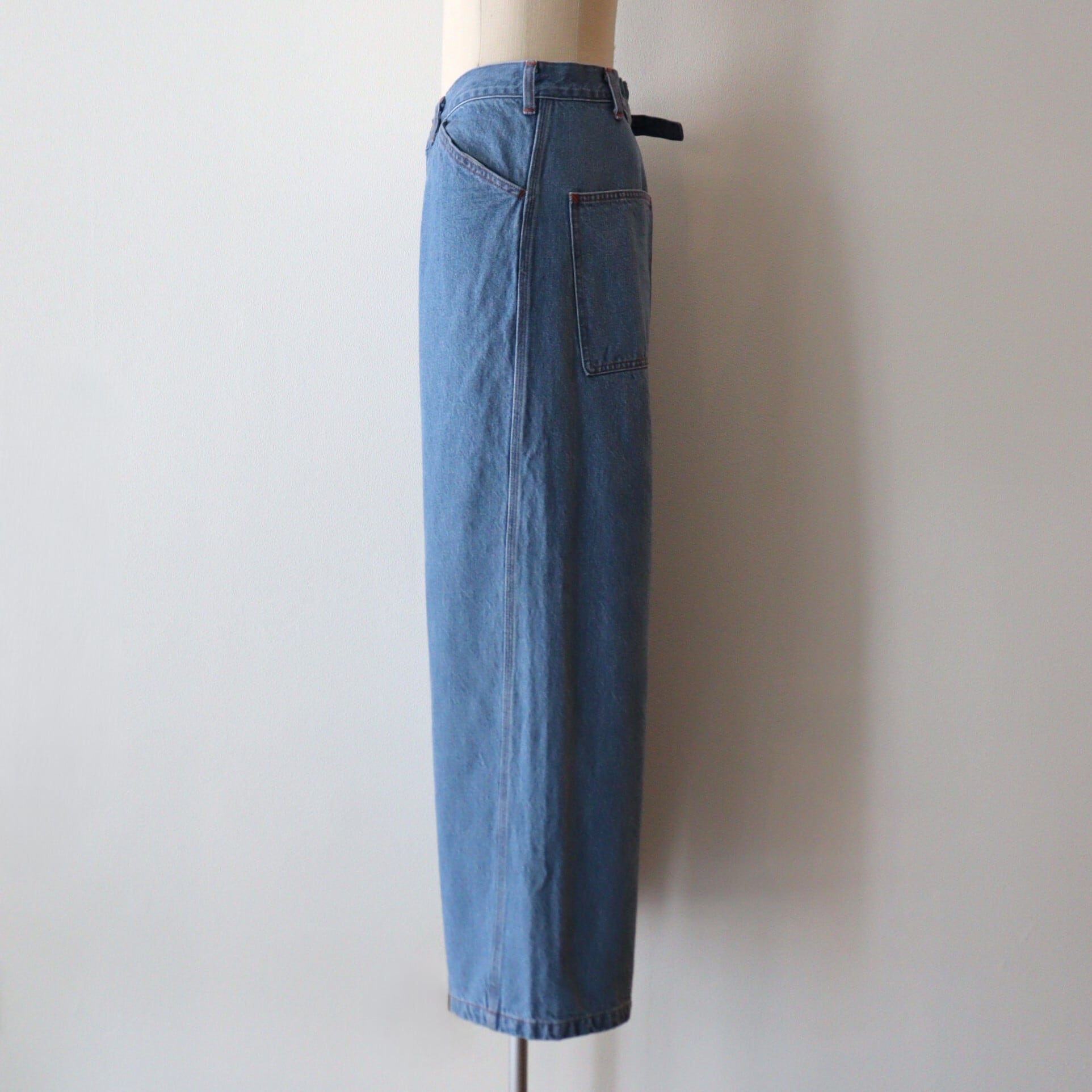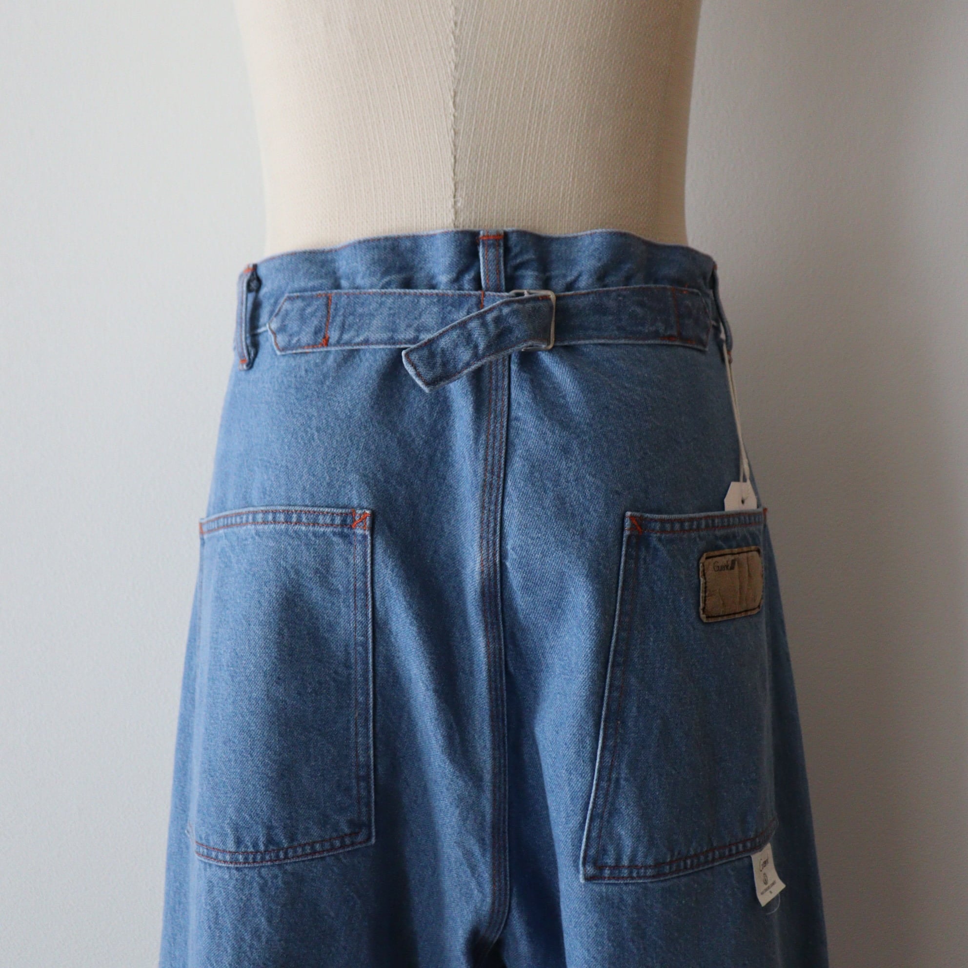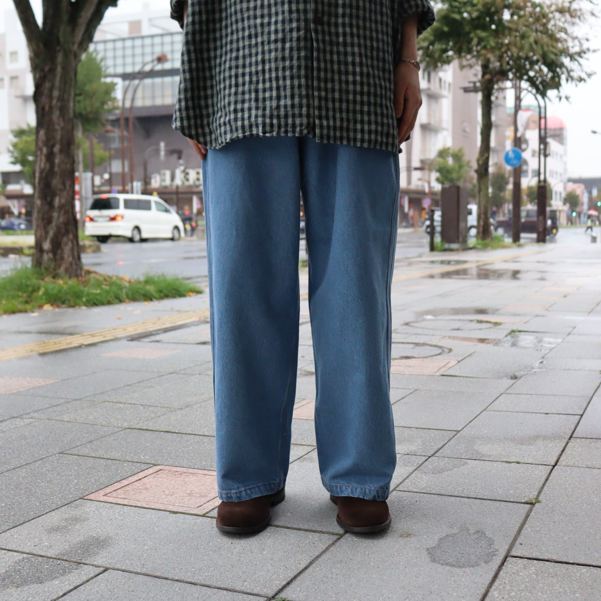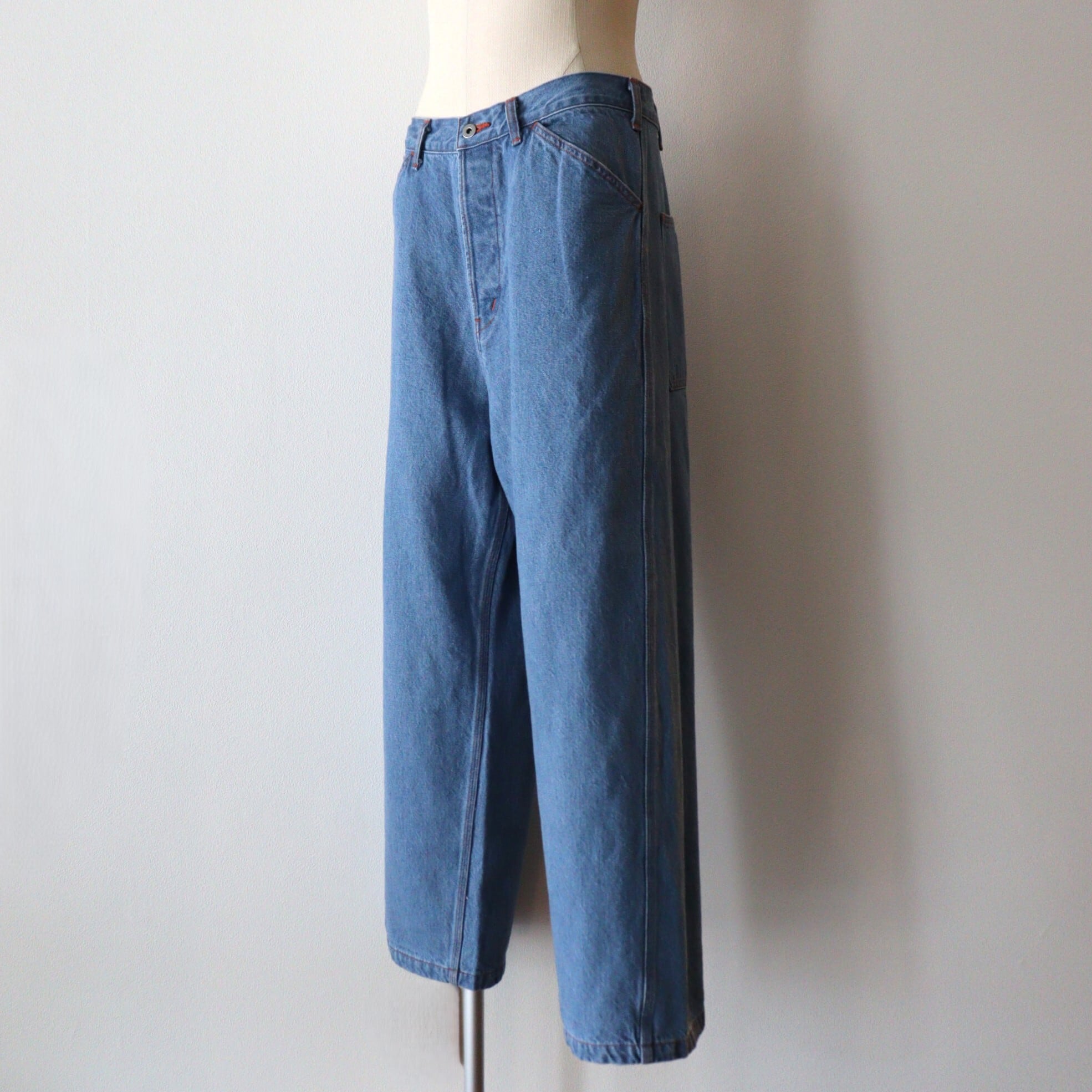 13ozの生機デニムを縫製し、その後ブリーチ加工を施しVintageにあるような斜行した面が特徴的なペインターパンツ。