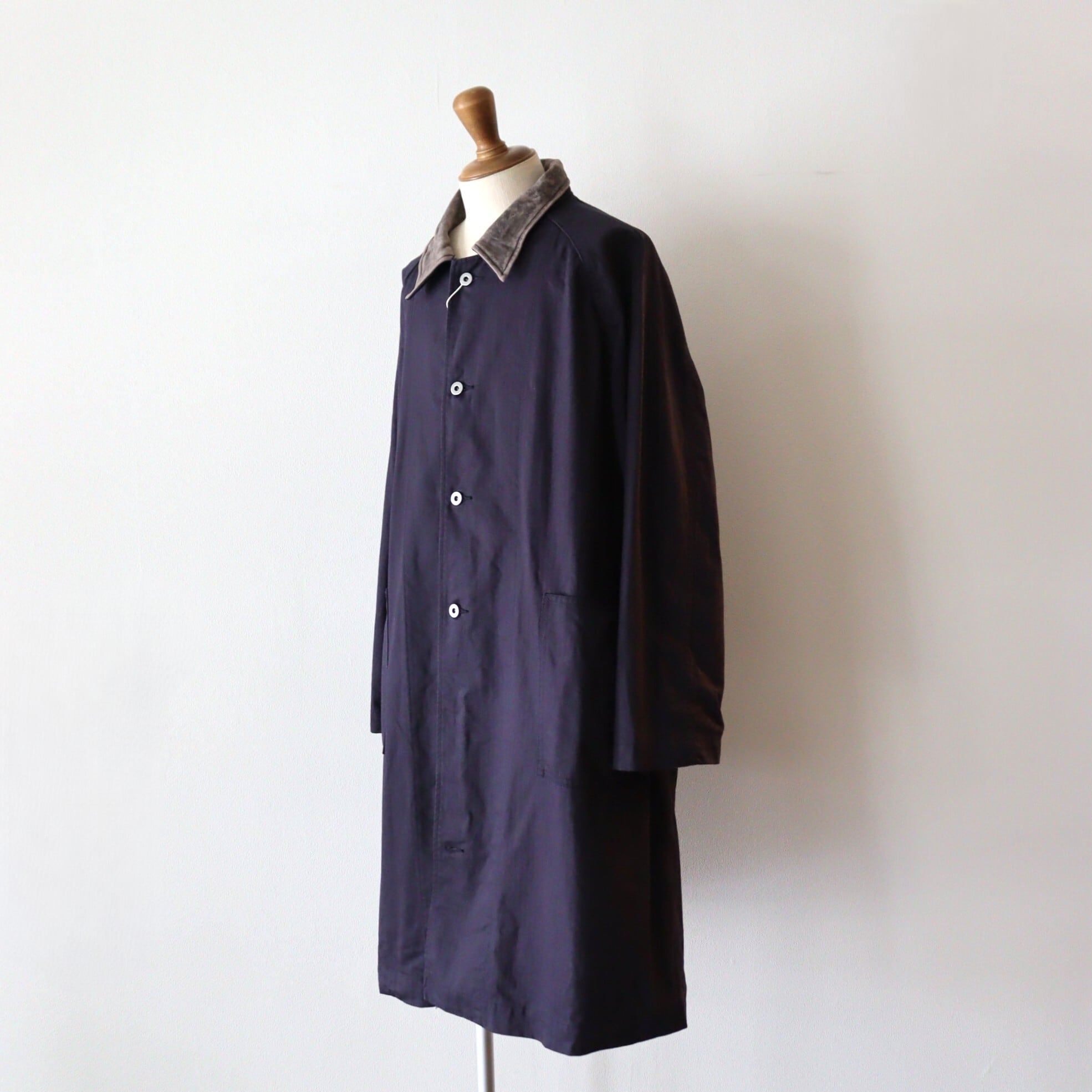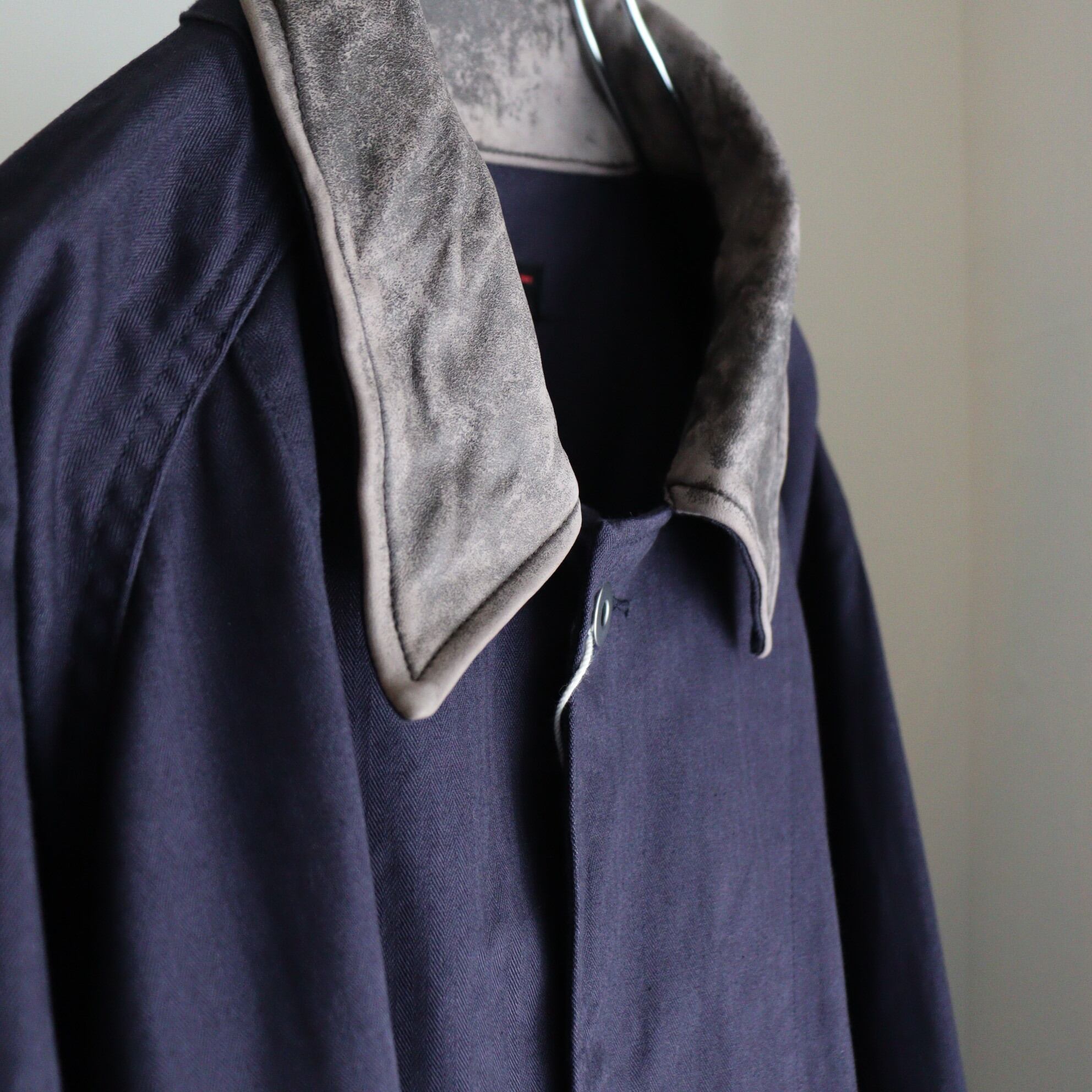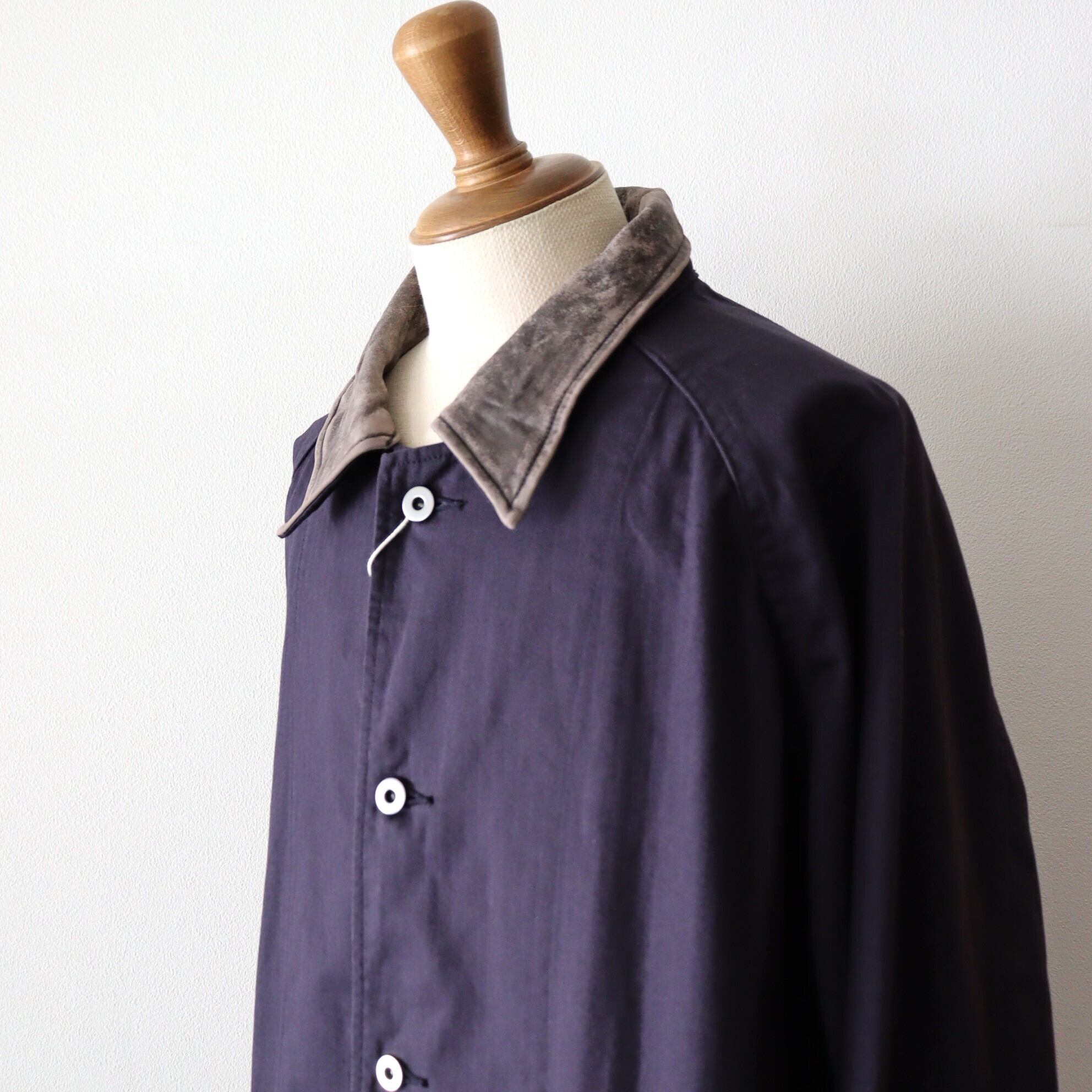 色見は赤みがかった綺麗なナス紺に、衿に使用しているトルコ産のラムレザーを水洗い&天日干ししたレザーの雰囲気が非常にマッチングし、いい雰囲気な1枚に仕上っております。