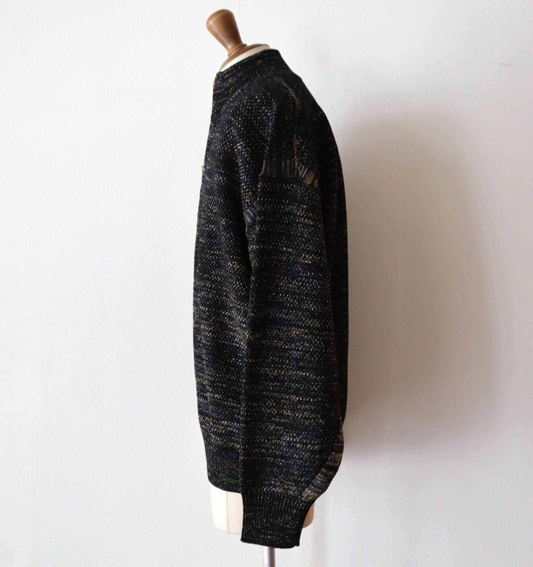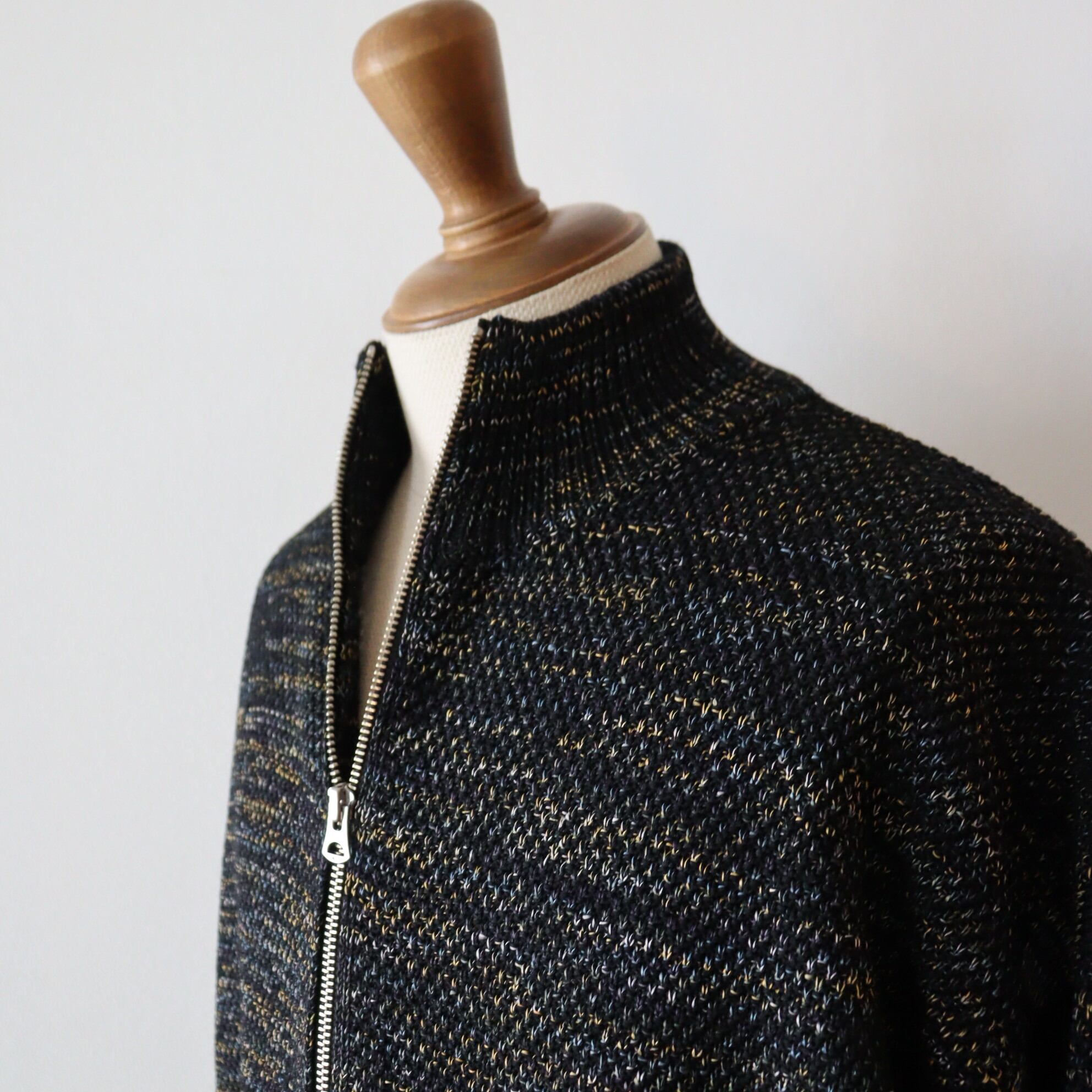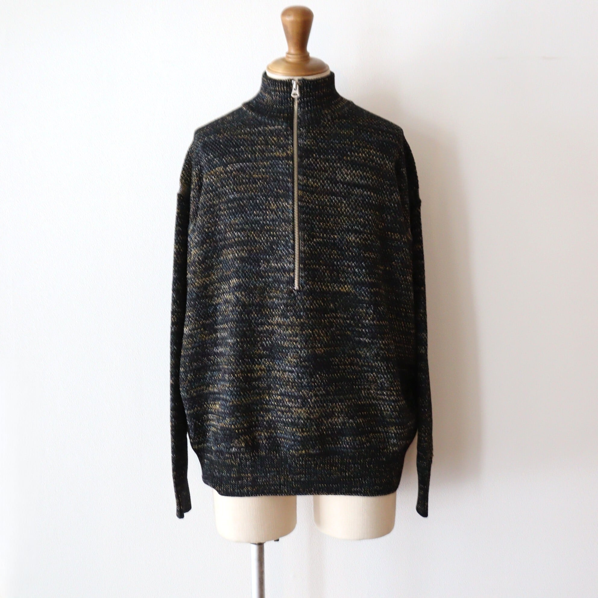 イエローブルーのカスリ糸をプレーティングして鹿の子編みで編み立てたハーフジッププルオーバー。