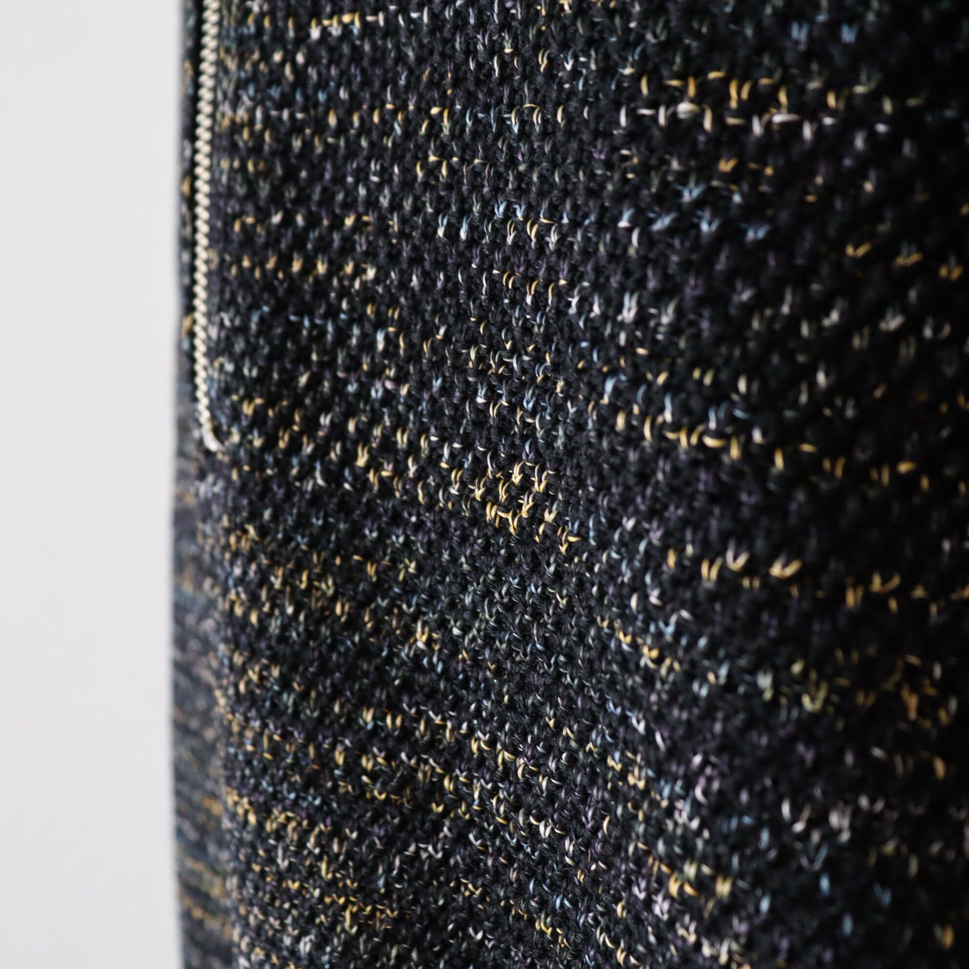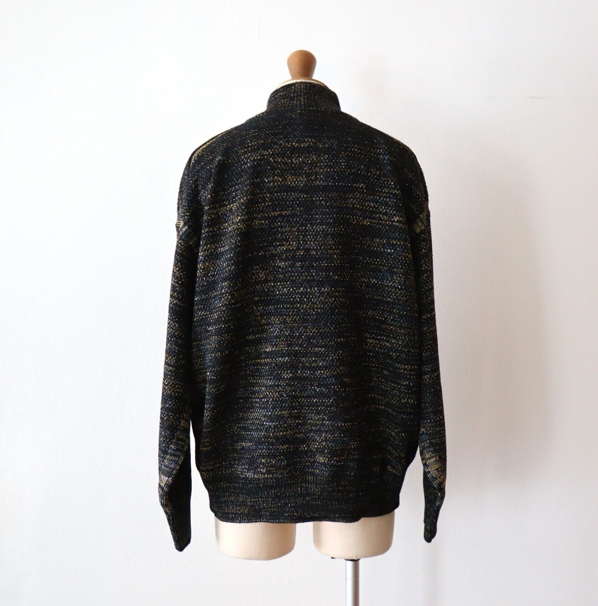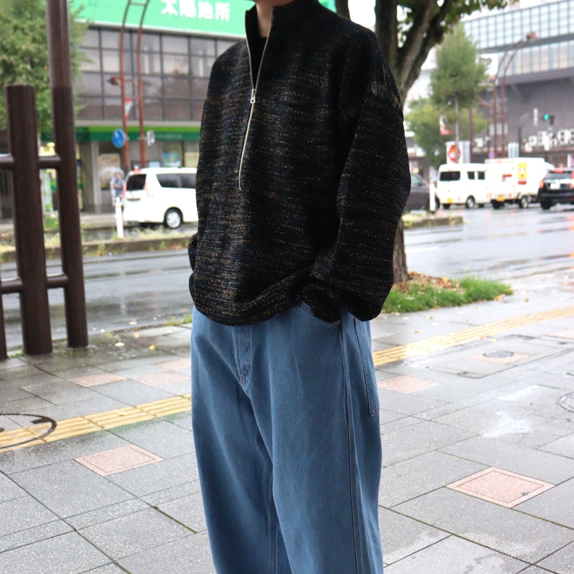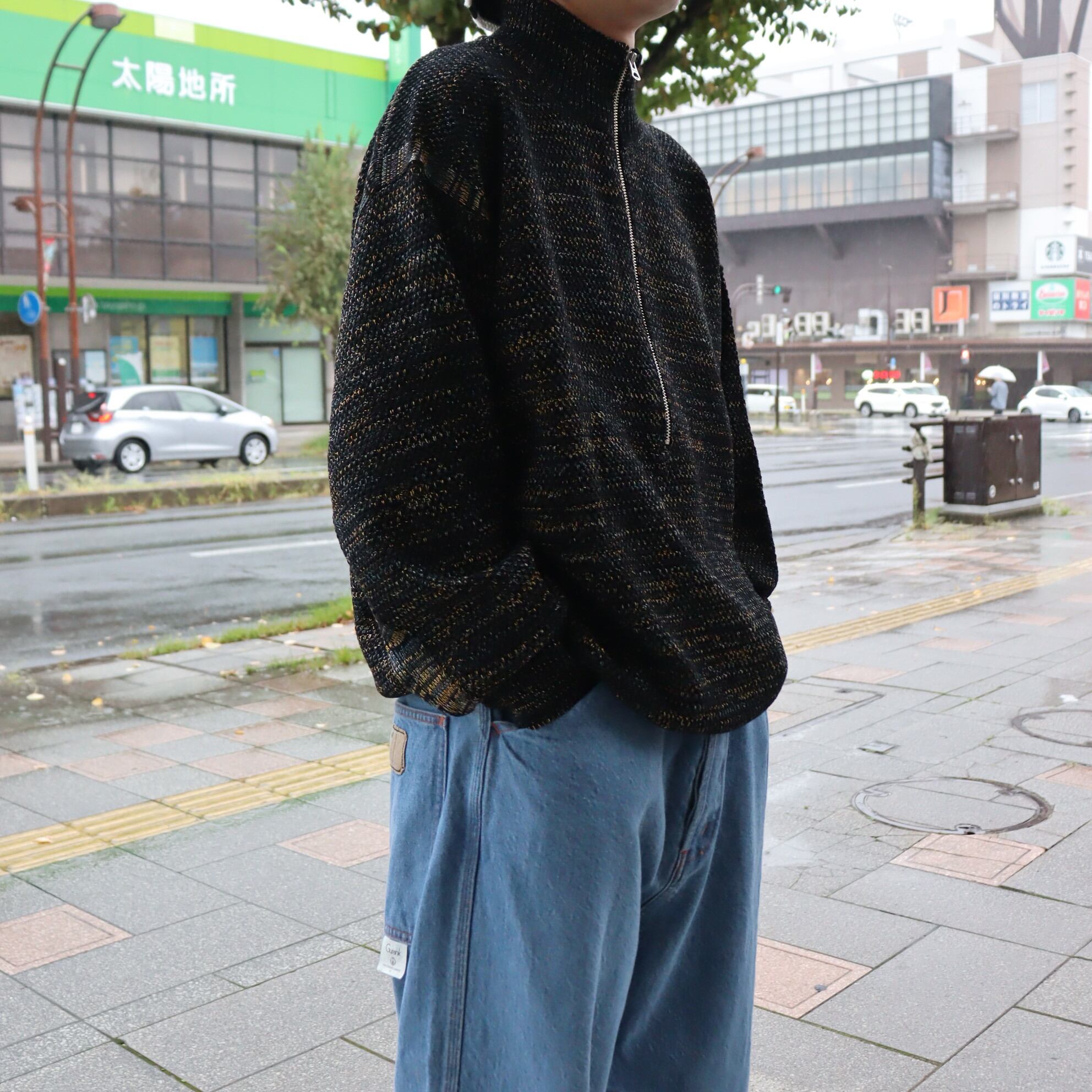 イエローブルーのカスリ糸をプレーティングして鹿の子編みで編み立てたハーフジッププルオーバー。
