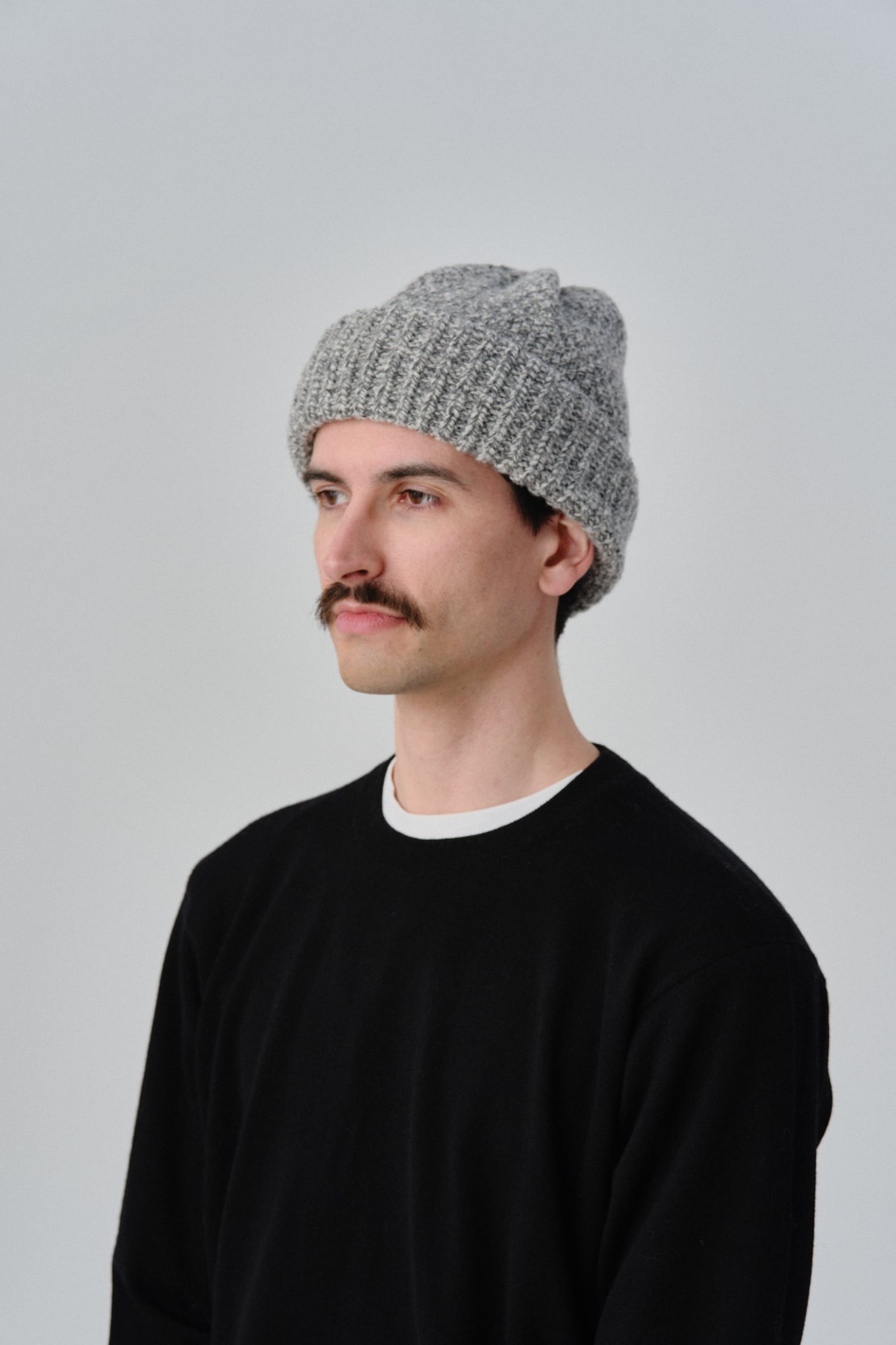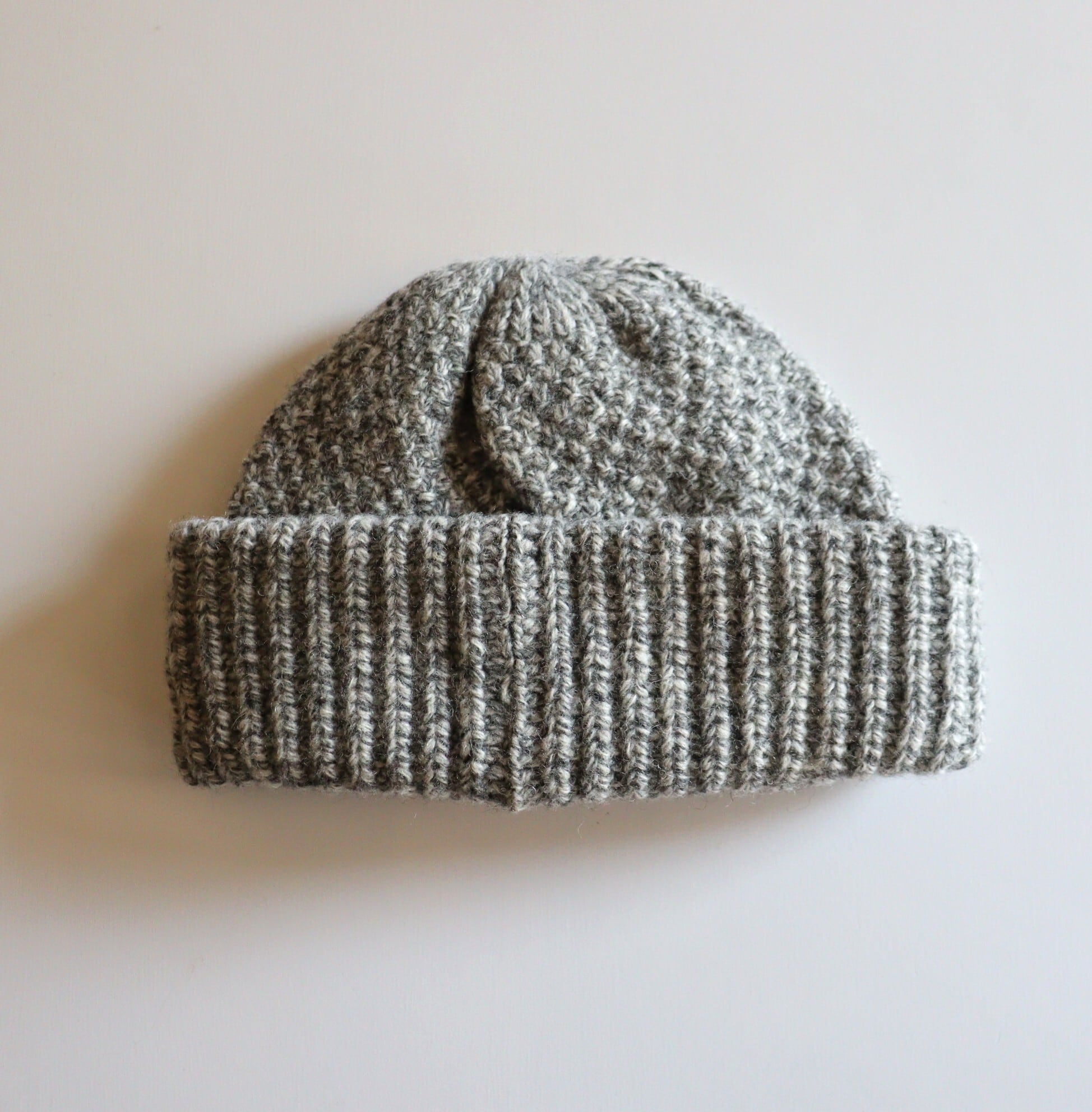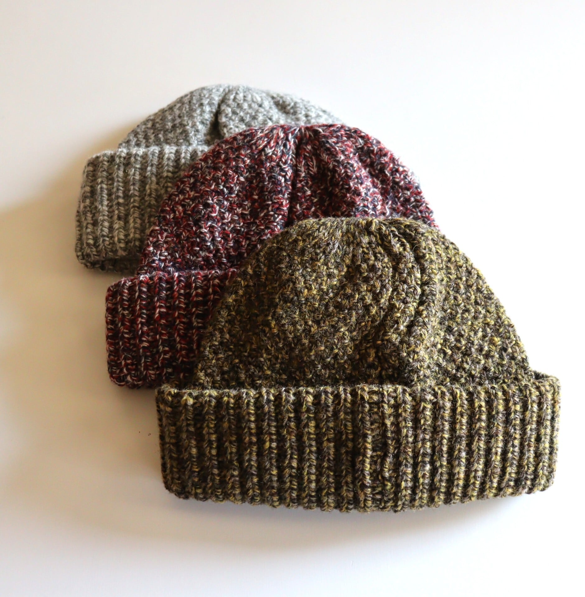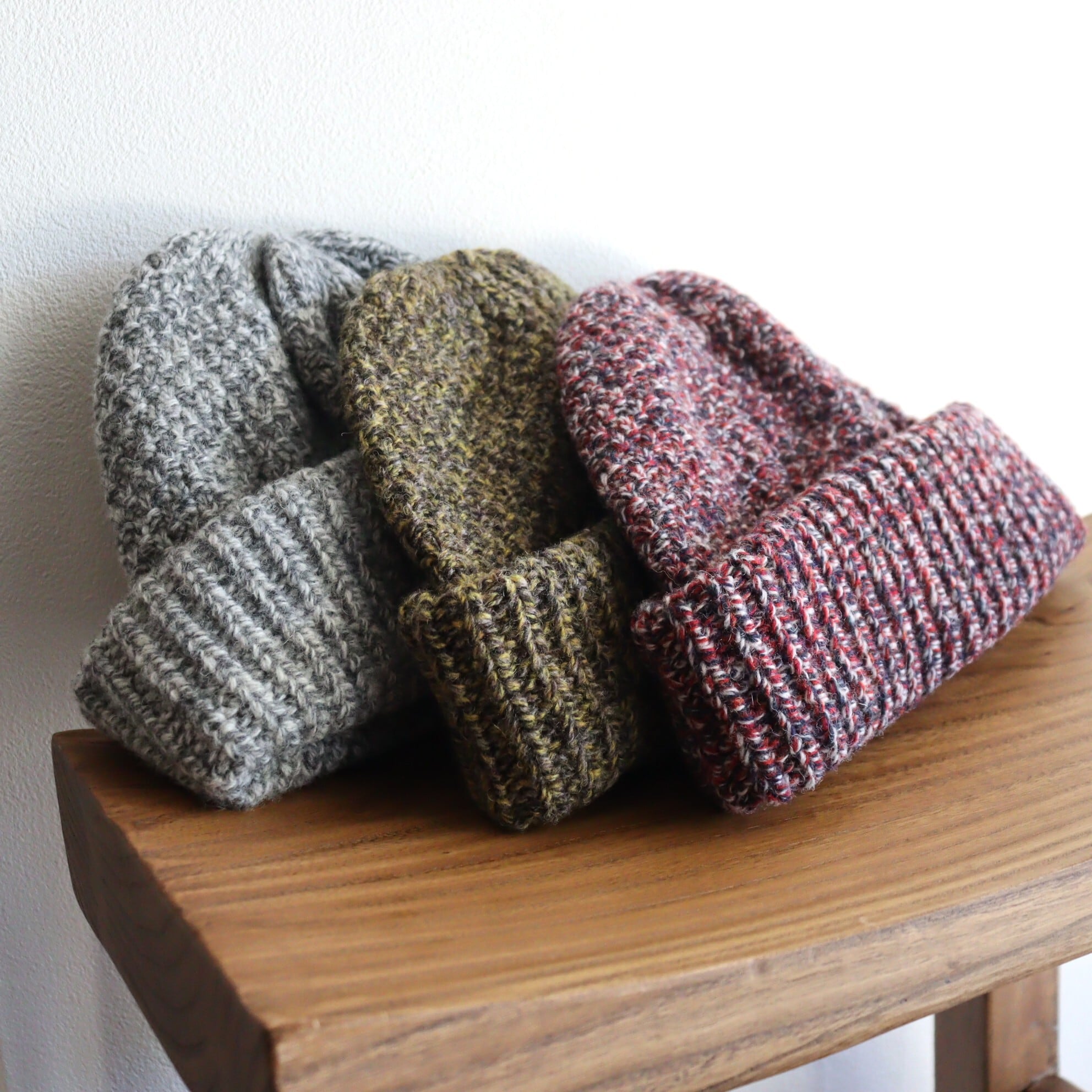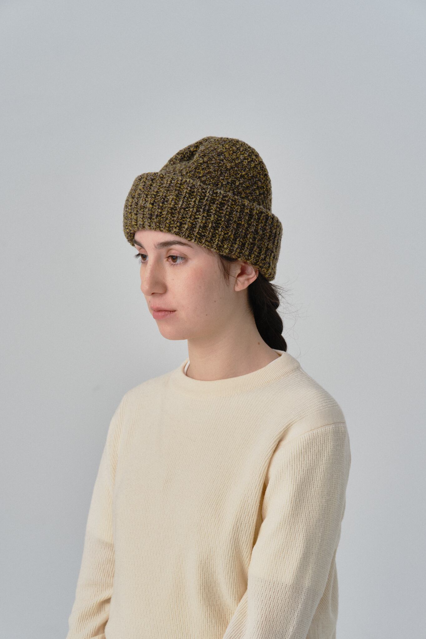 3色の糸を撚り合わせ、リンクス編みで編み立てることで浮き上がったメランジ感のある表情がポイント。伸縮性があり頭にフィットする被り心地です。