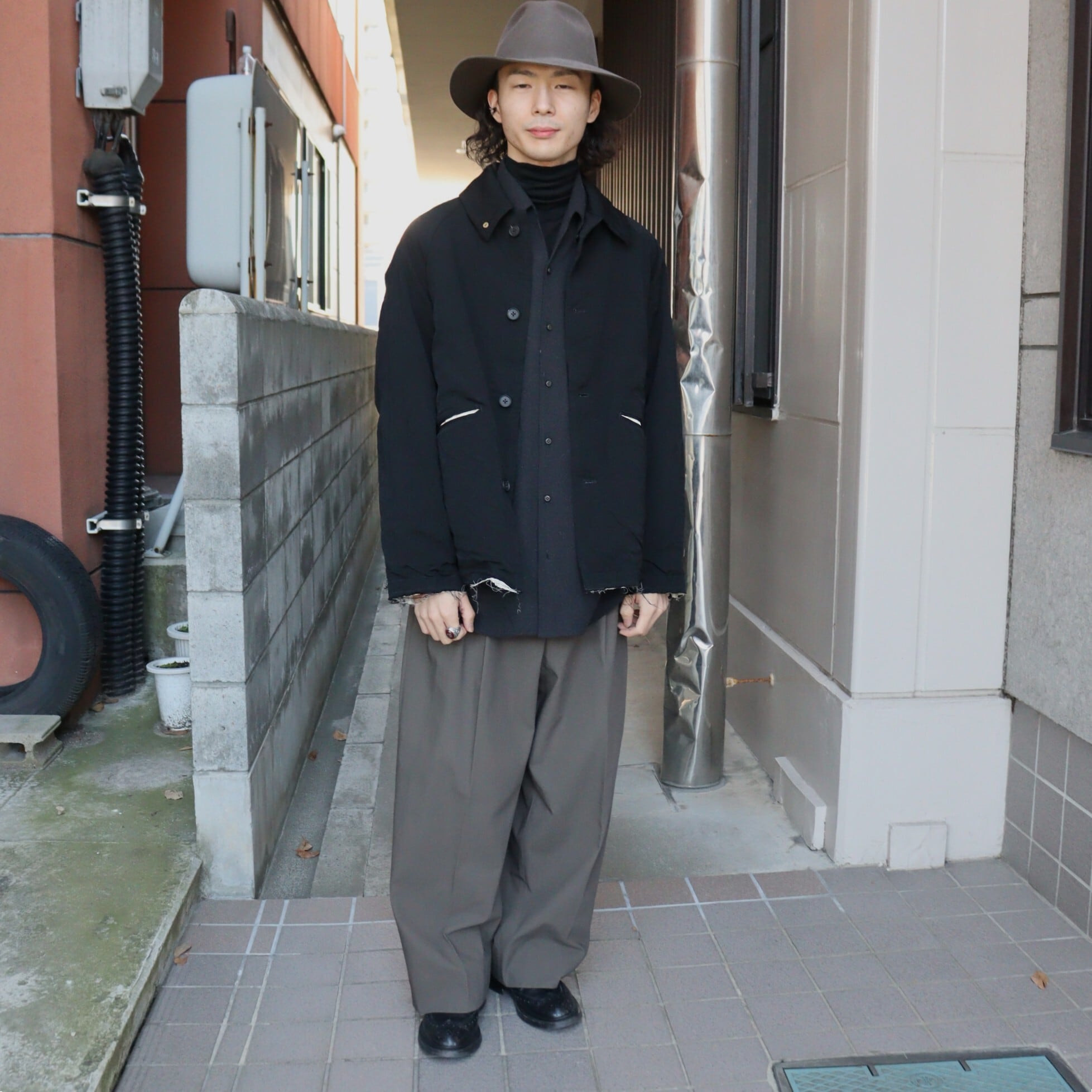 カリっとした素材感と縮率差でゆがみ、シワが入った雰囲気が見事にマリアージュされており、非常に雰囲気のある1着に仕上っている。