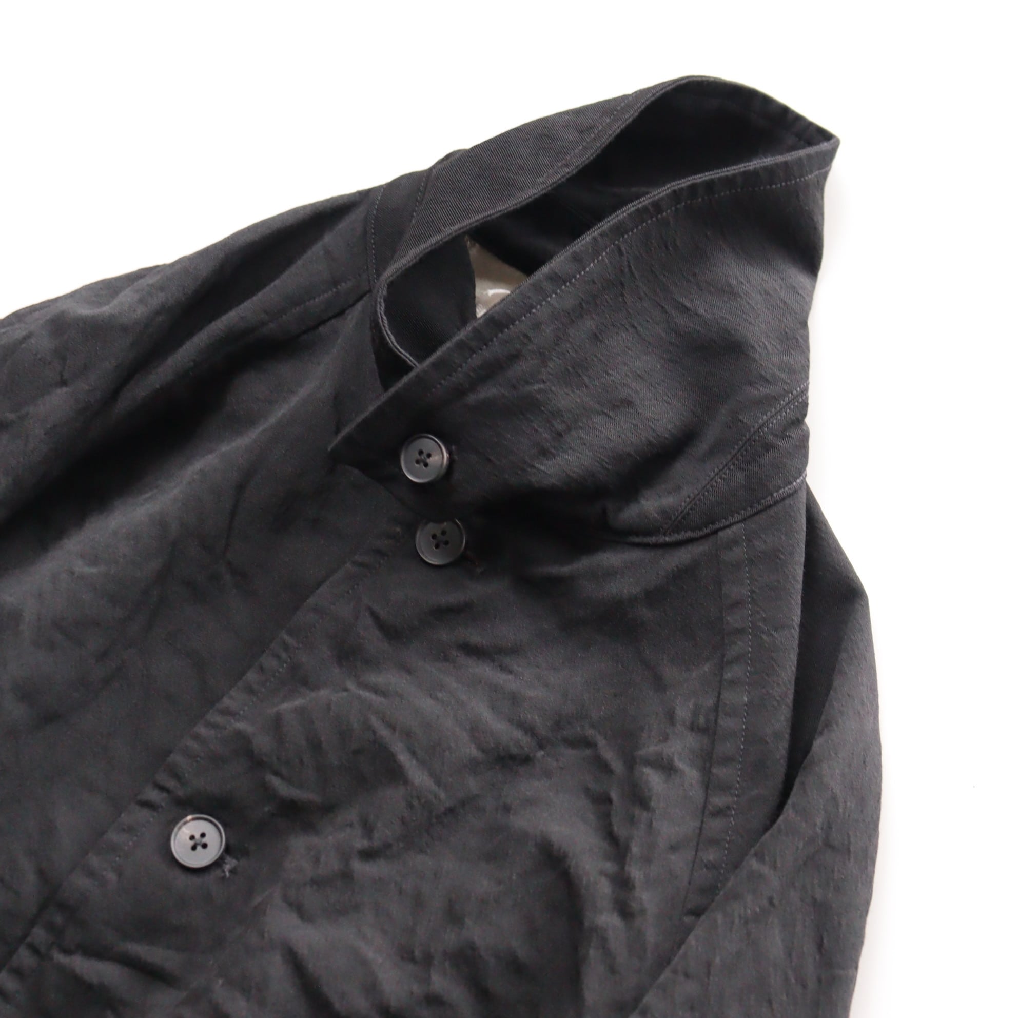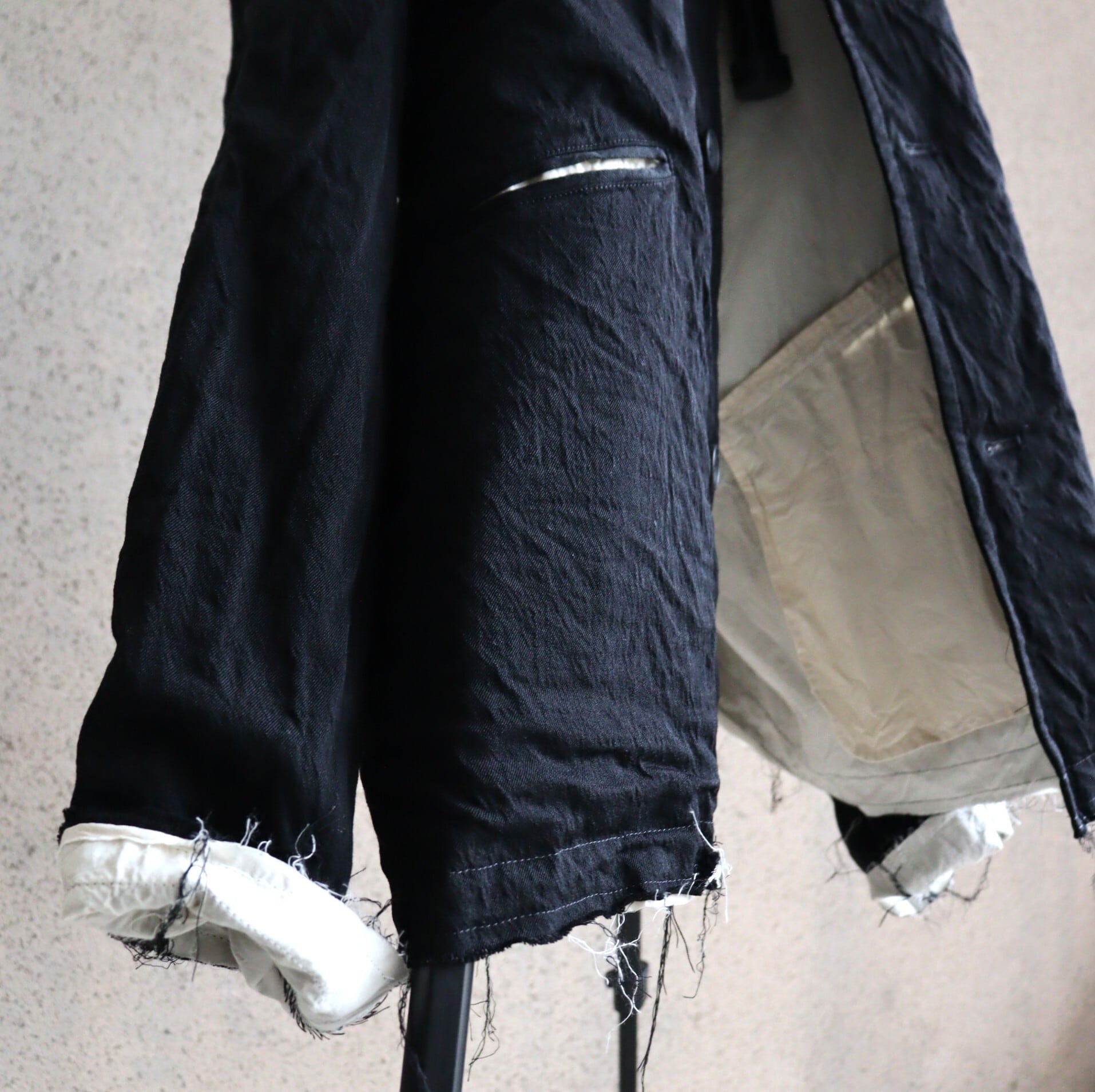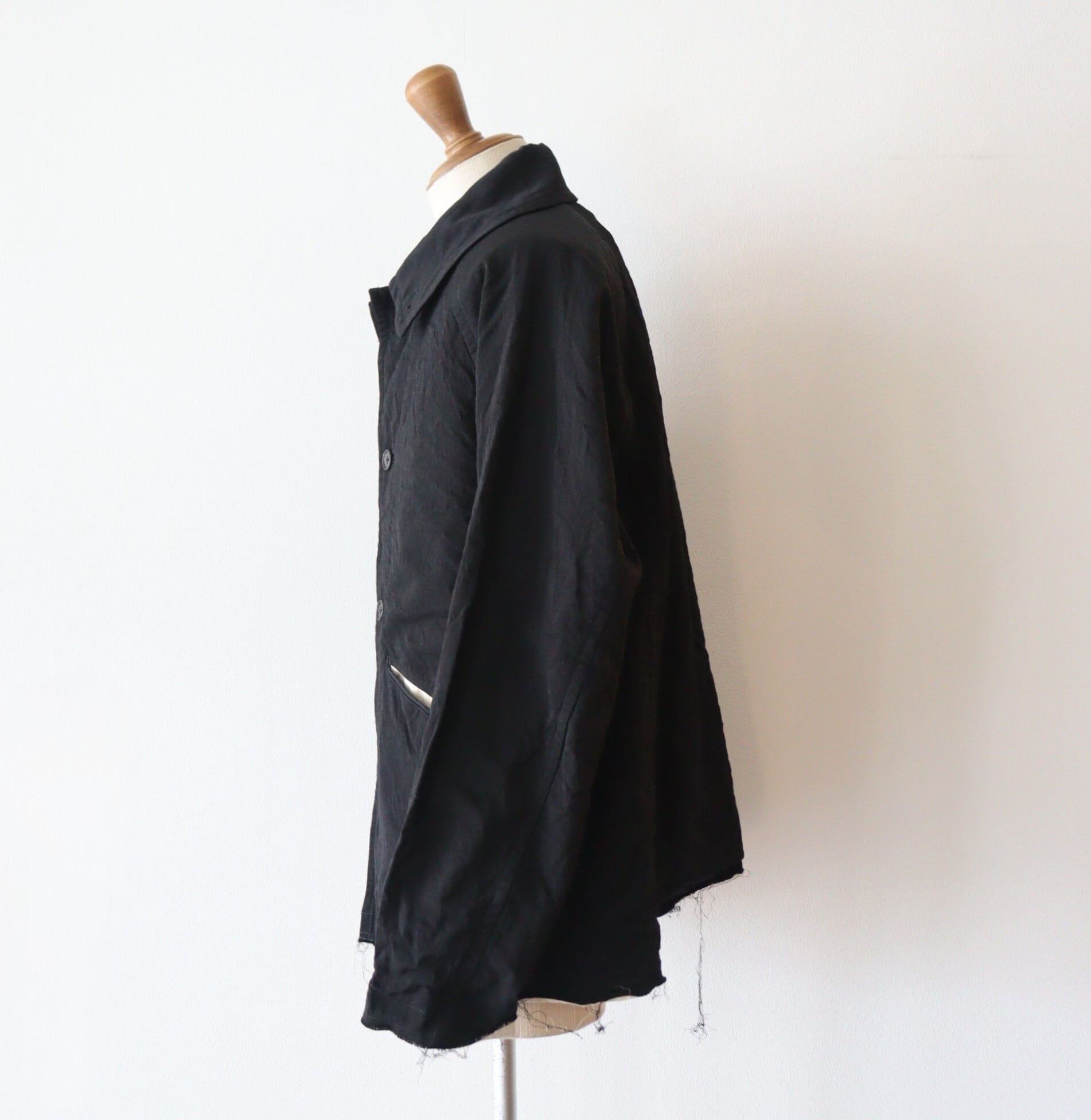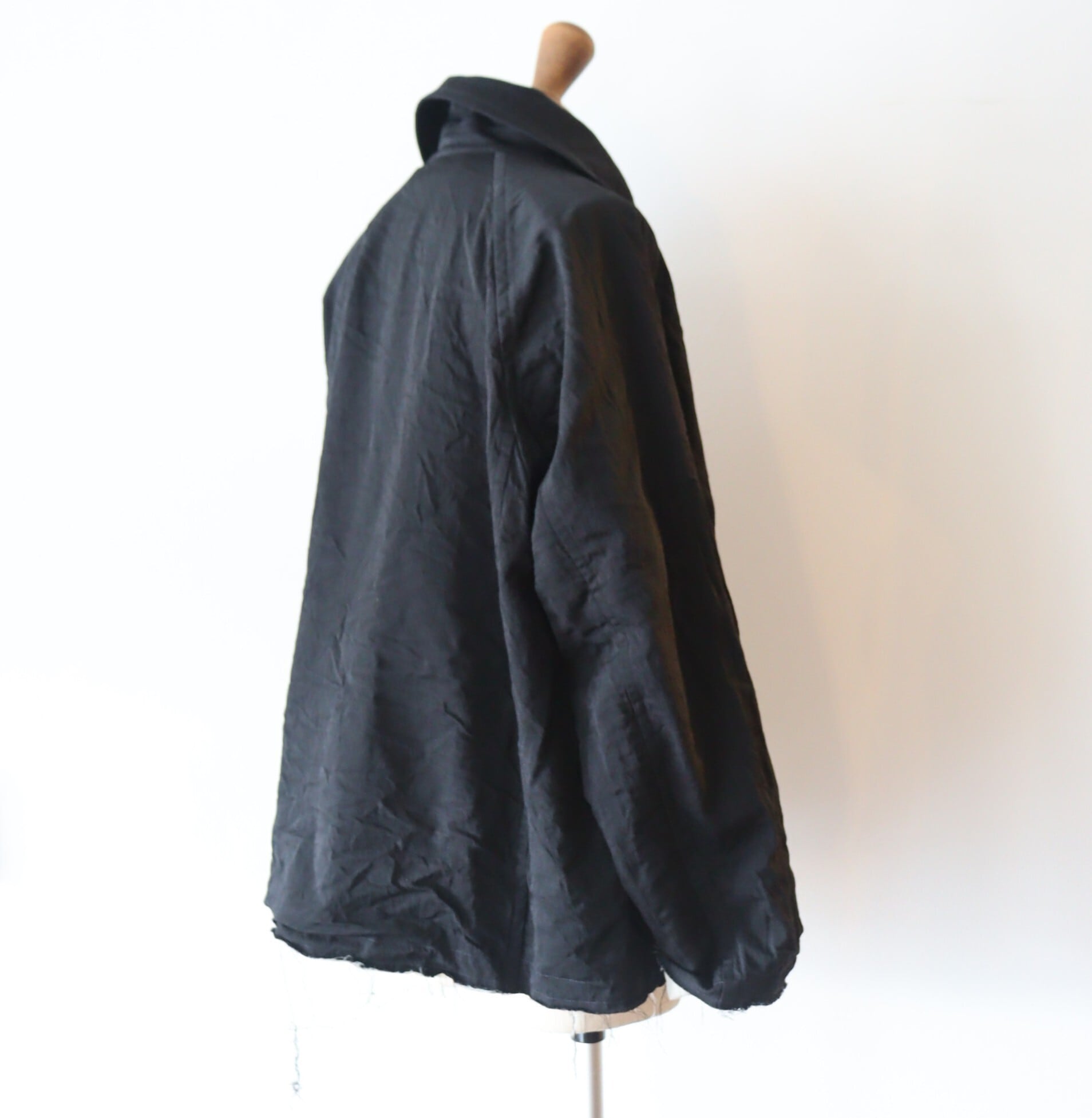日本の毛織物の産地である尾州にてWool/ Linen / Viscoseでオリジナルで織り上げた素材を使用したdiscord jacket。製品後に洗いをかけ、表地と裏地の縮率差による独特なシワやゆがみと、まるで空気を含んだような独特な表情を楽しんで頂ける一着となります。また裾など敢えて断ち切りにする事で、退廃的な美しさを感じる一着に仕上がっているのも特徴。