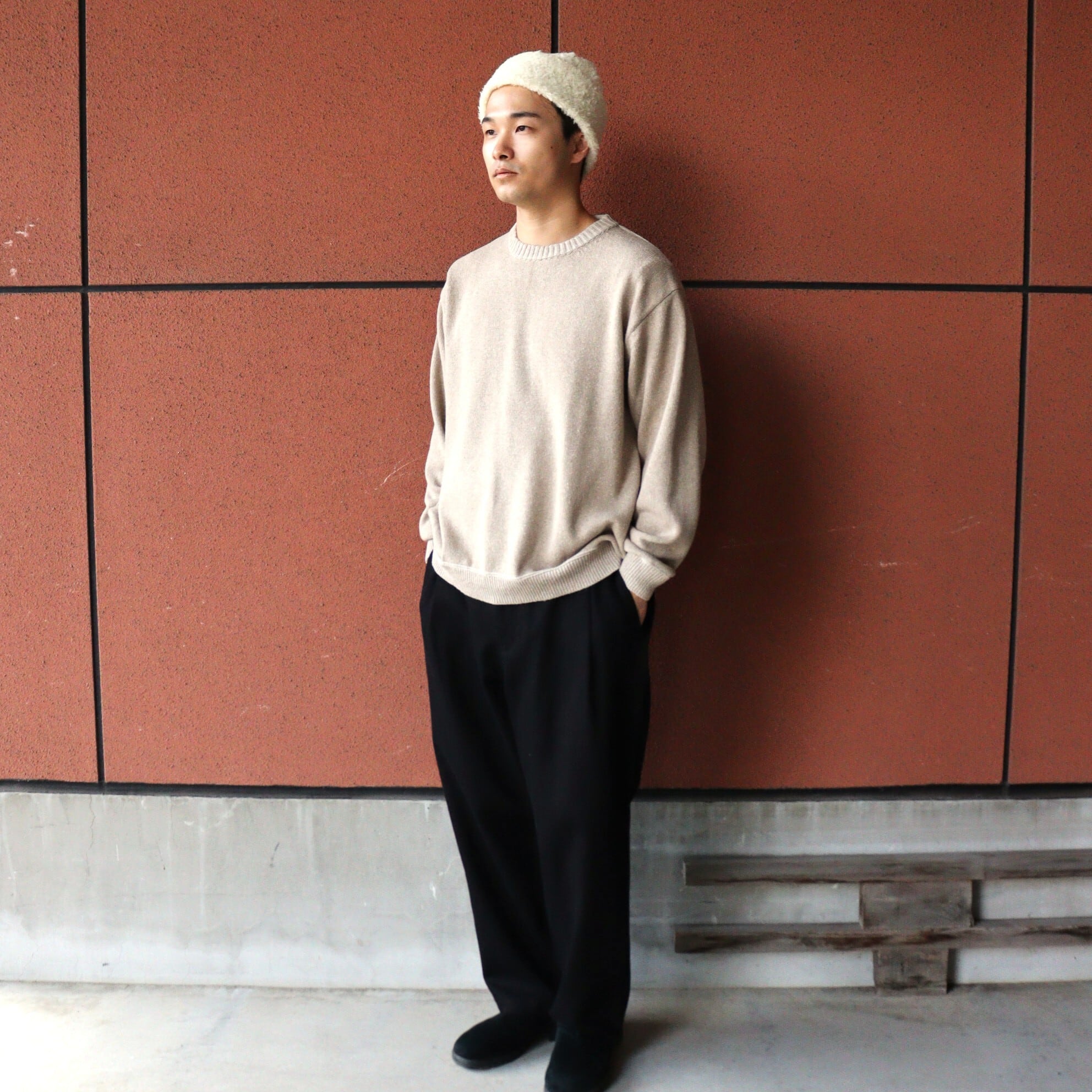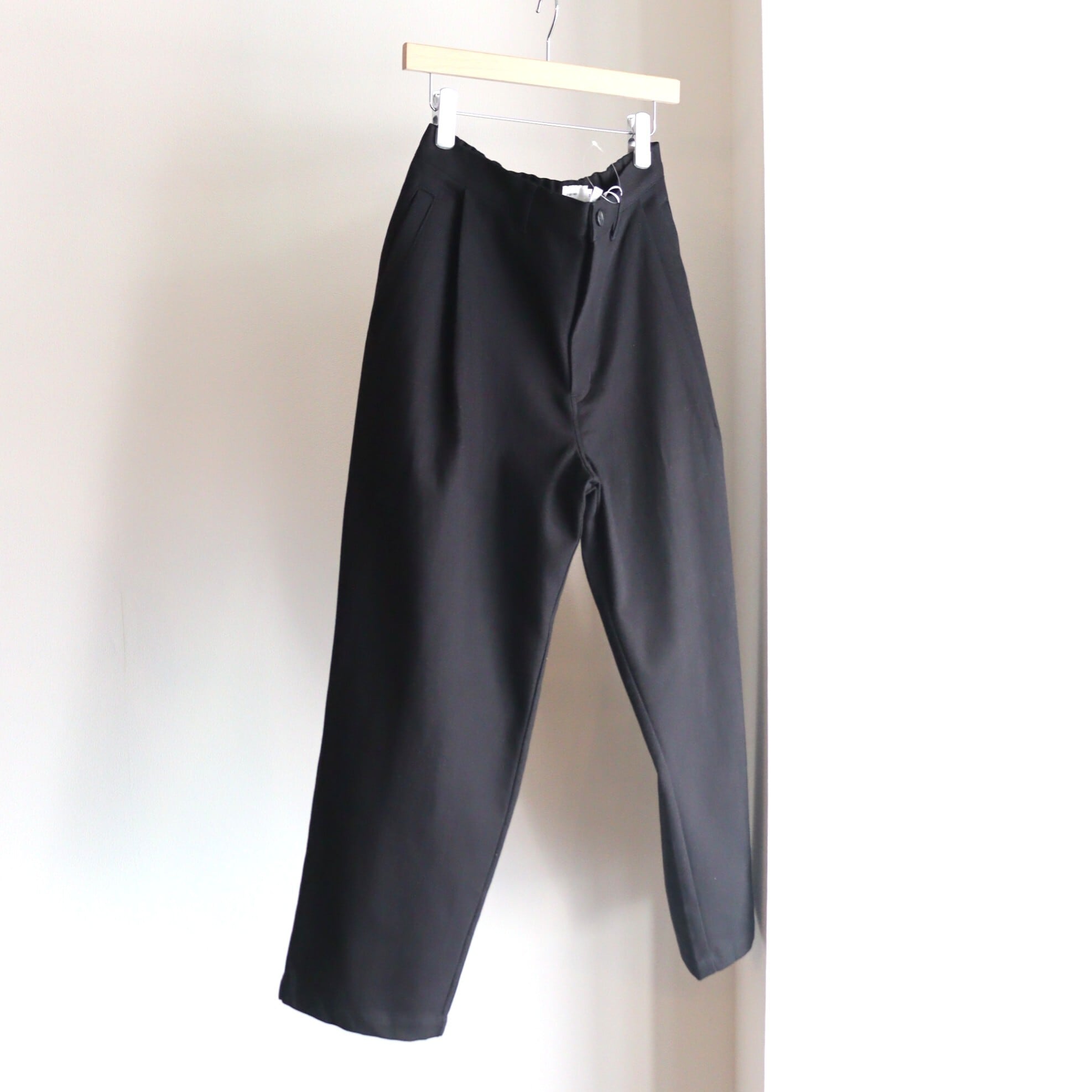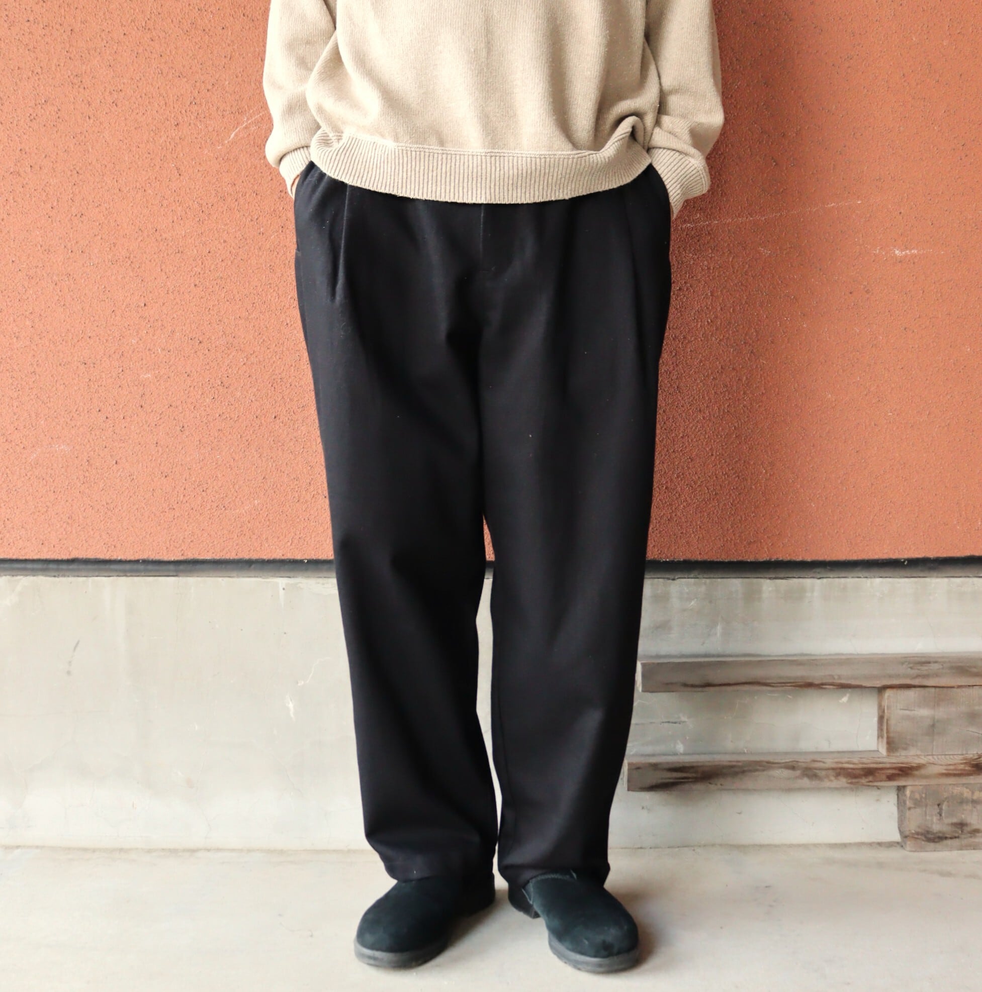 太番手の糸を甘く織り、仕上げにタンブラー乾燥をさせた柔らかな風合いが特徴の中太テーパードパンツ。フロントにある深めのタックがポイントですが、生地に落ち感があるため寸法よりすっきりした印象で履いていただけます。