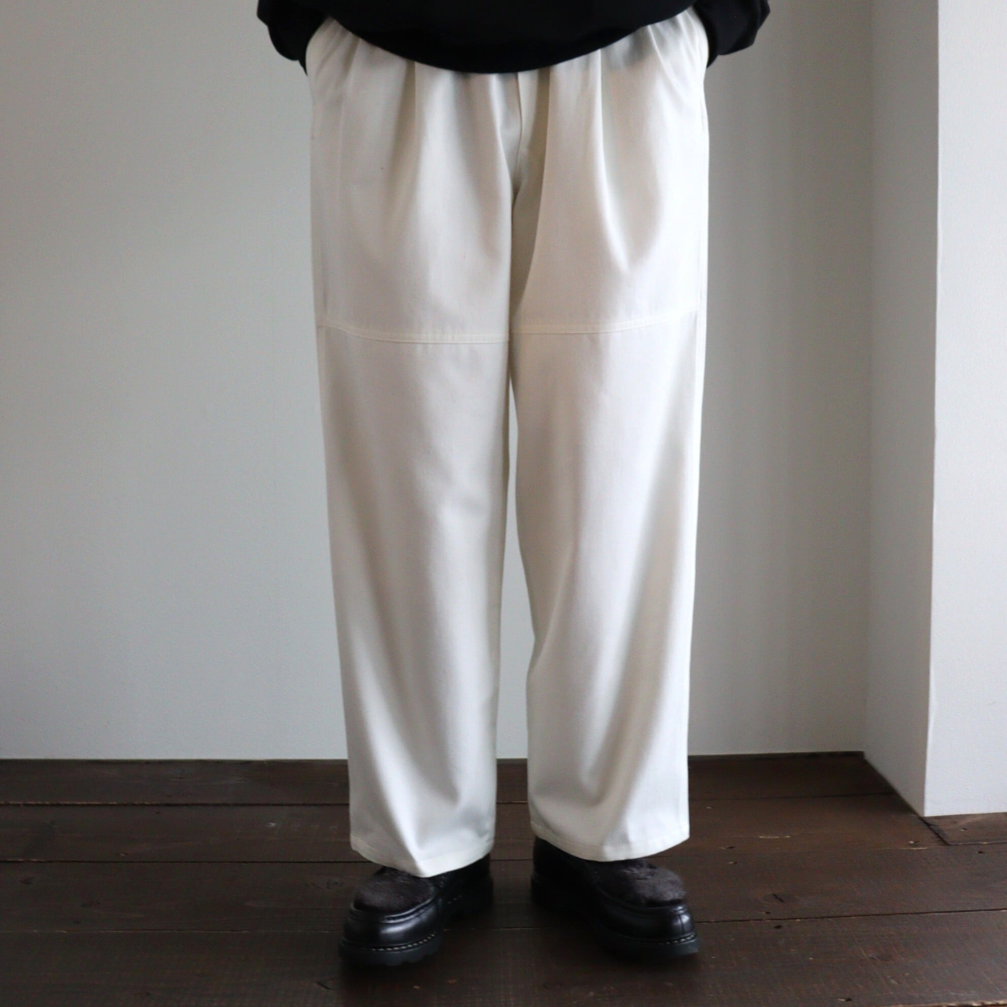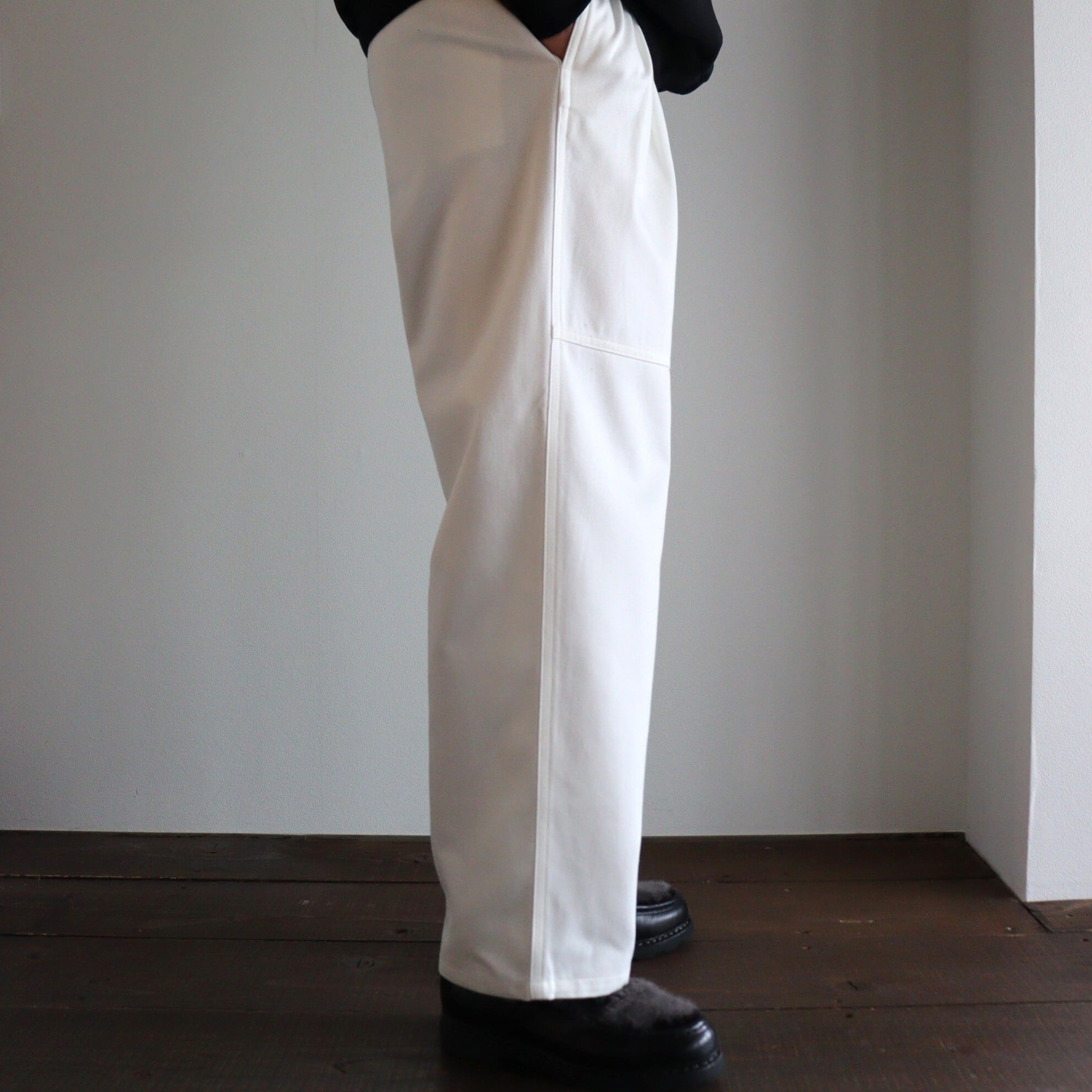 太すぎない絶妙なワイド感にしあげており、素材においてもほんのり光沢感もあり品のあるワークパンツに仕上っております。洗いこむことで糸が膨らみ、風合いも増していきます。