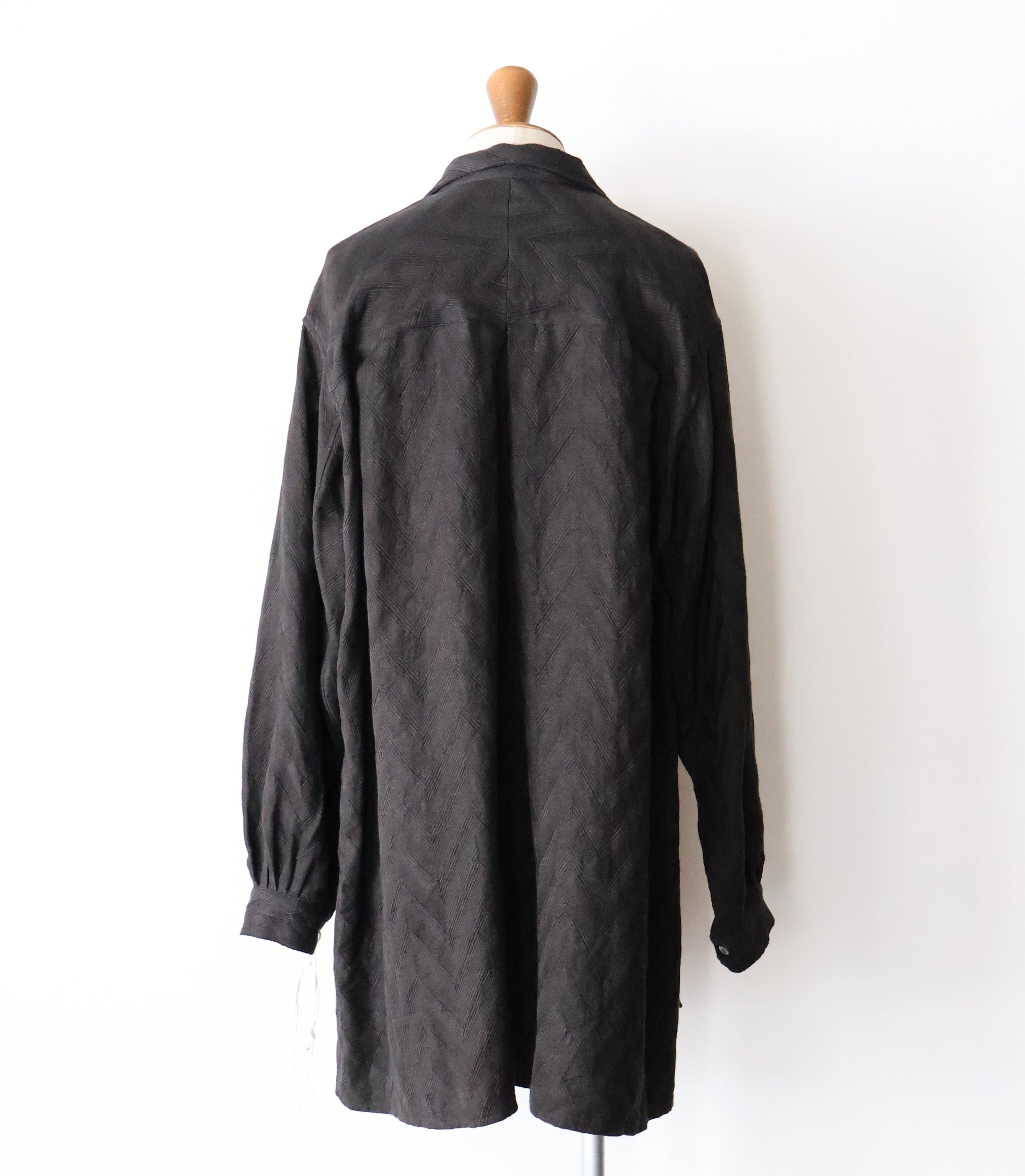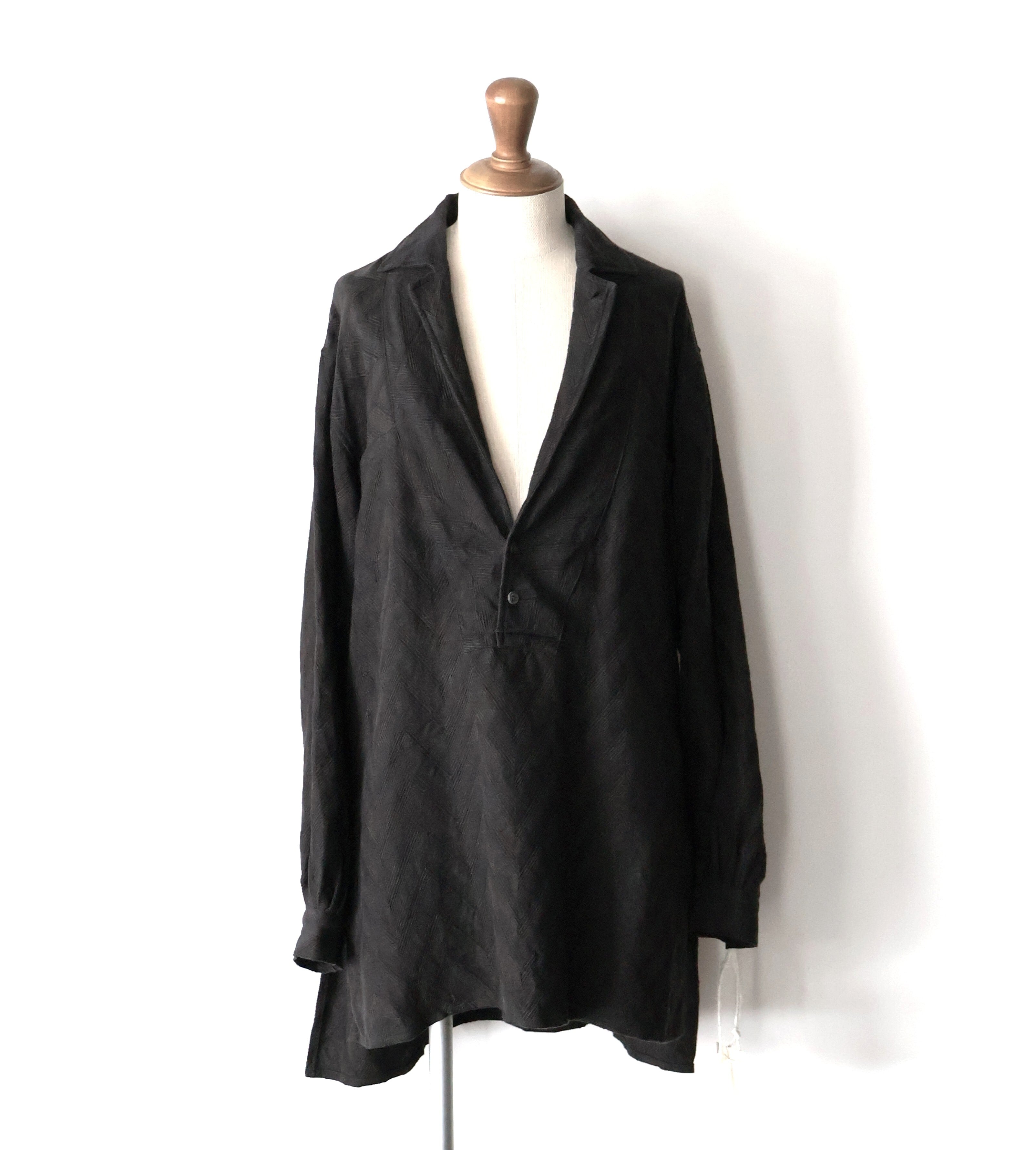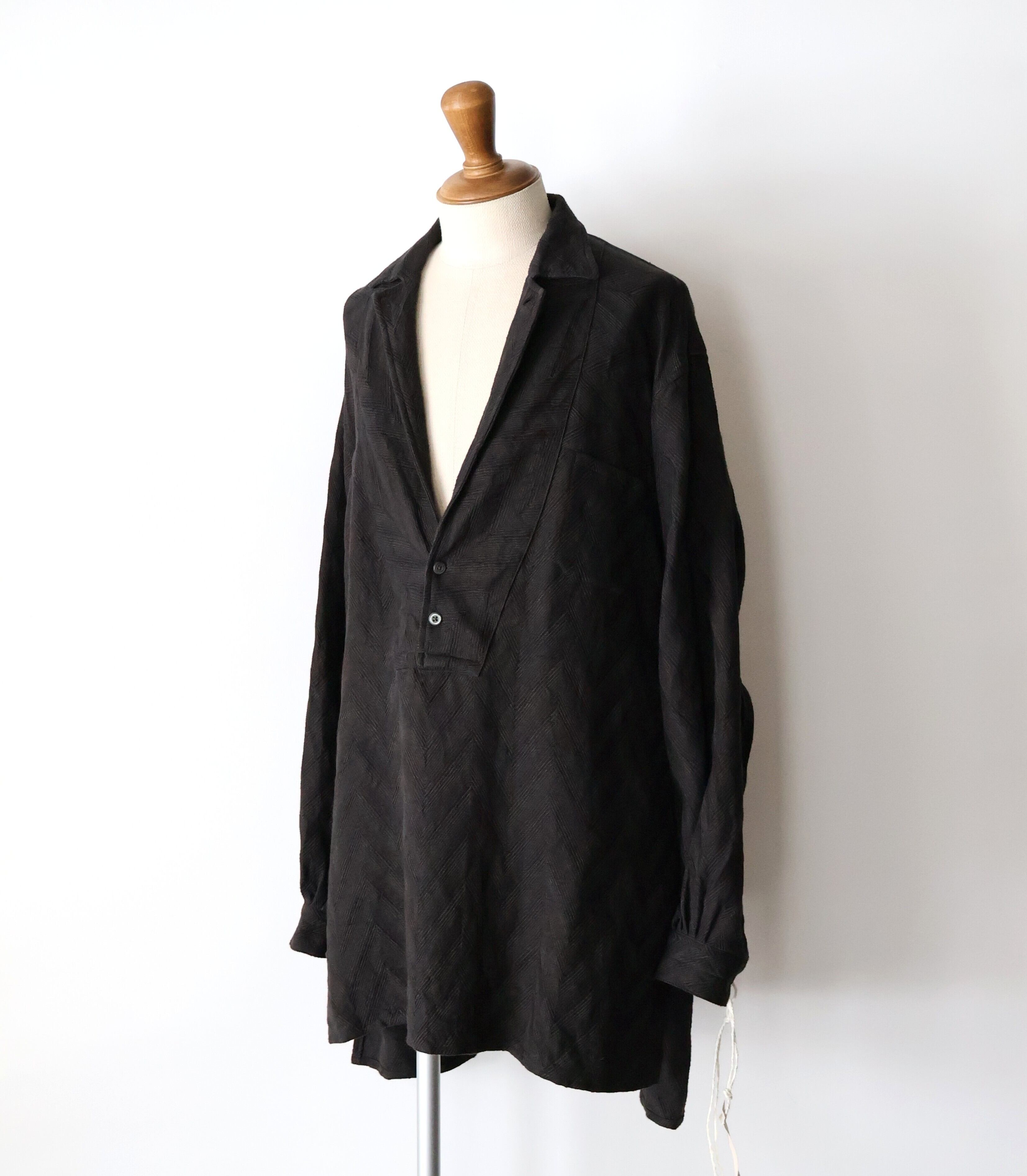衿元はテーラリングのラペルを作る要領でのパターンニングを取り入れ、プルオーバーのジャケットライクな表情になる様に作り込んでいます。全体のサイジングはスモックらしいゆとりも持たせたルーズフィッティングに落とし込み、単なるオーバーサイズとは異なる様に各所のタックで抑揚を付けたバランスに仕上げ、生地特性を活かし、部分ごとに地の目を切り替え、全体にリズムを加えています。