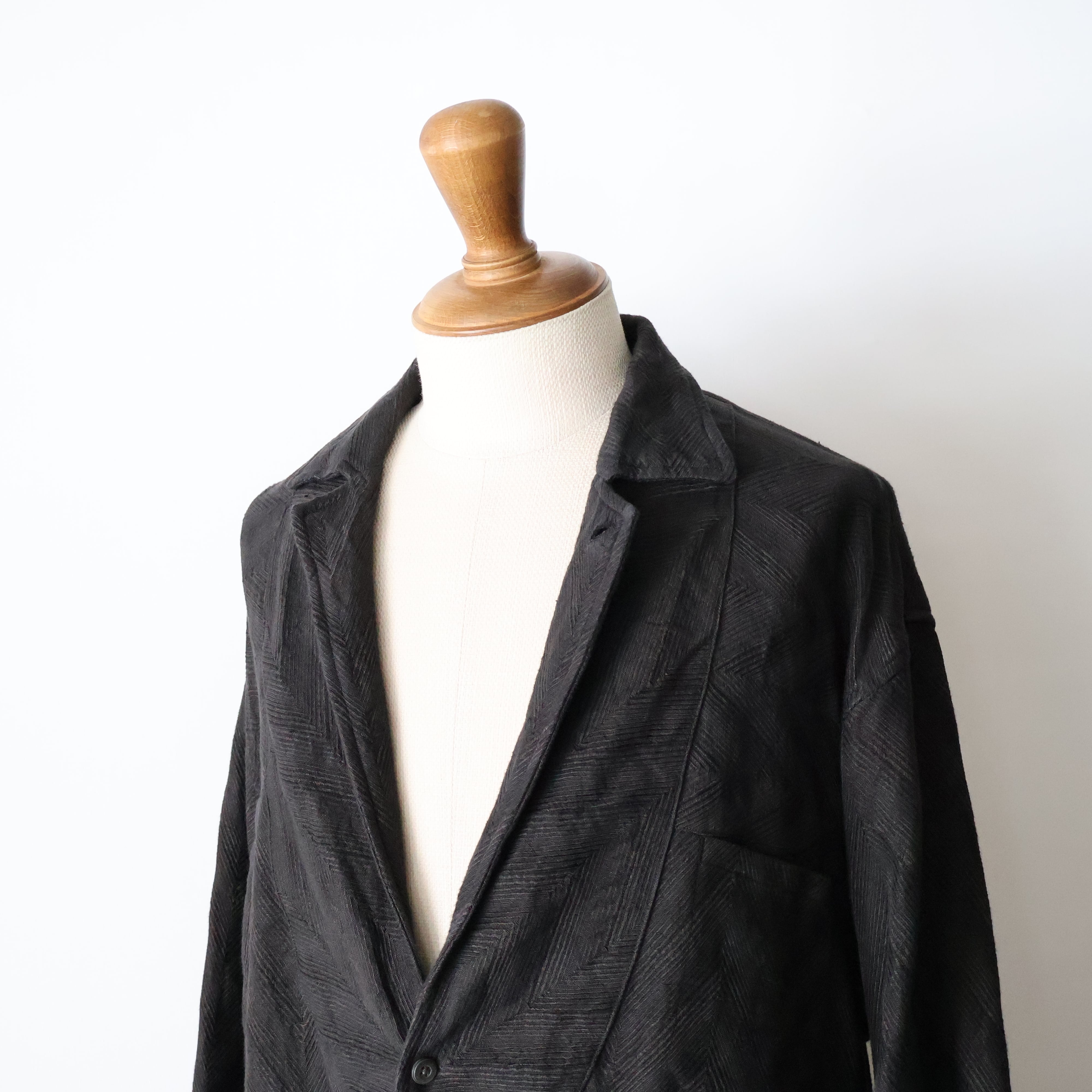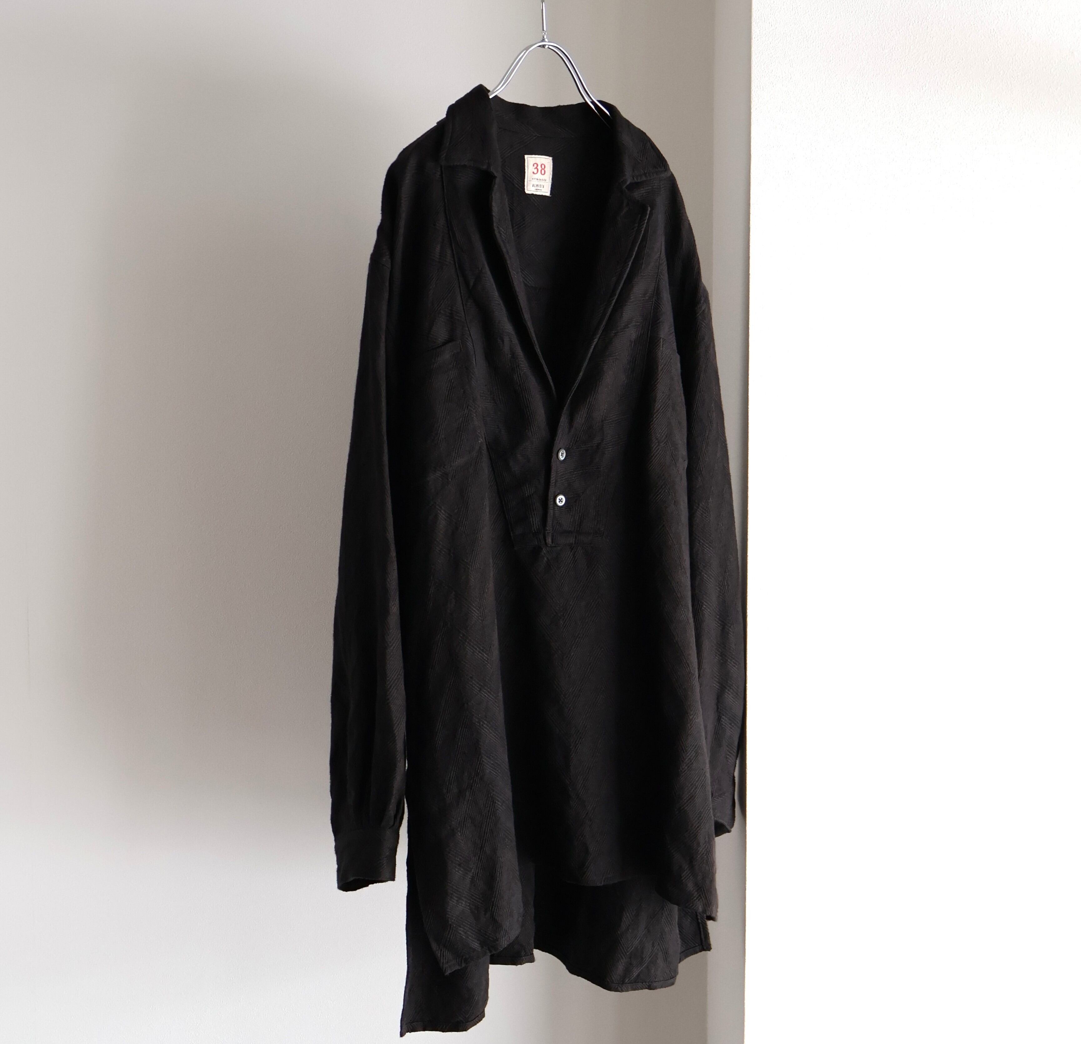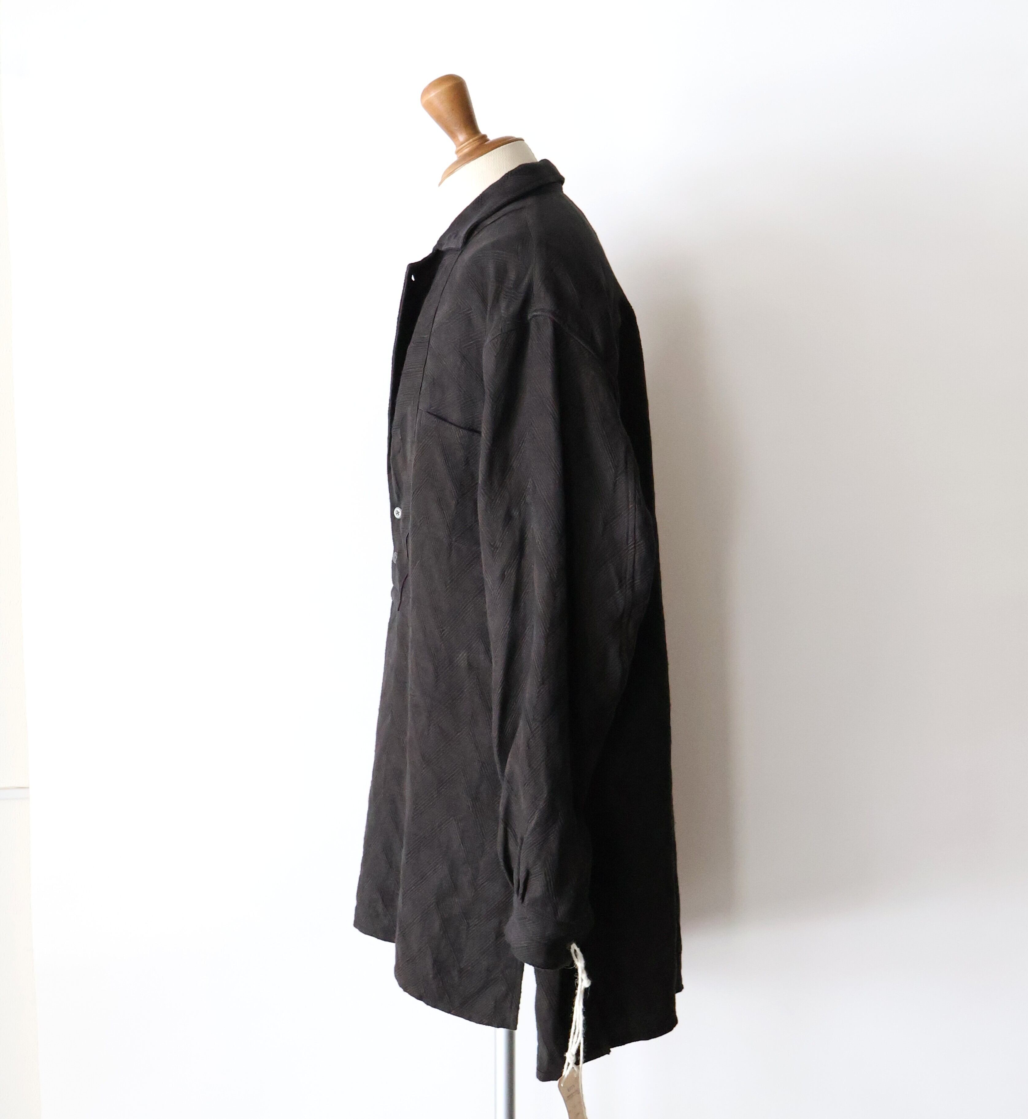 衿元はテーラリングのラペルを作る要領でのパターンニングを取り入れ、プルオーバーのジャケットライクな表情になる様に作り込んでいます。全体のサイジングはスモックらしいゆとりも持たせたルーズフィッティングに落とし込み、単なるオーバーサイズとは異なる様に各所のタックで抑揚を付けたバランスに仕上げ、生地特性を活かし、部分ごとに地の目を切り替え、全体にリズムを加えています。