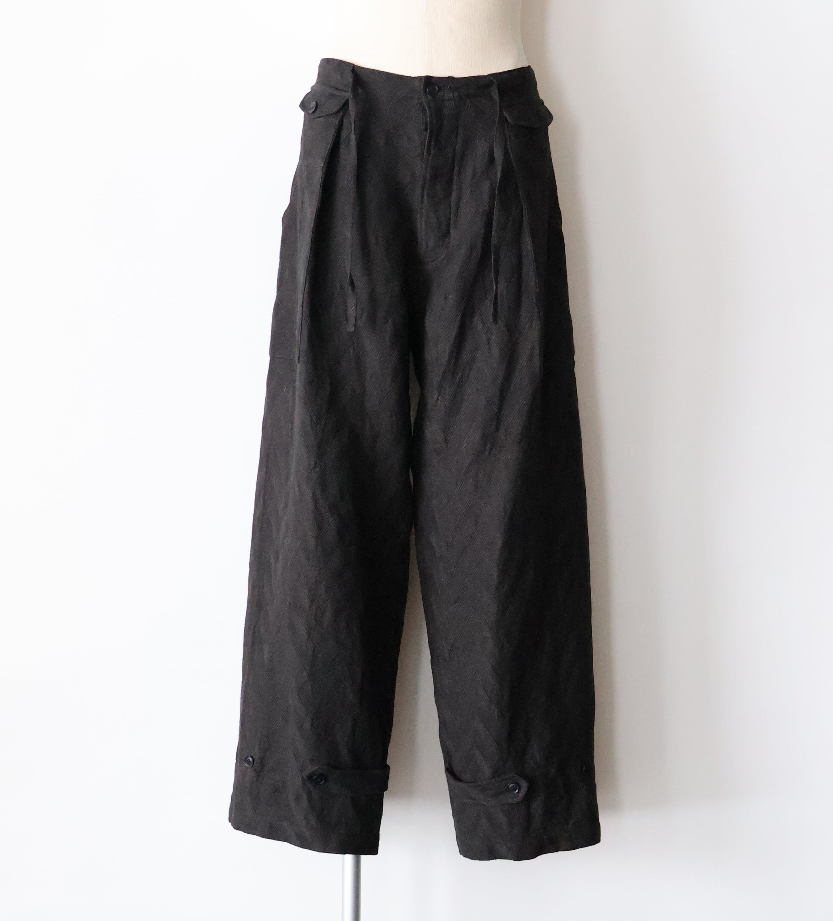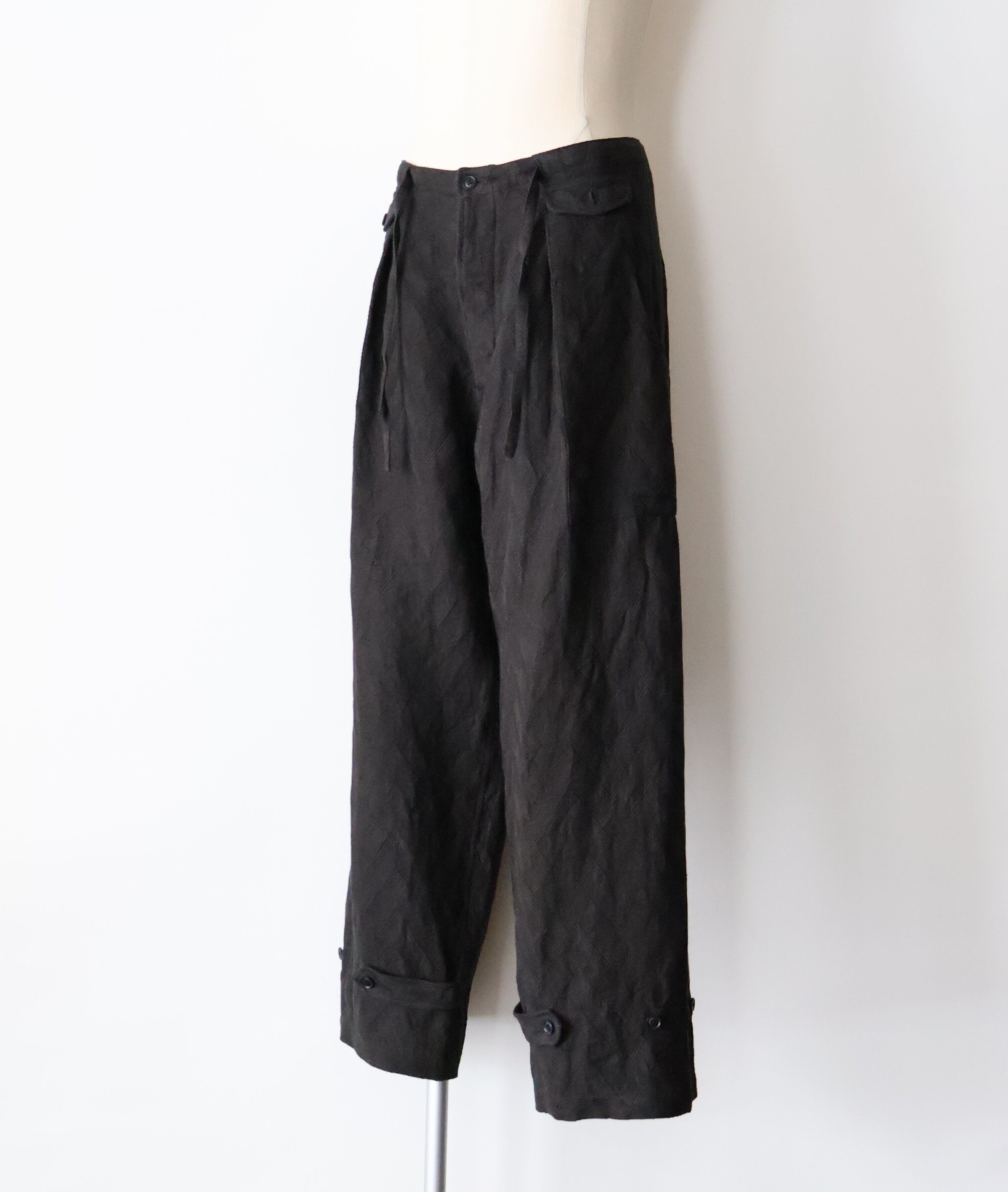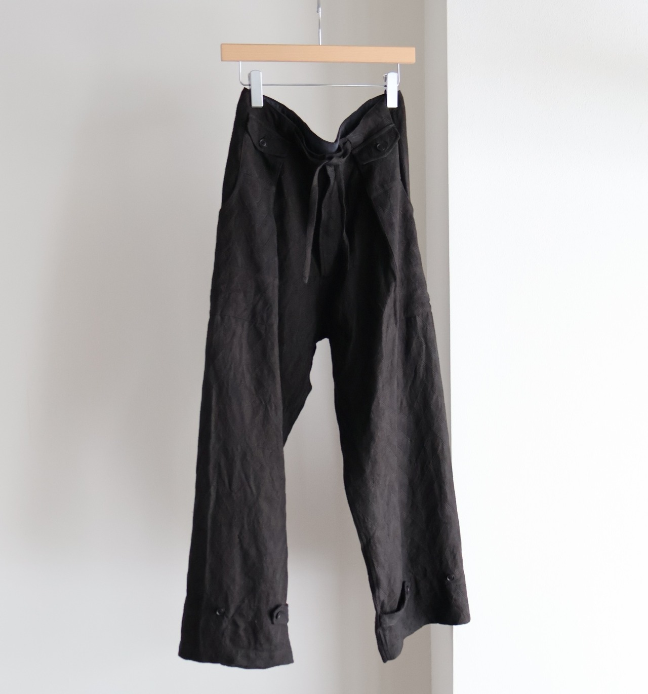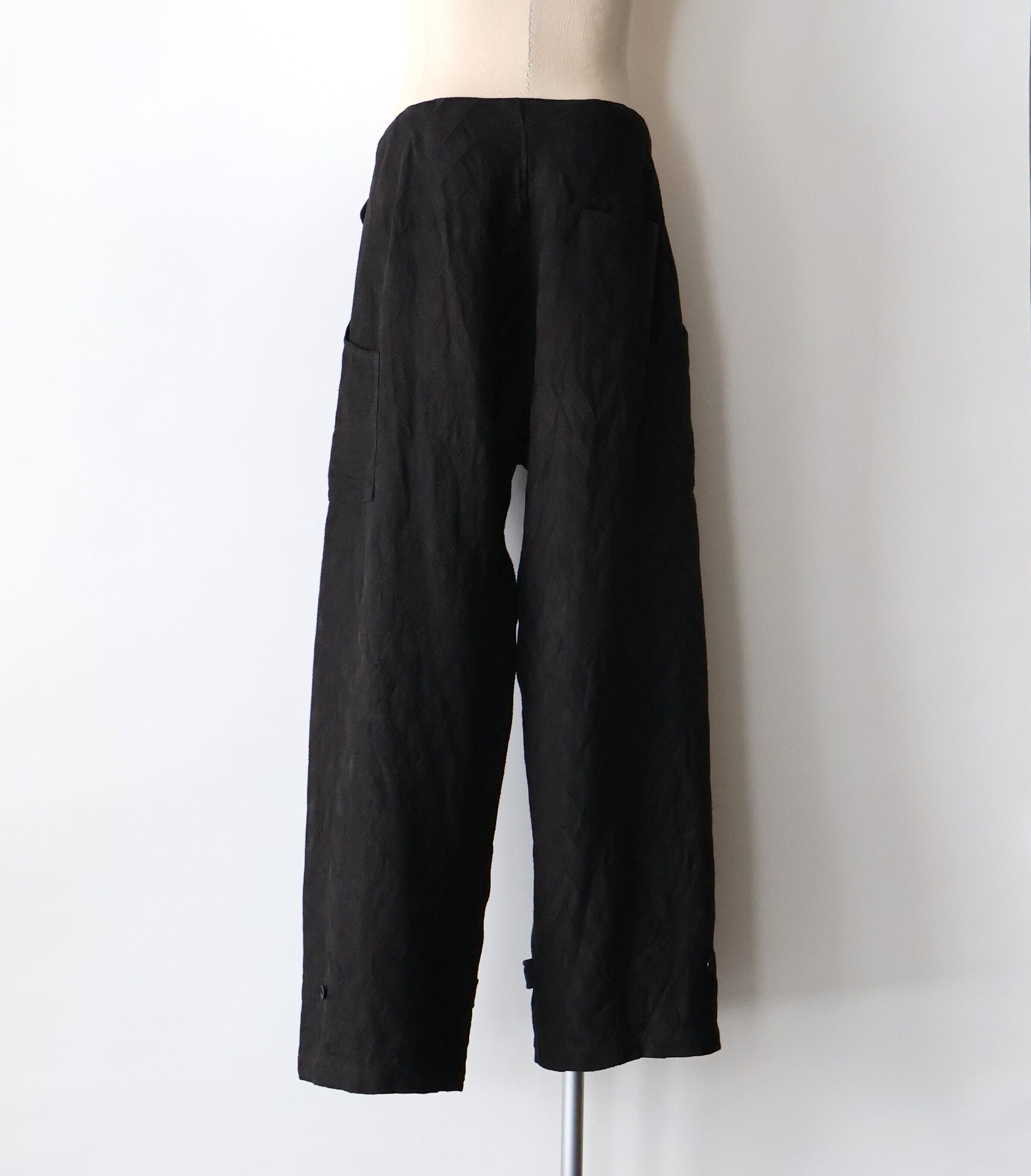 使用用途からくる独特のポケット形状などを元々のオールインワンから抽出し、パンツ単体としてのバランスに合う様に調整や変更を加え、再構築しています。全他のシルエットはストレート気味に真っ直ぐ落ちていく様なセミワイド設計、生地の柄や落ち感を活かす様に脇のシームを排除したサイドシームレスパターンを採用しております。裾のストラップは前後どちらでも回せるようにしてあり、着る人の好みや合わせるスタイルによって数パターンでの裾の絞りを付けれる様にしています。