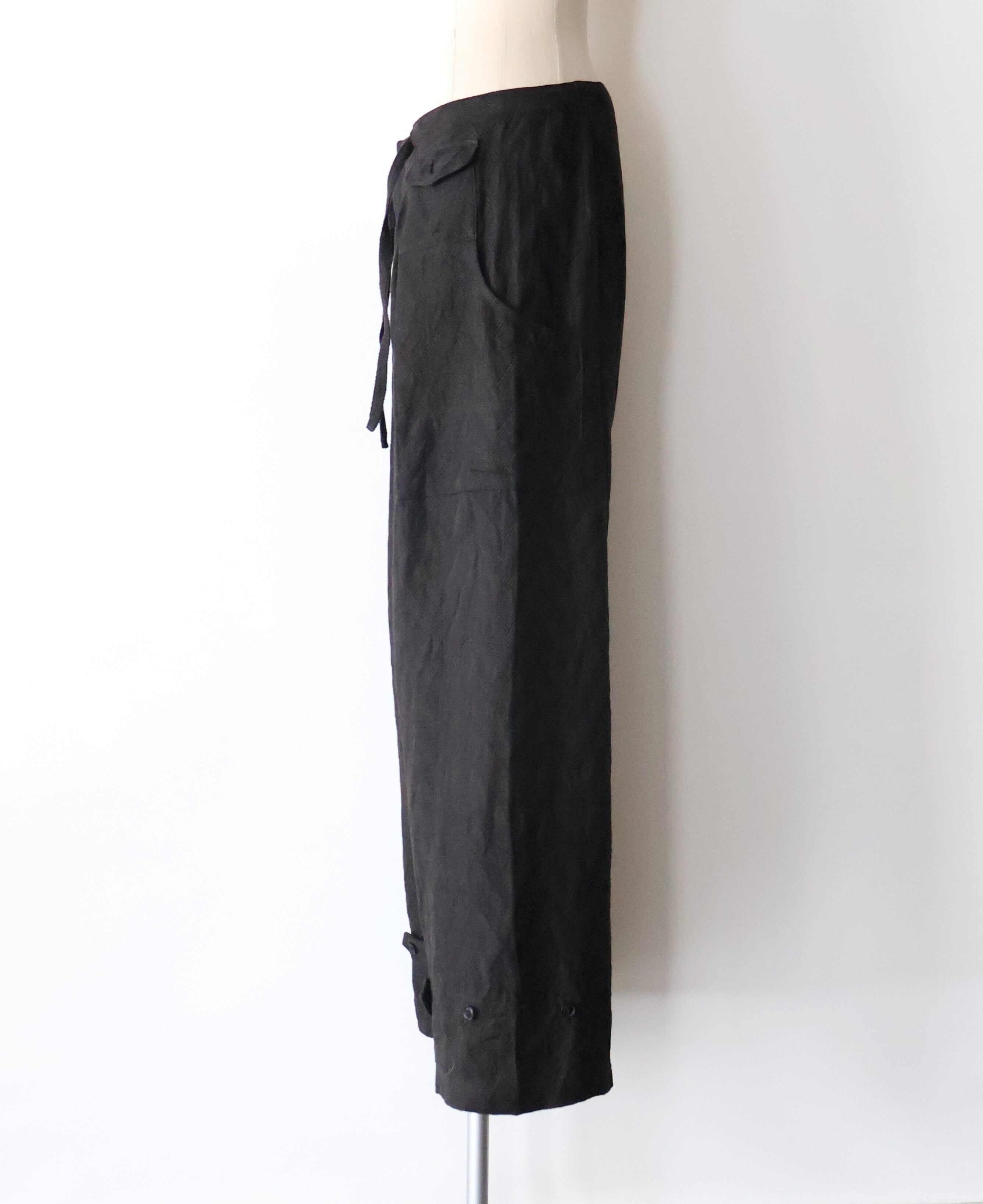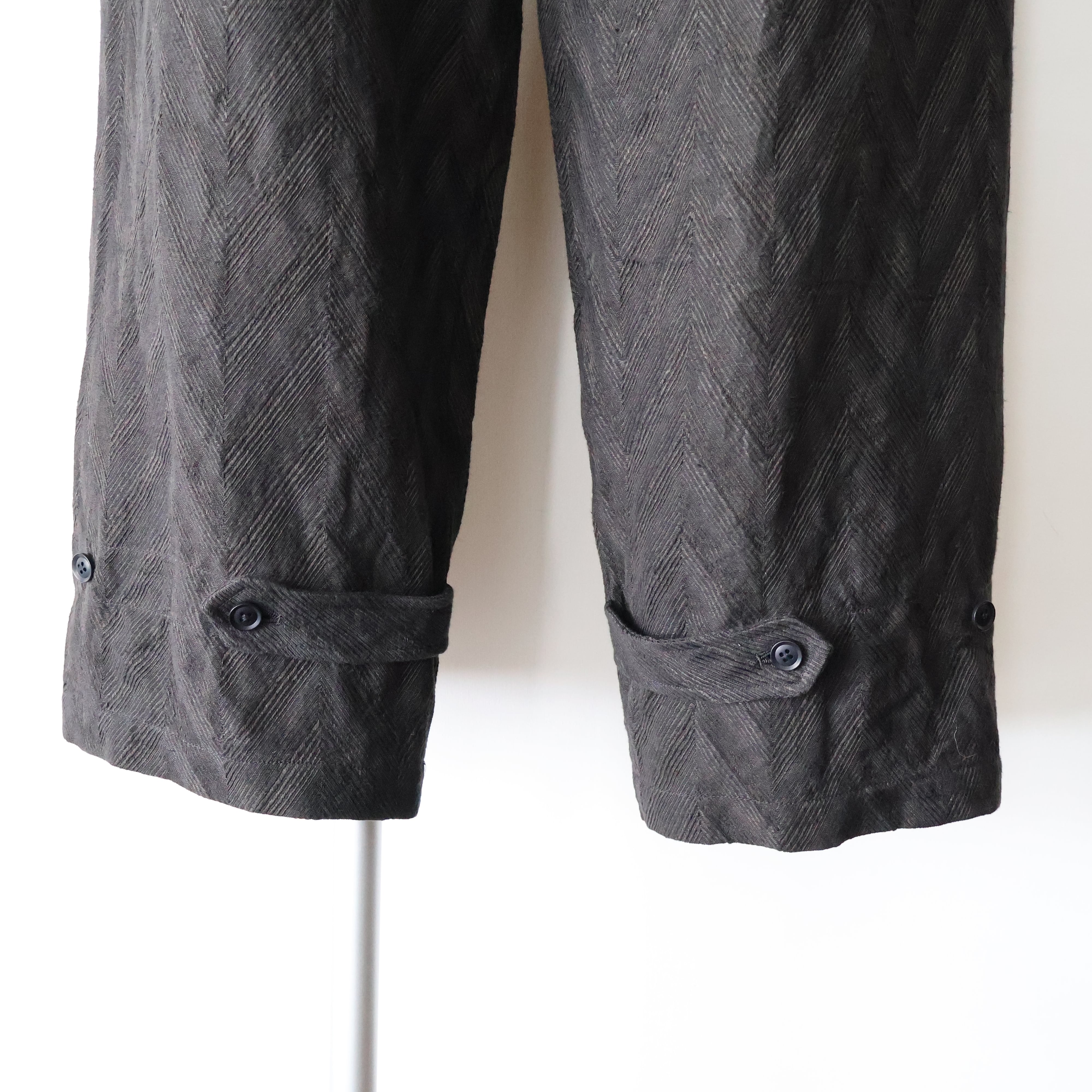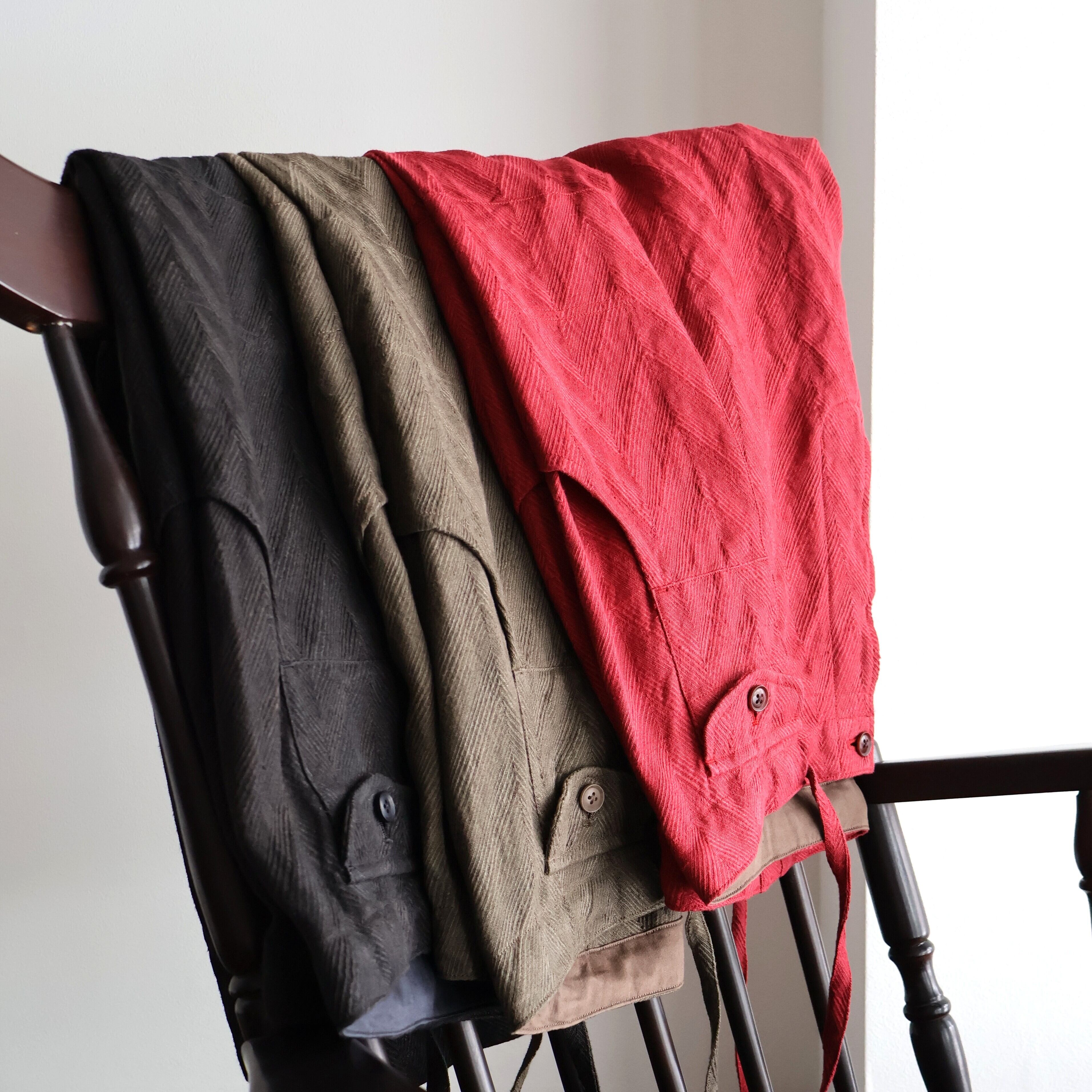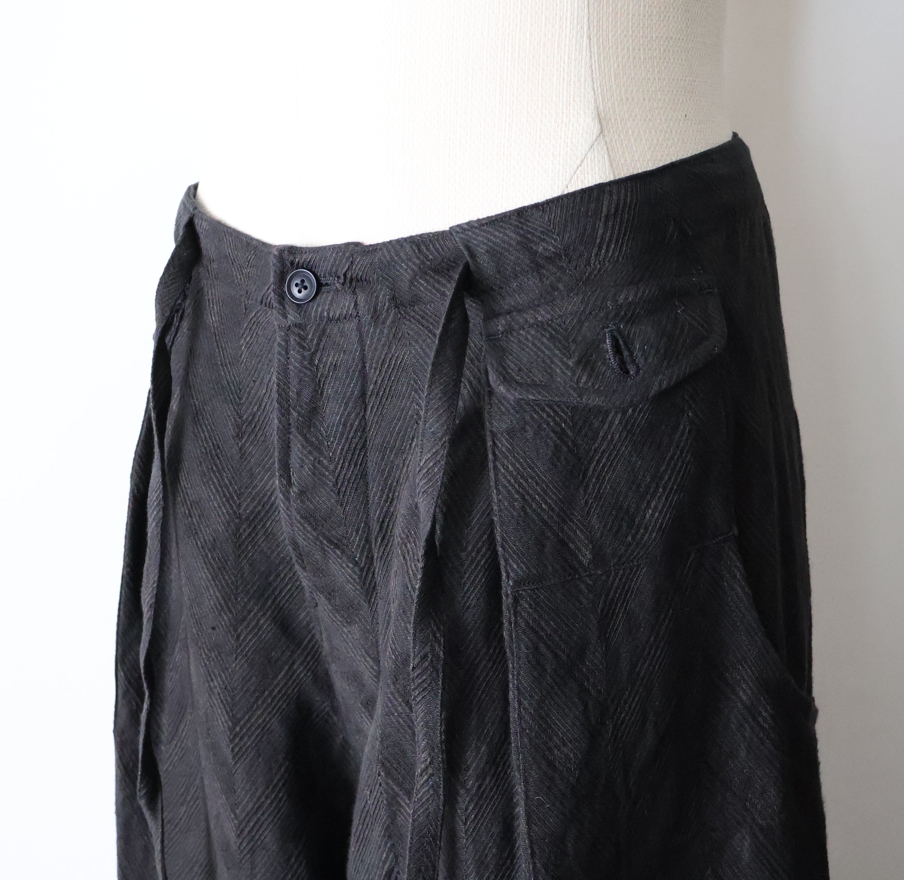 使用用途からくる独特のポケット形状などを元々のオールインワンから抽出し、パンツ単体としてのバランスに合う様に調整や変更を加え、再構築しています。全他のシルエットはストレート気味に真っ直ぐ落ちていく様なセミワイド設計、生地の柄や落ち感を活かす様に脇のシームを排除したサイドシームレスパターンを採用しております。裾のストラップは前後どちらでも回せるようにしてあり、着る人の好みや合わせるスタイルによって数パターンでの裾の絞りを付けれる様にしています。