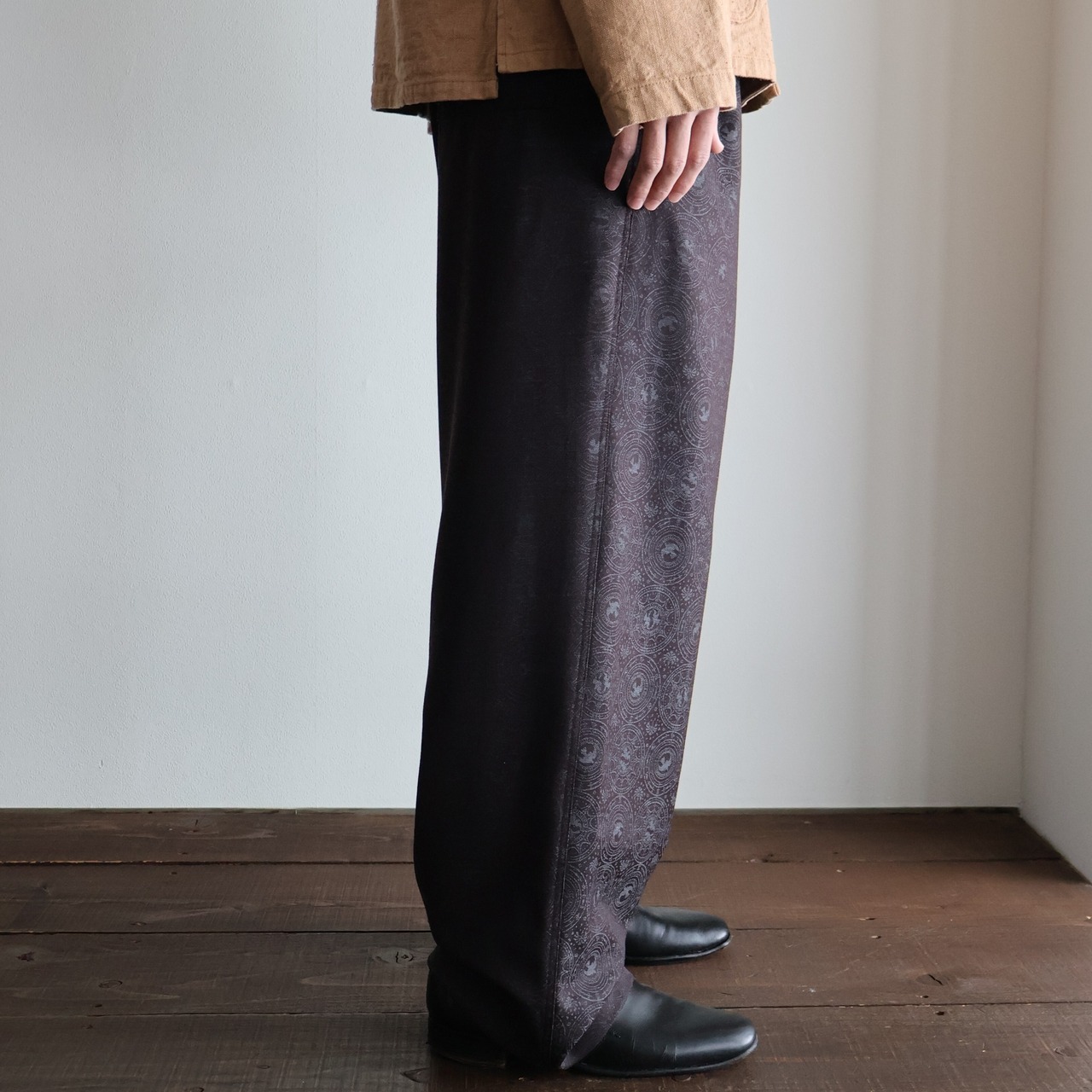 Super140’シャドージャガードのドレープが陰影をつくり、無地では味わえない奥行きを感じさせます。 ワイドでありながらも、落ち感のおかげでボリュームが抑えられ、夏の軽やかさと凛とした佇まいを両立。 イージーさとエレガンスの境界線にあるパンツとして、夏のワードローブに新しい選択肢を。