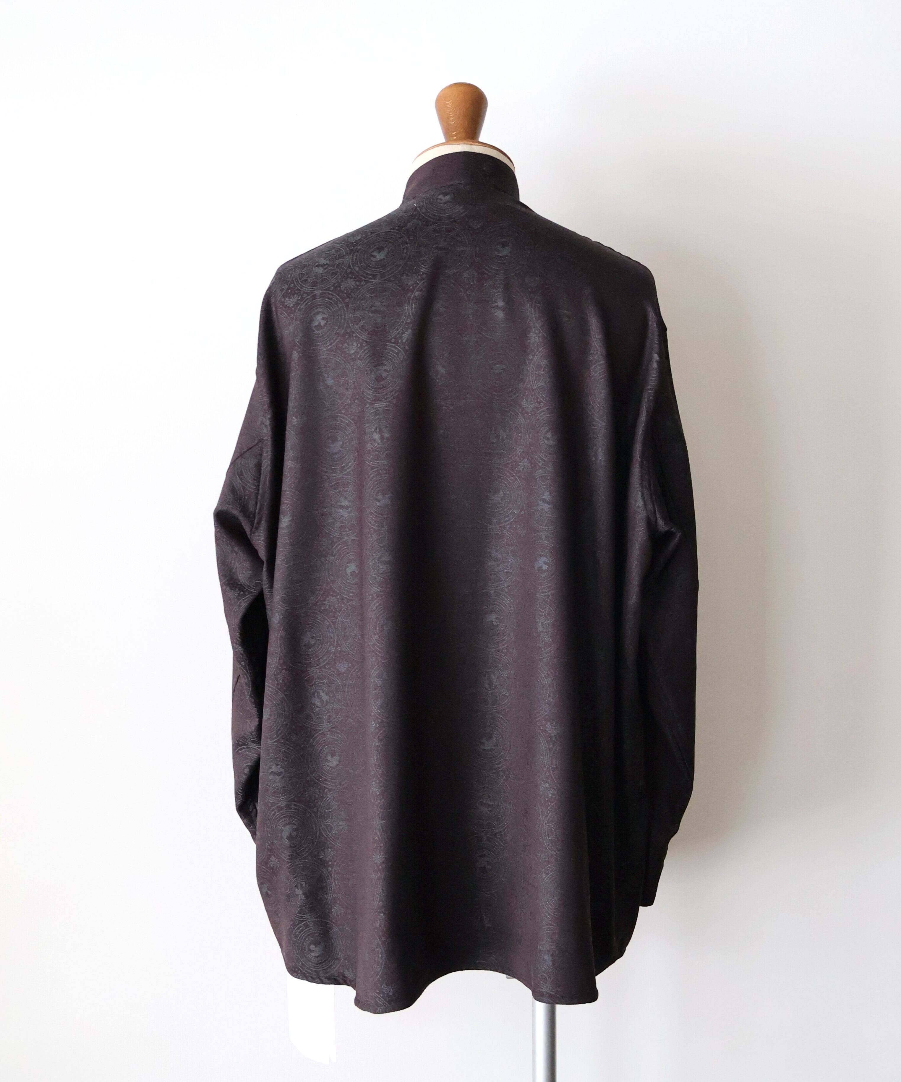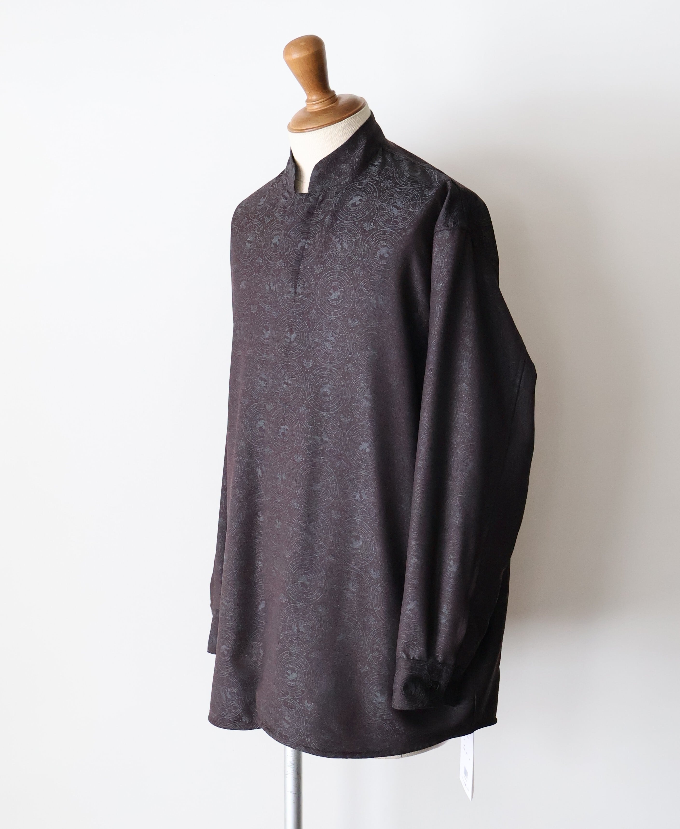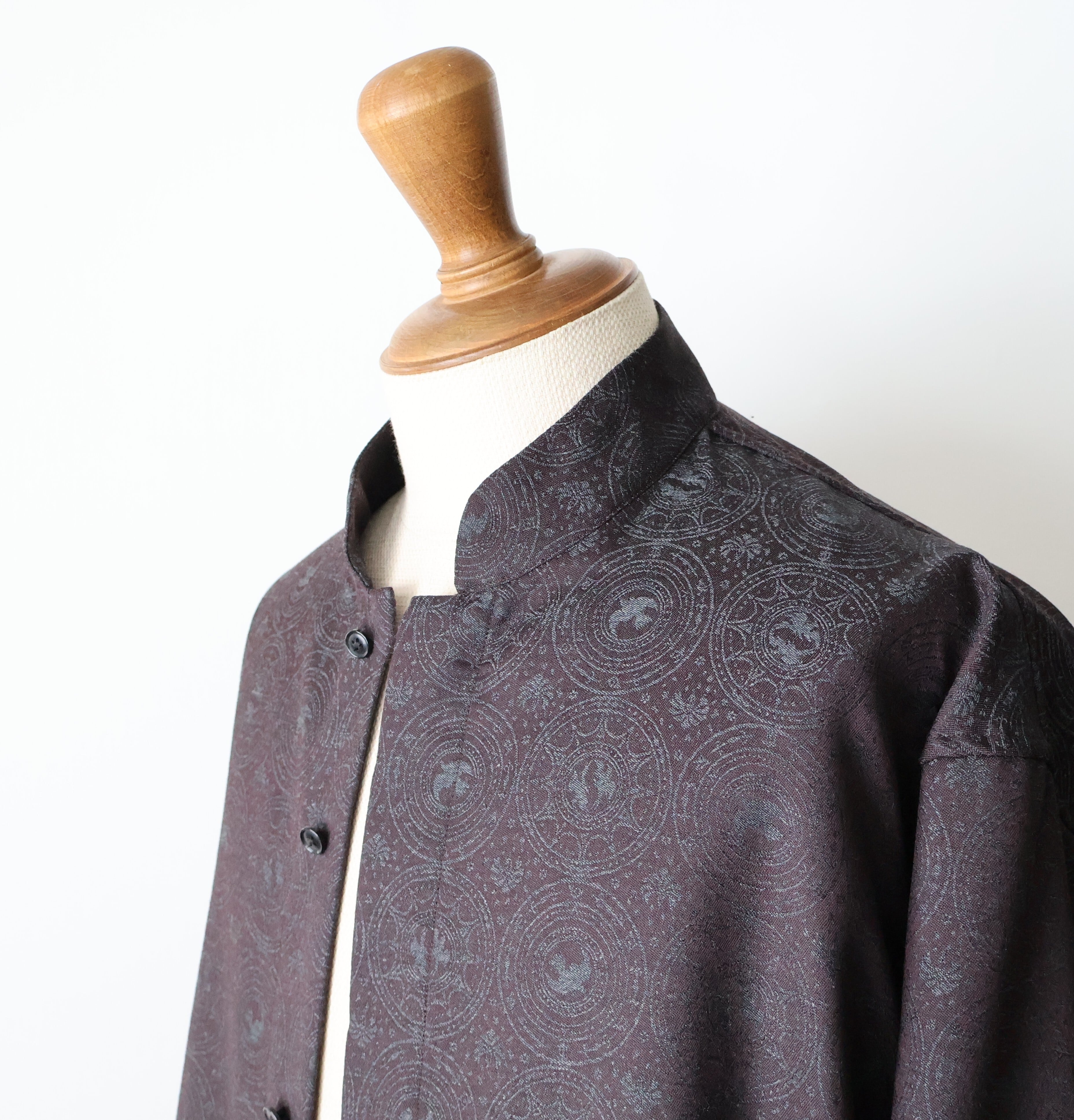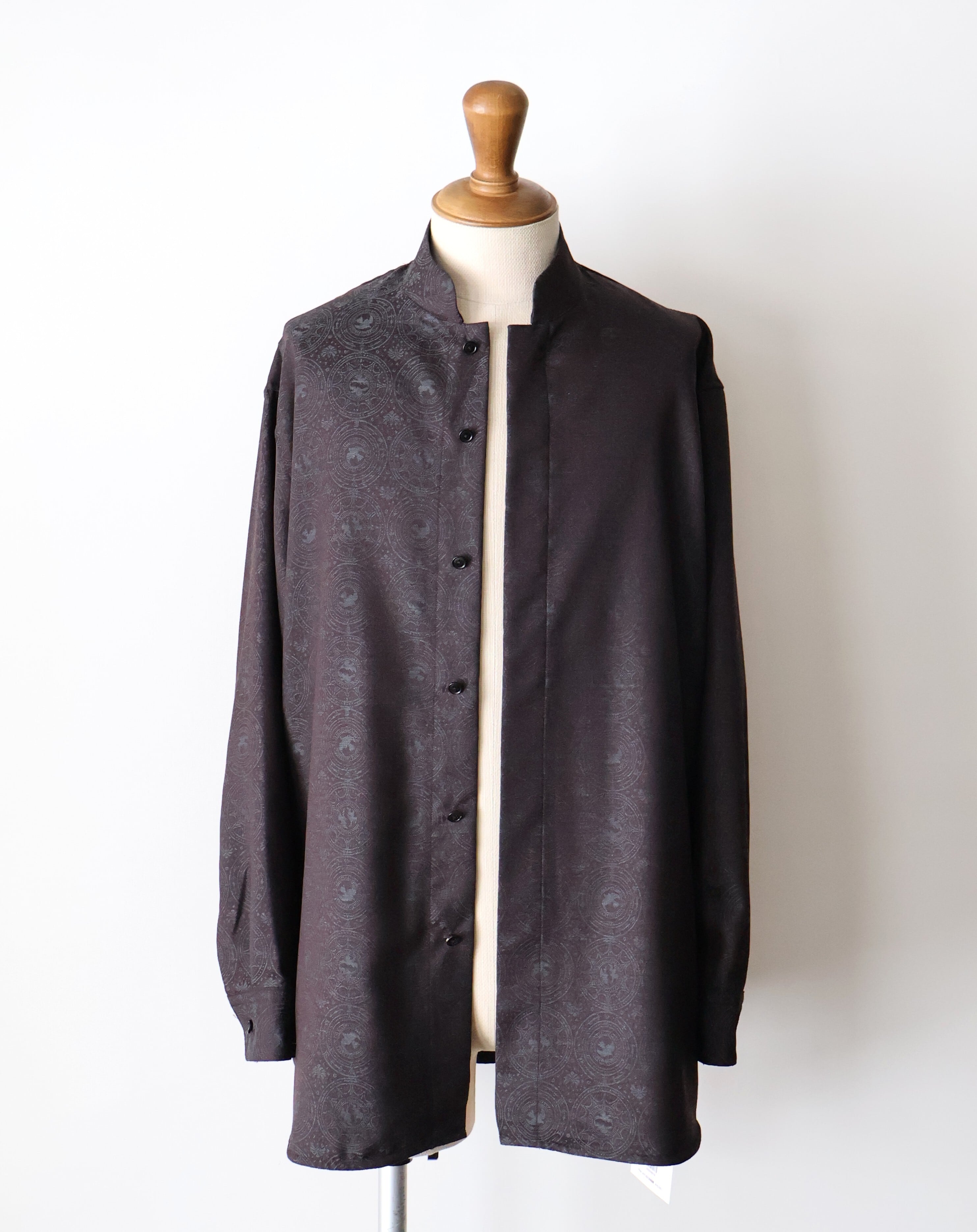 マオカラーのようなスタンドカラーに既視感を覚え、新たにテーラリングの美学を取り入れた、nonnotteらしいオーバーサイズシャツの提案です。 肩から裾まで緩やかなラウンドを描くカッティングは、動いた時に美しいドレープを生み出し、シャドージャガードの陰影をより深く見せてくれます。 オーバーサイズながら、身頃の分量やカーブのバランスを細かく調整し、だらしなくならず、テーラードジャケットのように凛とした佇まいを感じさせる仕上がりです。 生地の陰影とフォルムが響き合い、光の中で静かに華やぐ。 そんな、シャツでありながらテーラリングの思想を宿したnonnotteらしい一枚です。