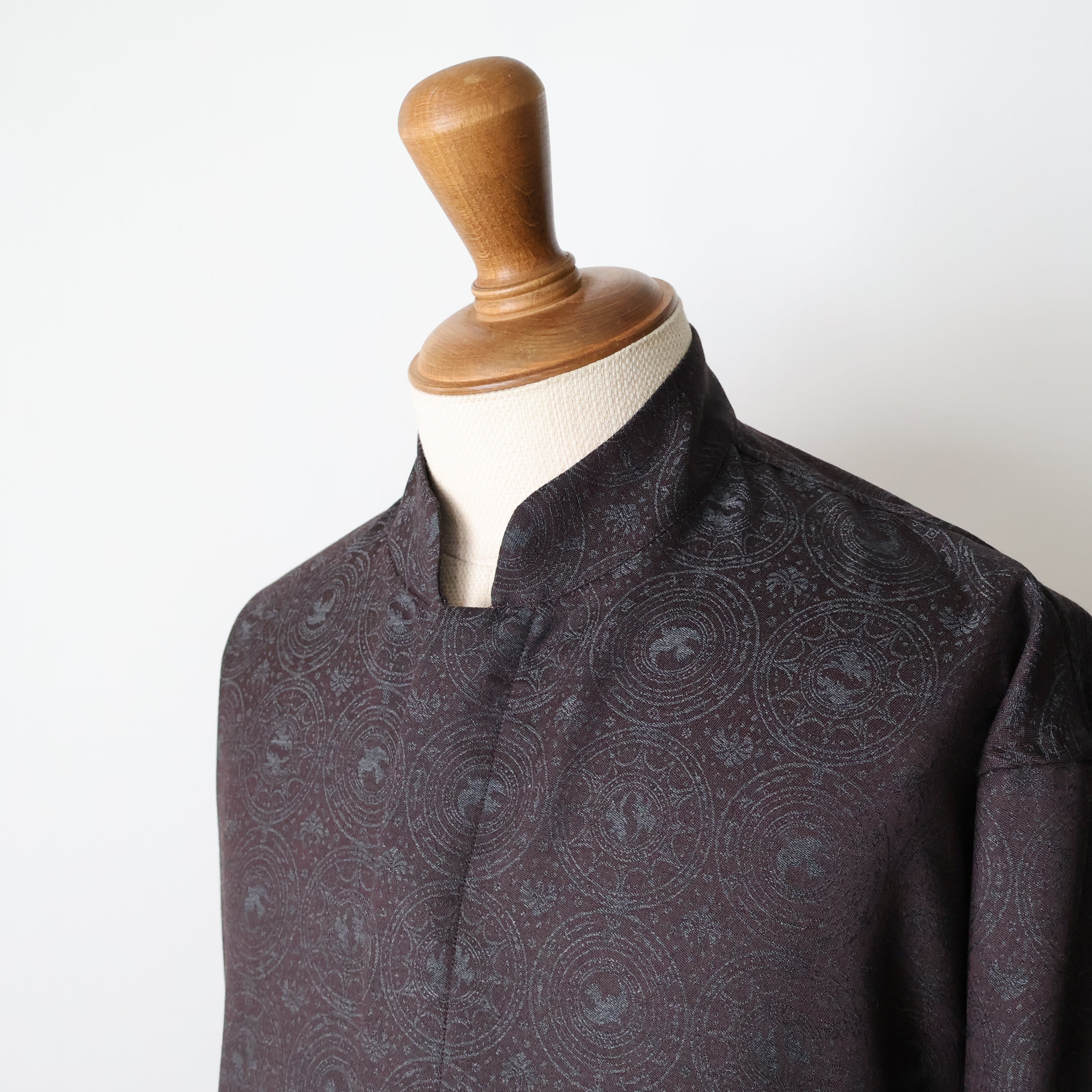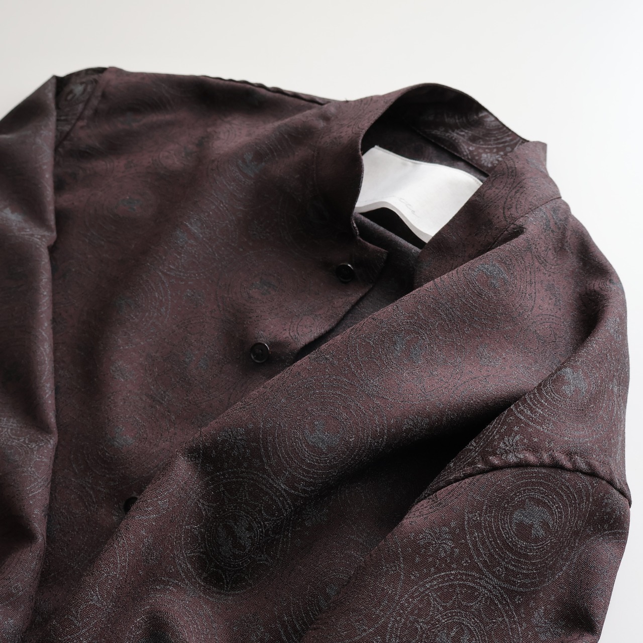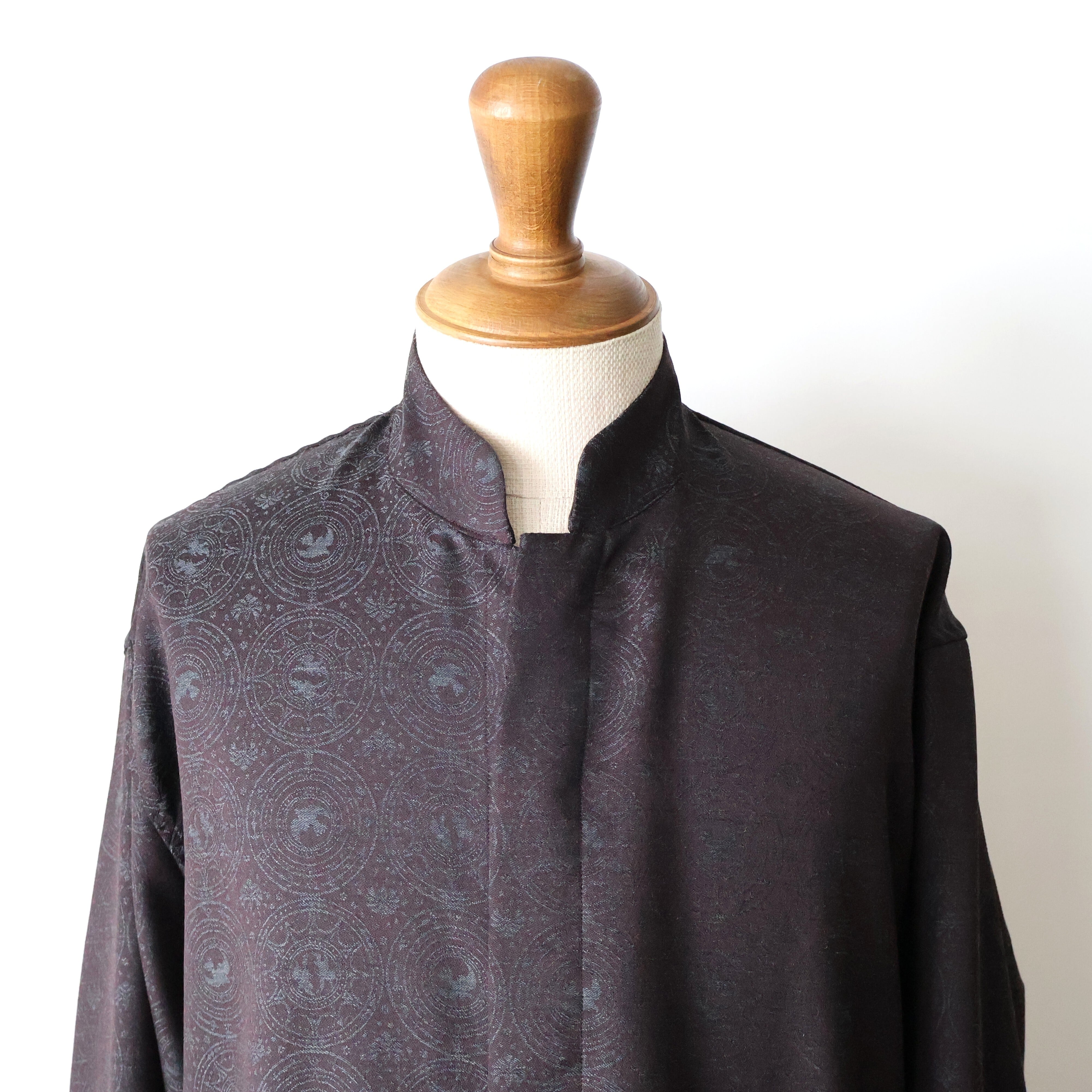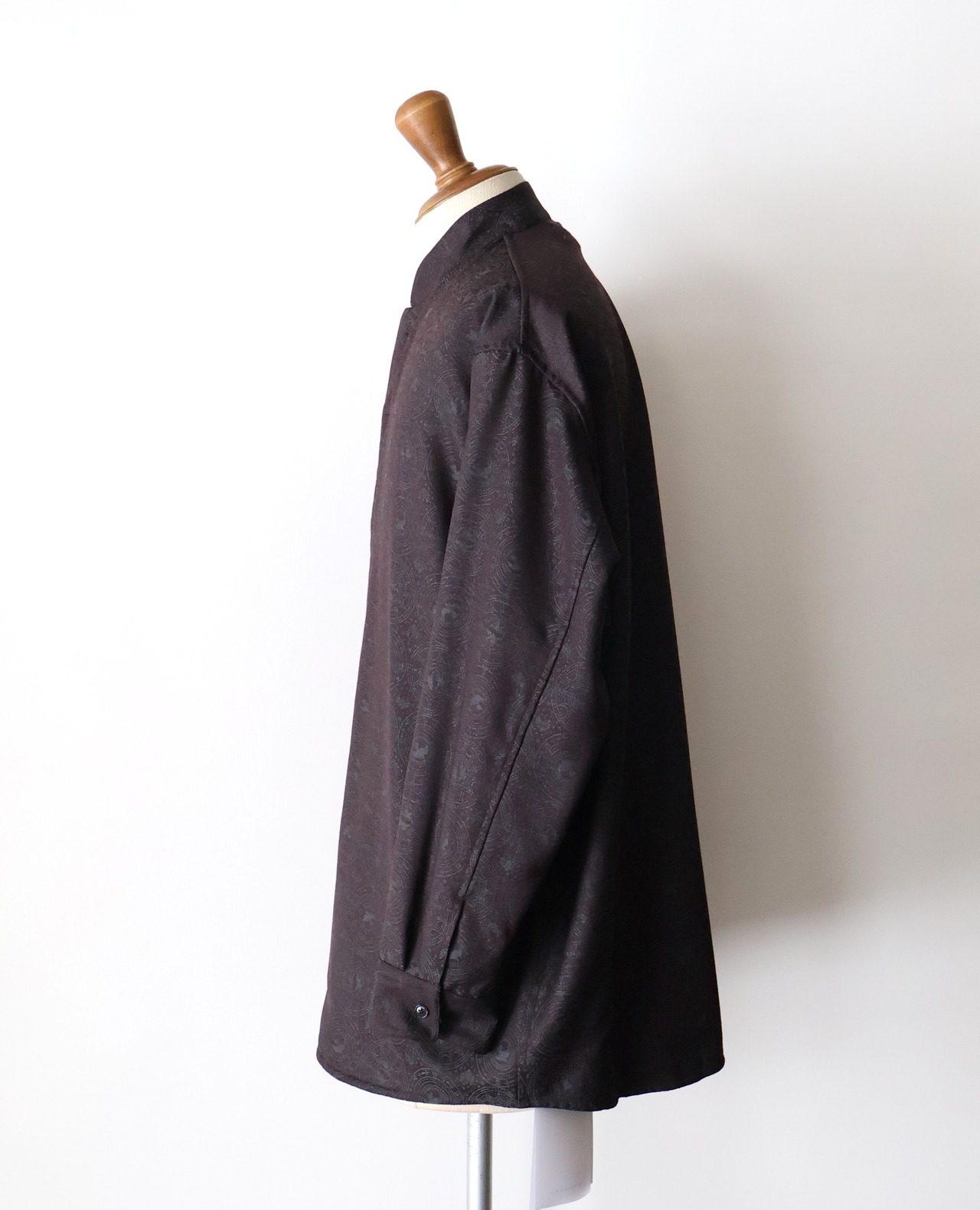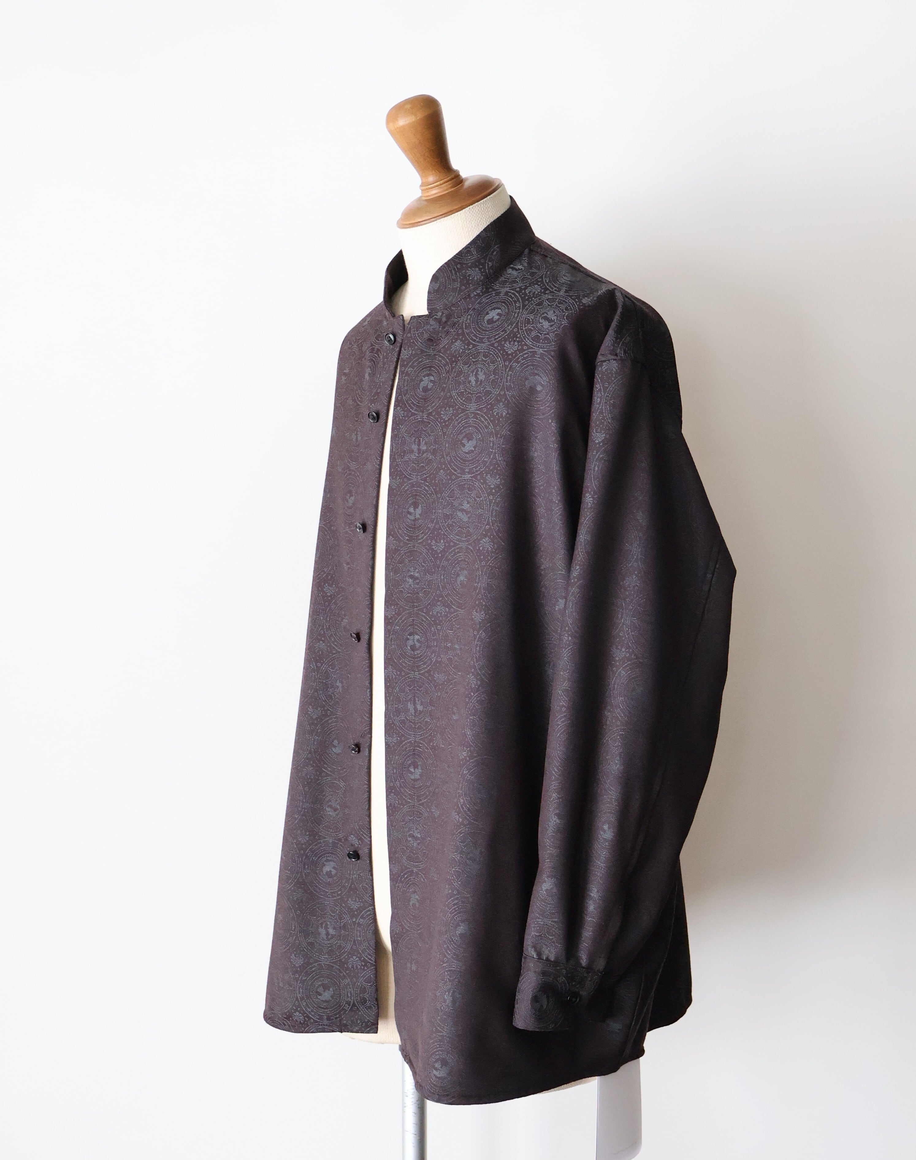 マオカラーのようなスタンドカラーに既視感を覚え、新たにテーラリングの美学を取り入れた、nonnotteらしいオーバーサイズシャツの提案です。 肩から裾まで緩やかなラウンドを描くカッティングは、動いた時に美しいドレープを生み出し、シャドージャガードの陰影をより深く見せてくれます。 オーバーサイズながら、身頃の分量やカーブのバランスを細かく調整し、だらしなくならず、テーラードジャケットのように凛とした佇まいを感じさせる仕上がりです。 生地の陰影とフォルムが響き合い、光の中で静かに華やぐ。 そんな、シャツでありながらテーラリングの思想を宿したnonnotteらしい一枚です。