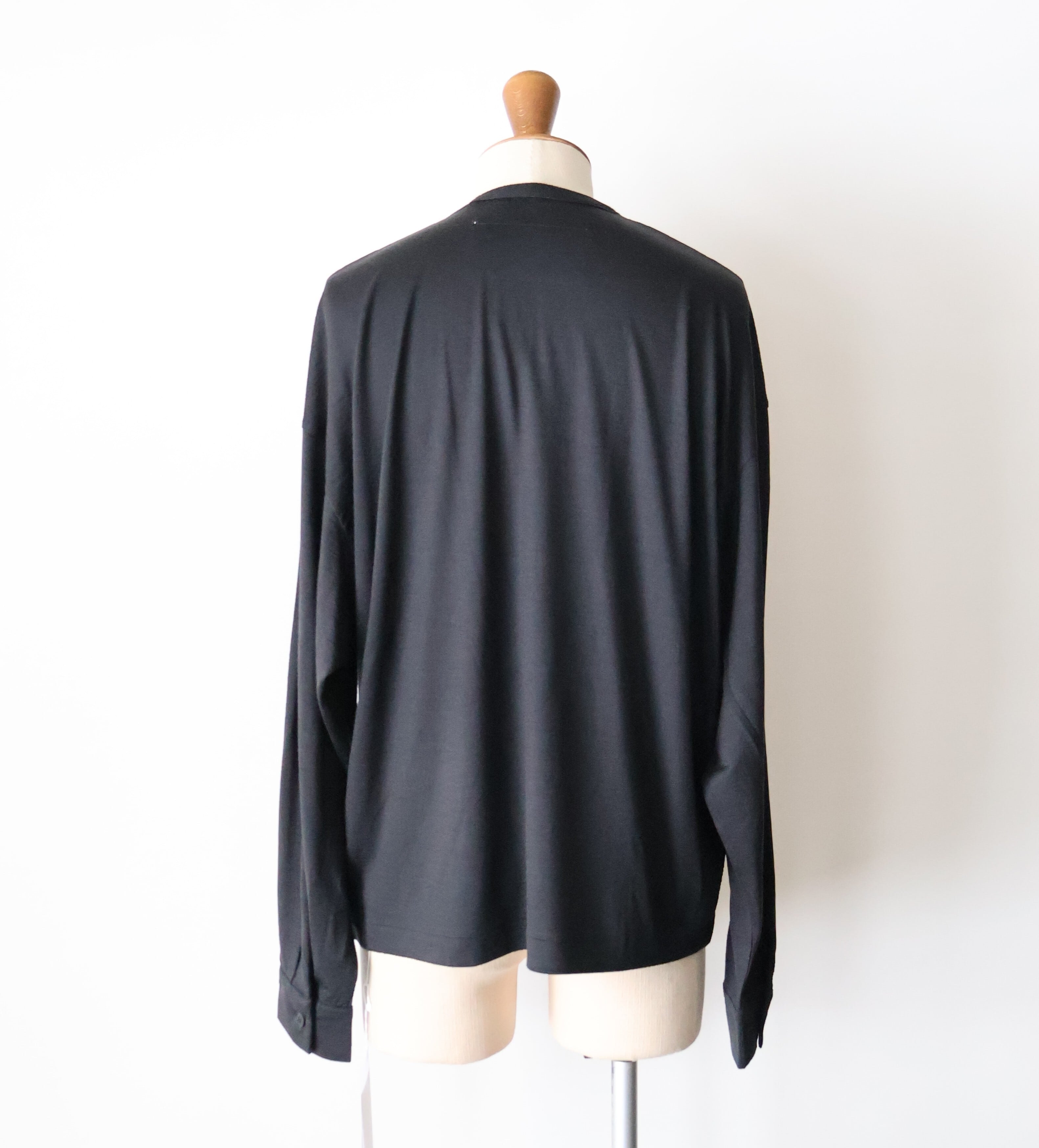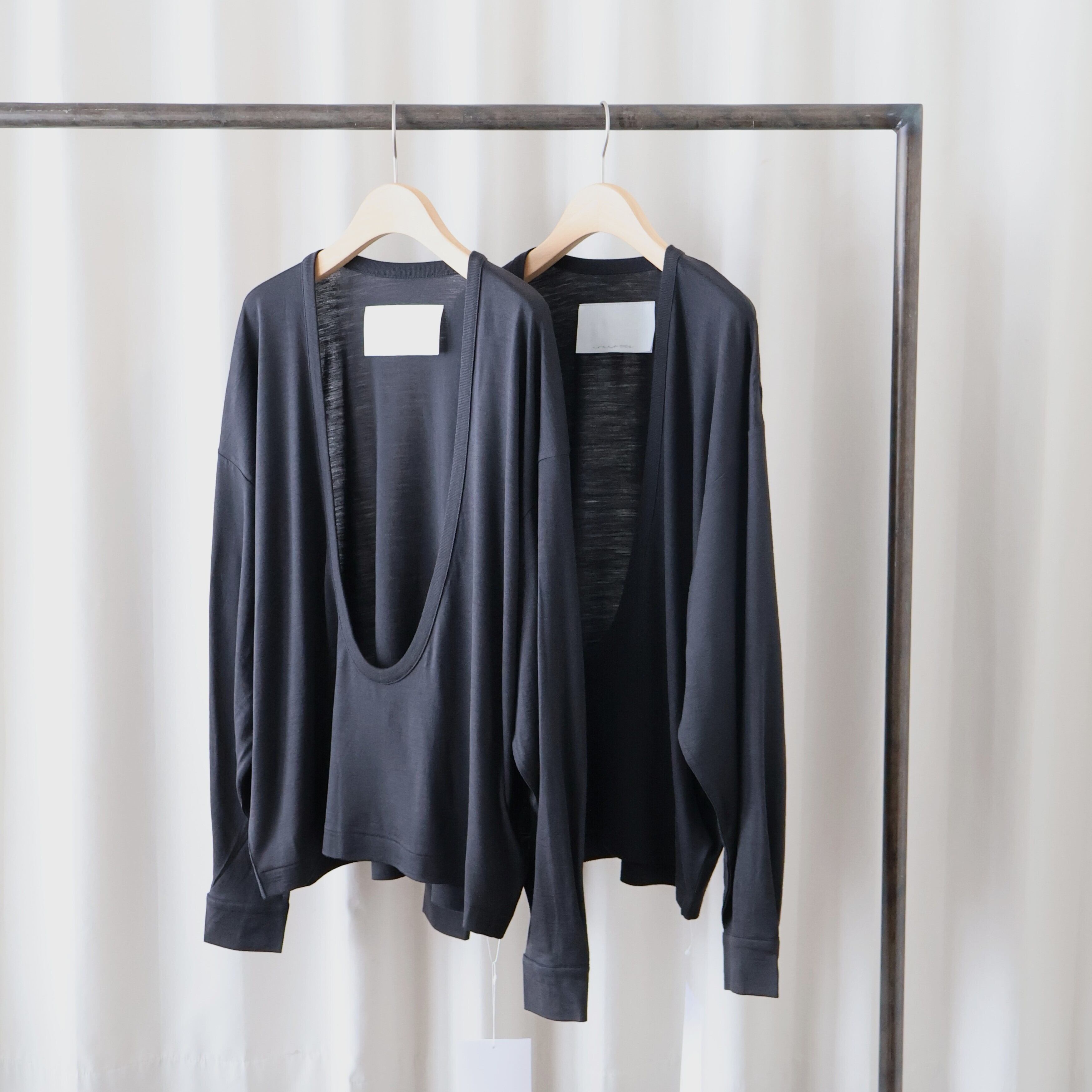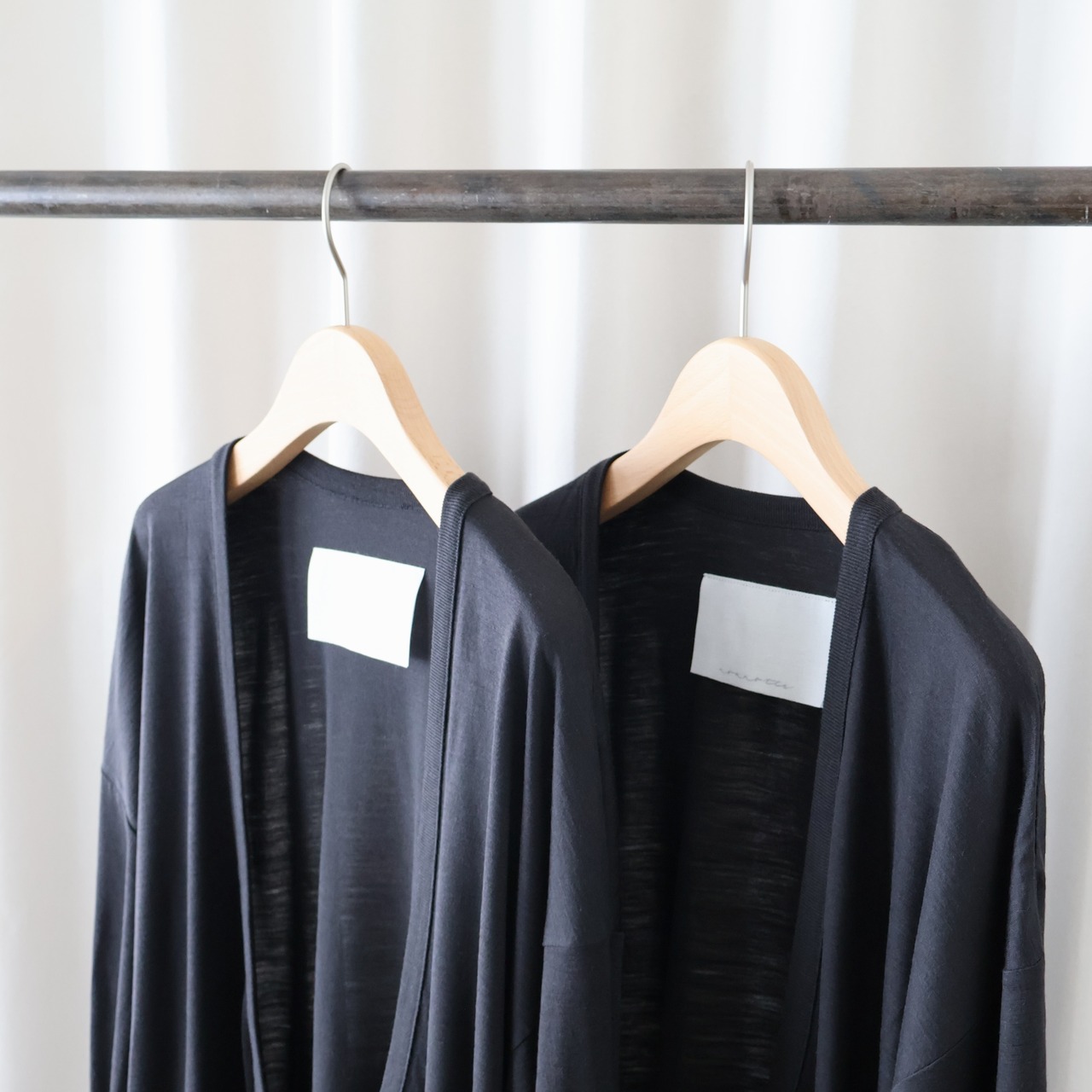 何度も洗いながら育てていく中で、色褪せても気にならないよう、わずかに青みを忍ばせた墨色のようなニュアンスにしています。 ウールの黒は、それだけで上品な艶を持っていて、カットソーでありながらどこか格調を感じさせる。洗いを重ねるほどに表情が柔らかくなり、育っていく過程を楽しめます。