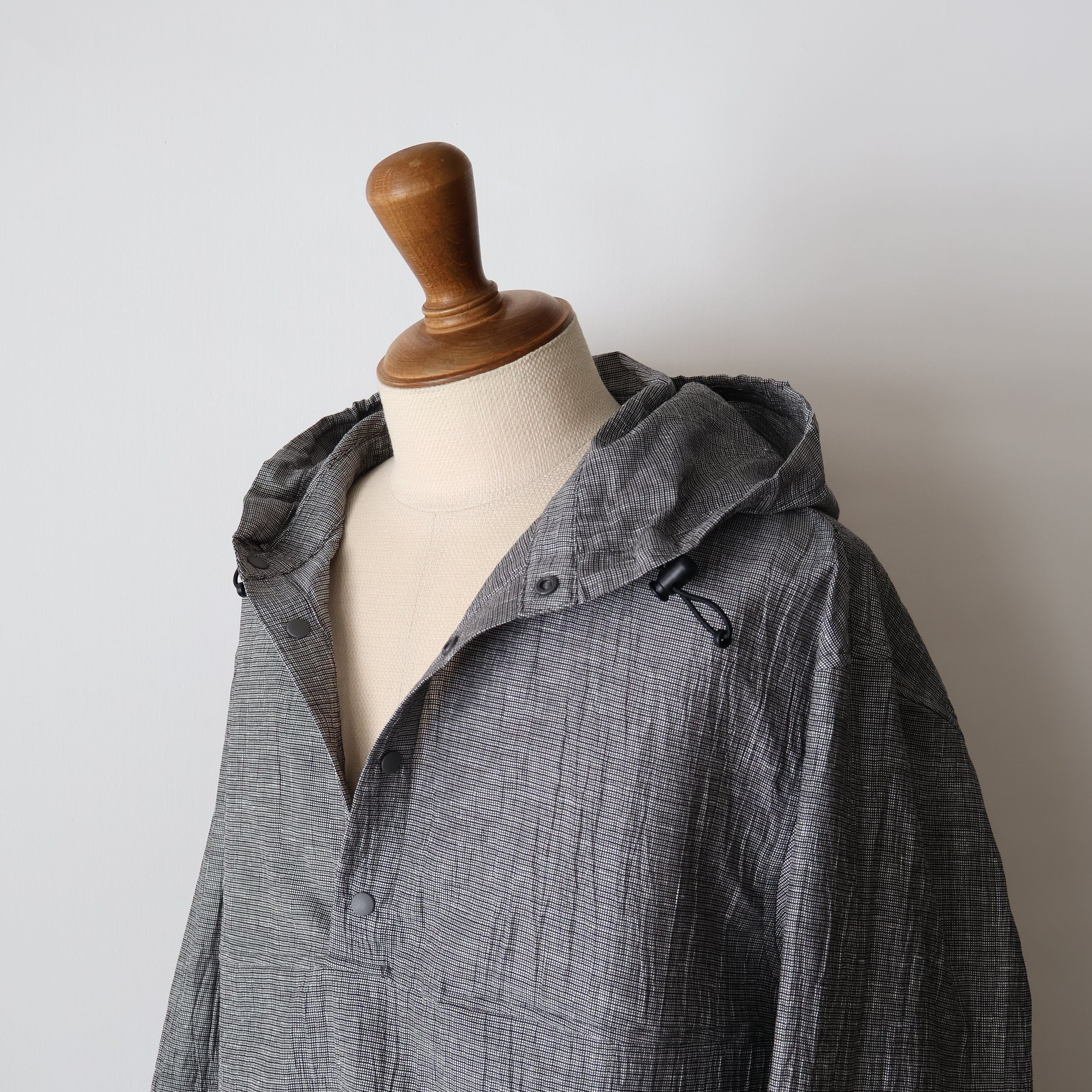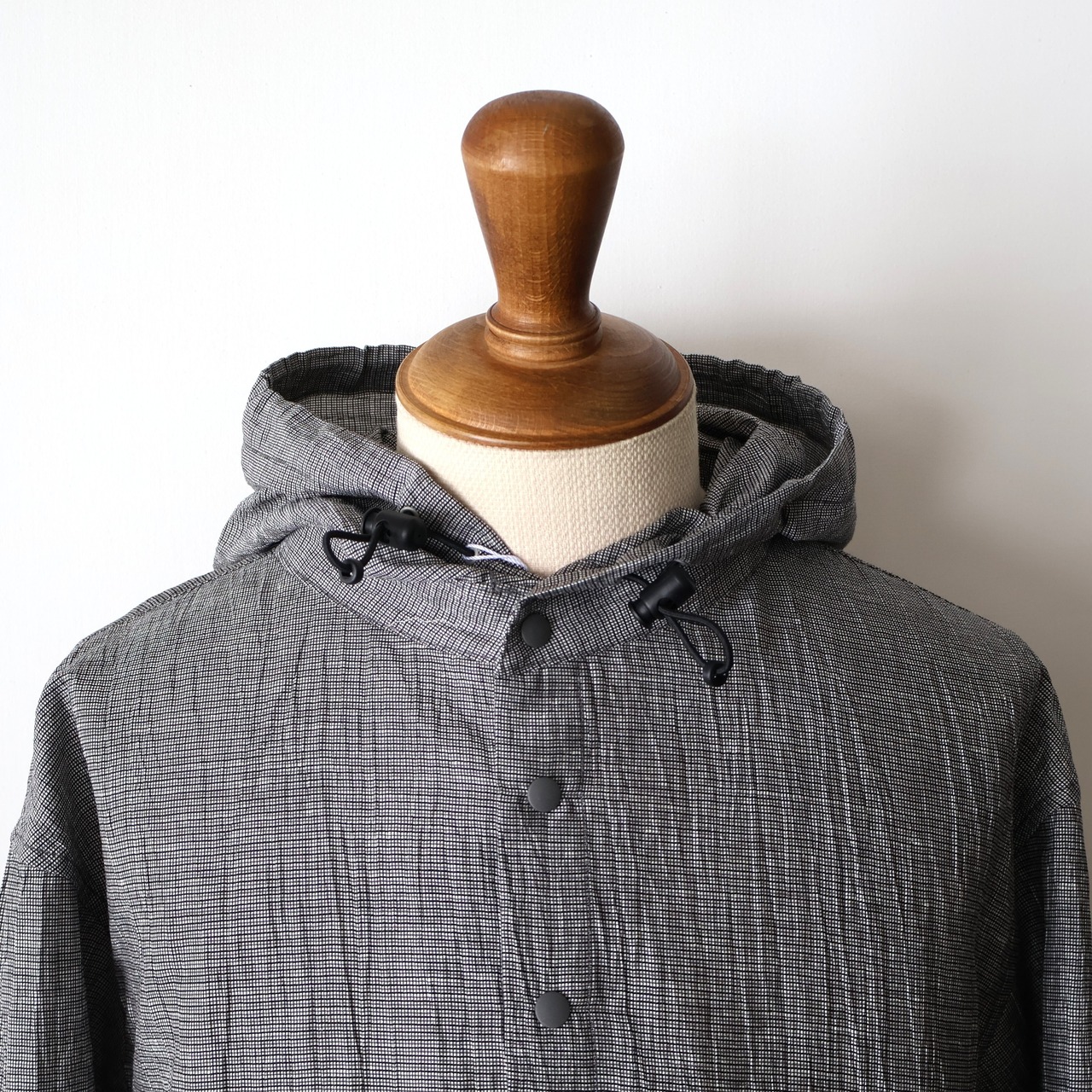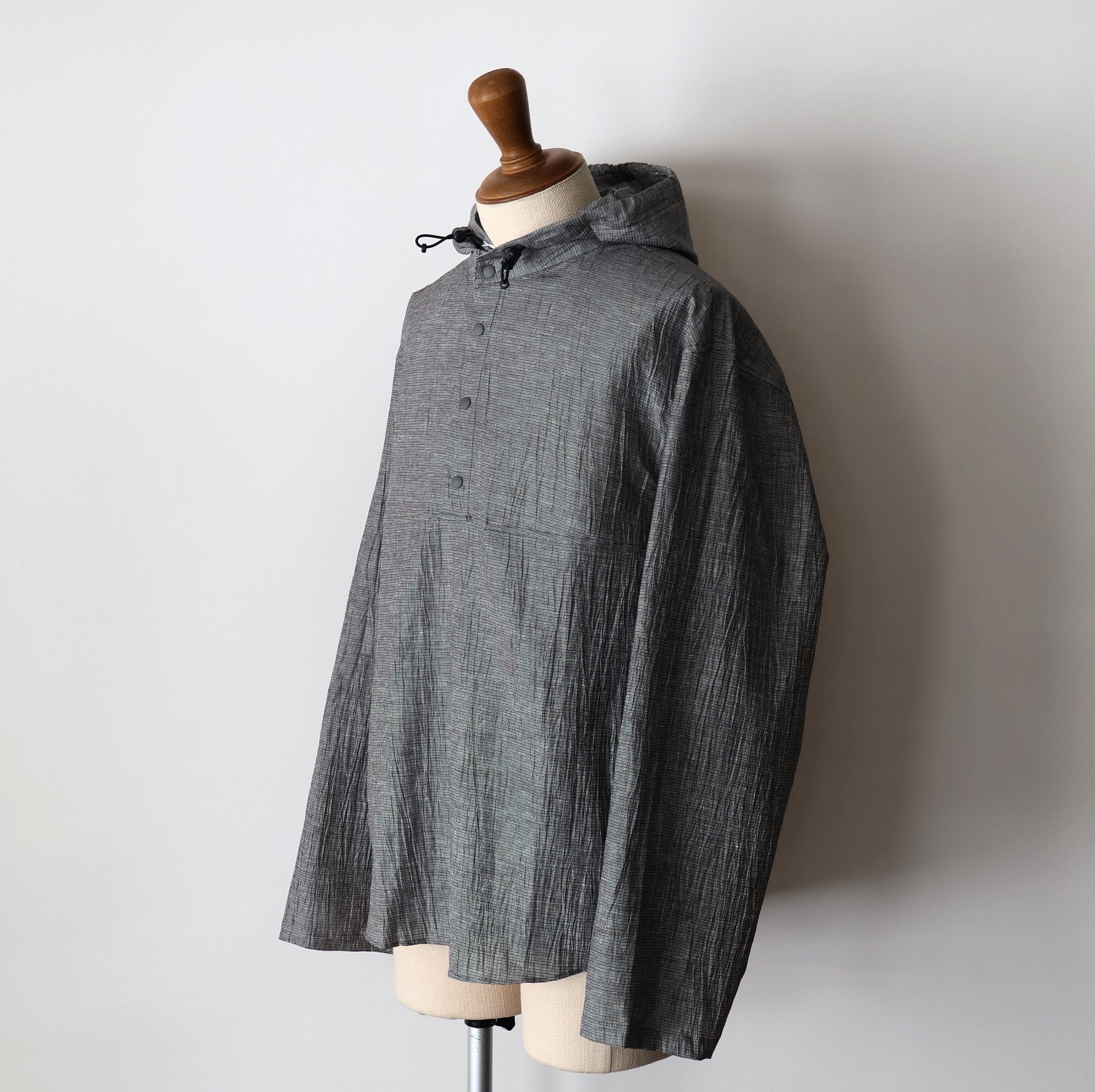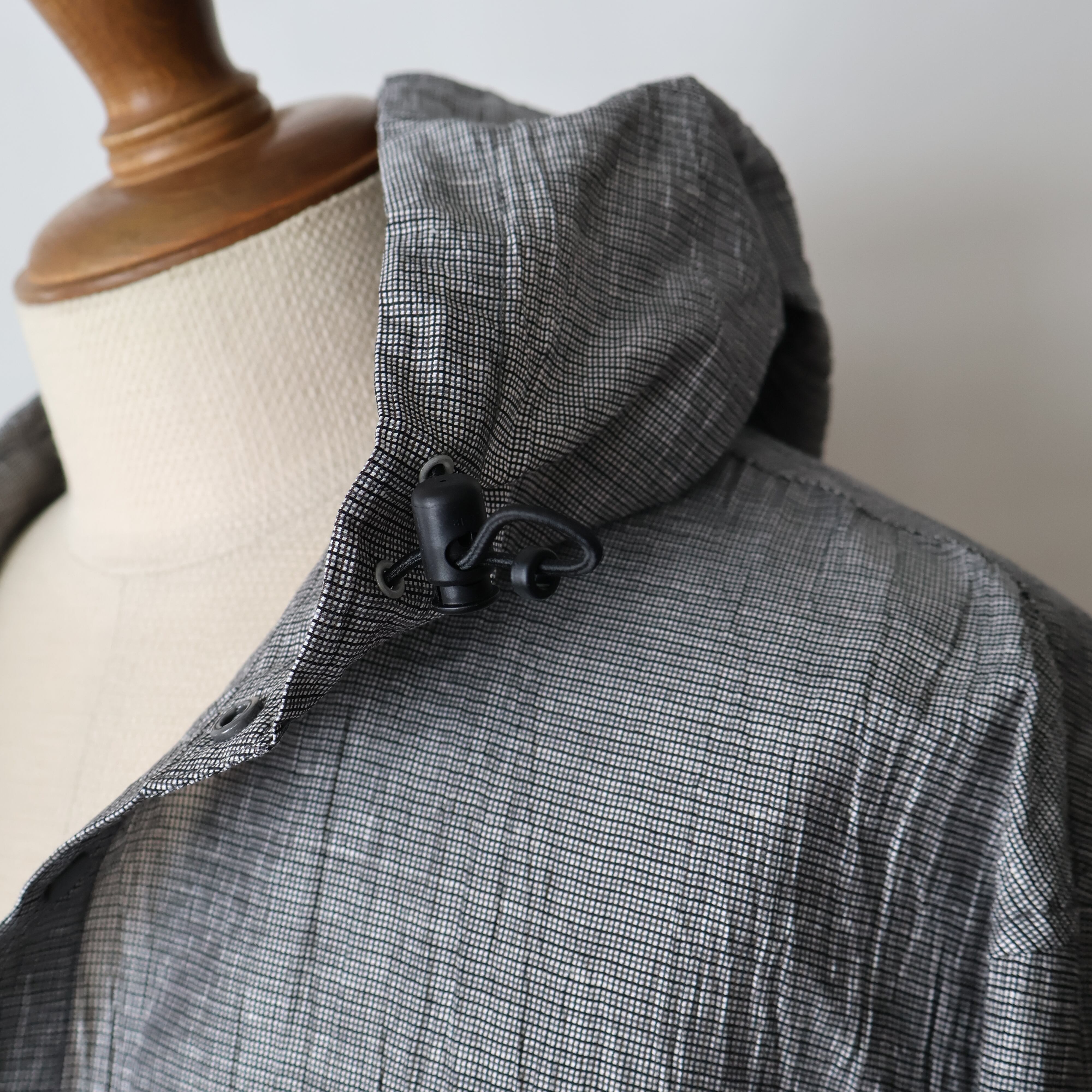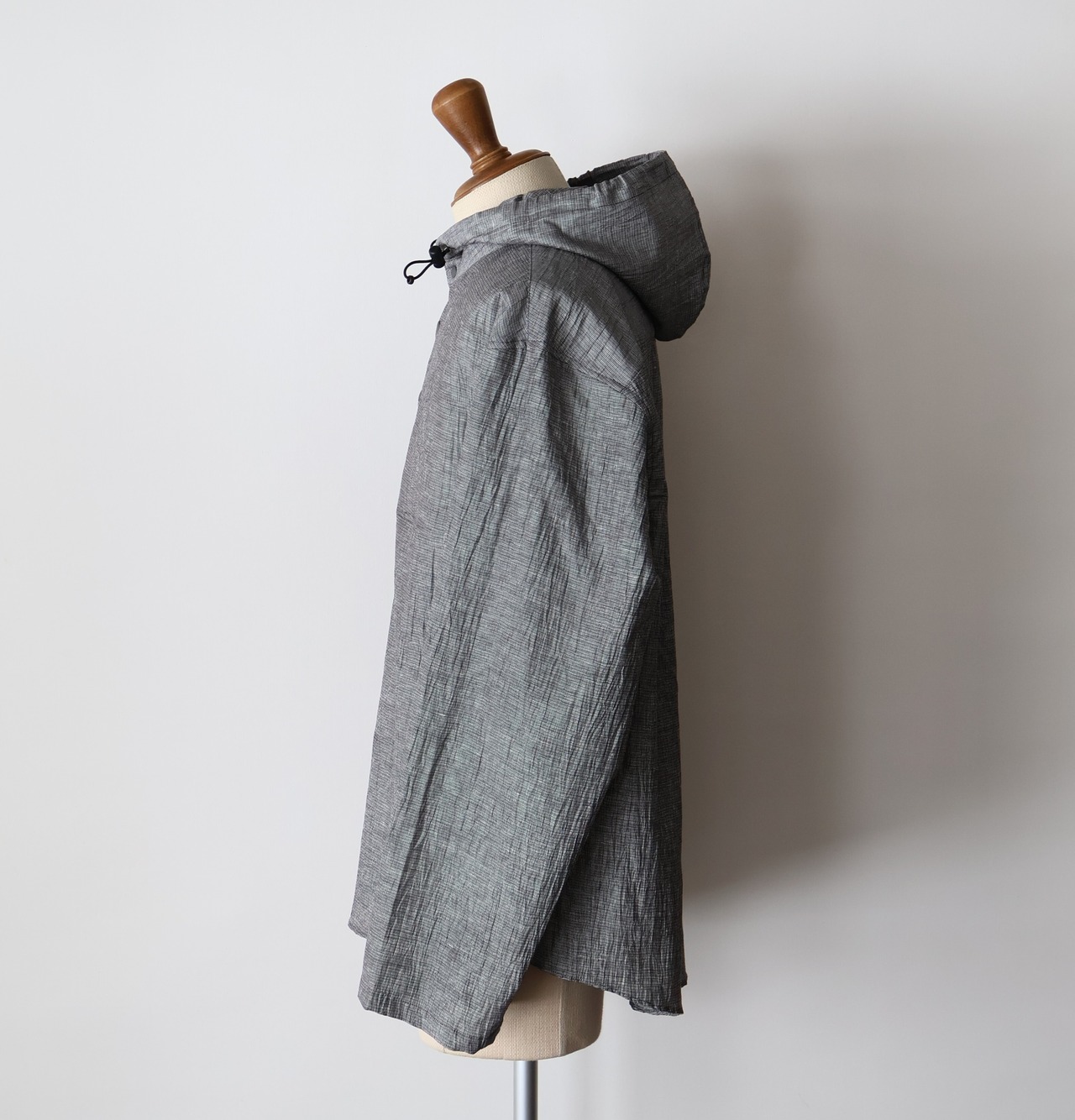 タテジワ加工により、表面感と清涼感があり、数種類の糸を使用しているので柄になっているのもポイントです。 フード部分につけたゴムスピンドルにより、スポーティな仕上がりになっております。