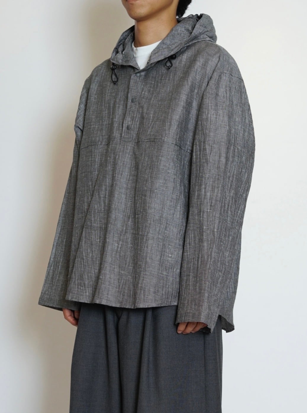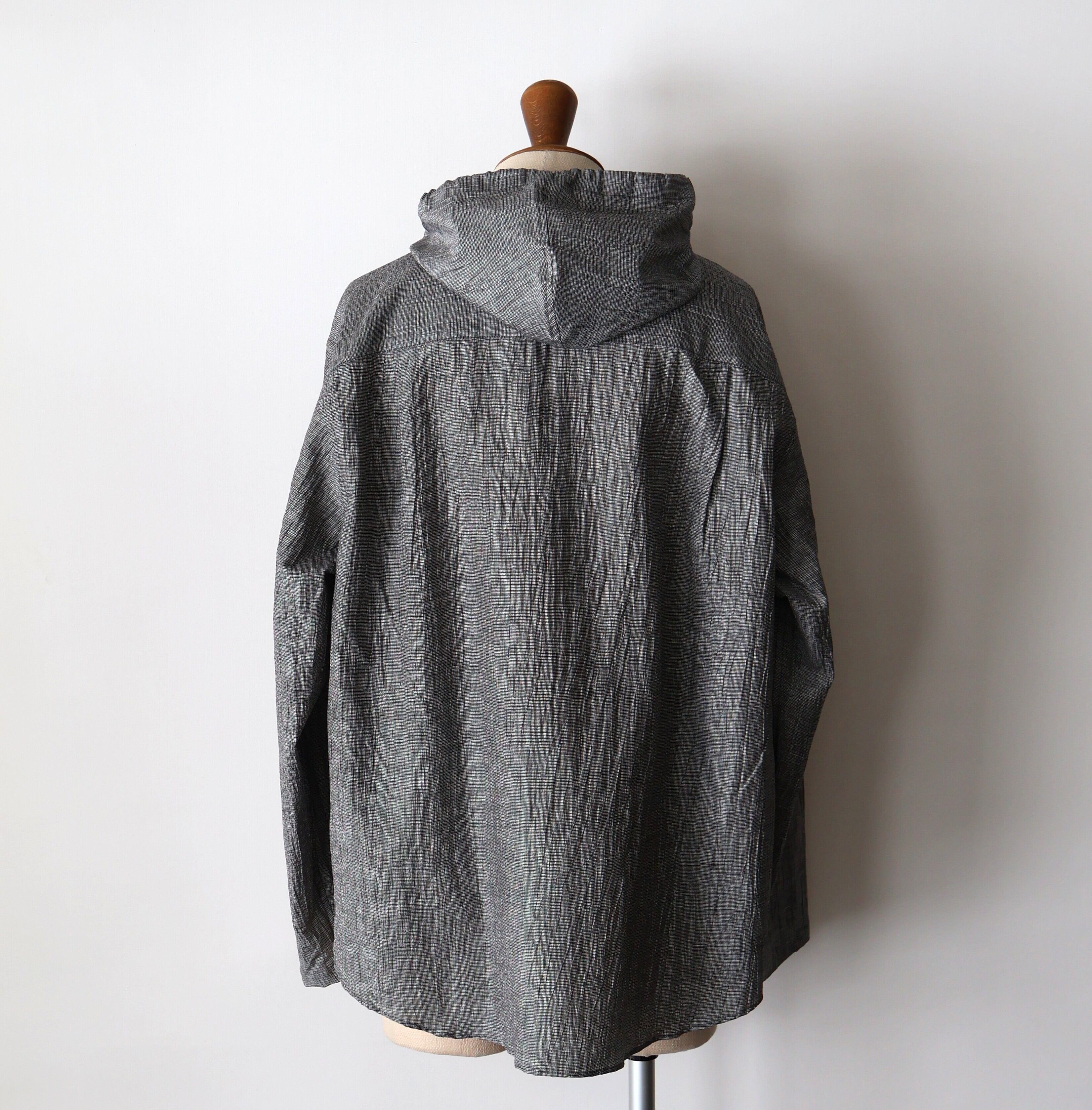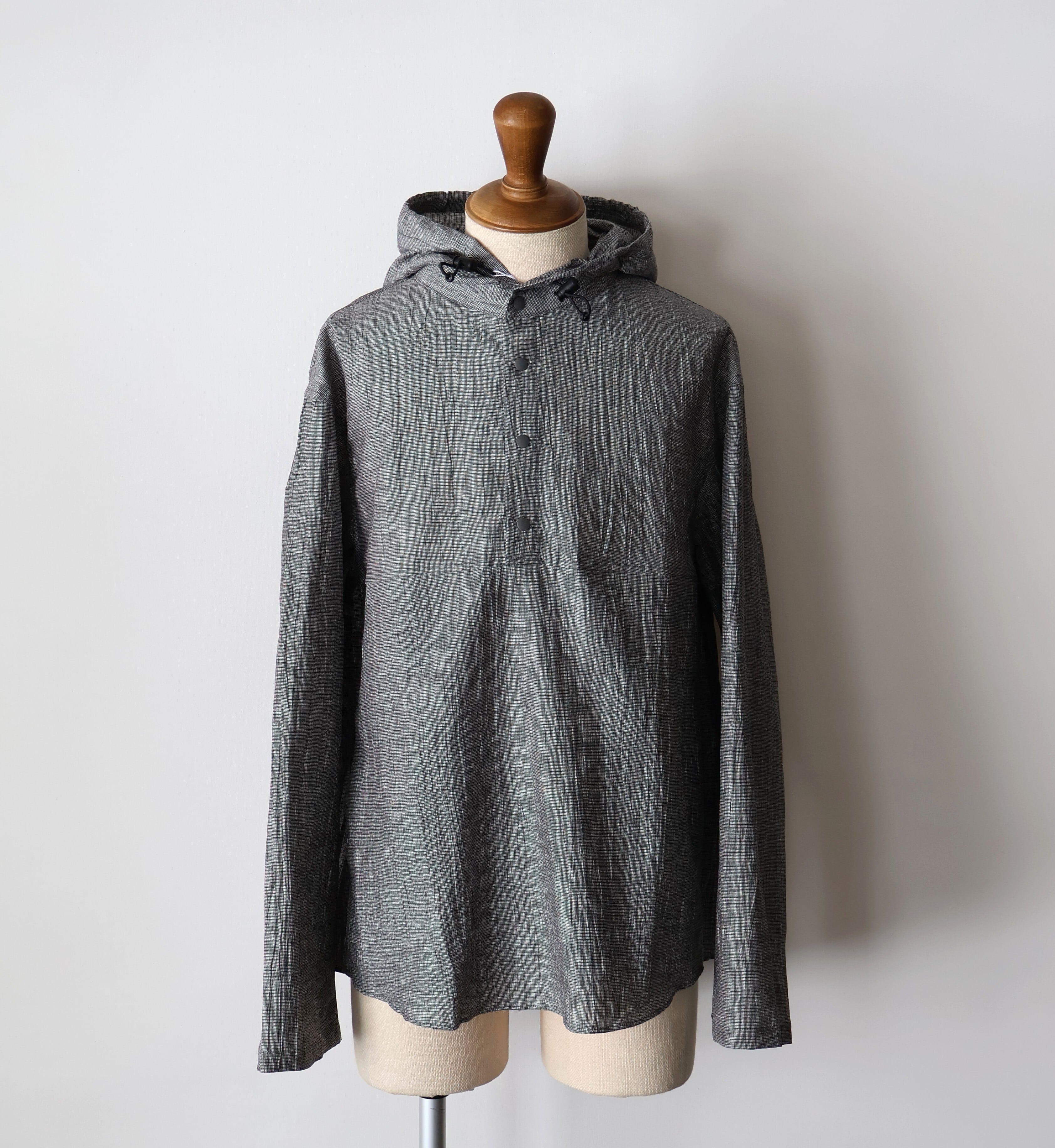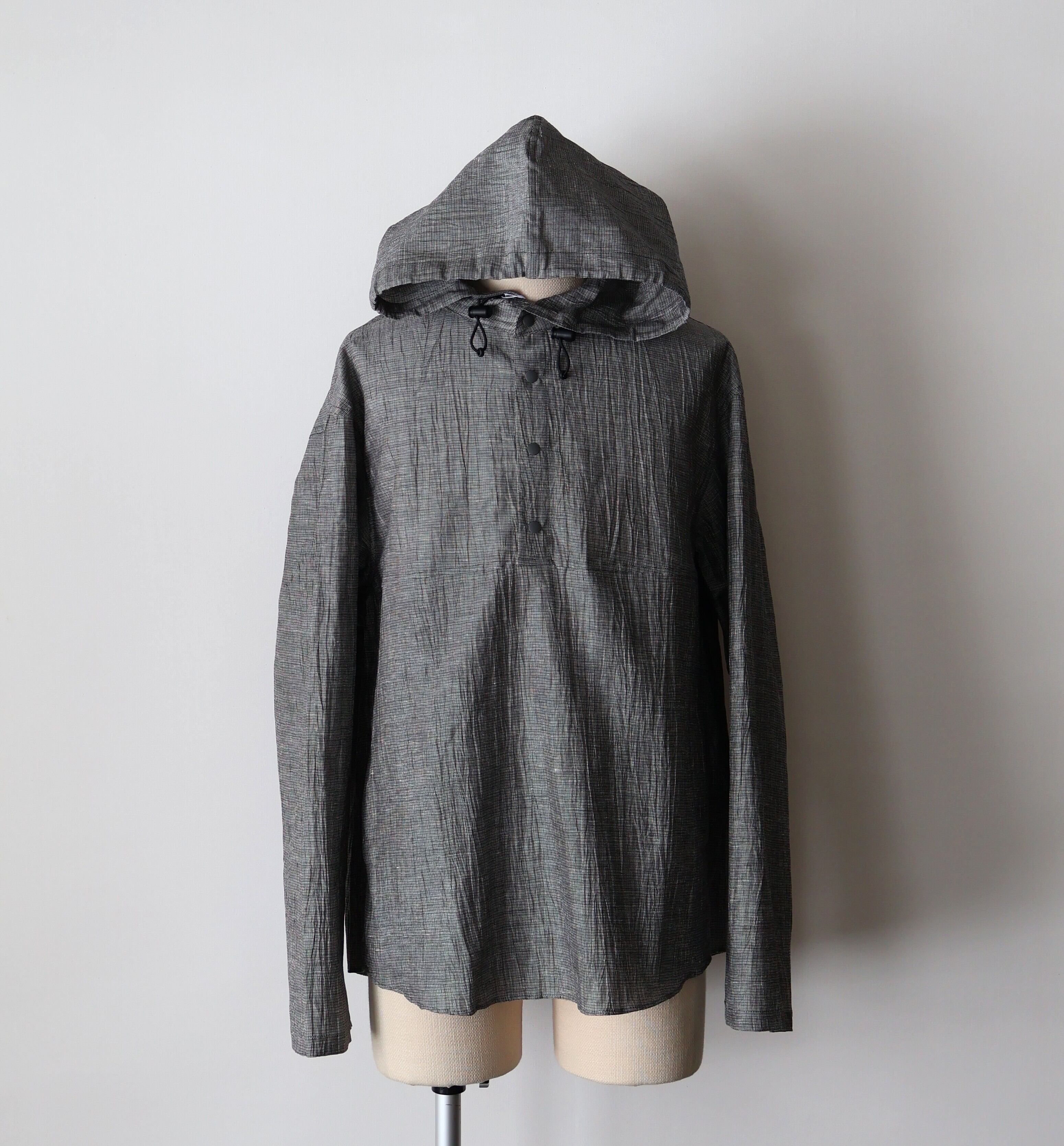 リネンとコットン、ポリエステルの糸を使用した生地を使用したプルオーバーのフードシャツになります。