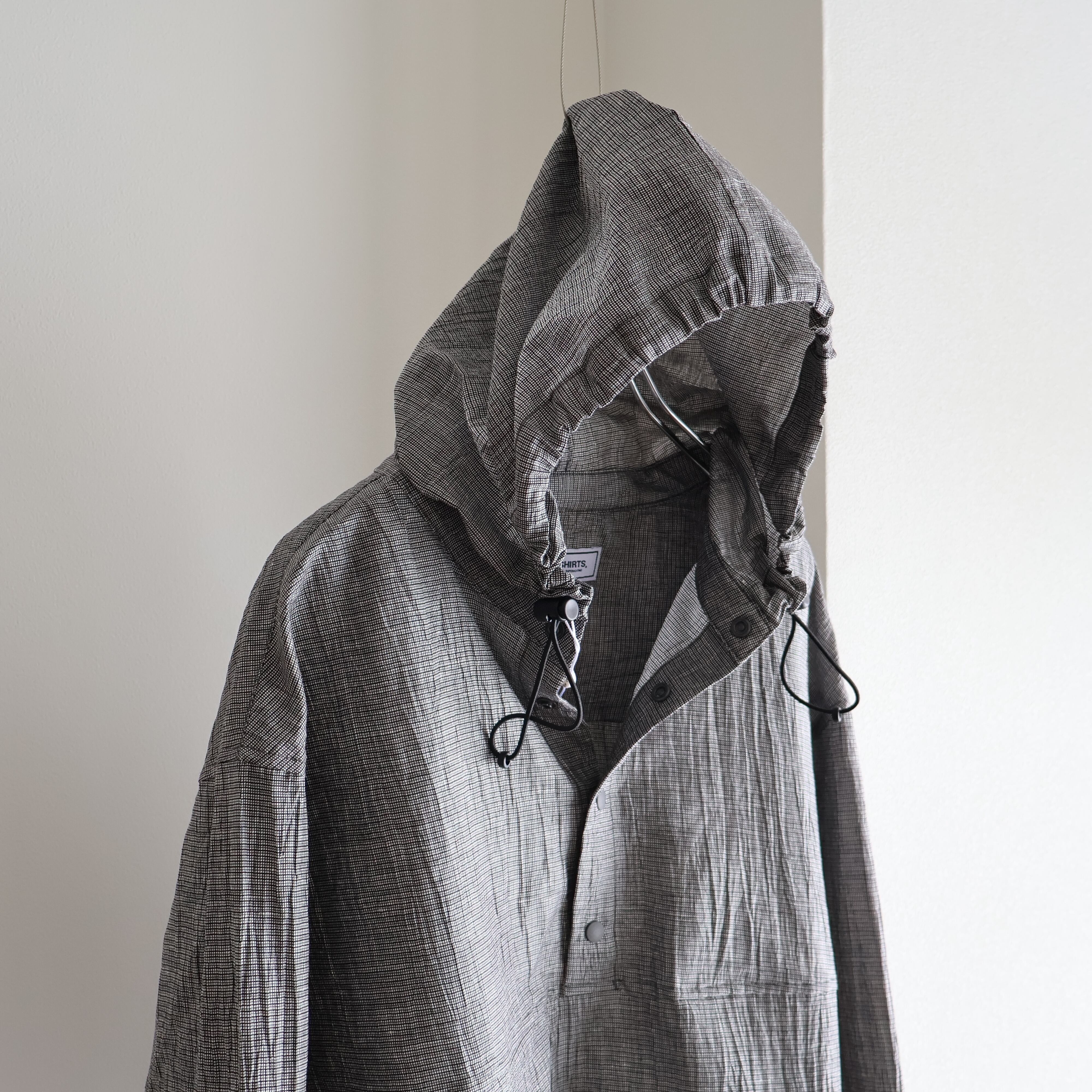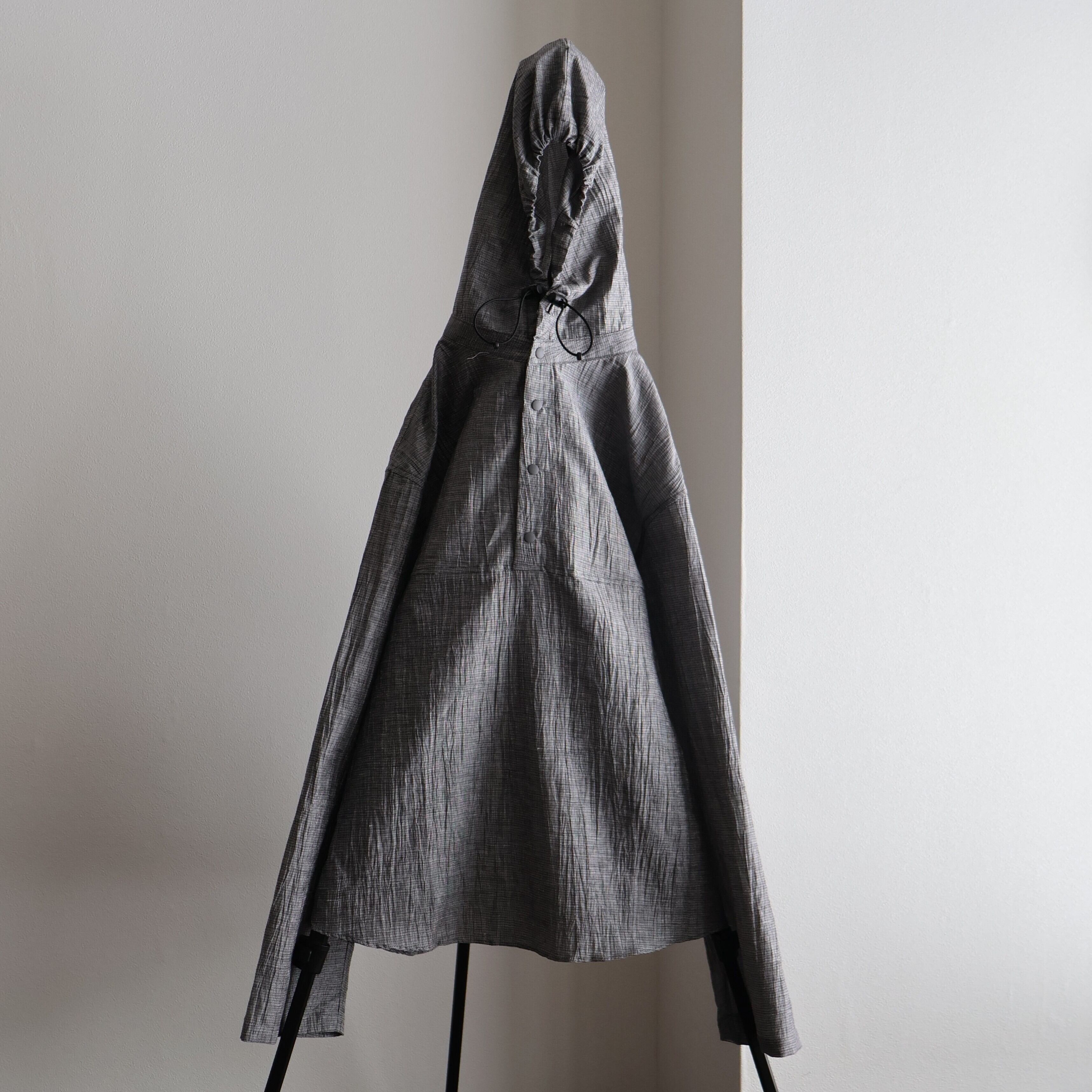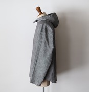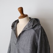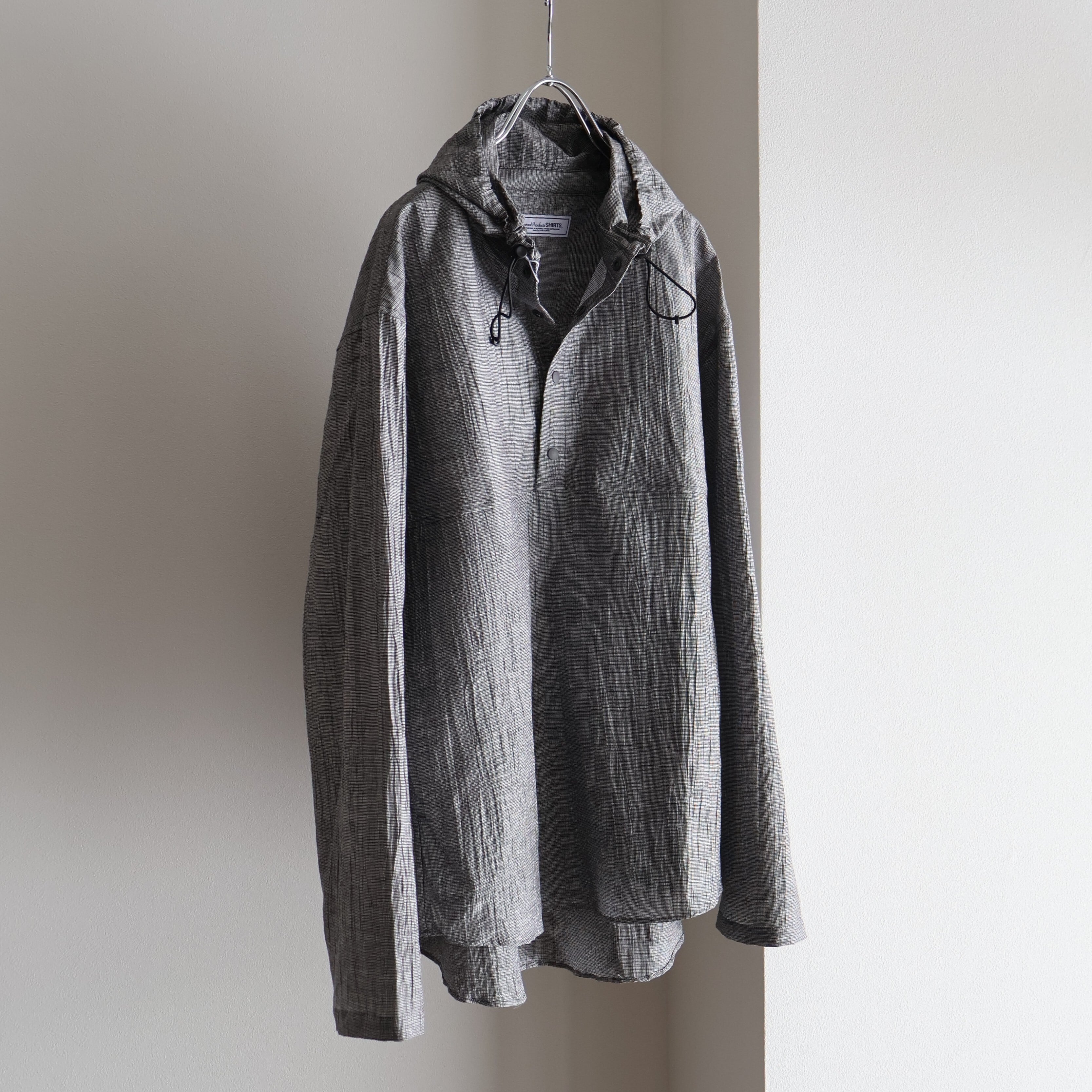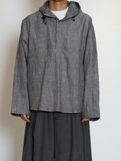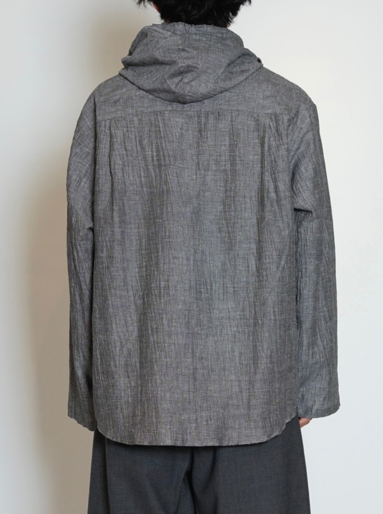 リネンとコットン、ポリエステルの糸を使用した生地を使用したプルオーバーのフードシャツになります。