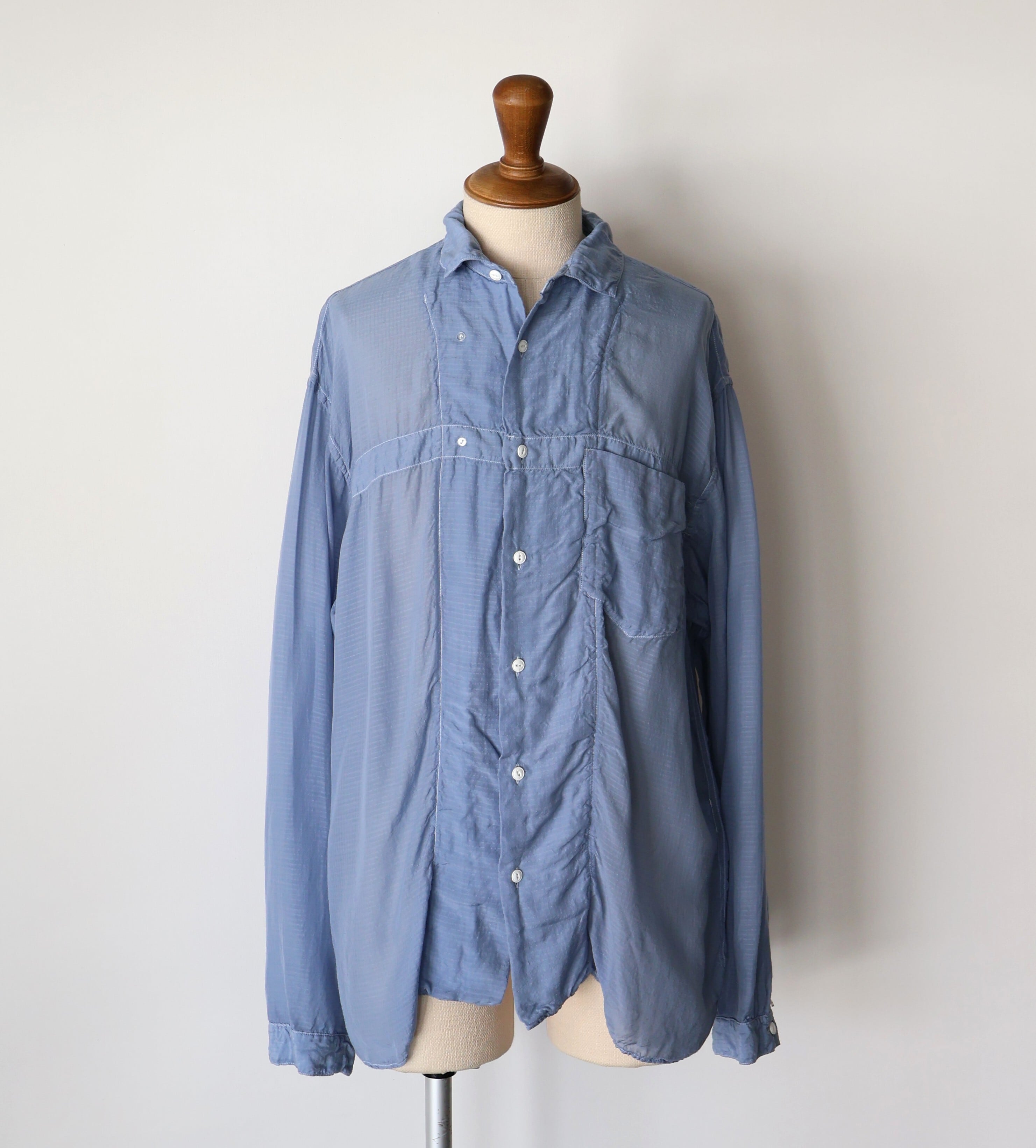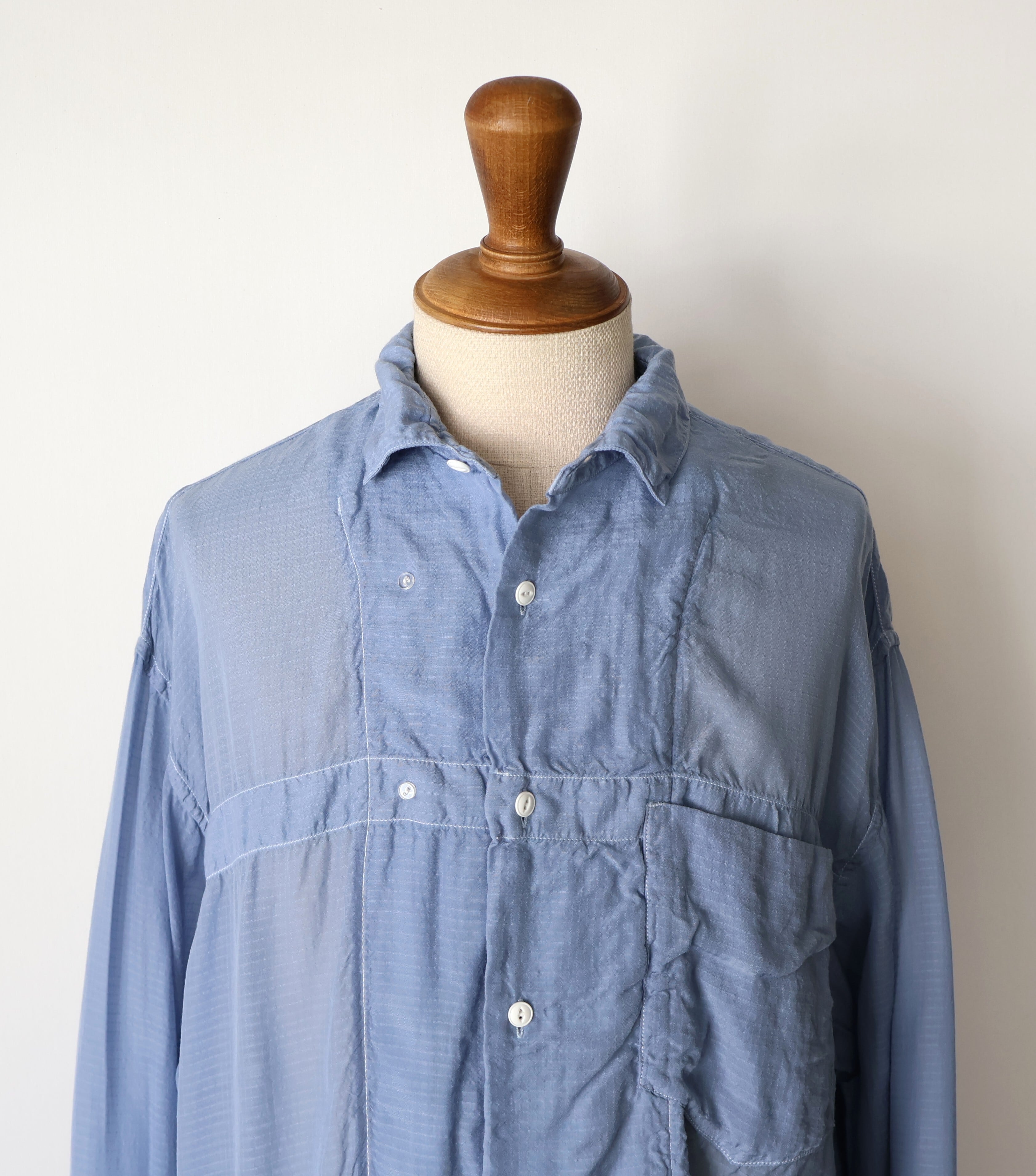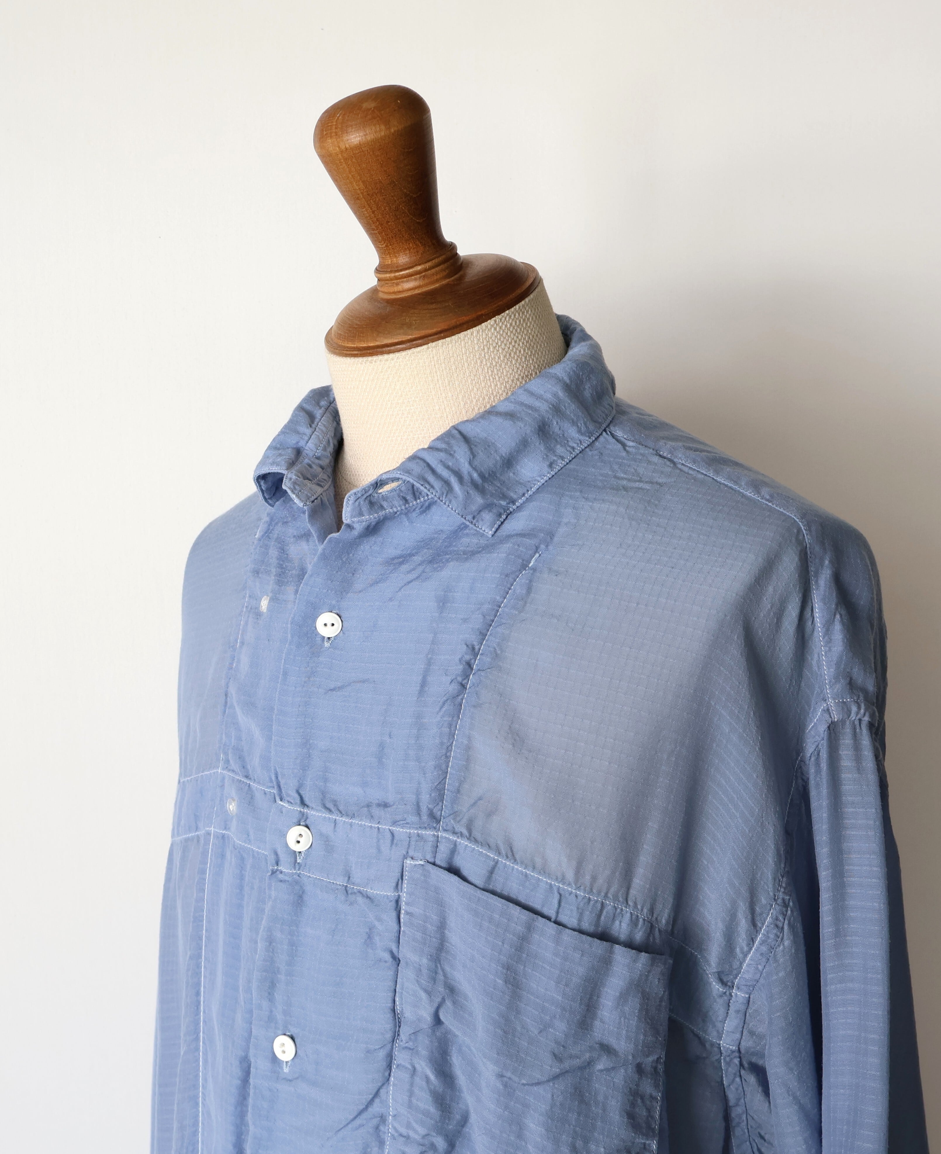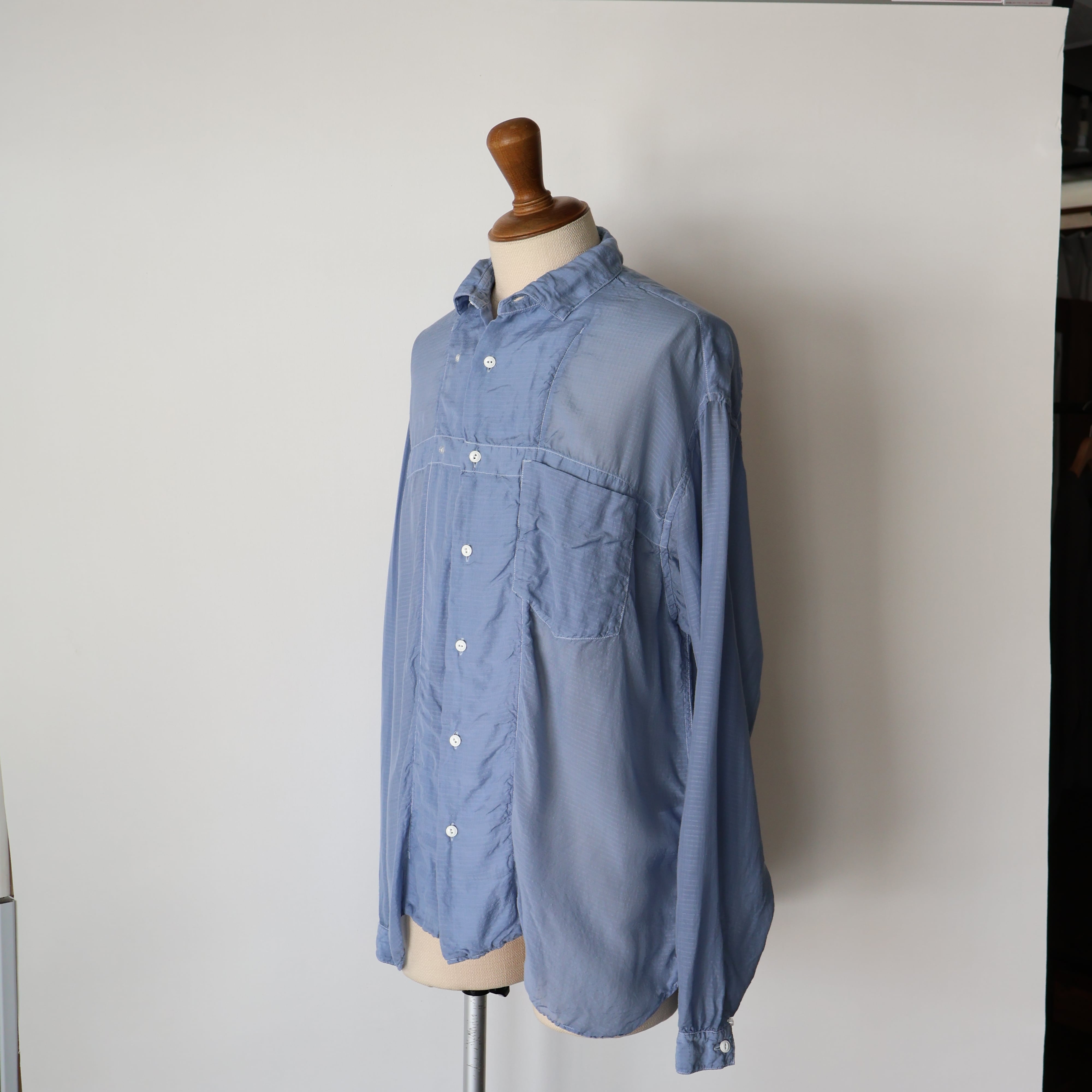 素材には、桐生の機屋で織り上げられた細番手のキュプラリップストップを採用。キュプラは、コットンリンターと呼ばれる綿花の種の周りのうぶ毛から作られる再生繊維で、吸湿性・通気性に優れ、日本でしか織ることができない希少な生地です。洗い加工を加えることで、光沢が程よく抑えられ、自然なシワ感とやわらかな落ち感が生まれ、リラックスした着心地に。透け感のある軽さを持ちながらも、リップストップならではのミリタリー的な無骨さを併せ持つ、相反する要素の調和が魅力の一着です。