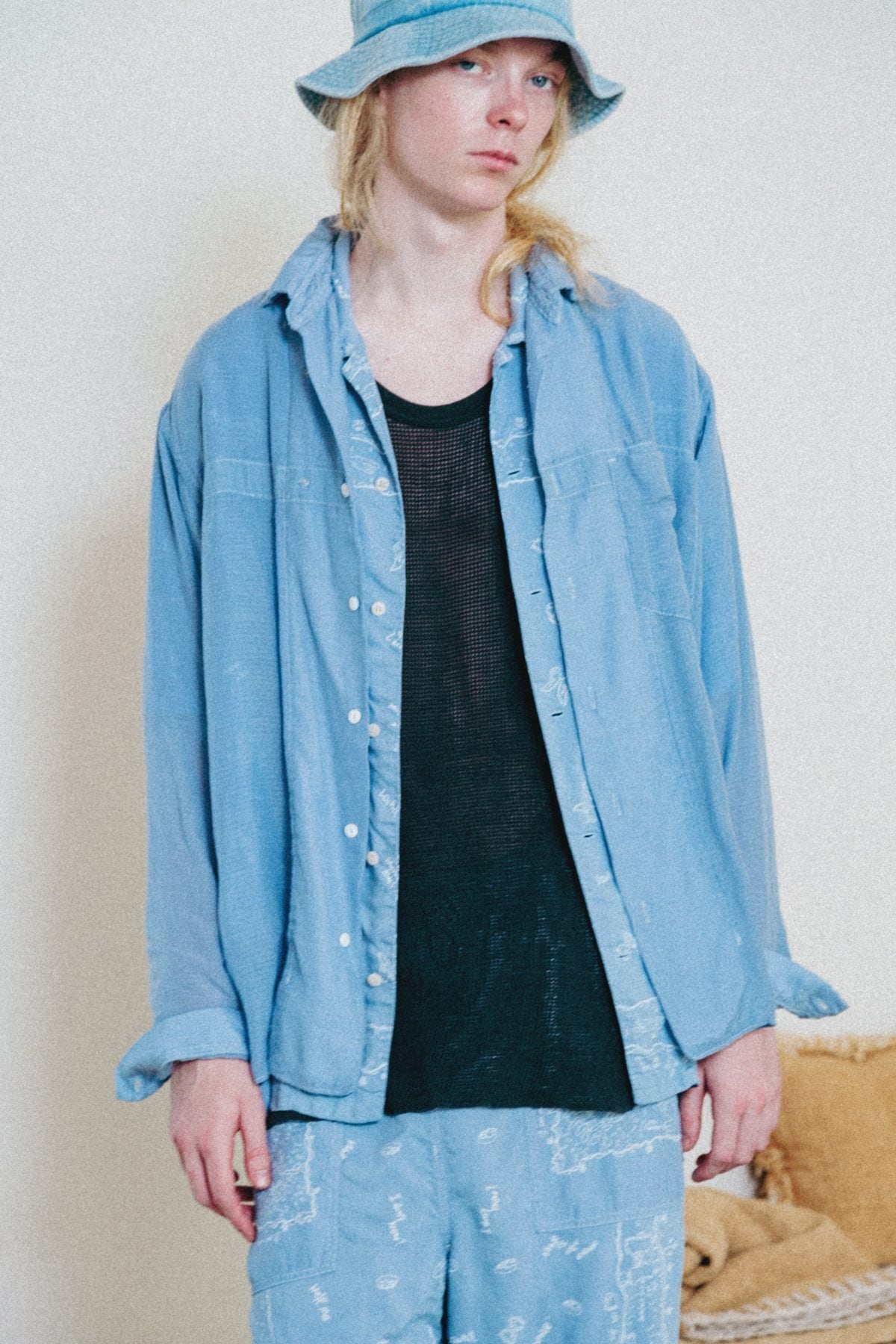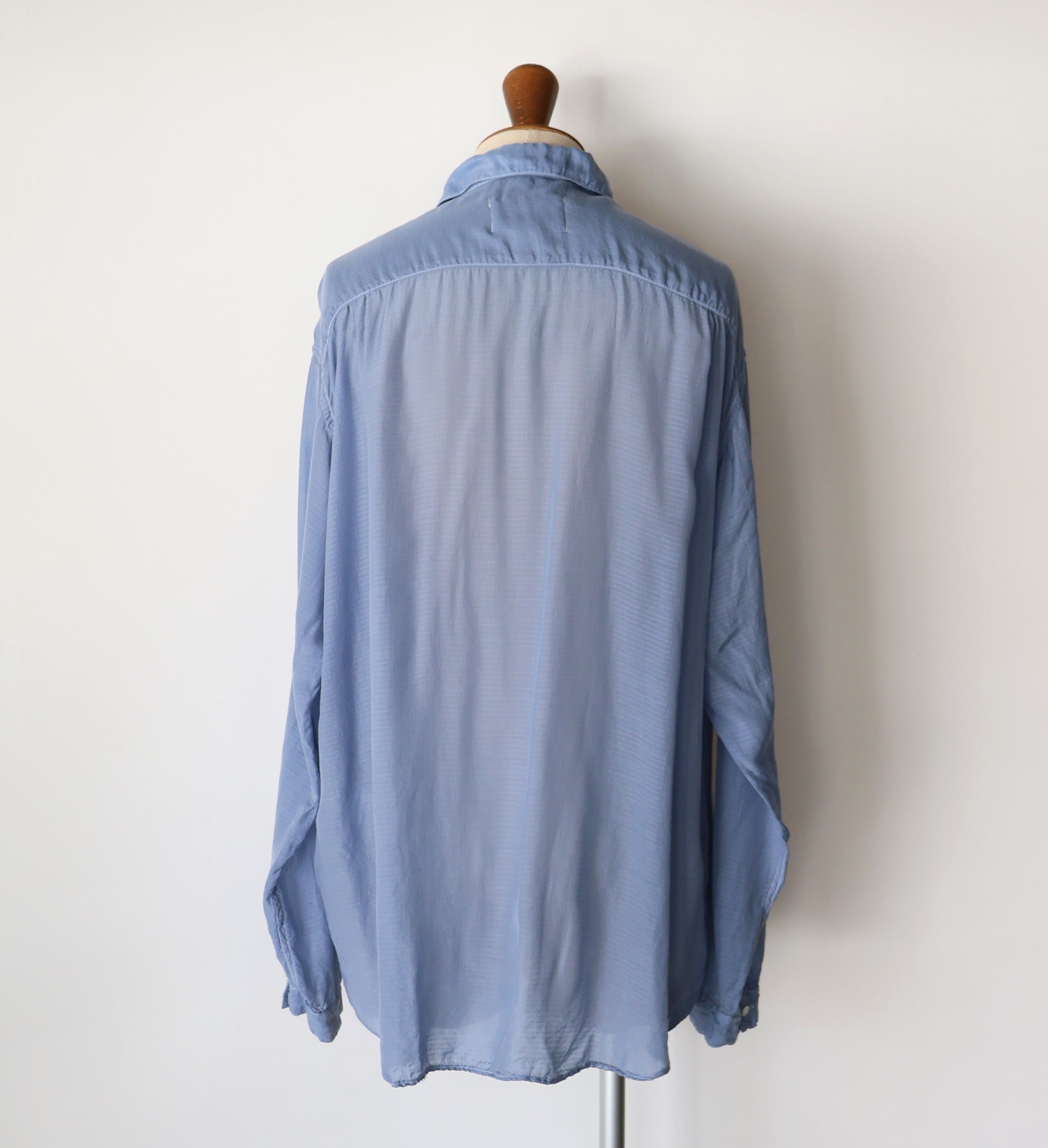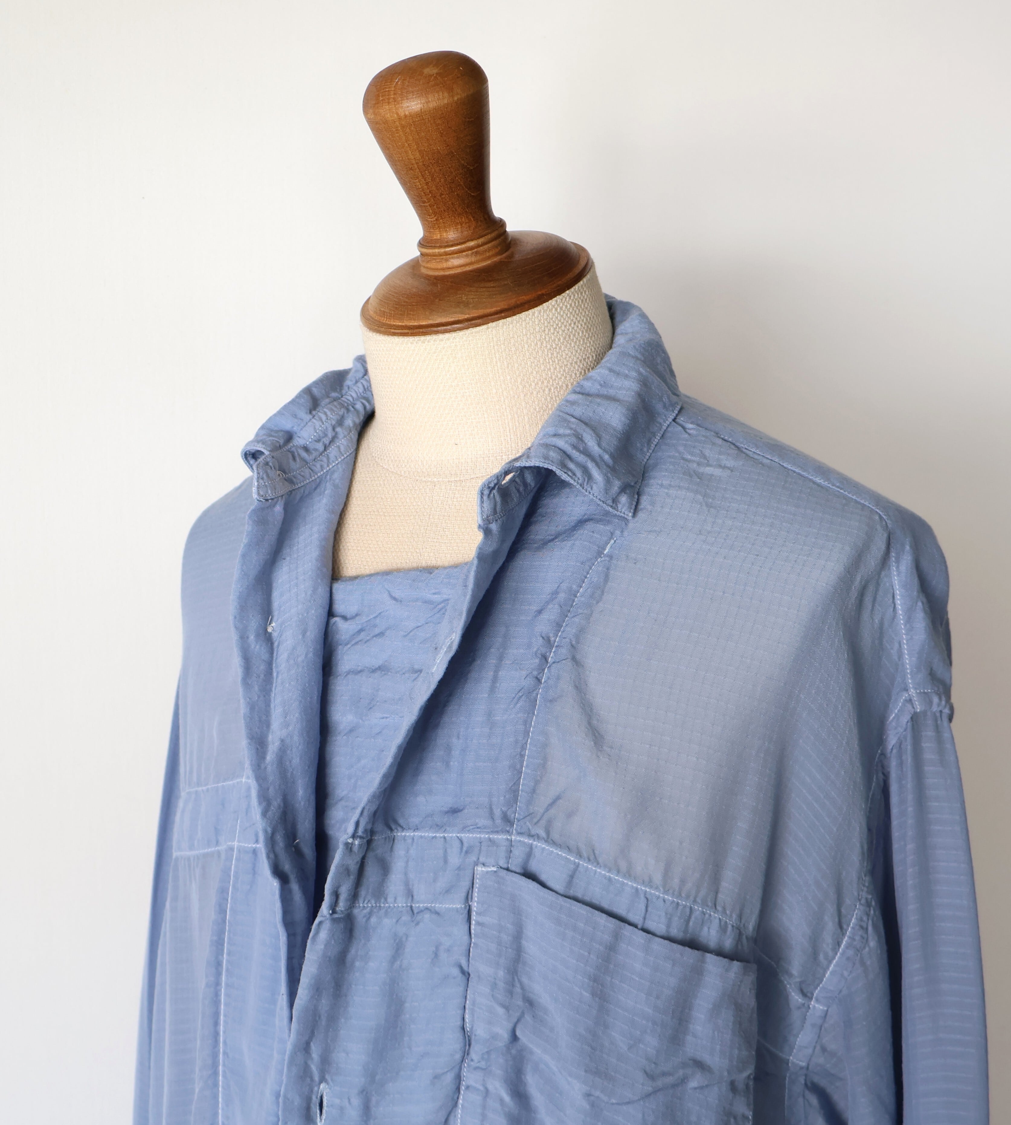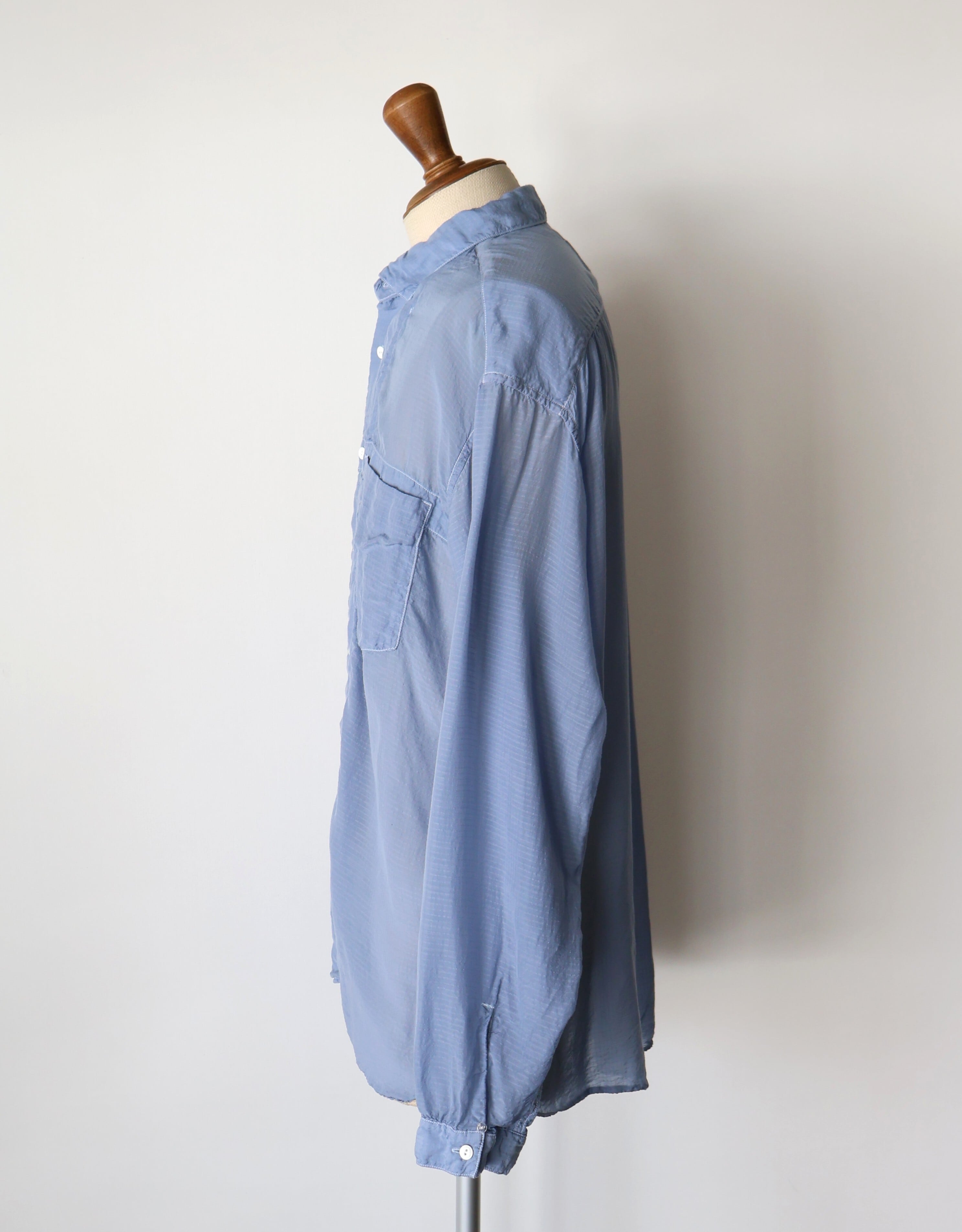 素材には、桐生の機屋で織り上げられた細番手のキュプラリップストップを採用。キュプラは、コットンリンターと呼ばれる綿花の種の周りのうぶ毛から作られる再生繊維で、吸湿性・通気性に優れ、日本でしか織ることができない希少な生地です。洗い加工を加えることで、光沢が程よく抑えられ、自然なシワ感とやわらかな落ち感が生まれ、リラックスした着心地に。透け感のある軽さを持ちながらも、リップストップならではのミリタリー的な無骨さを併せ持つ、相反する要素の調和が魅力の一着です。