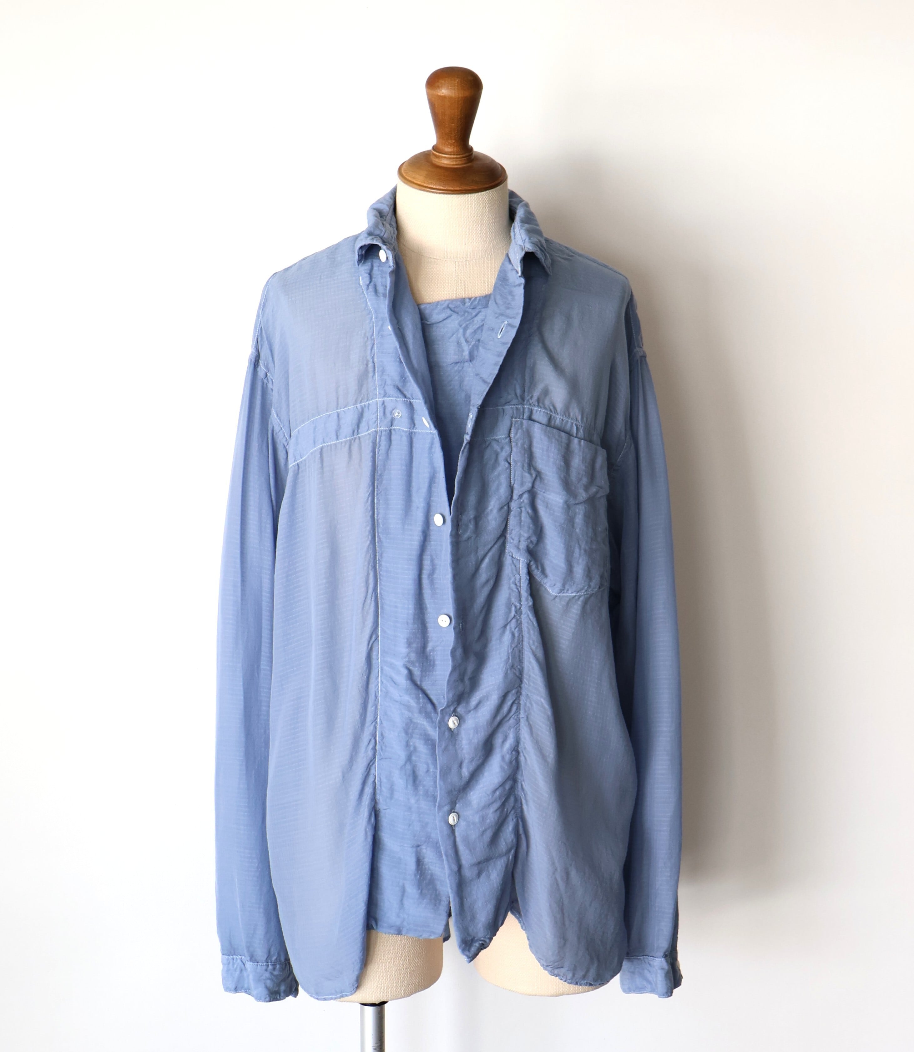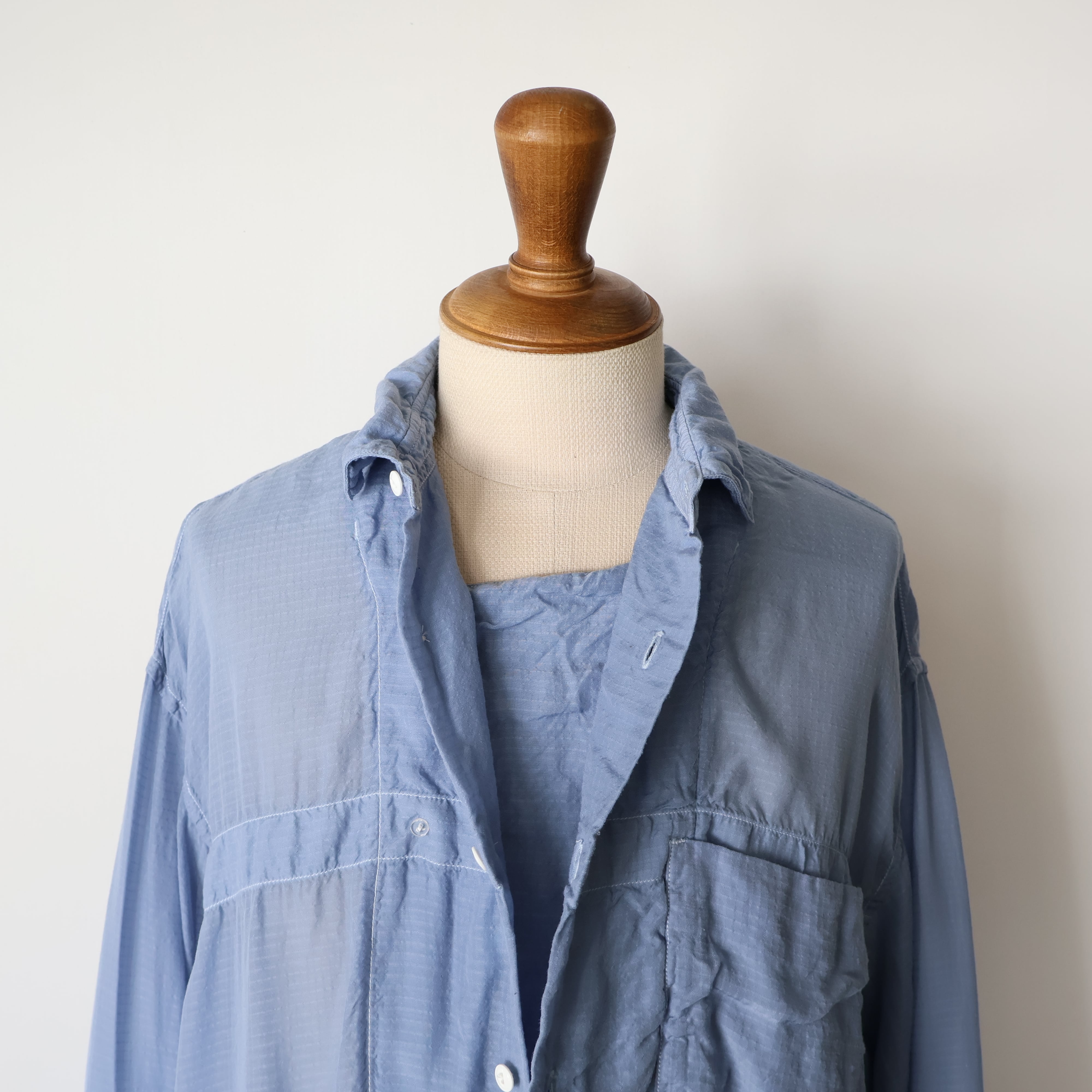 衿端、カフス端、前立て、ポケット口などはすべて表裏続きの輪取り仕様で仕立てられ、あえてステッチを排したミニマルで軽やかな印象に仕上げています。一方で、前立て裏の見返しには抑えステッチ、胸ポケットには補強テープを叩きつけたステッチワークを施すことで、製品染め後に美しいパッカリングが生まれるよう、細部にわたり緻密に設計されています。