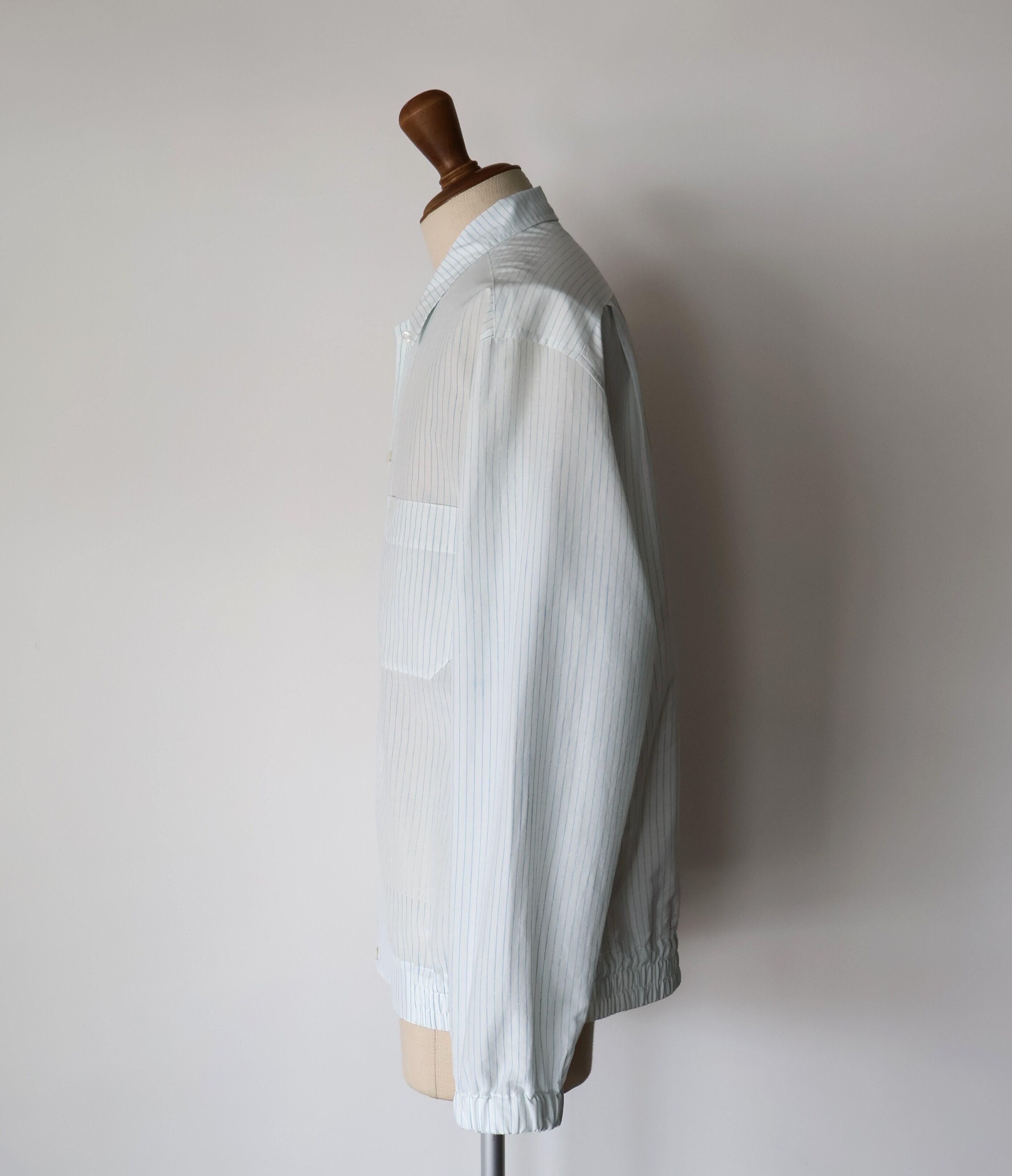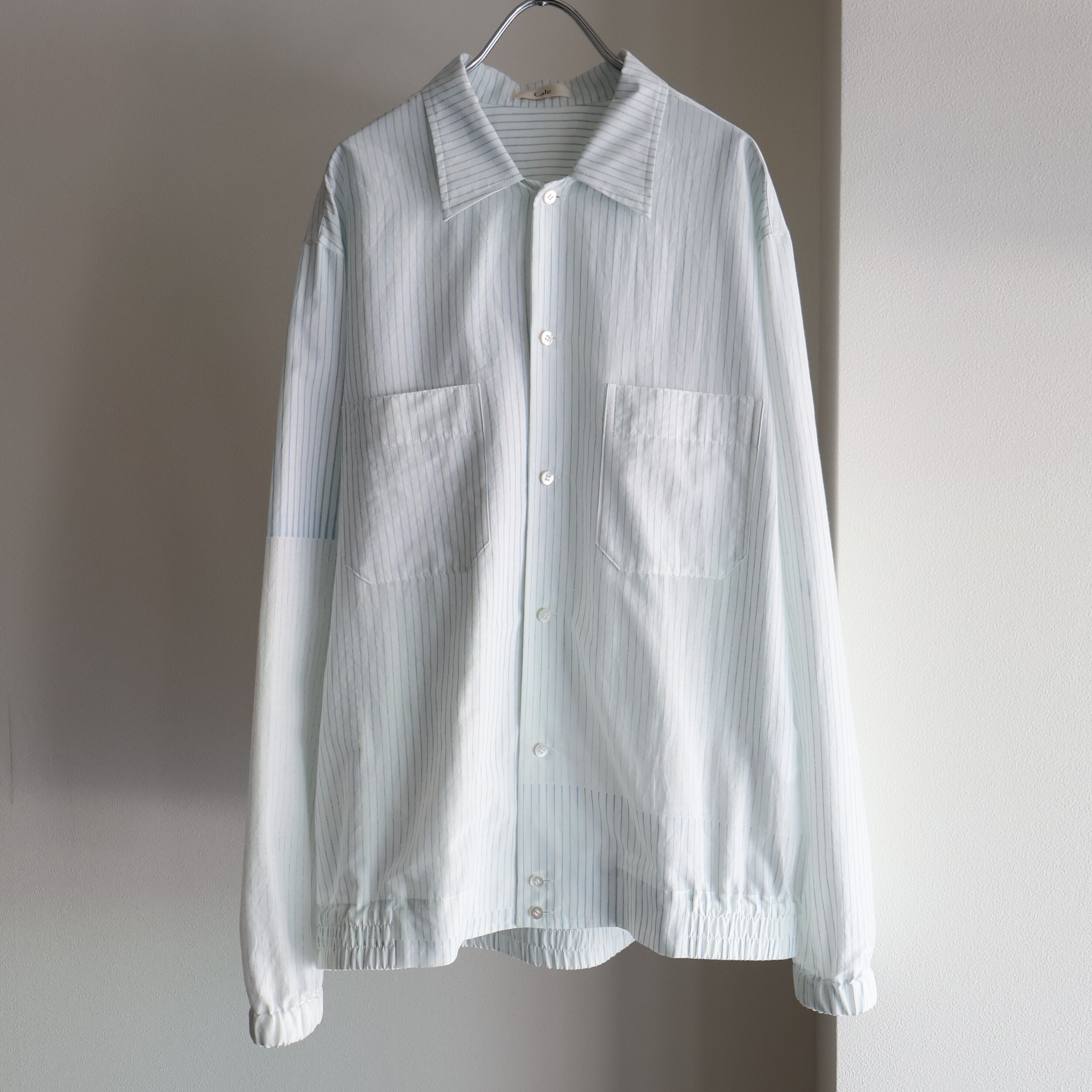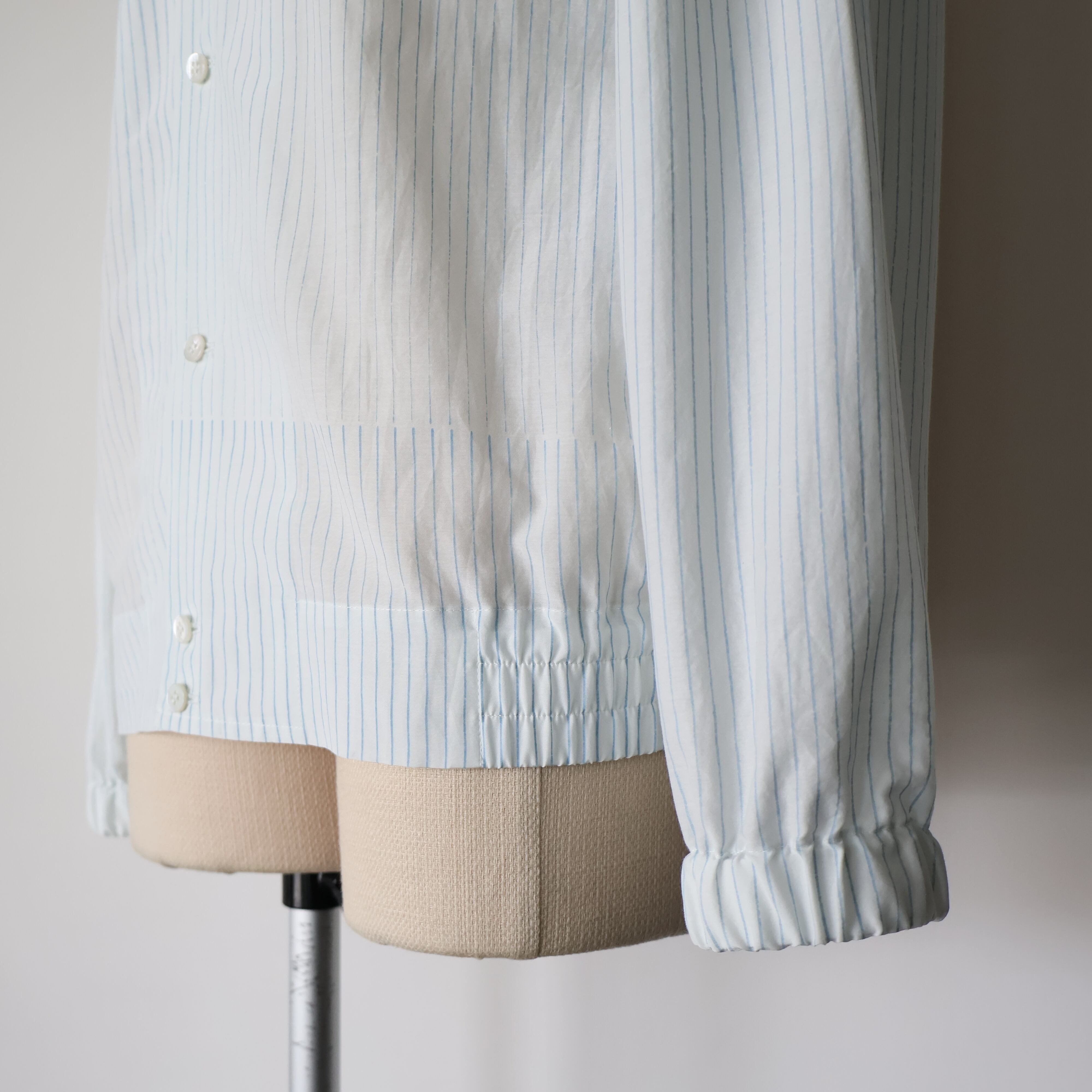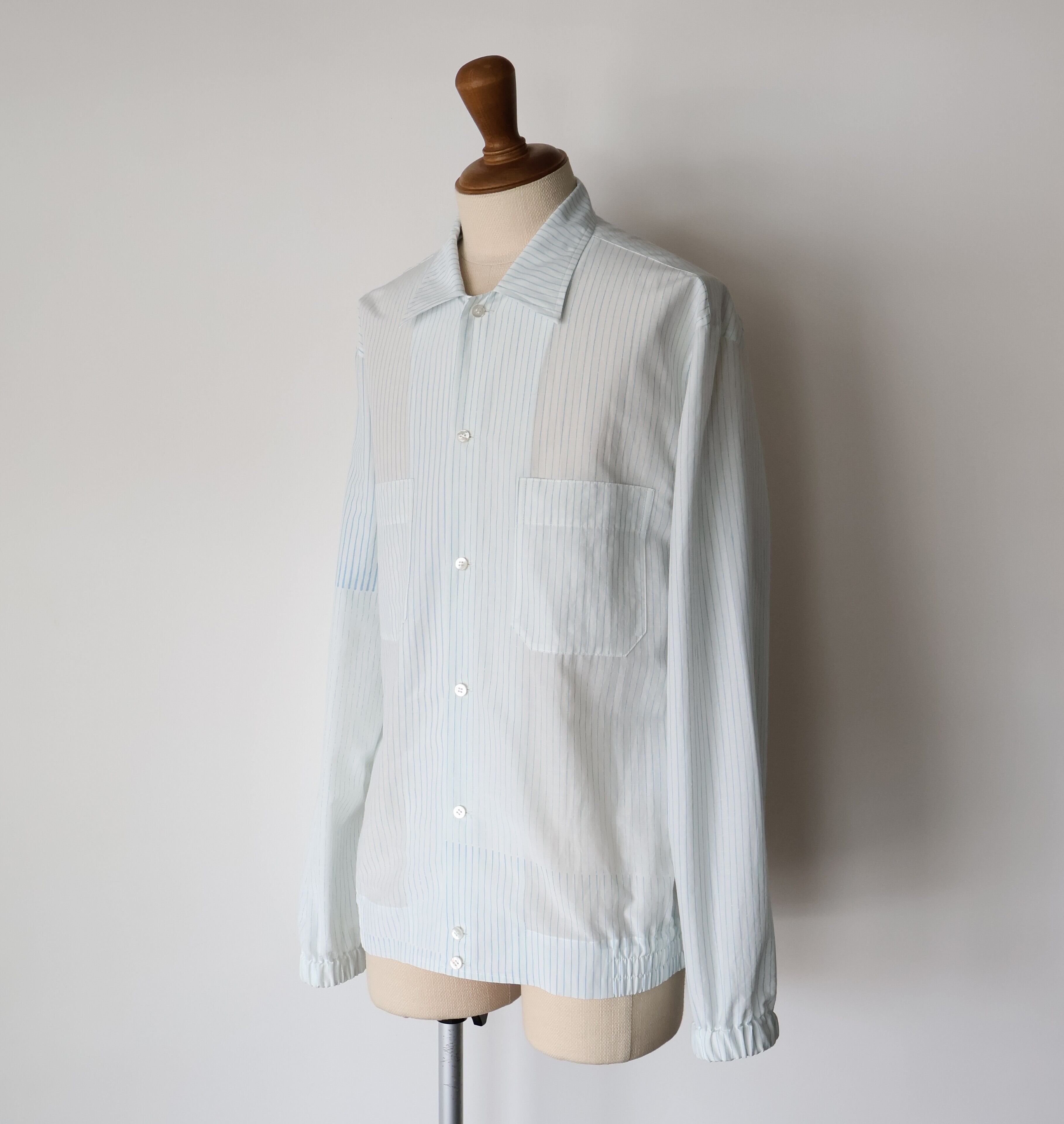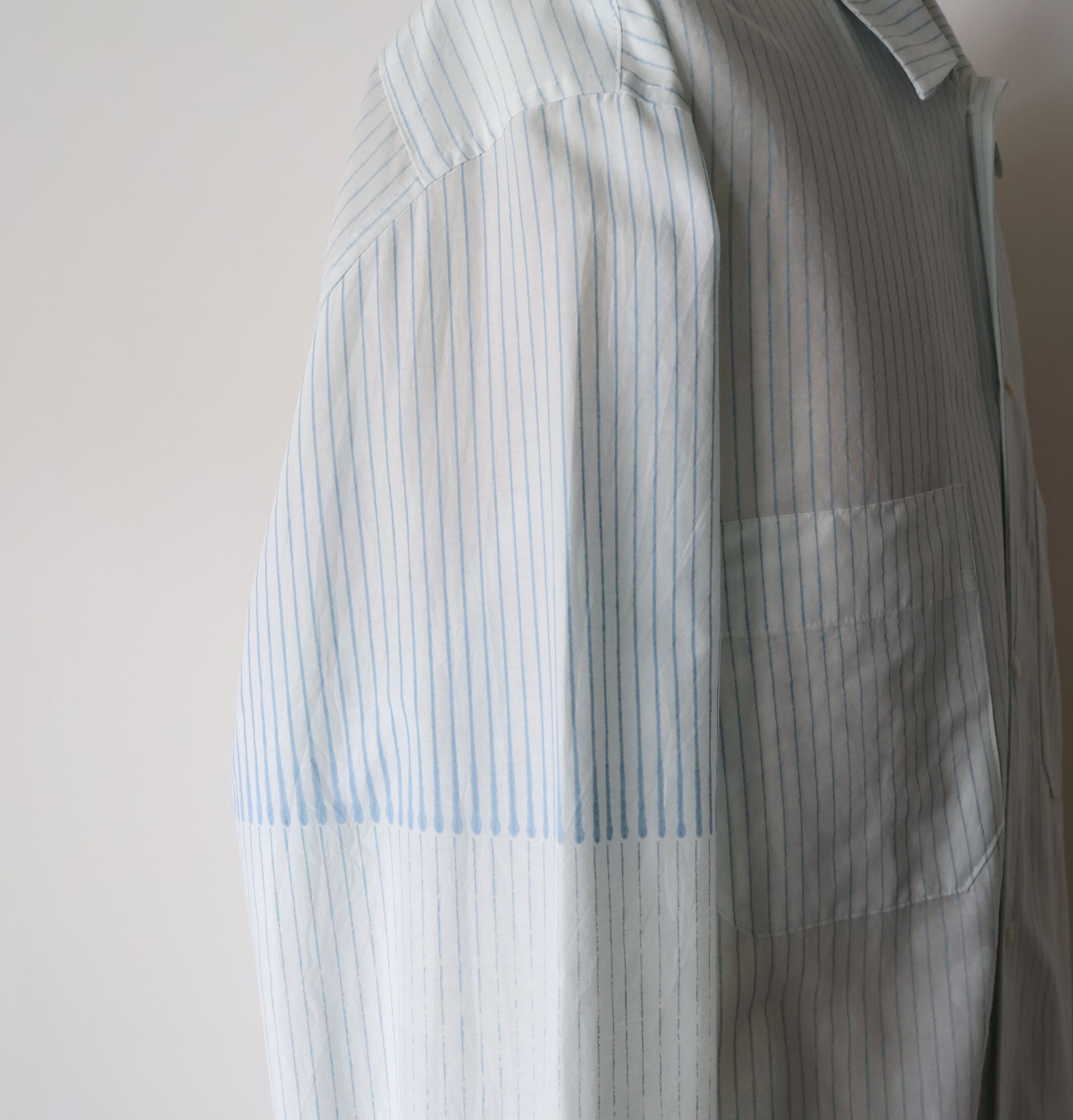 白色のシルクコットン生地に石灰から作られる糊を塗り固めた後に染め上げる“防染”という技術を施し、染色後に石灰糊を落とすことで糊付けされていなかった箇所が綺麗に染められ、不均一な太さ・染色度合となったペンシルストライプに仕上がっています。