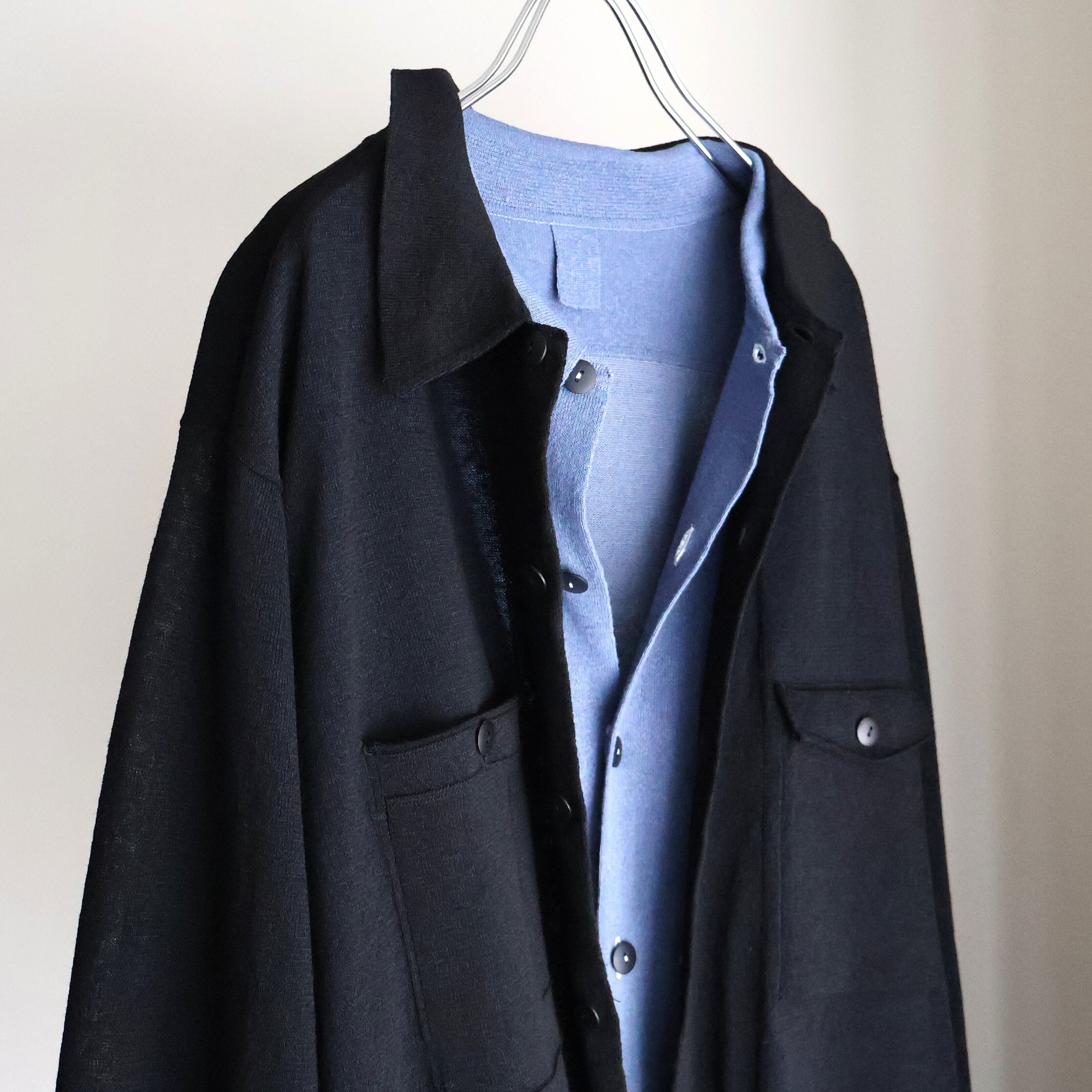 表をリネン混、裏を極細の綿をプレーティングして編み⽴て、⾊味を若⼲変えることによって裏の⾊味が表に透け、ニットならではの⼿法で⽣地の緯⽷と縦⽷の折りの雰囲気を表現しました。