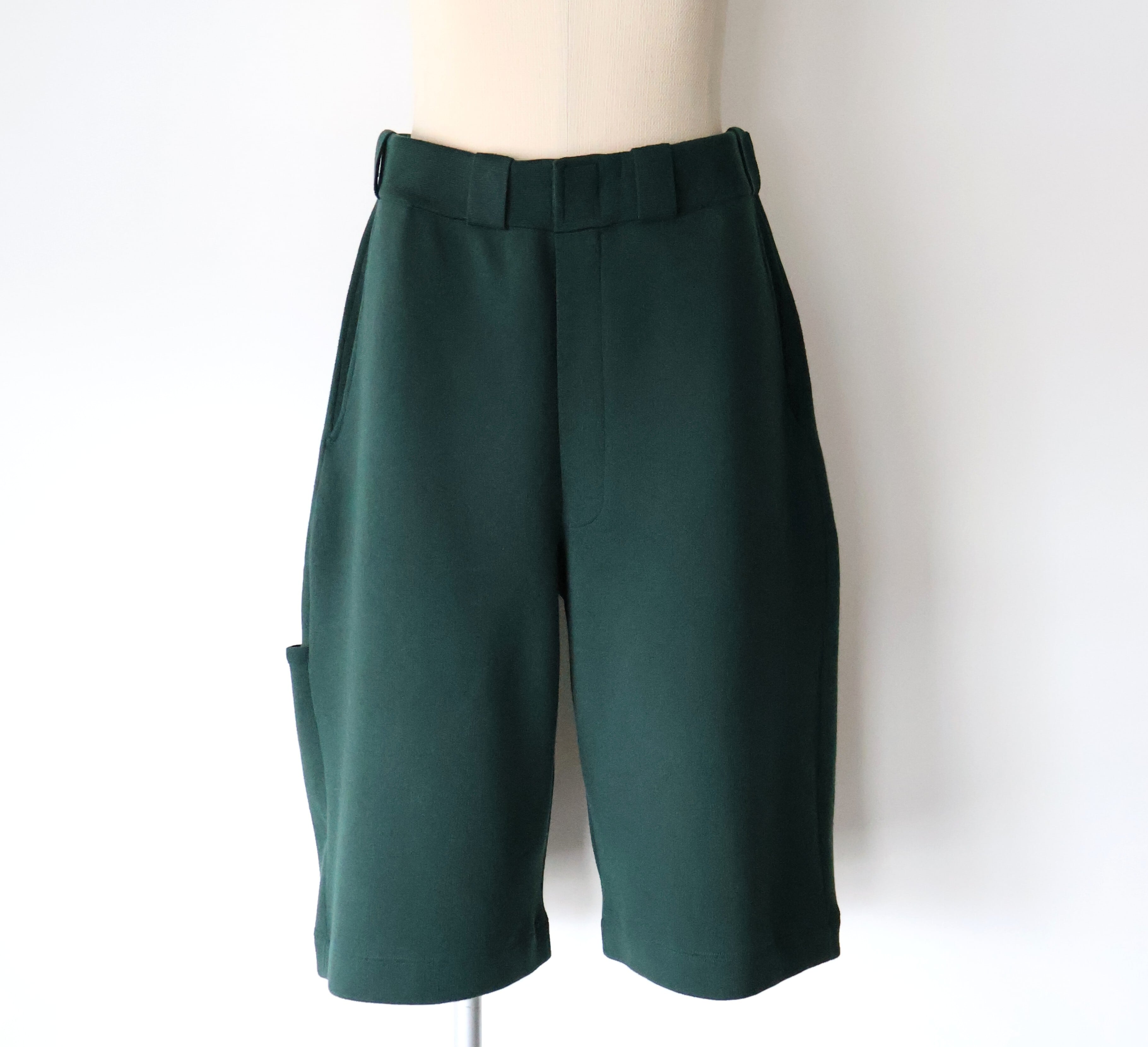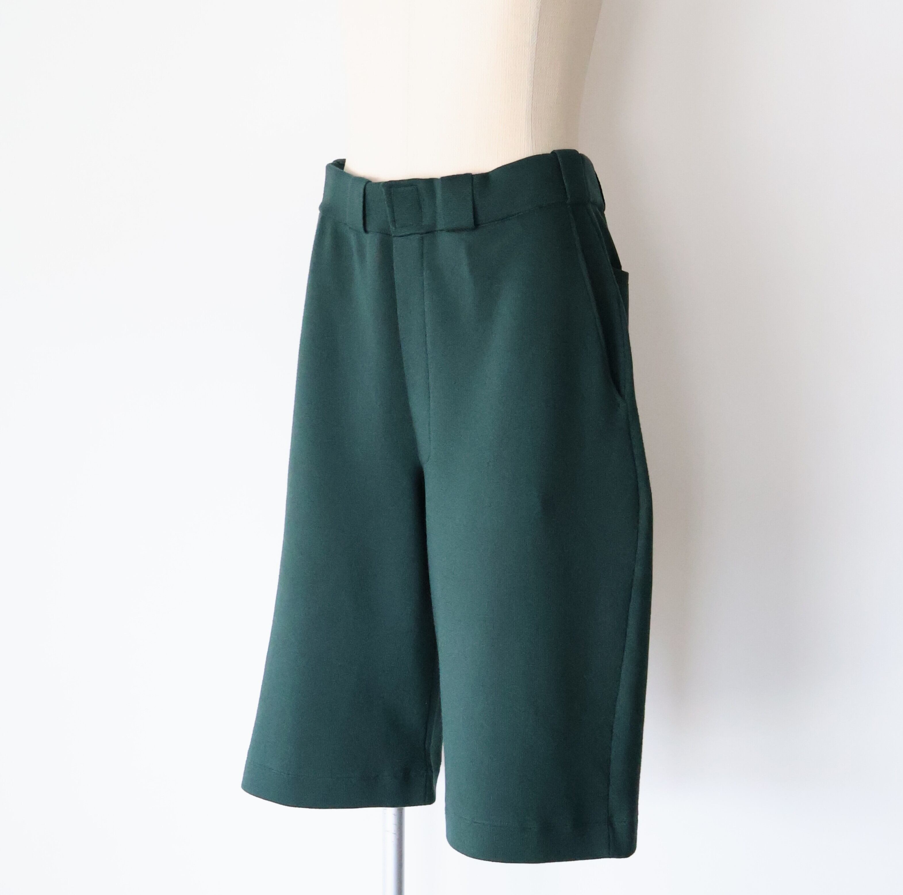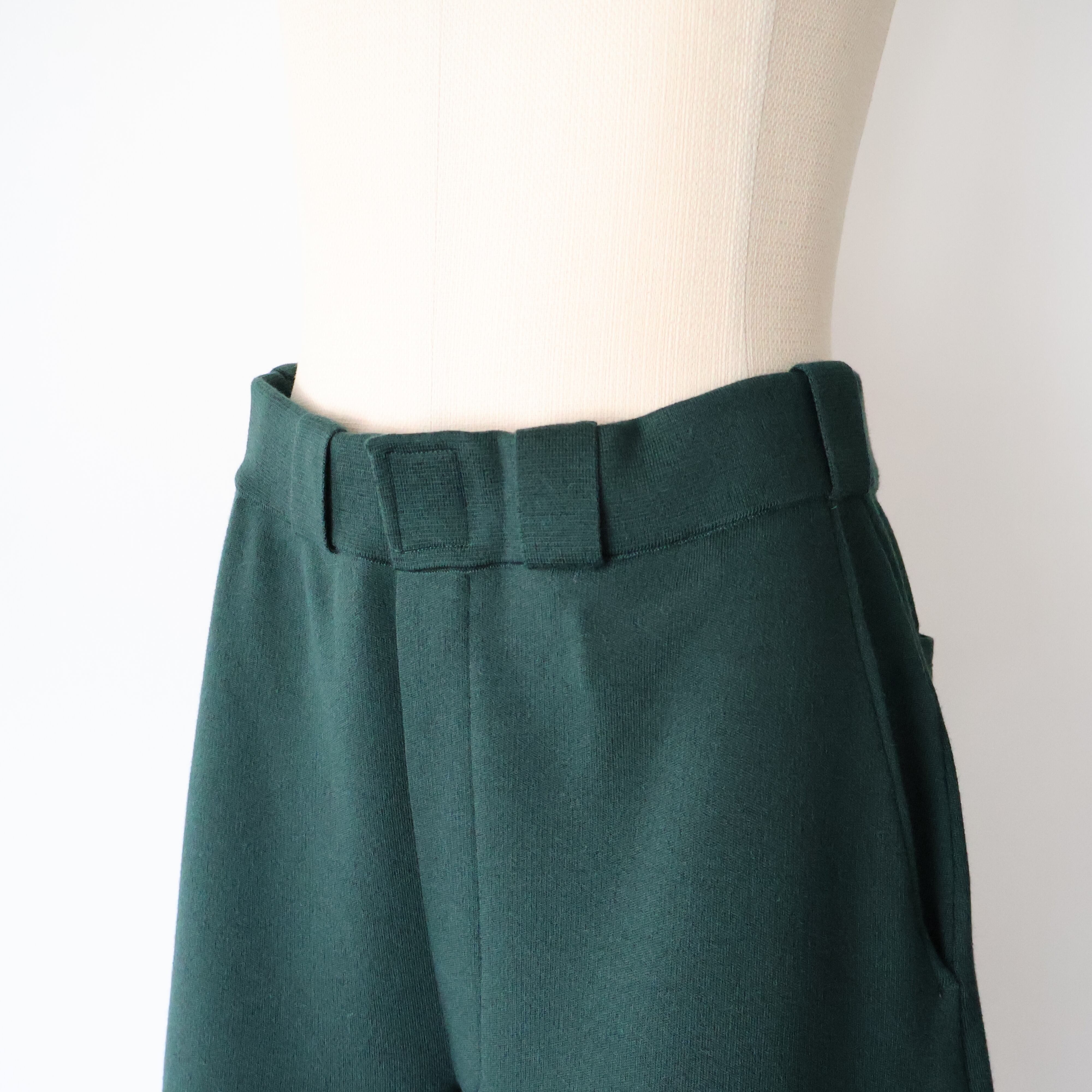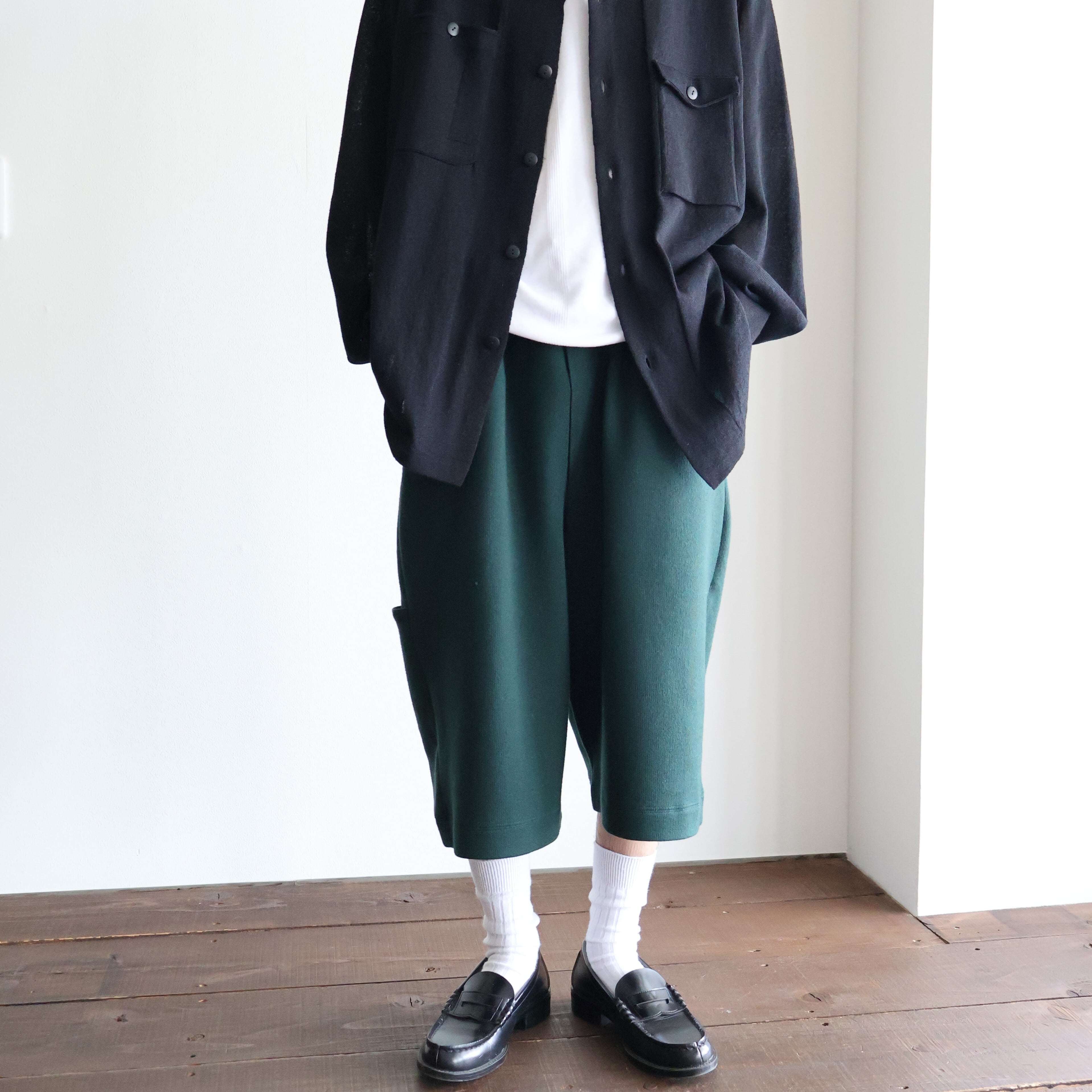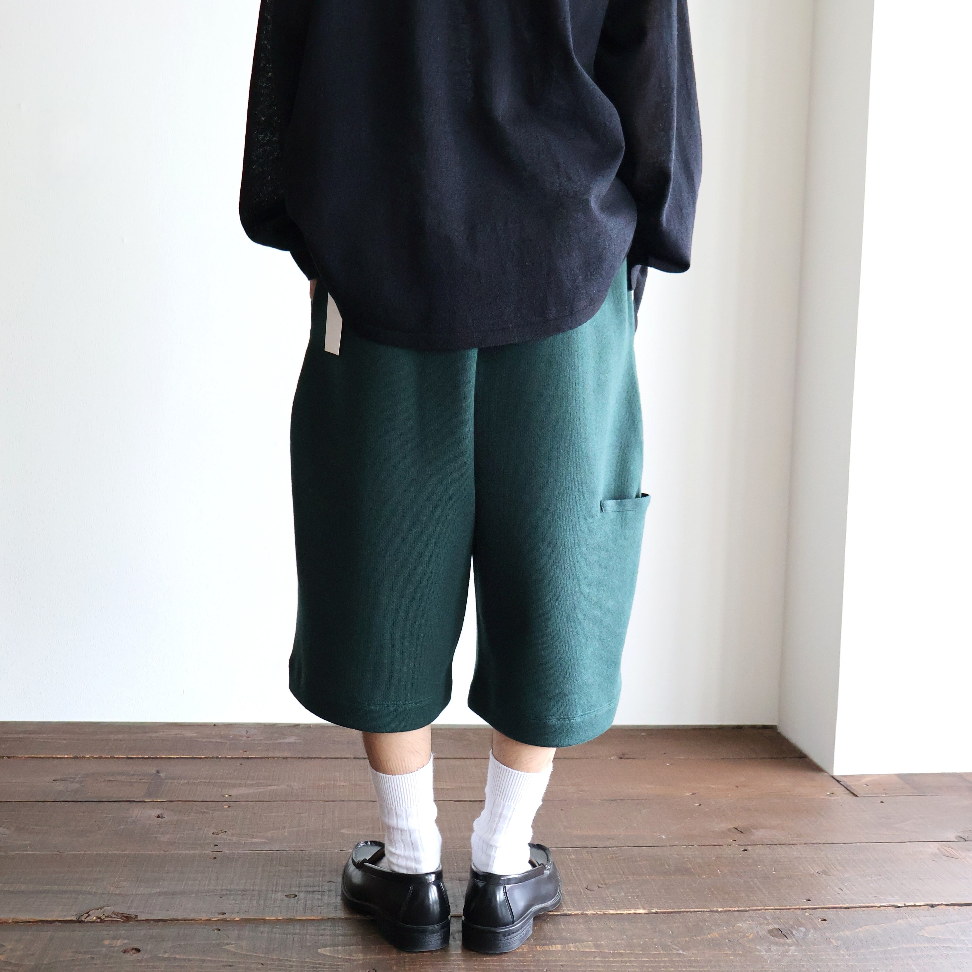 アイコンとも⾔える太めのベルトループはミラノリブで伸びないようにしっかりと編み⽴てました。ウエストに平ゴムと紐が通っているので着脱しやすくなっております。