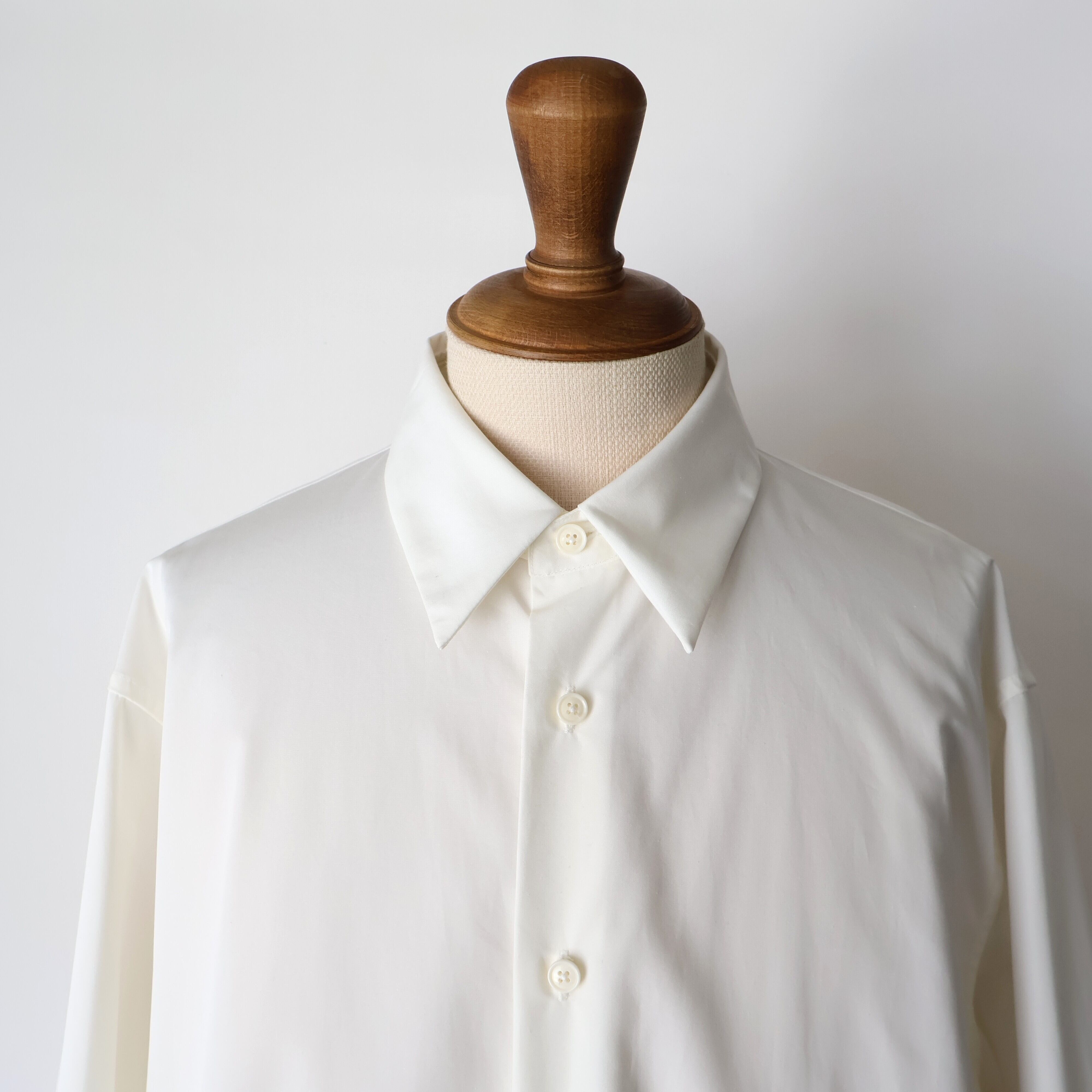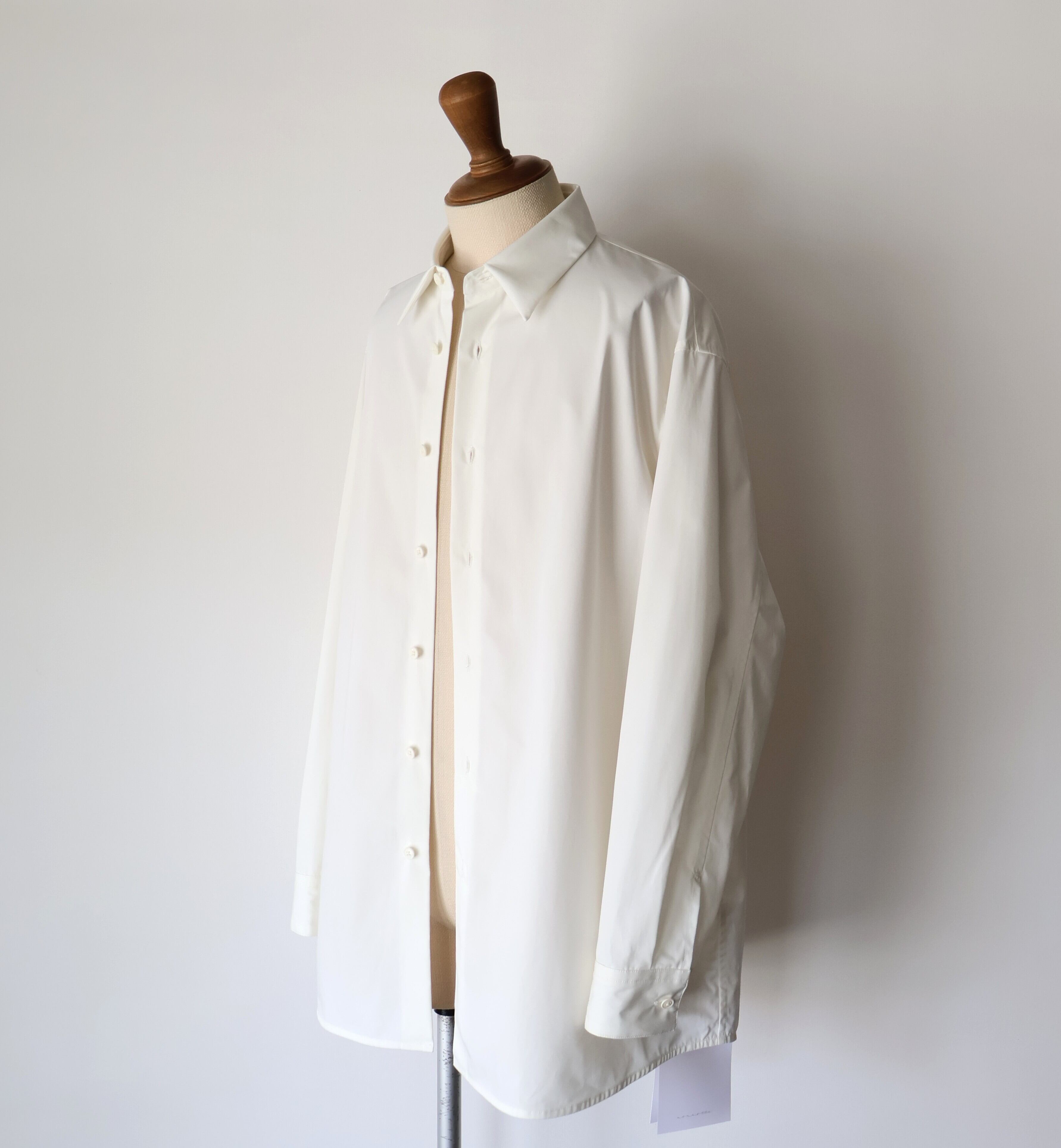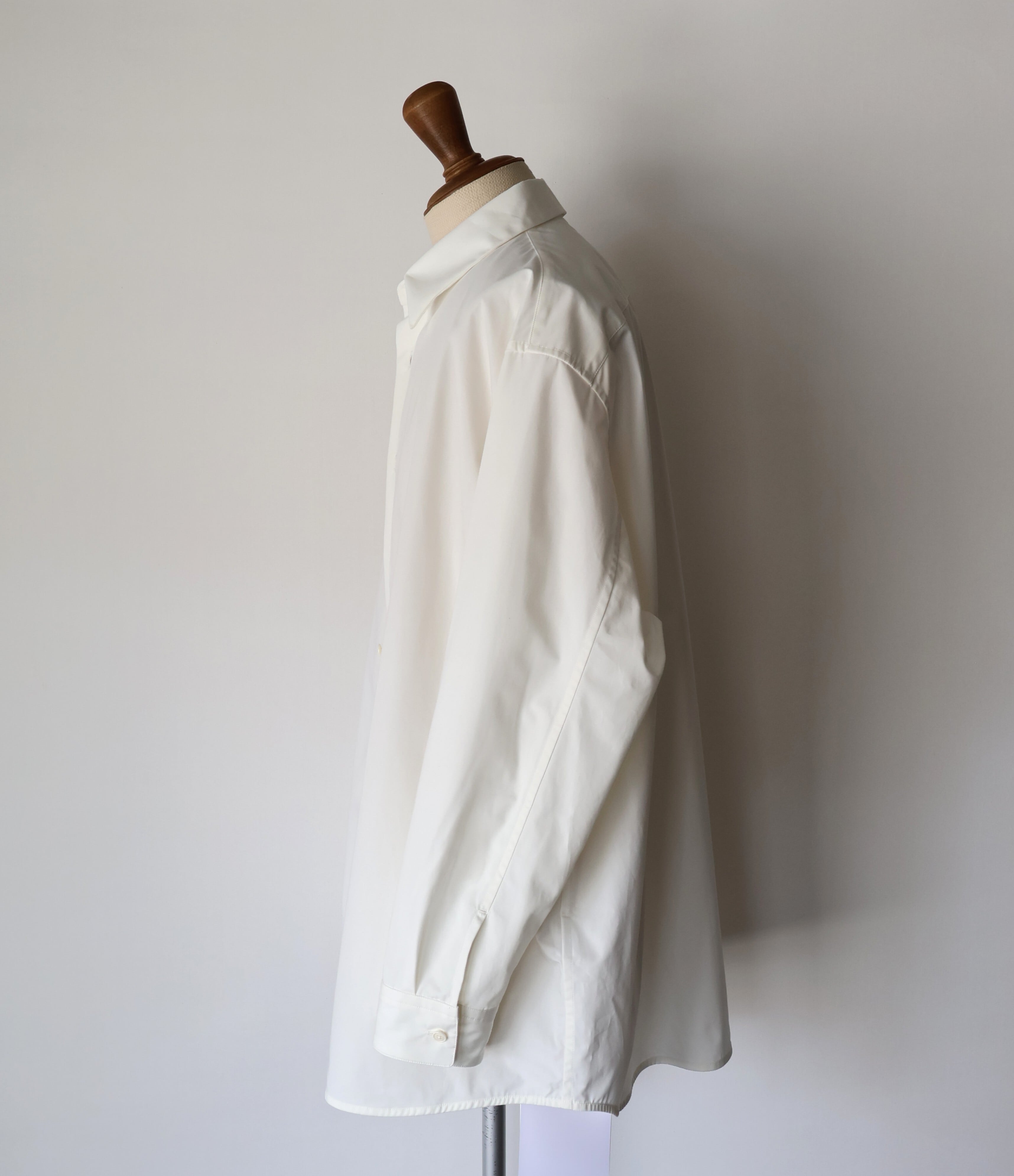 裾は緩やかなラウンドにし、前後差をつけることで動きの中に陰影が生まれ、着丈のバランスも現代的に調整しました。 たっぷりとしたオーバーサイズの中に、ヘビーブロードの張り感としなやかなドレープが共存し、どの角度から見ても絵になるシルエットに。