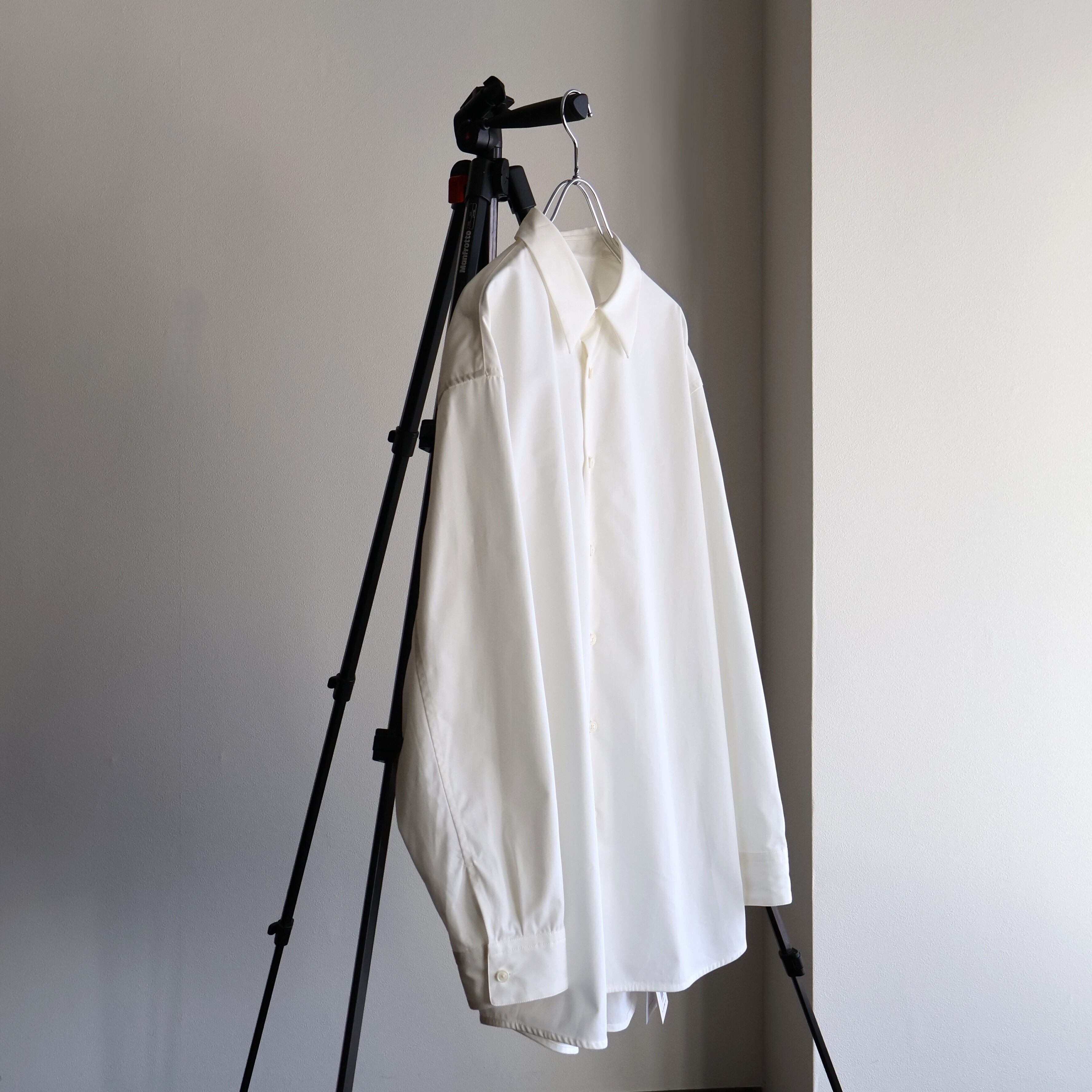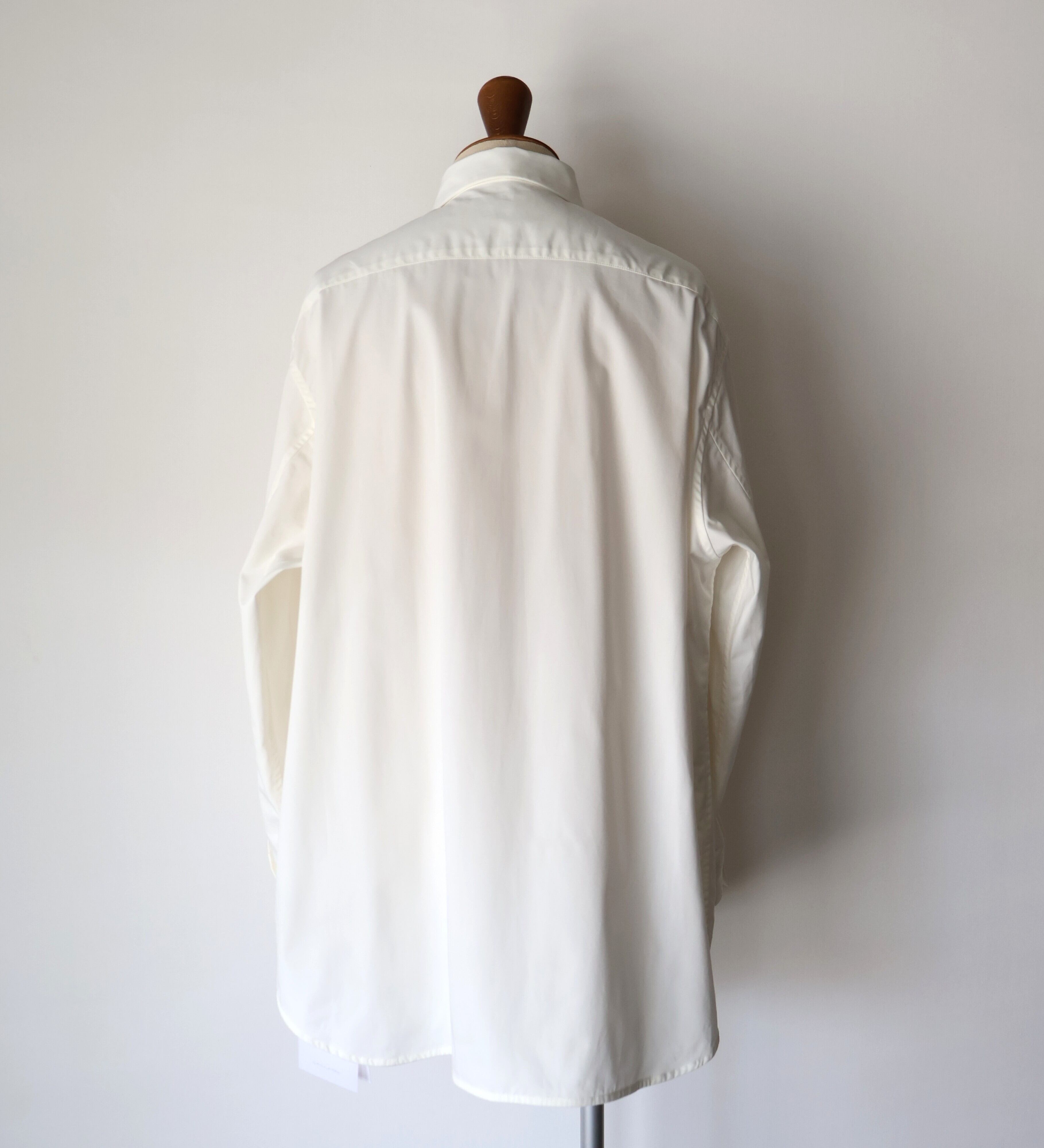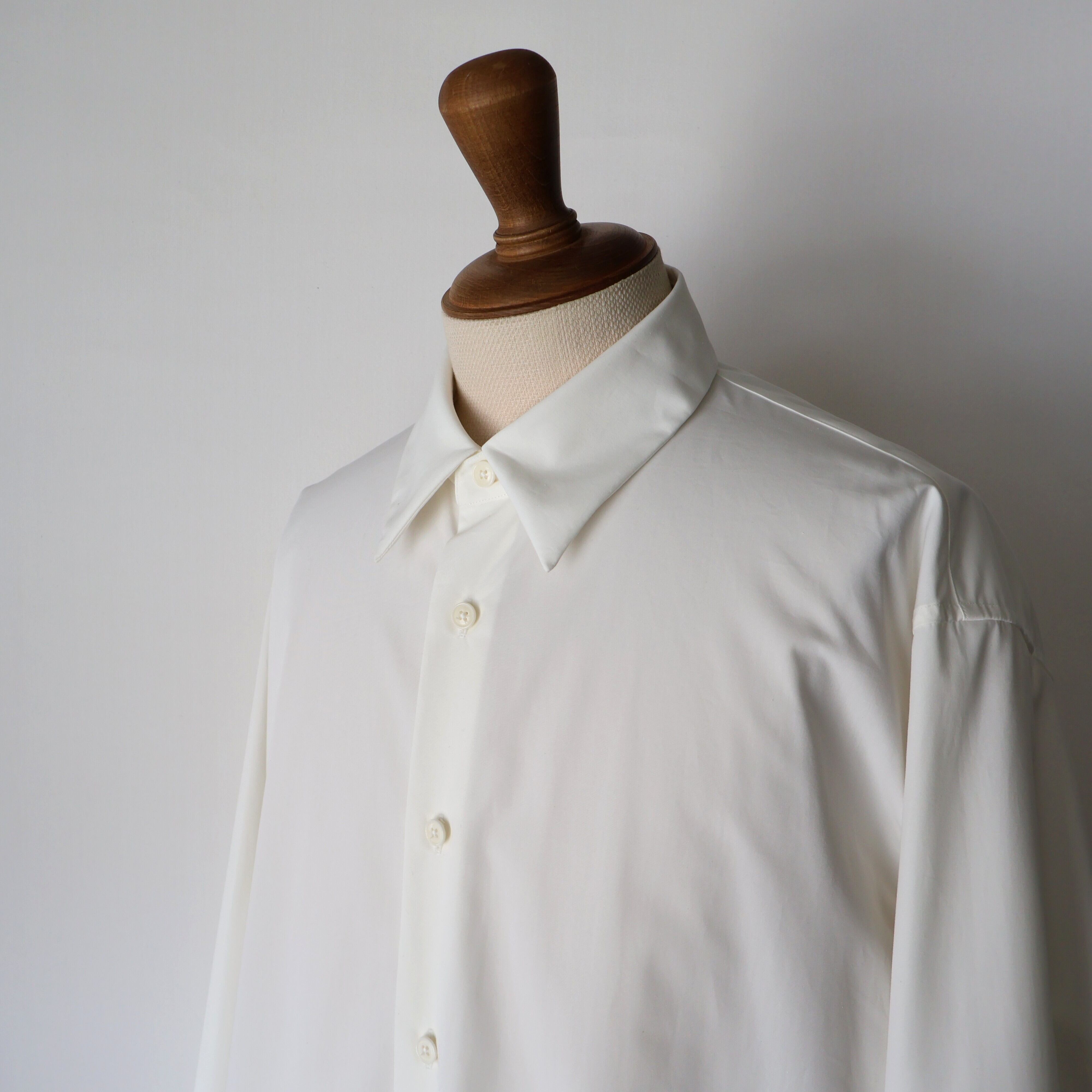 裾は緩やかなラウンドにし、前後差をつけることで動きの中に陰影が生まれ、着丈のバランスも現代的に調整しました。 たっぷりとしたオーバーサイズの中に、ヘビーブロードの張り感としなやかなドレープが共存し、どの角度から見ても絵になるシルエットに。