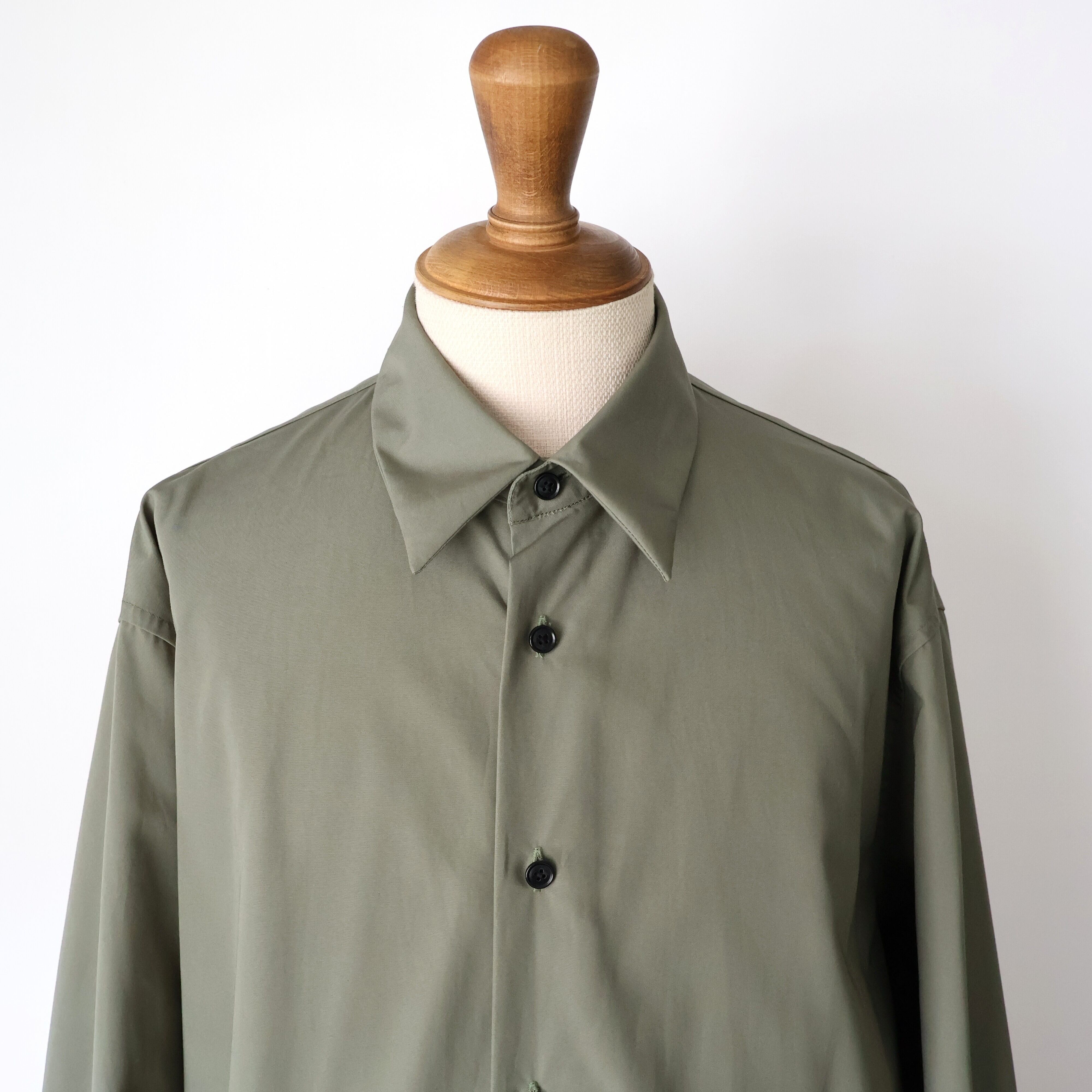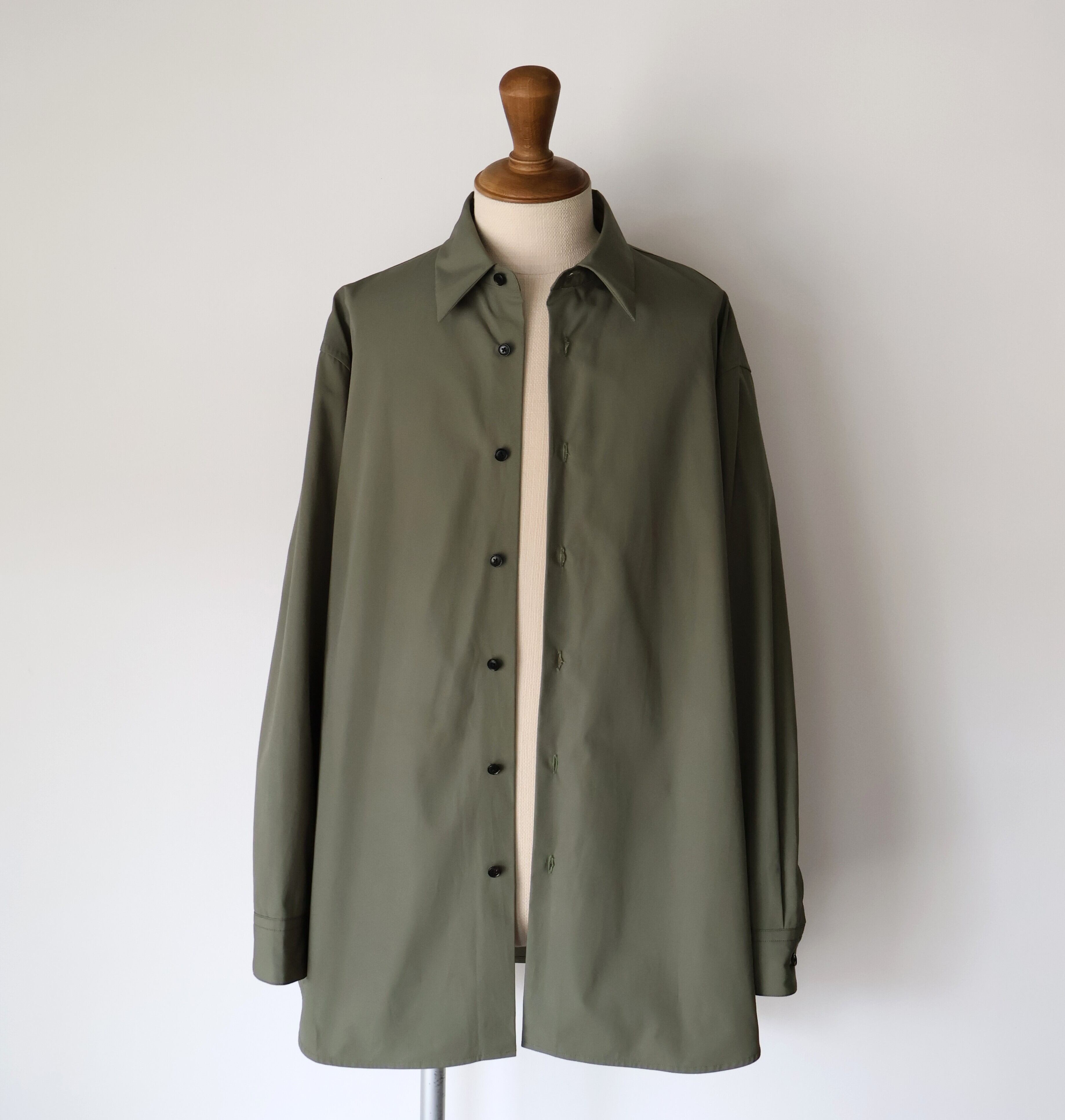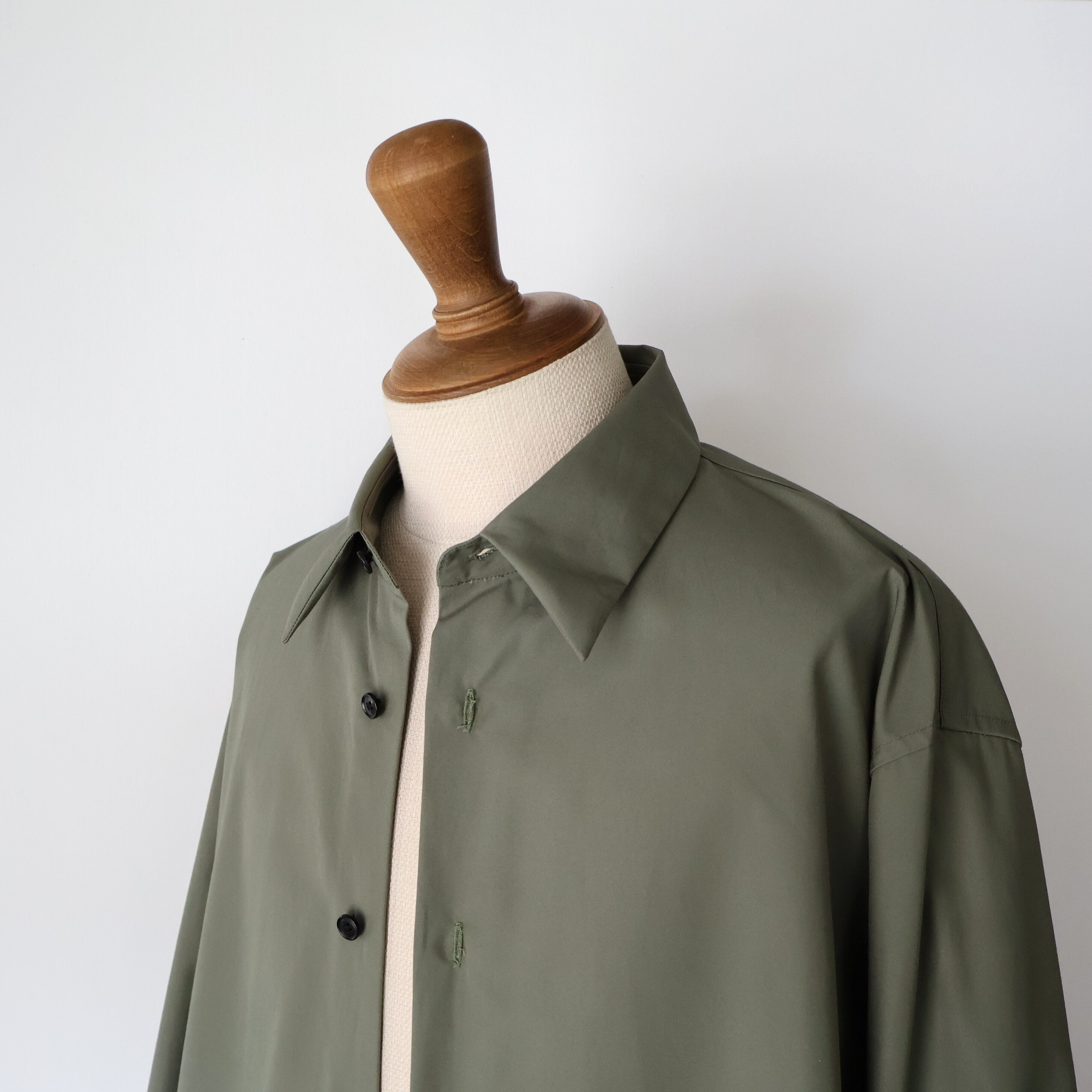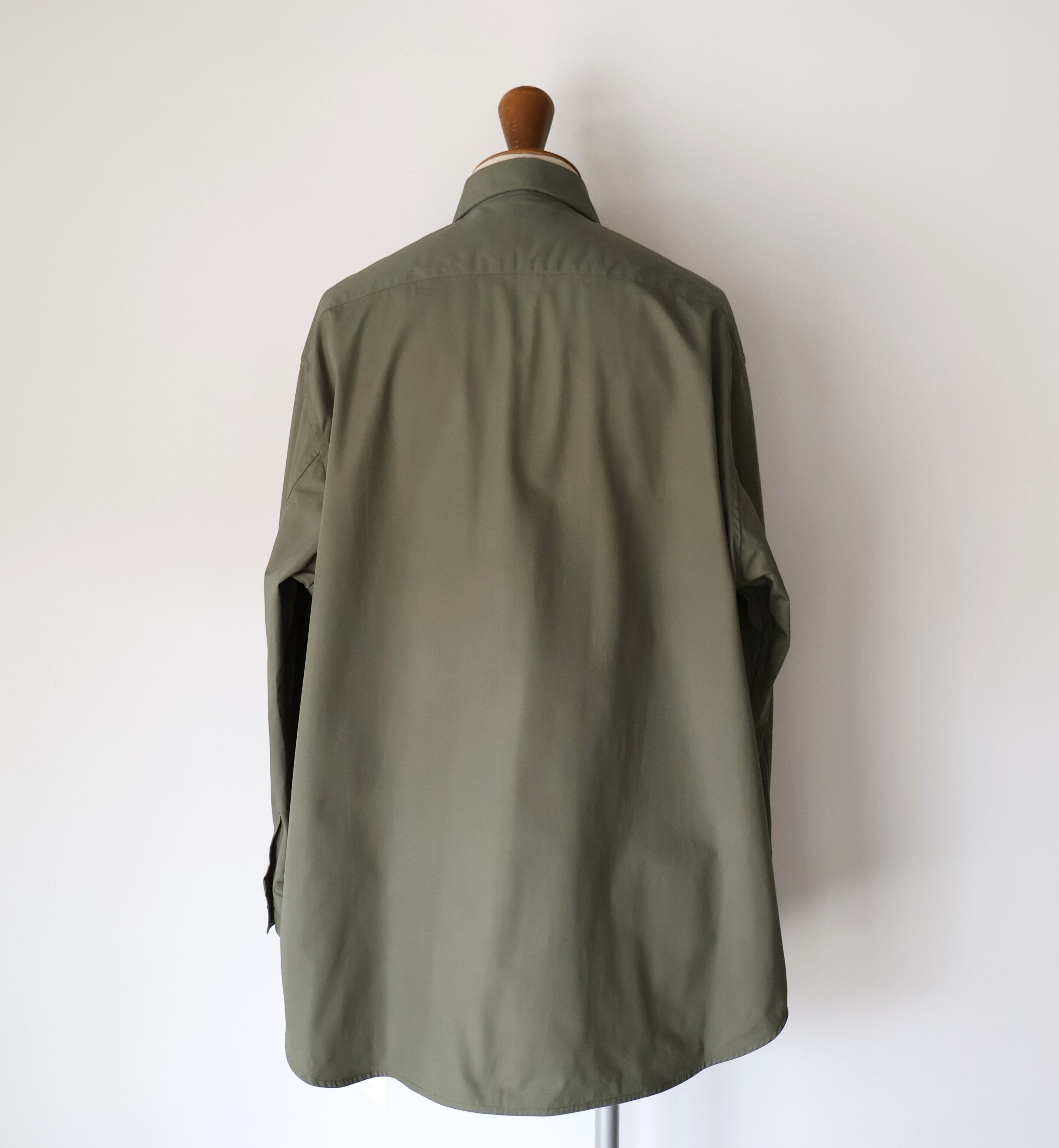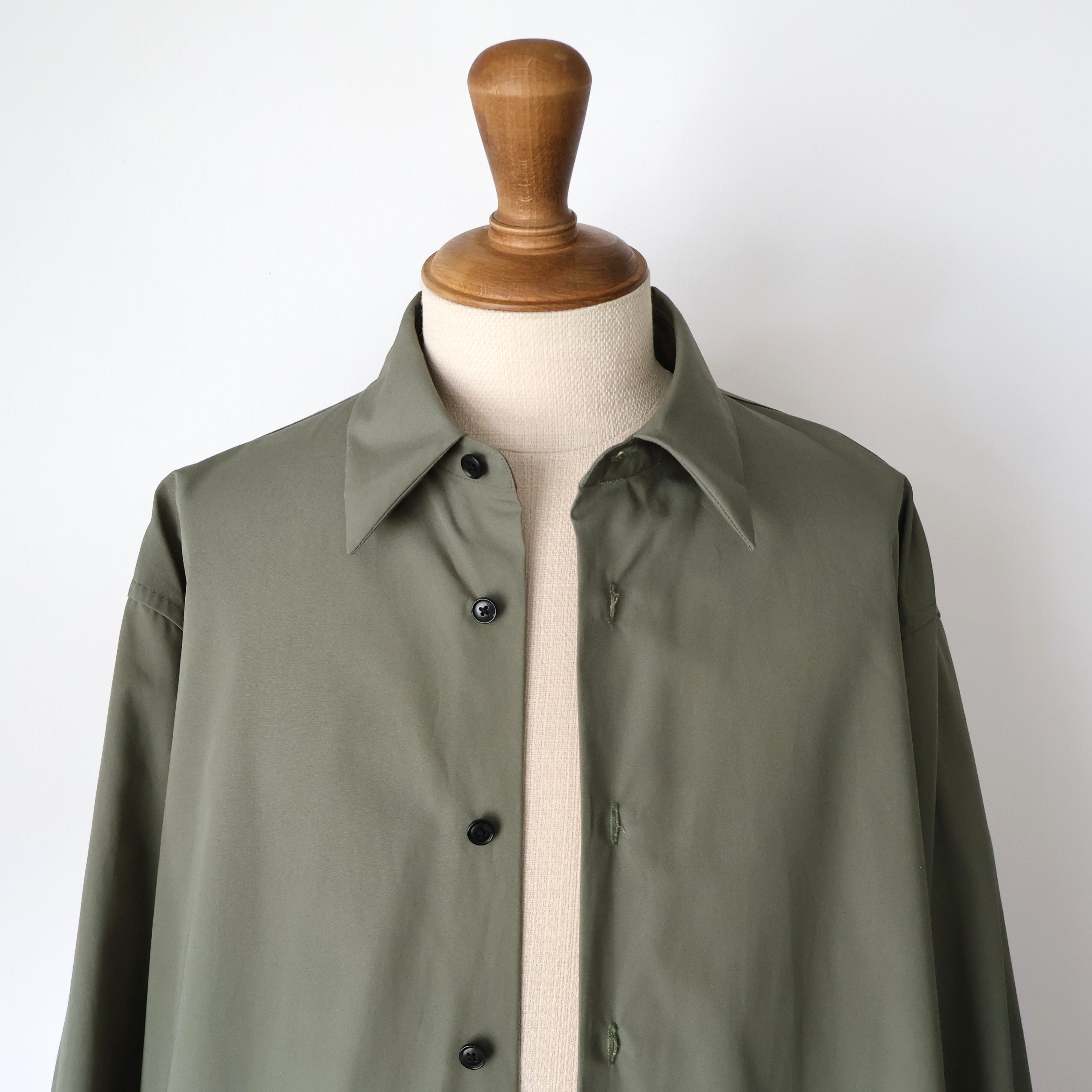 裾は緩やかなラウンドにし、前後差をつけることで動きの中に陰影が生まれ、着丈のバランスも現代的に調整しました。 たっぷりとしたオーバーサイズの中に、ヘビーブロードの張り感としなやかなドレープが共存し、どの角度から見ても絵になるシルエットに。