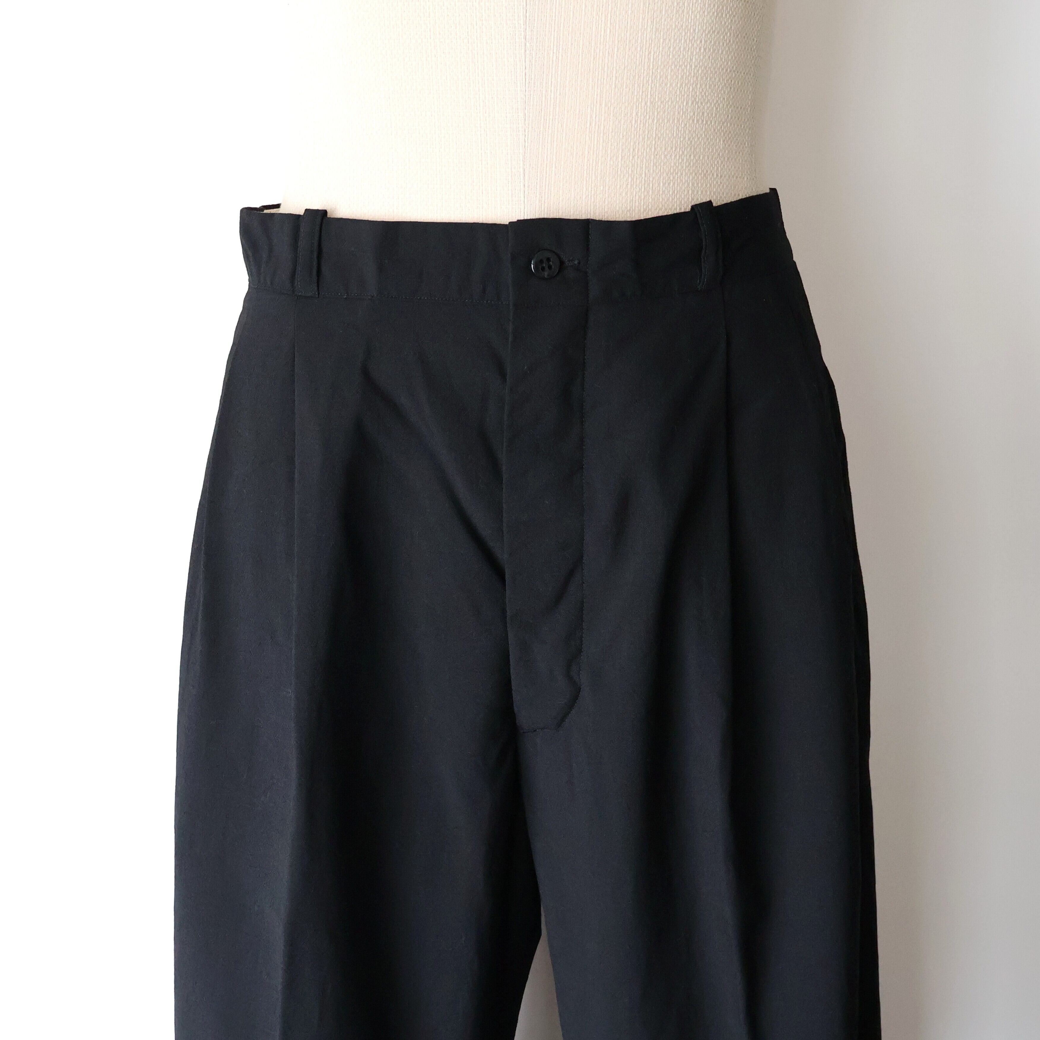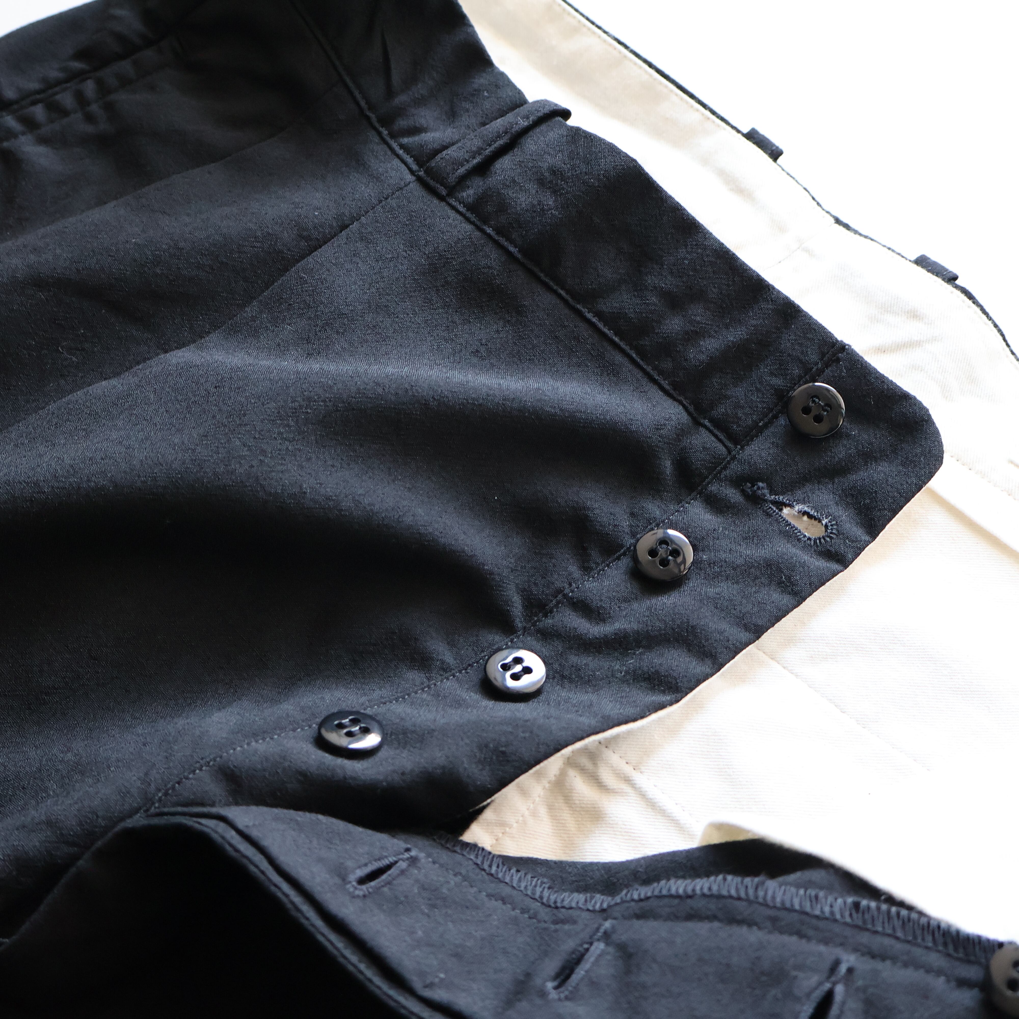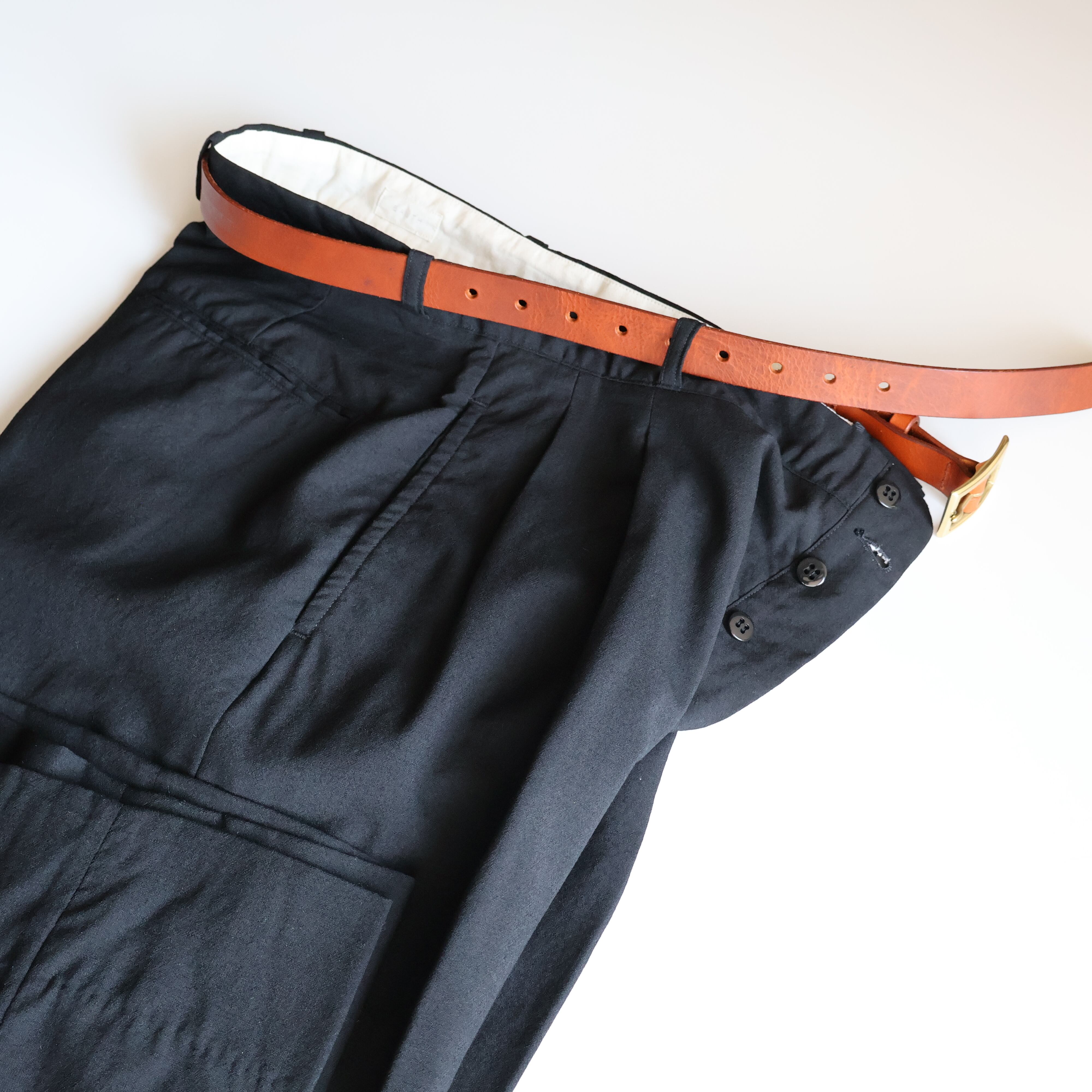 ヴィンテージの2タックのトラウザーズがベースで、太めのワイドパンツで裾にかけて比較的ストレートシルエットとなっています。ボタンフライのクラシックな仕様でベルト裏や袋布は綿のスレーキを使用しています。