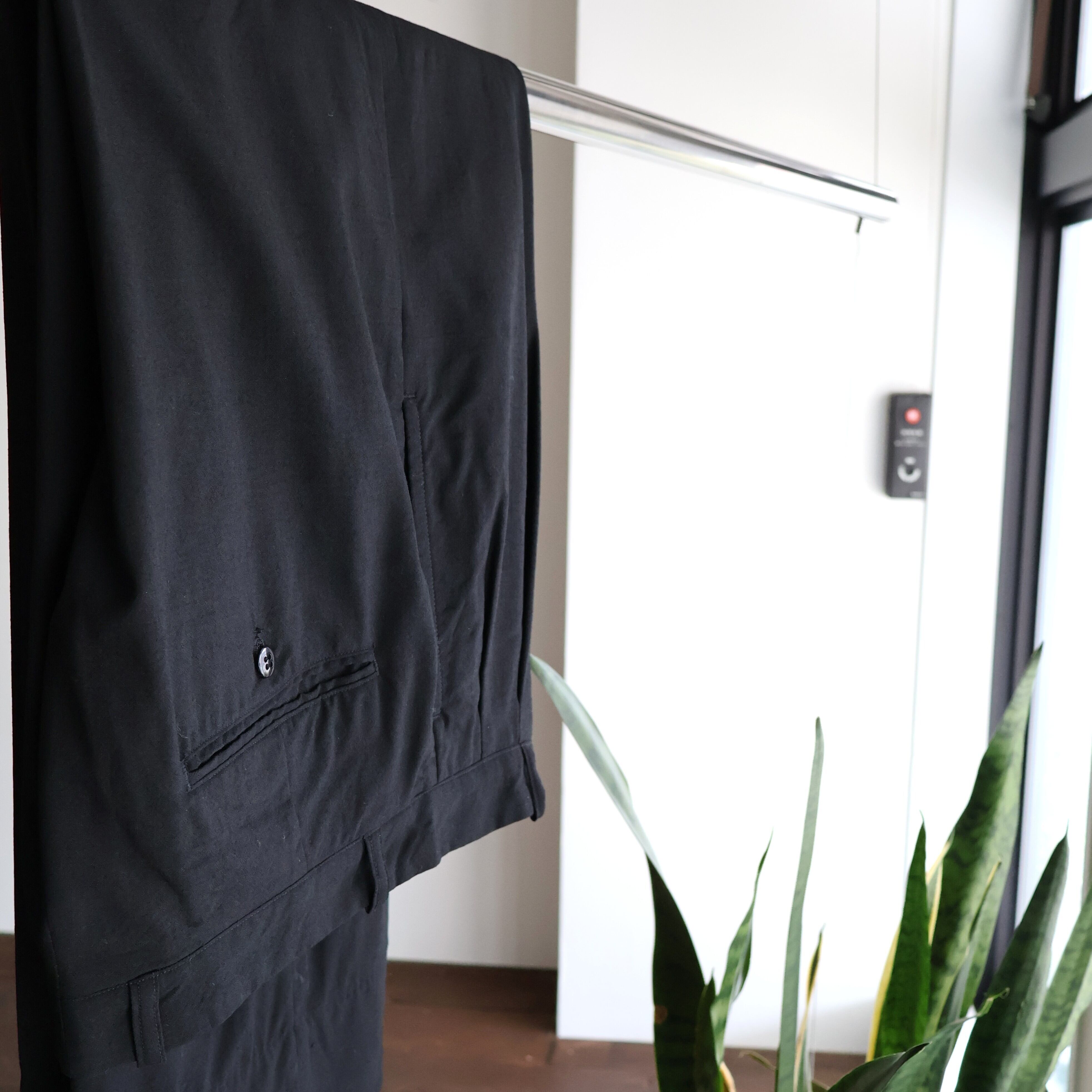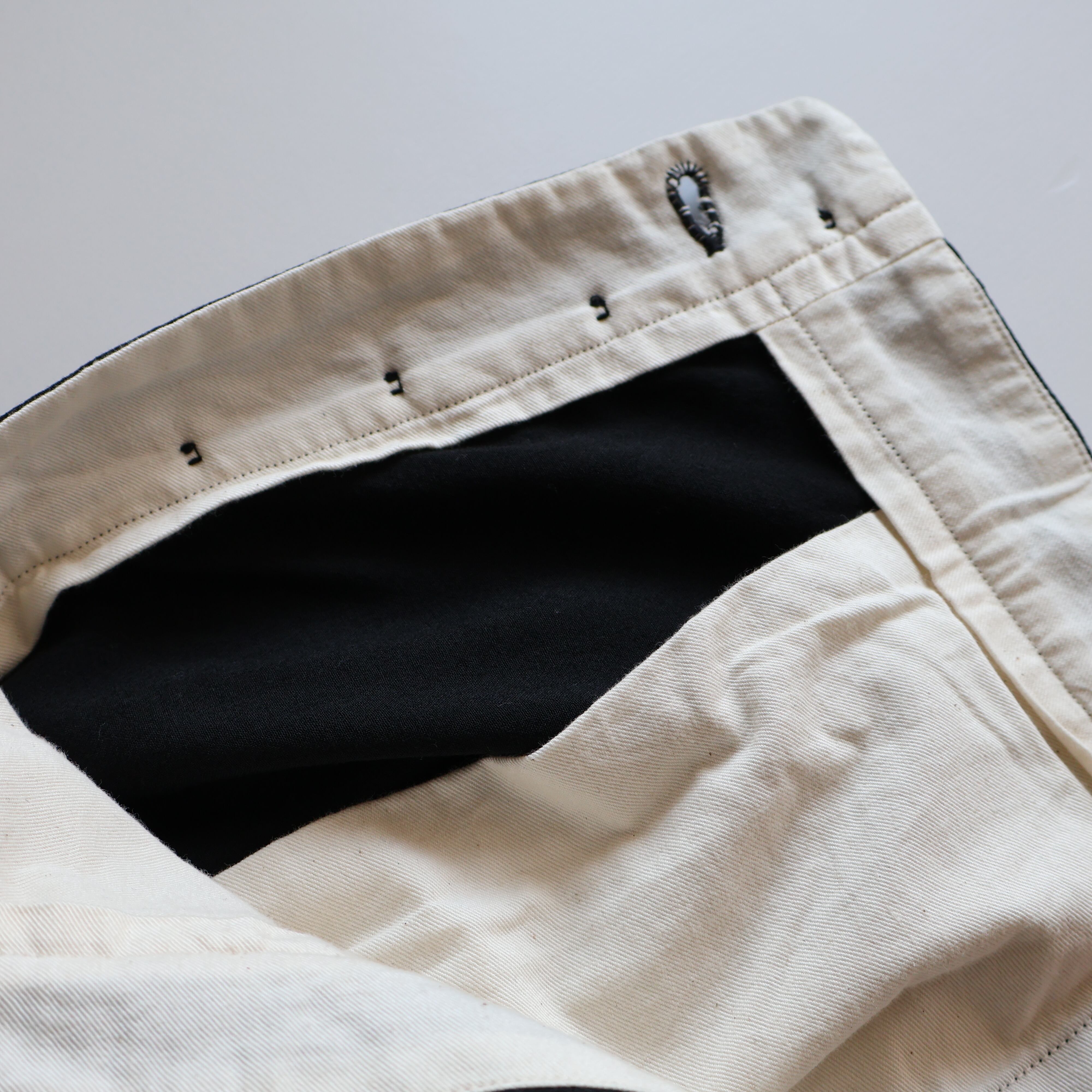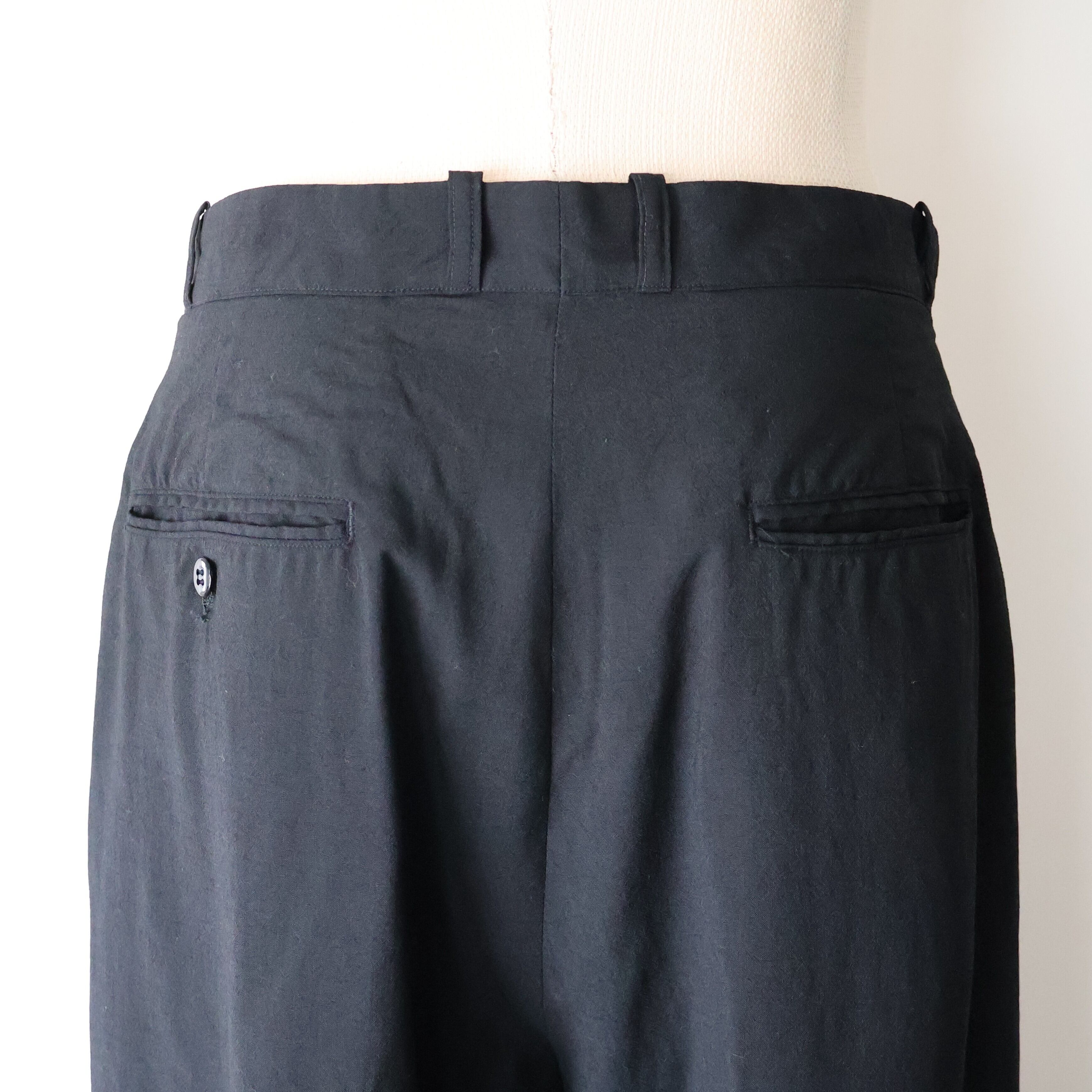 ヴィンテージの2タックのトラウザーズがベースで、太めのワイドパンツで裾にかけて比較的ストレートシルエットとなっています。ボタンフライのクラシックな仕様でベルト裏や袋布は綿のスレーキを使用しています。