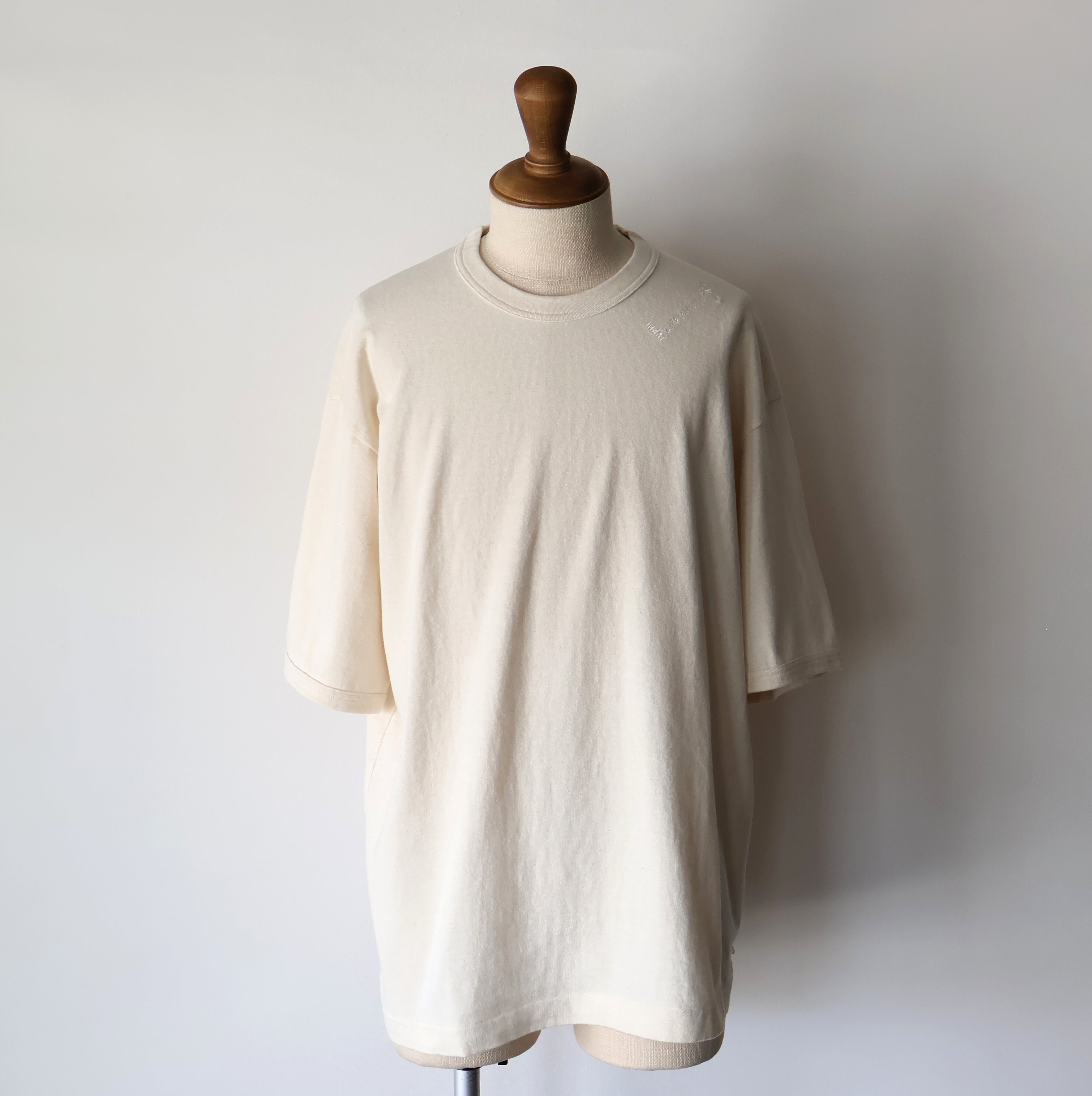 2枚の天竺生地を接結することで、ほどよい厚みとふっくらとした柔らかさを両立し、肌あたりもやさしく快適です。表と裏で微妙に異なる風合いが、奥行きのある表情を生み出し、再生糸特有のナチュラルなムラ感も魅力のひとつ。
